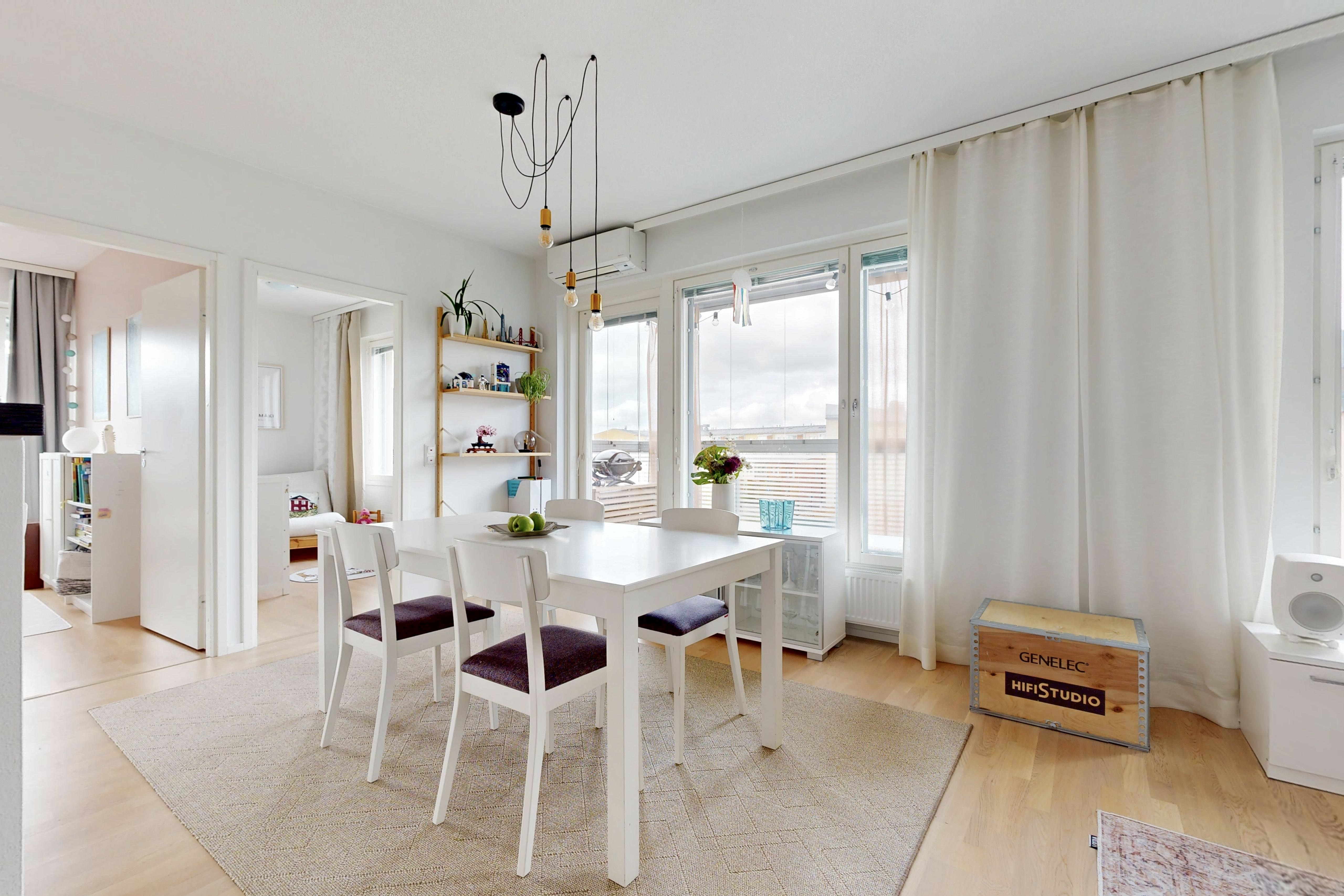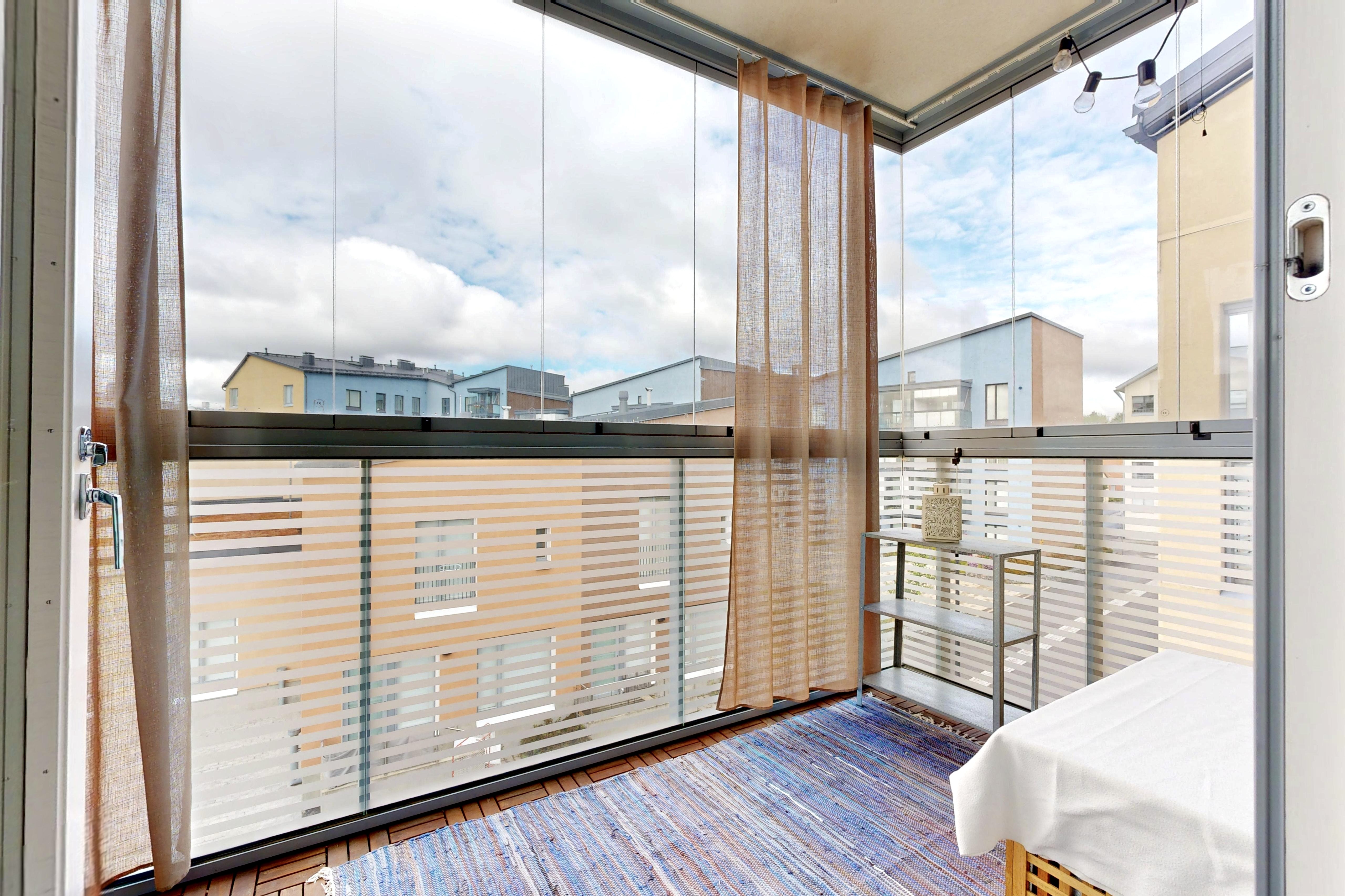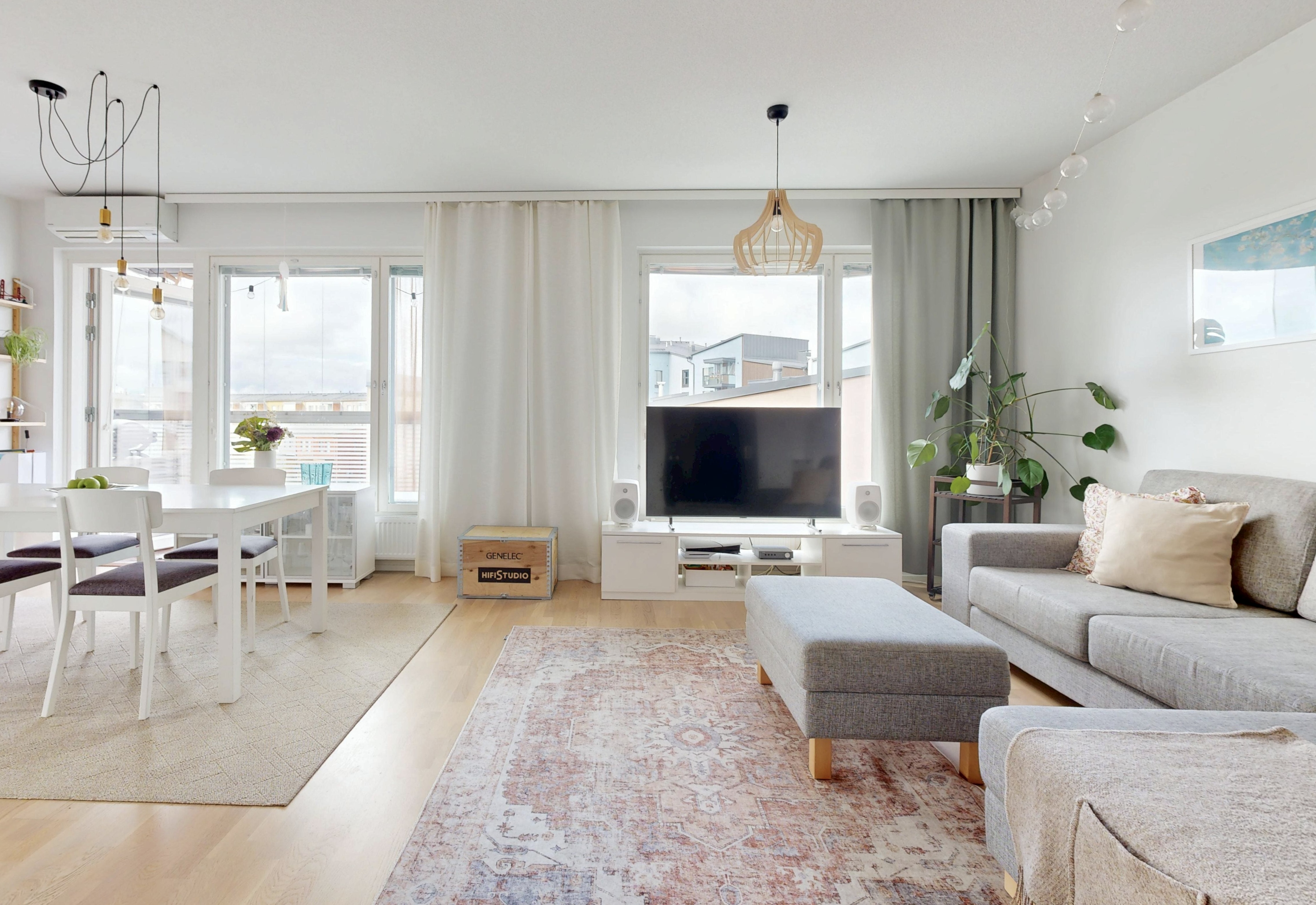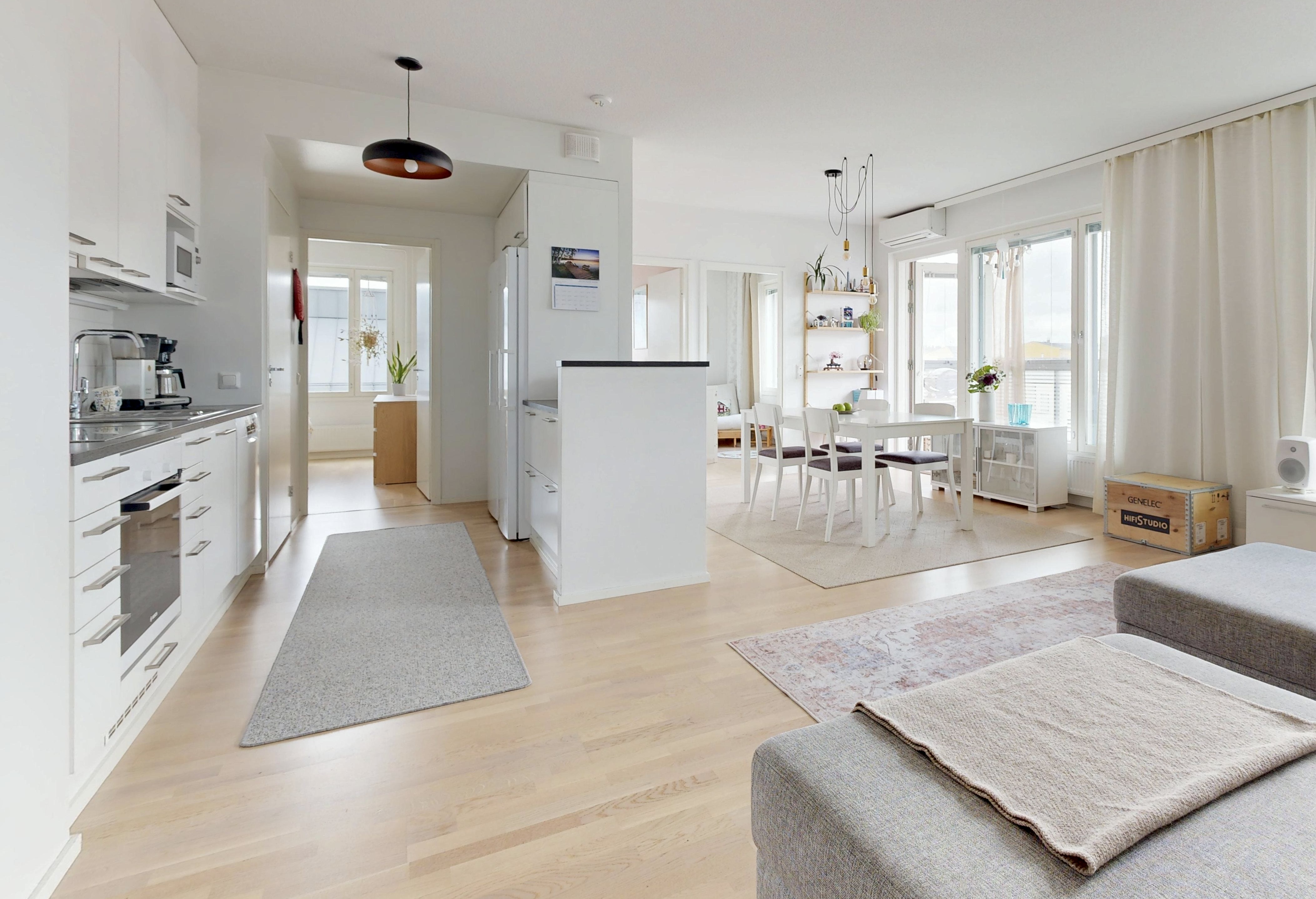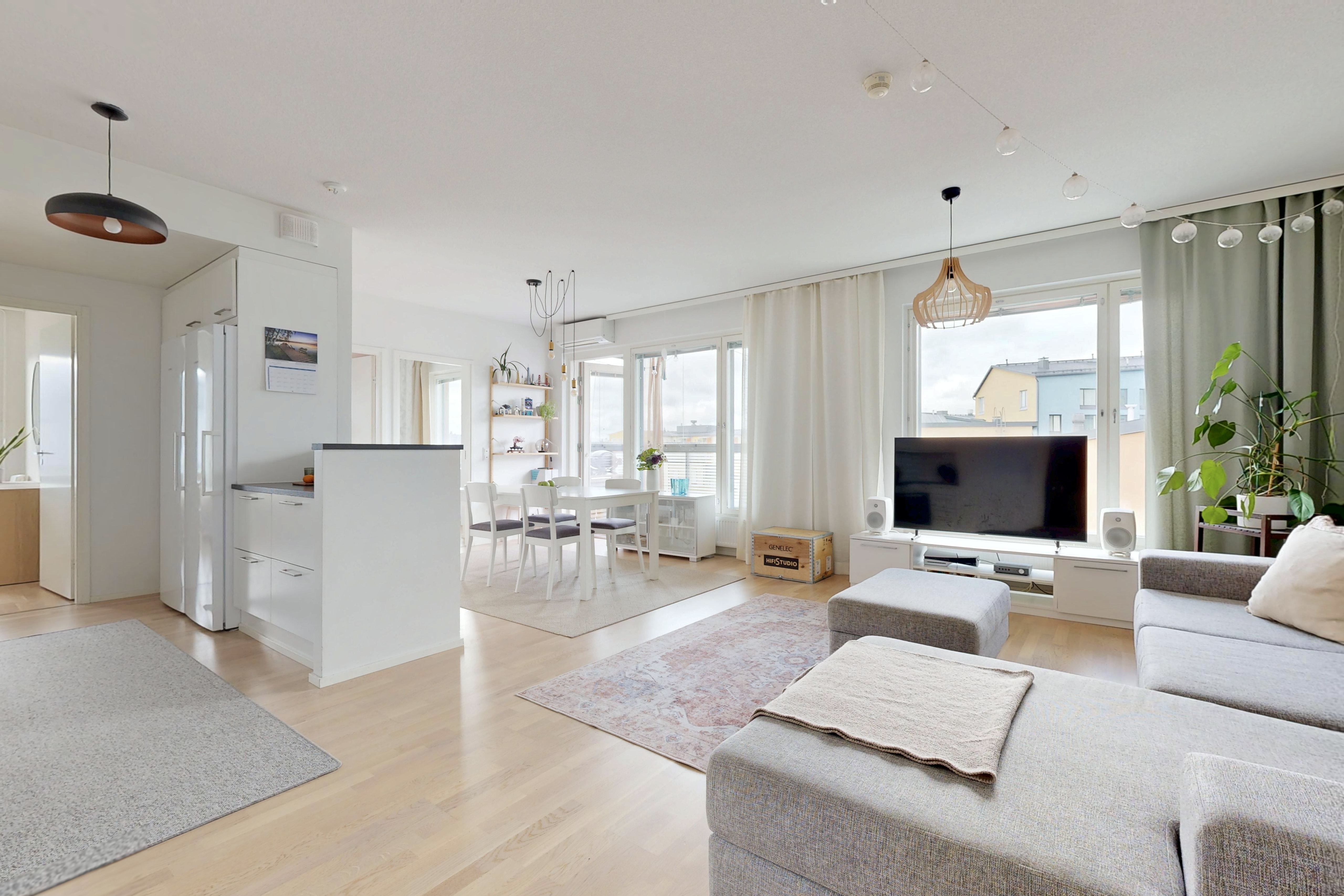 Tähän kotiin on helppo ihastua. Kulmahuoneisto, tilava ja toimiva pohjaratkaisu. Olohuone ja keittiö muodostavat yhtenäisen tilan, jossa on mukava viettää yhteistä aikaa. Olohuoneesta käynti myös lasitetulle parvekkeelle. Keittiössä on valkoiset kaapistot sekä hyvin säilytys-ja laskutilaa. Kolme makuuhuonetta. Kaikista makuuhuoneissa löytyy kaapistot. Eteisen vierestä löytyy erillinen wc, lisäksi kodissa on tilava kylpyhuone saunalla.