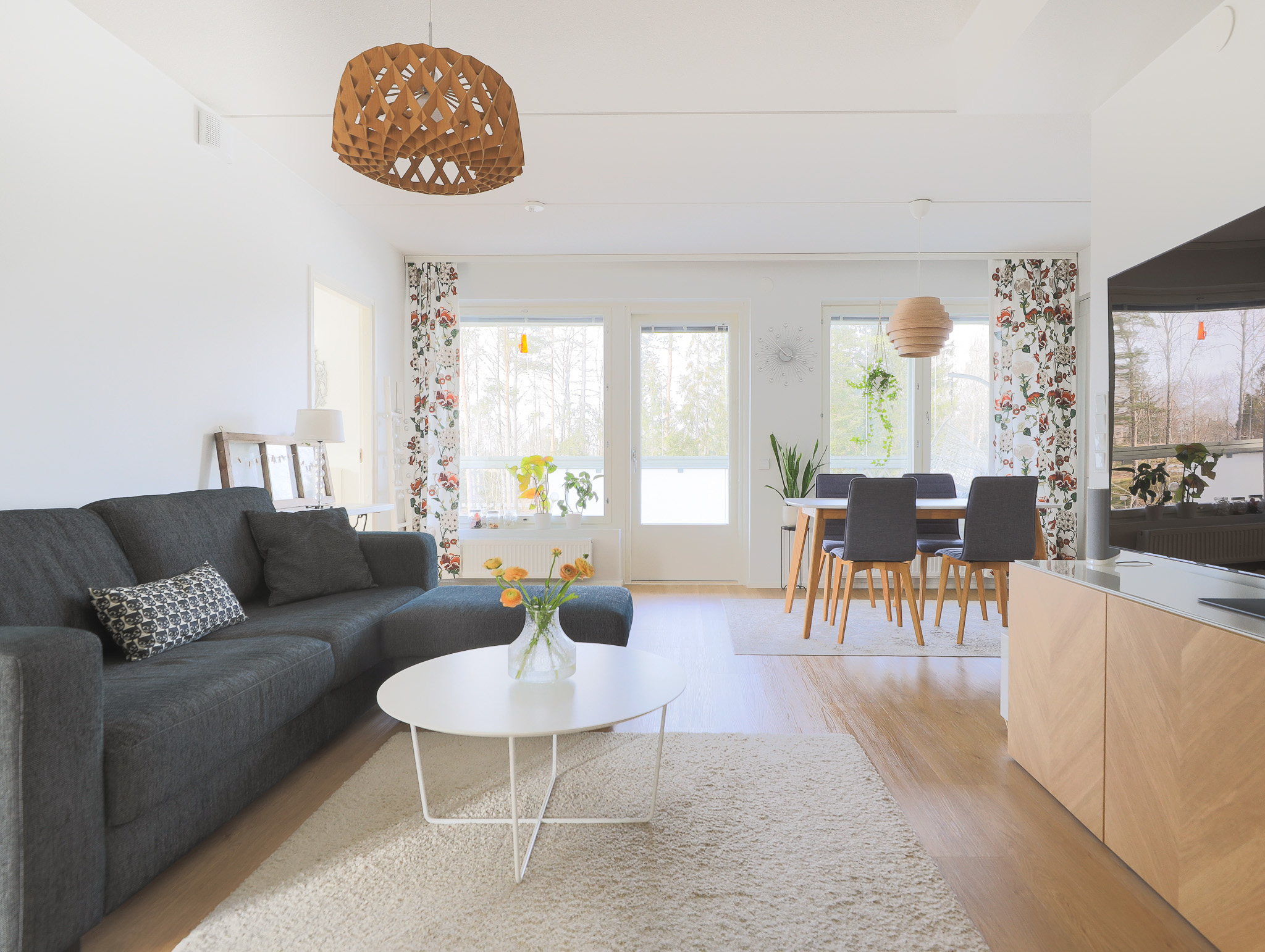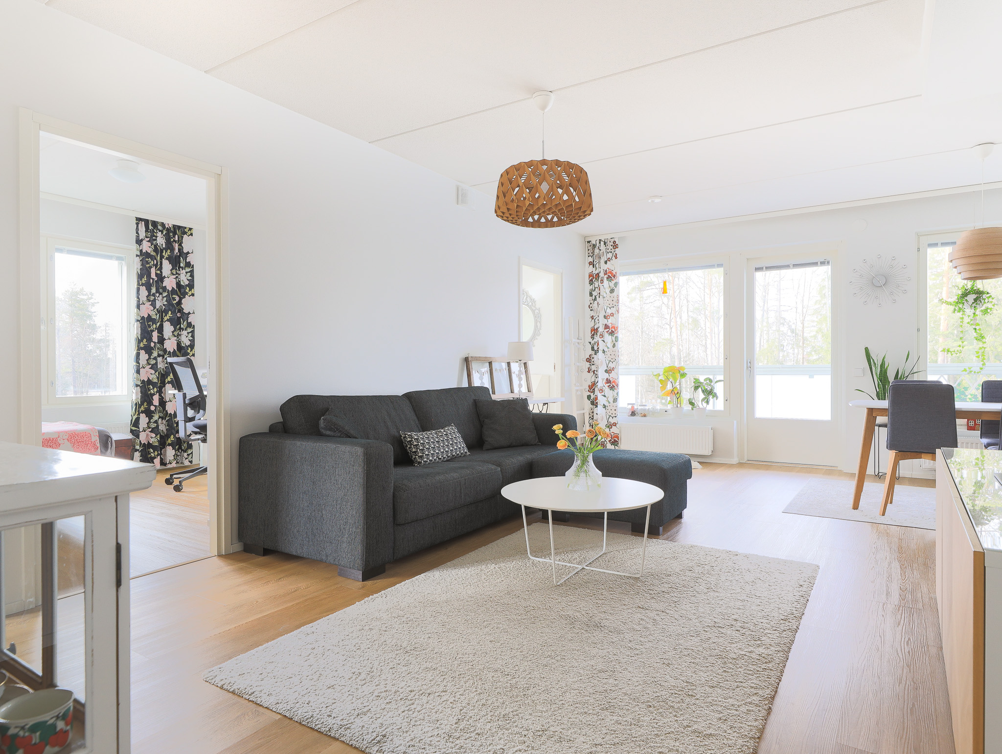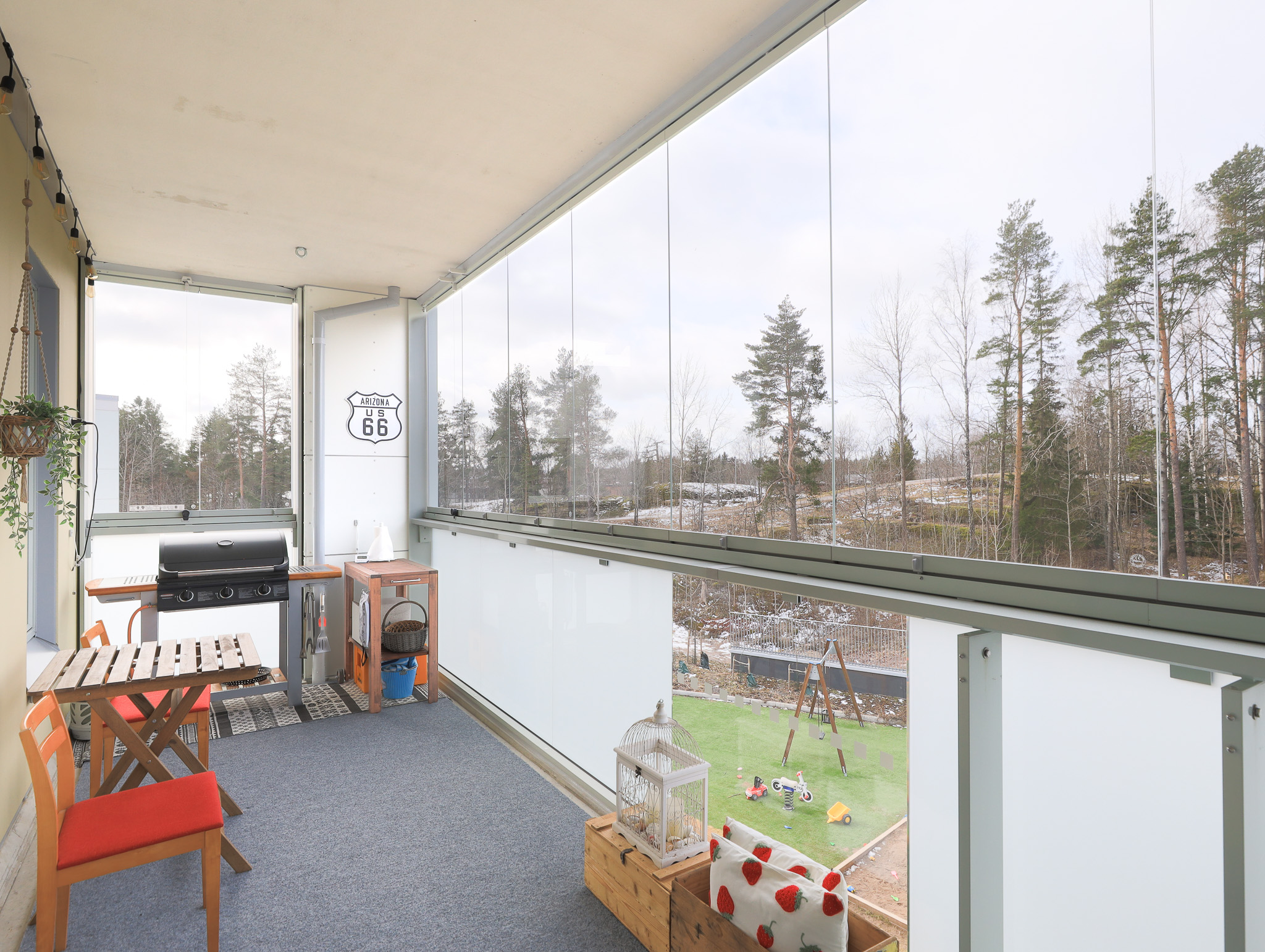 Kodin keskipisteenä toimii olohuone-keittiöyhdistelmä, jossa on mukava viettää aikaa niin perheen kuin ystävien kanssa. Olohuoneesta on käynti isolle lasitetulle parvekkeelle, josta näkymät sisäpihalle ja Orapihlajapuistoon. Keittiössä hyvin säilytys-ja laskutilaa. Kolme makuuhuonetta avarilla näkymillä. Kaikista makuuhuoneissa löytyy kaapistot. Eteisen vierestä löytyy erillinen wc ja tilava kylpyhuone.