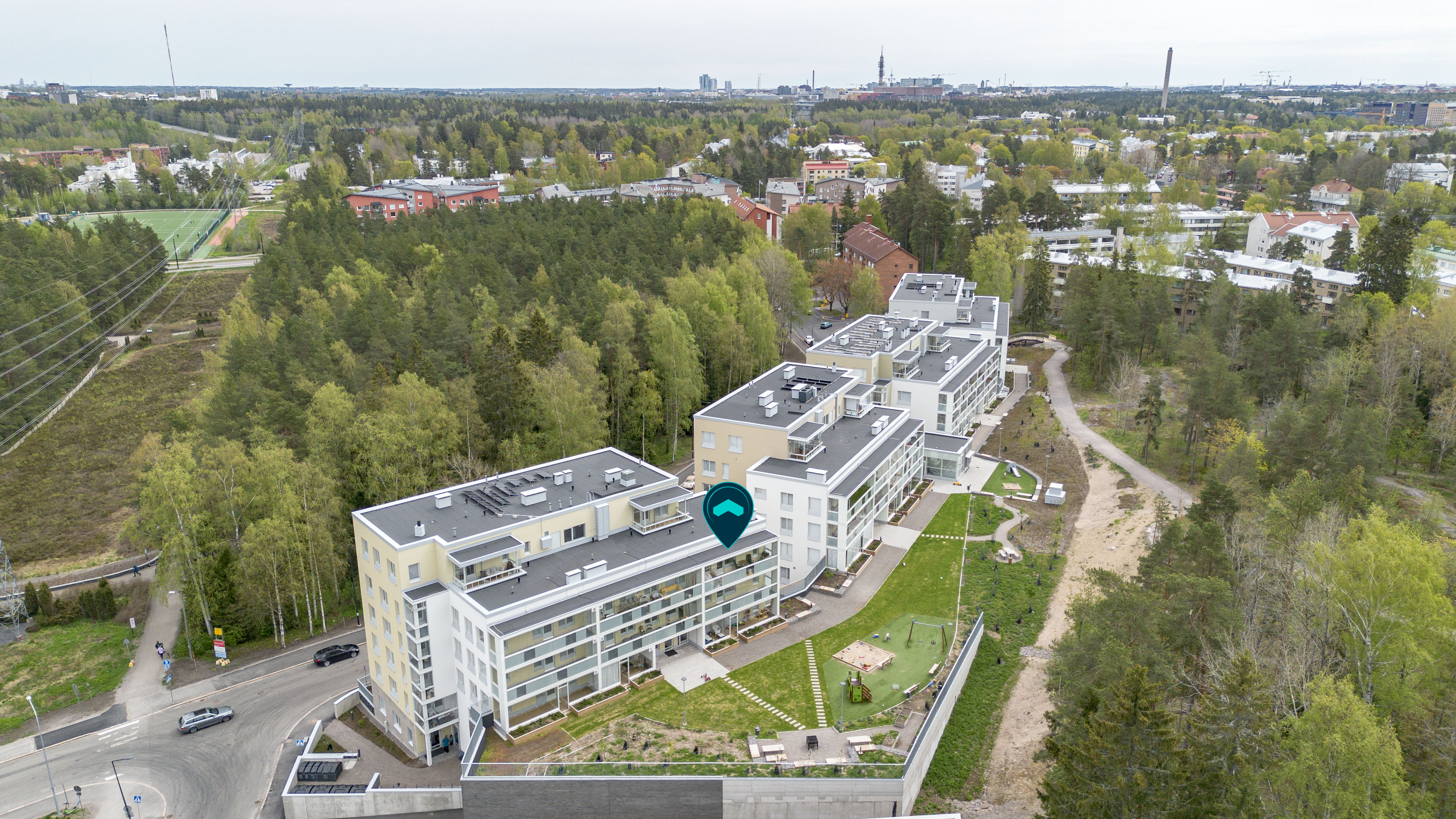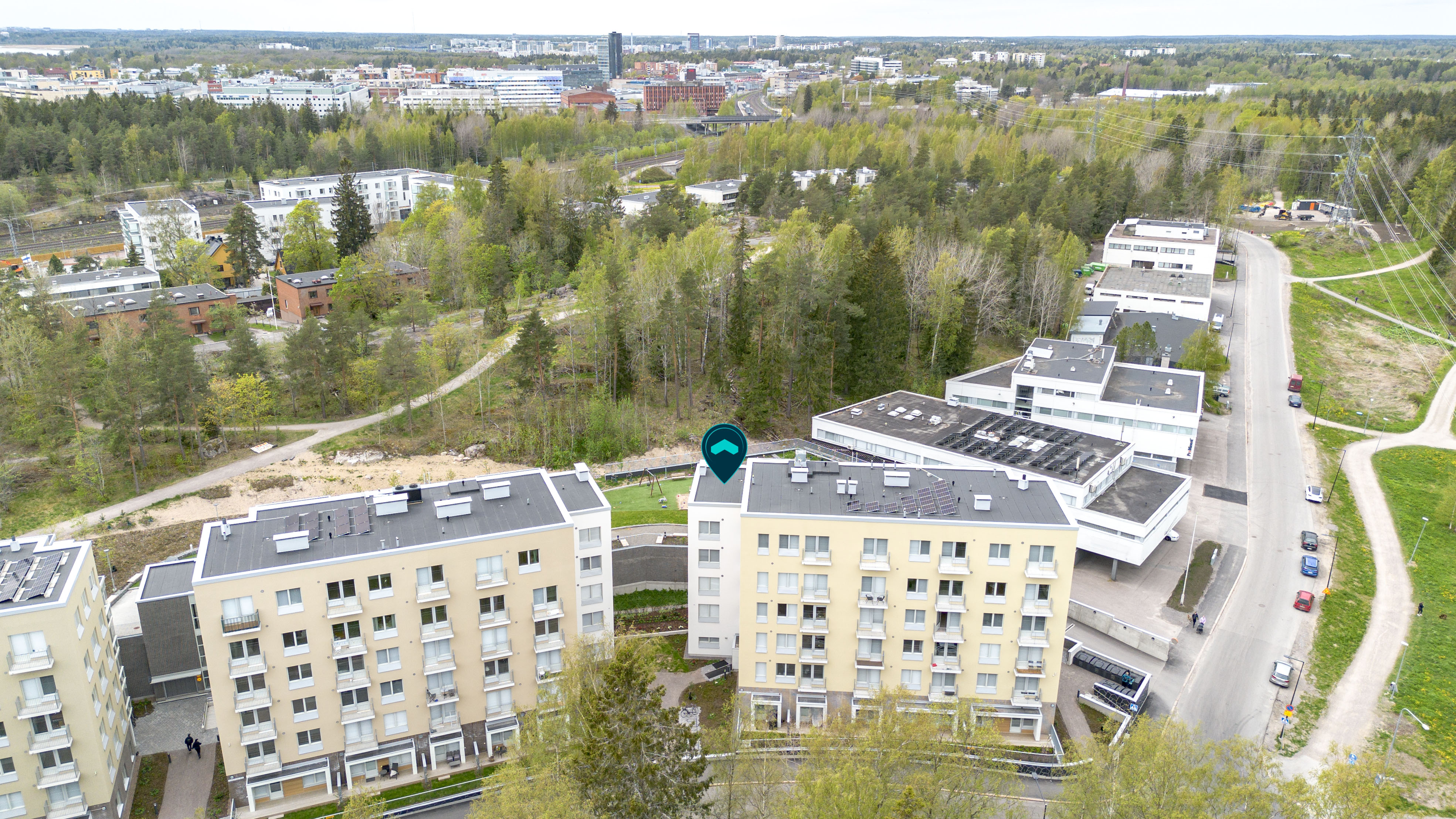 Erinomainen sijainti viihtyisällä Etelä-Haagan alueella, jossa kaikki oleellinen löytyy kävelyetäisyydeltä. Talon vieressä vehreä ja kallioinen puistoalue sekä tien toisella puolella Haagan Alppiruusupuisto. Julkisilla liikennevälineillä kulku onnistuu niin bussilla kuin junalla sekä Raide-Jokerilla, jonka pysäkki on kävelyetäisyyden päässä. Useampi päivittäistavarakauppa vieressä ja Kauppakeskus Kaari nopeasti saavutettavissa. Kirjasto, terveysasema sekä kahvilat lähellä.
