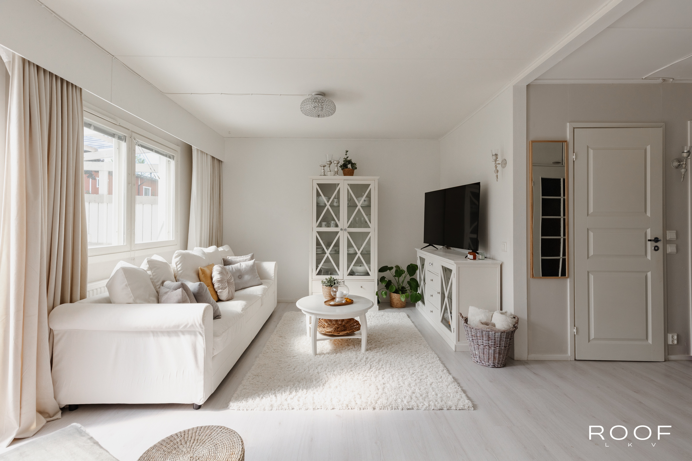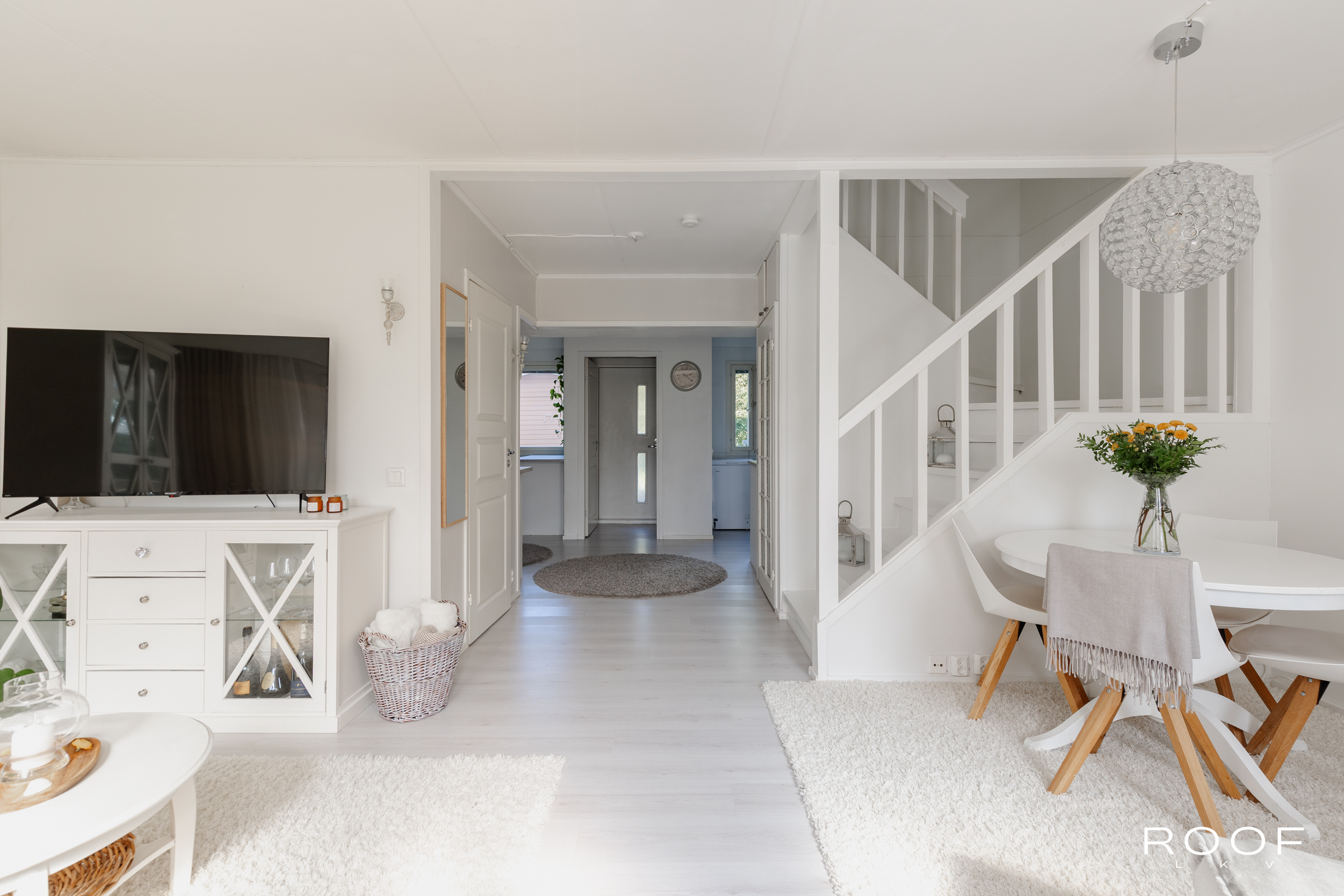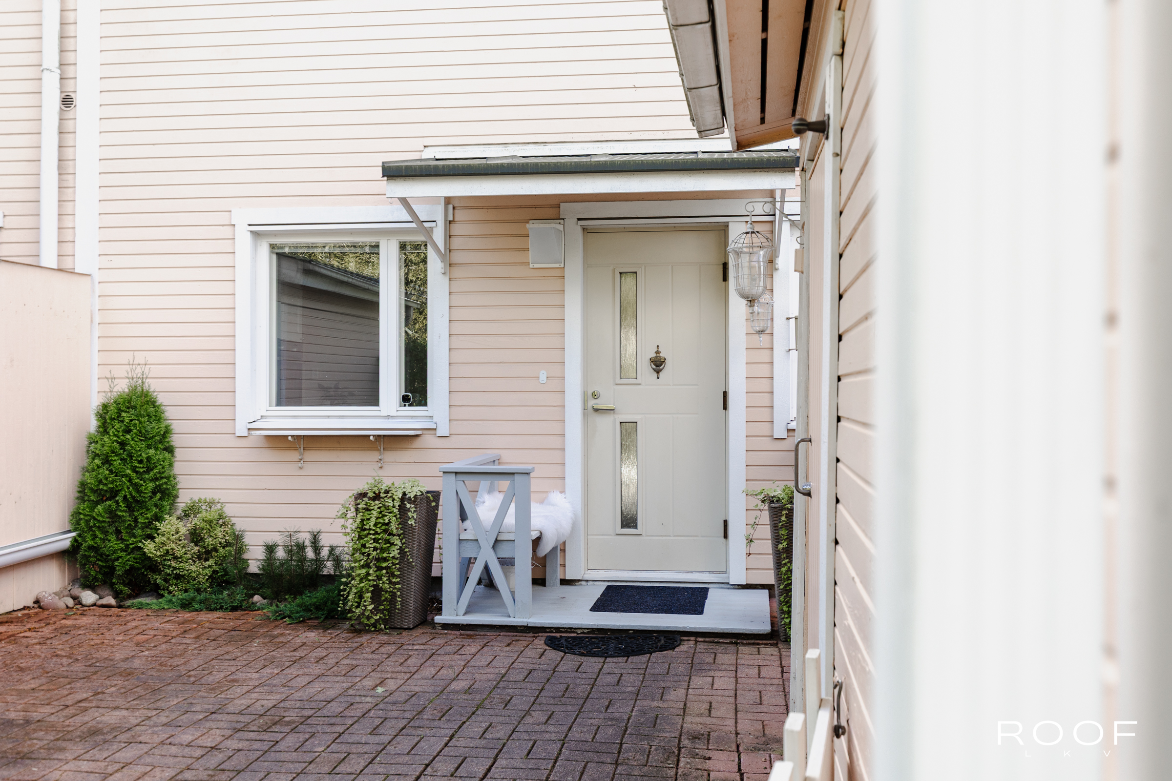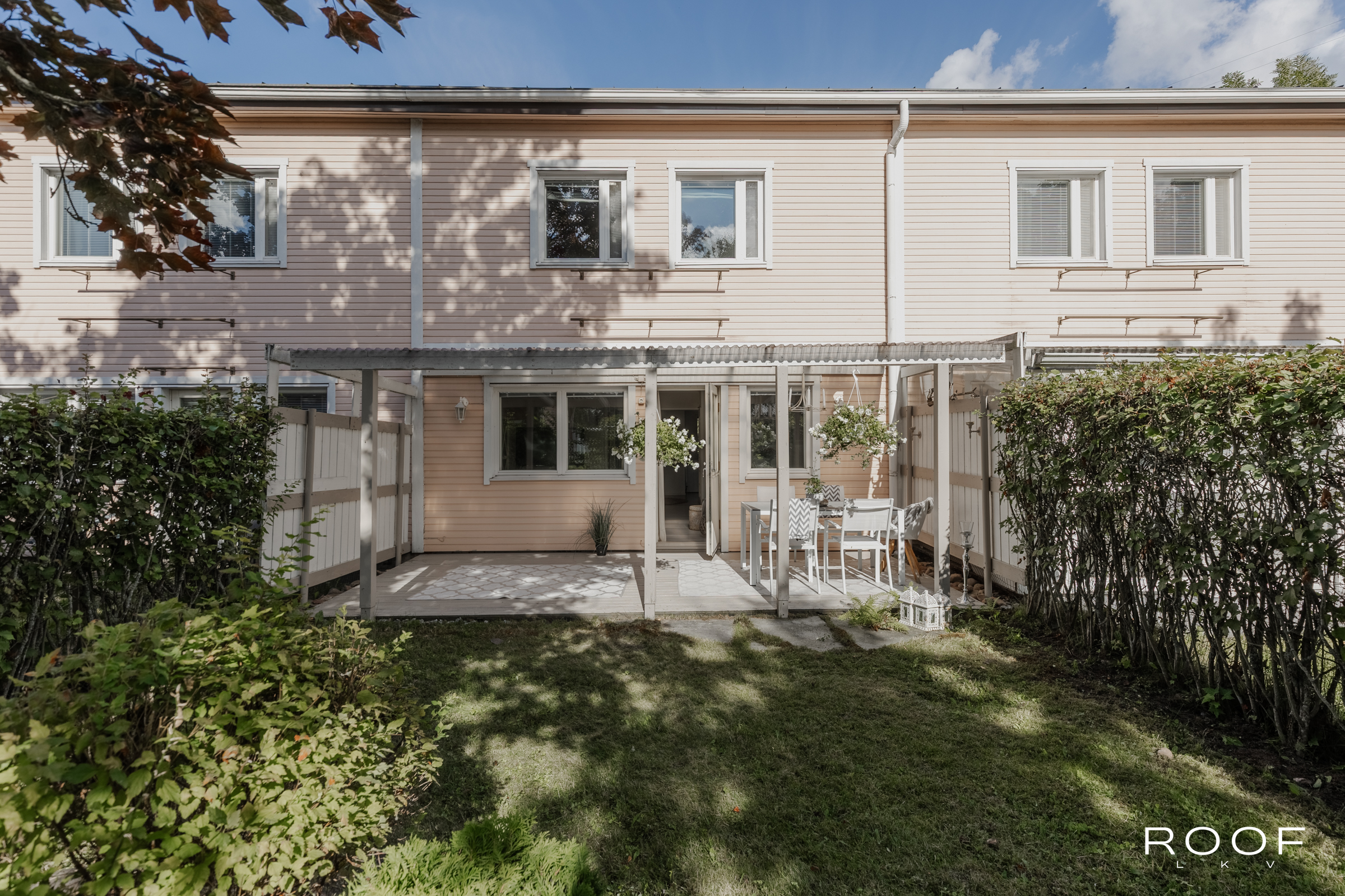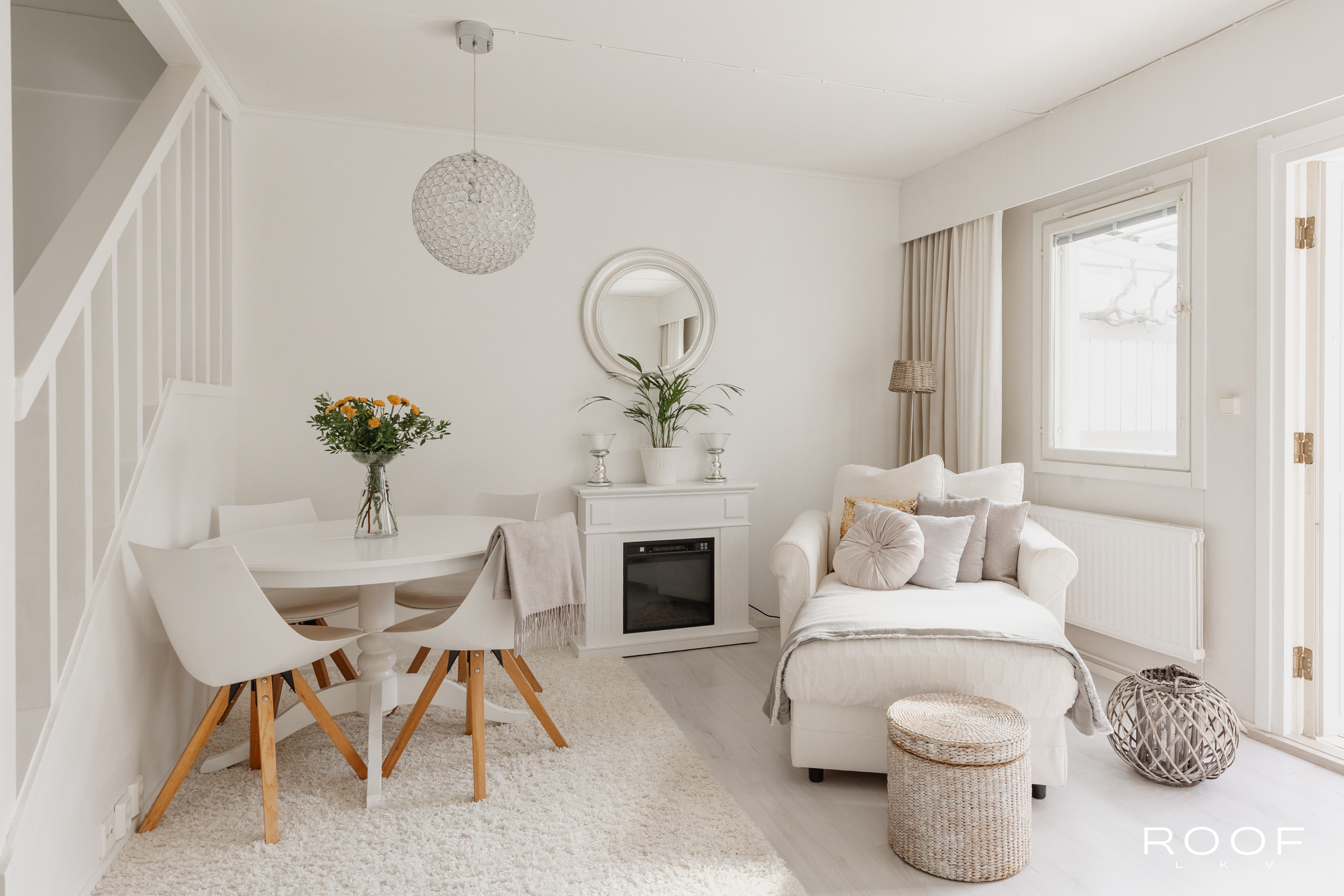 Tässä vaaleassa rivitalokodissa valo tulvii sisään suurista ikkunoista ja luo harmonisen, levollisen tunnelman. Tyylikkäästi remontoitu kokonaisuus on täynnä yksityiskohtia, jotka tekevät kodista persoonallisen ja viihtyisän. Olohuone jatkuu sujuvasti omalle pihalle ja katetulle terassille, jossa on helppo viettää pitkiä syysiltoja.