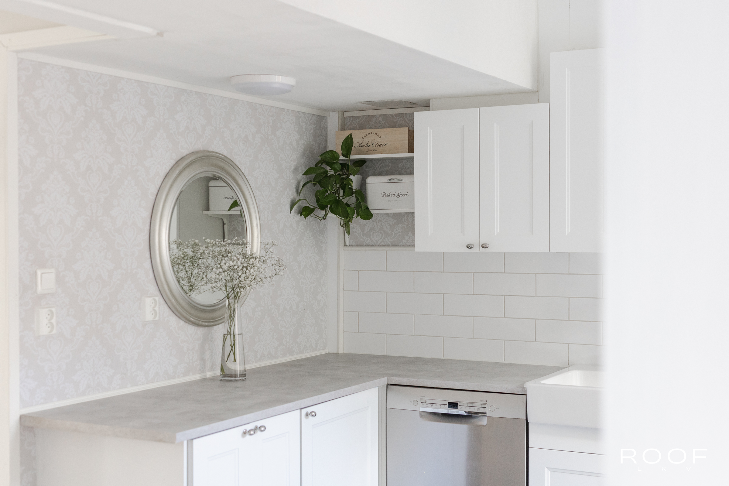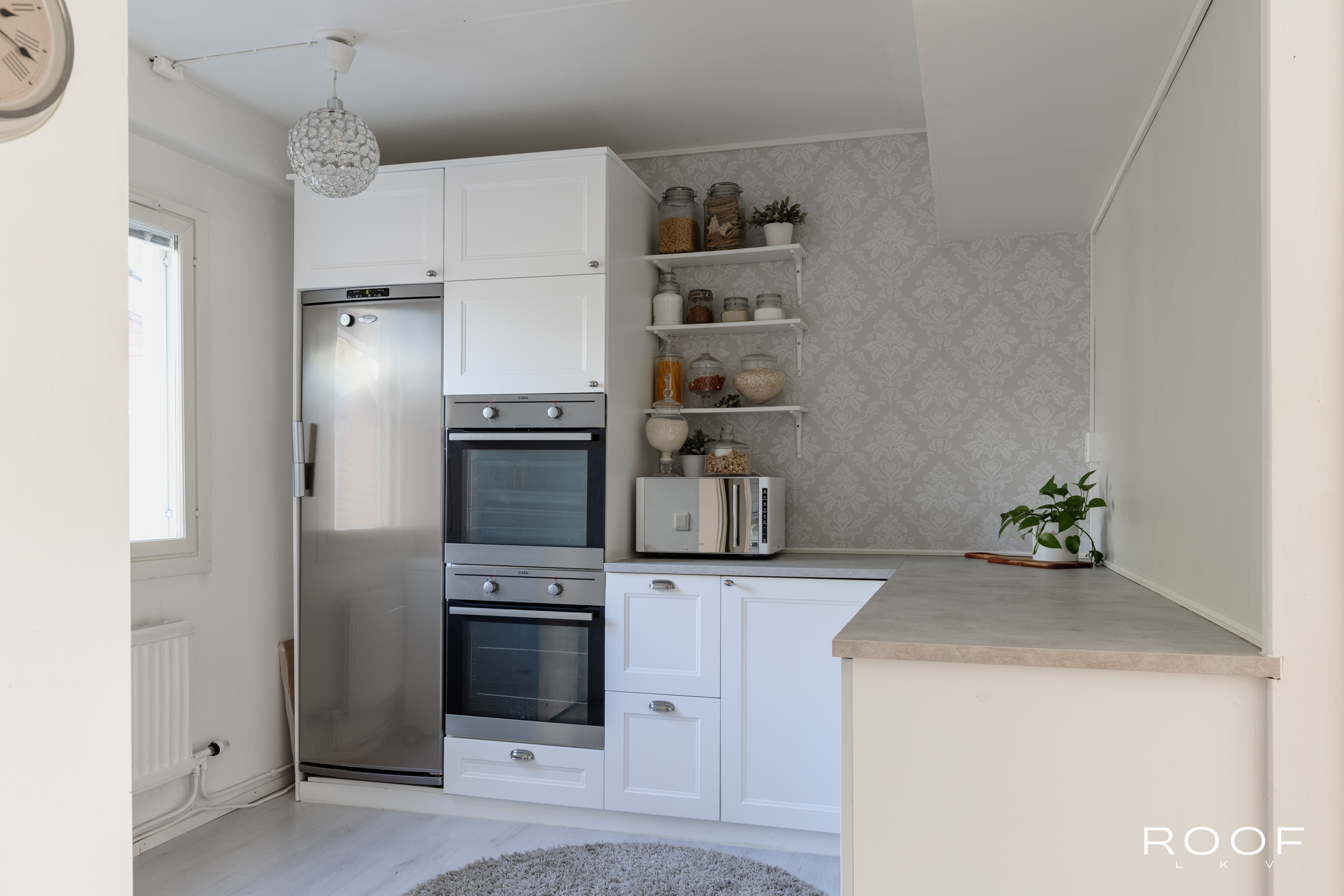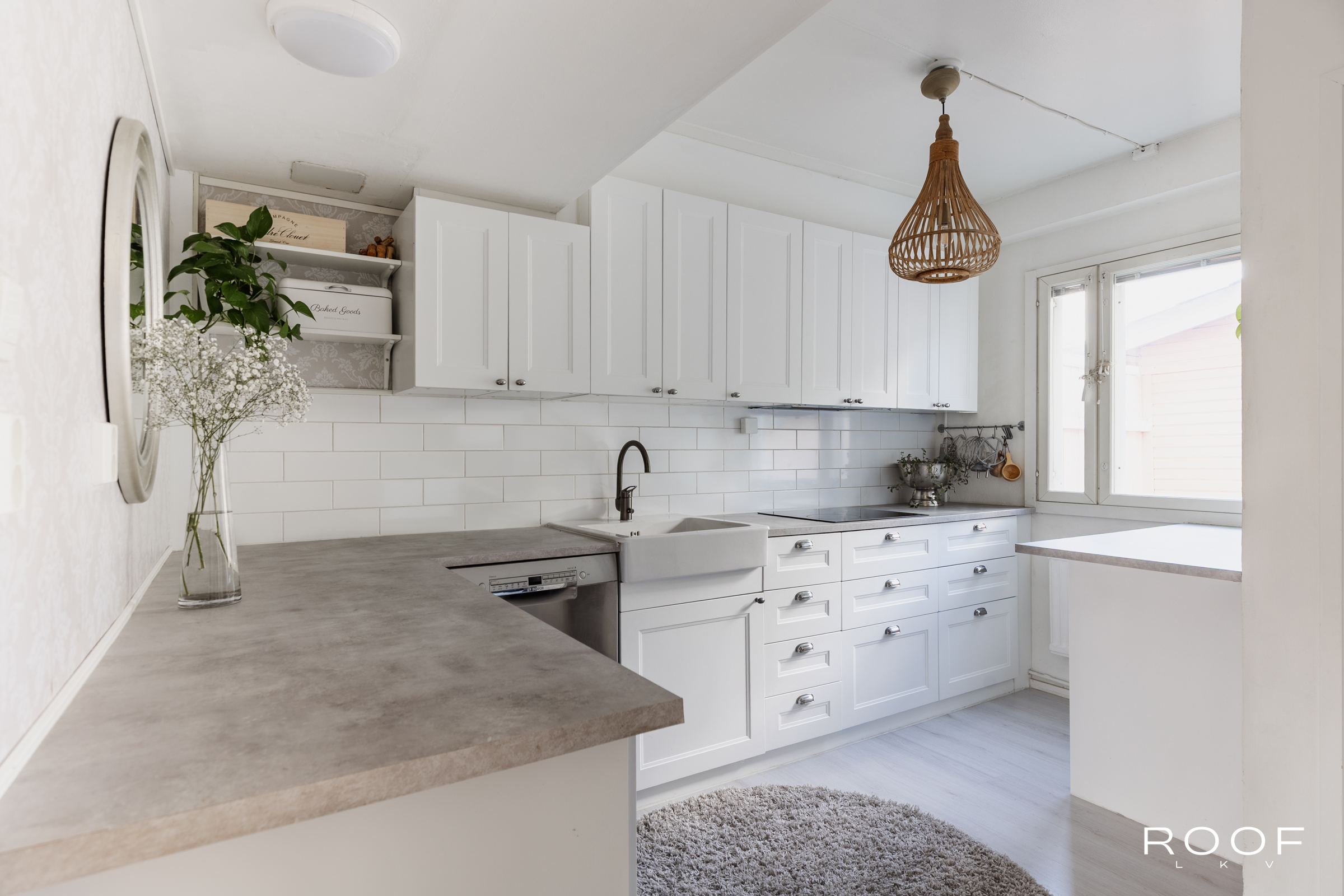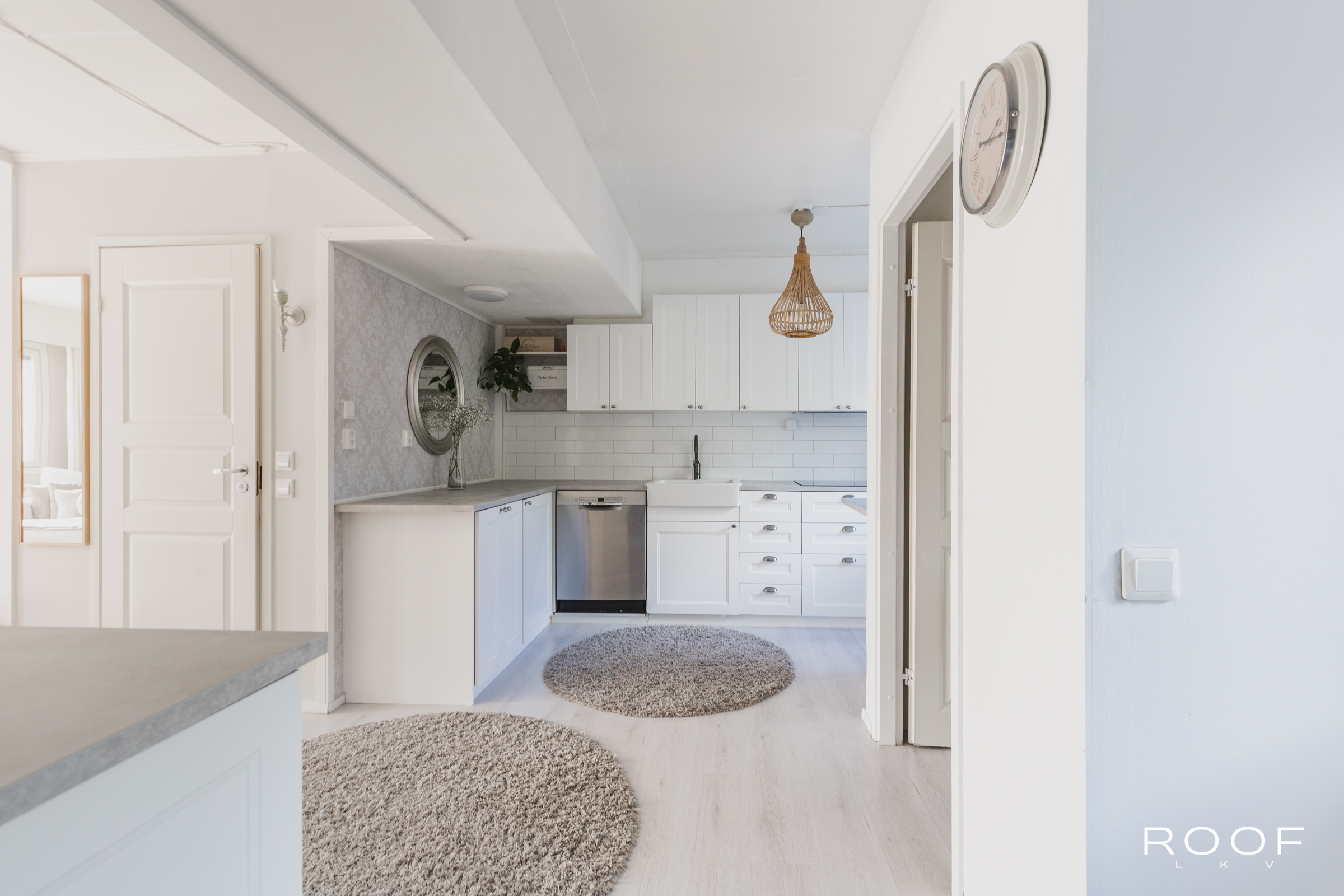 -Vuonna 2021 remontoitu keittiö avautuu tilavasti ja käytännöllisesti sisäänkäynnin molemmin puolin