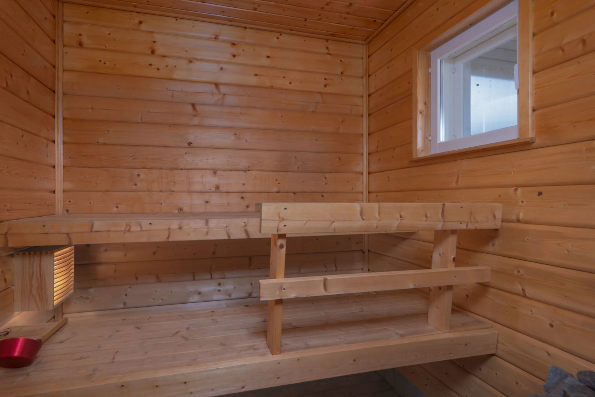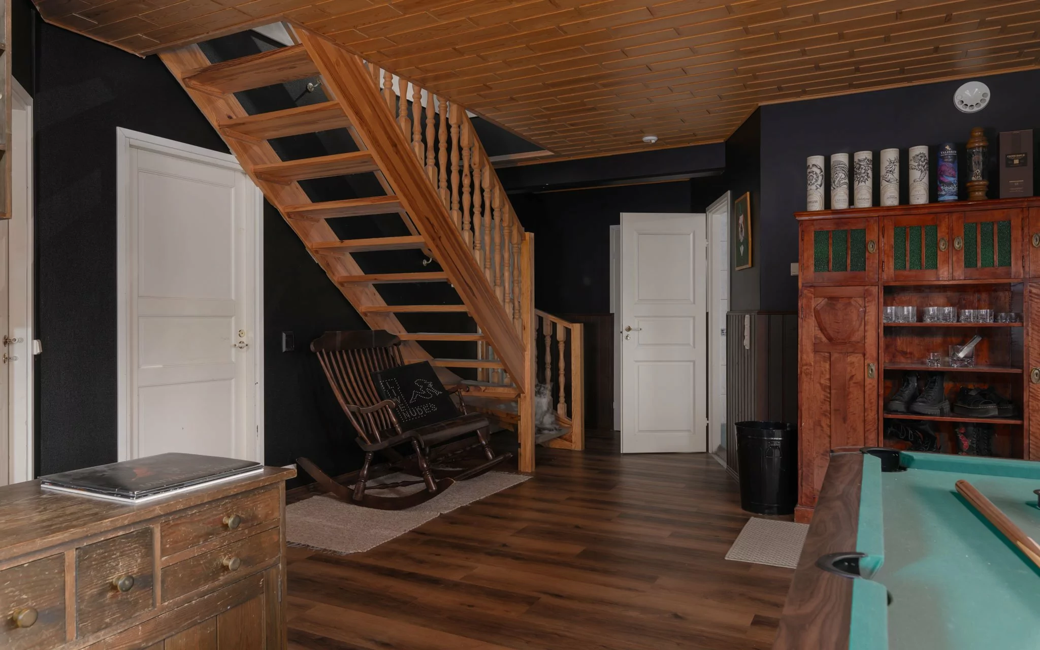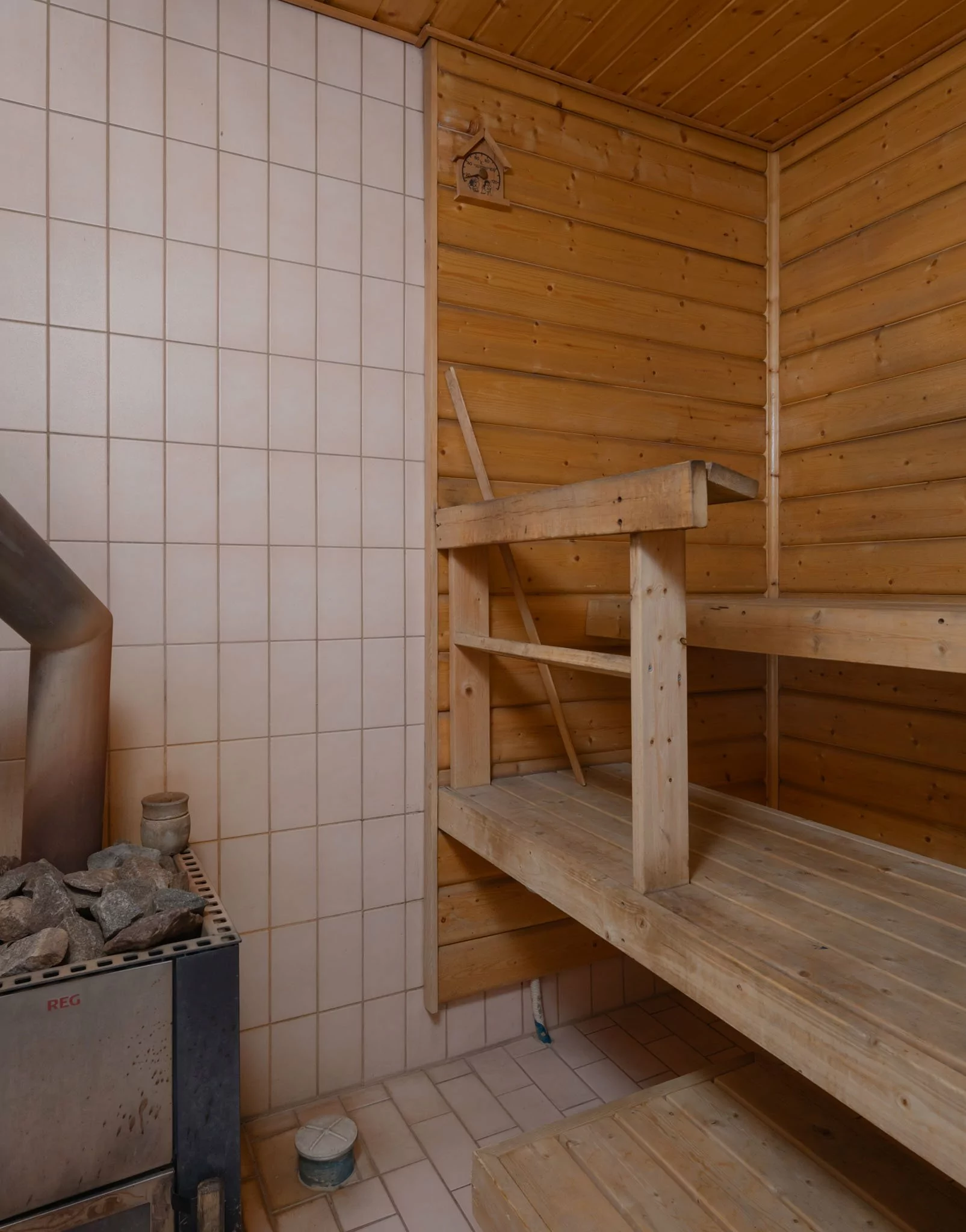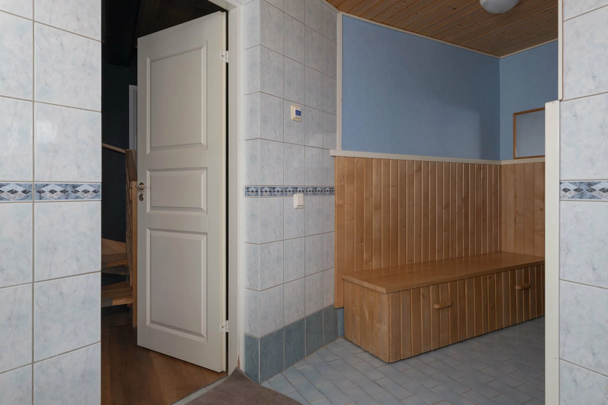 Yläkerrassa sijaitsevat veranta, eteinen, olohuone, kolme makuuhuonetta sekä tilava keittiö, jossa on leivinuuni ja puuhella. Lisäksi yläkerrasta löytyvät puusauna, suihku, kodinhoitohuone, vaatehuone ja erillinen wc.