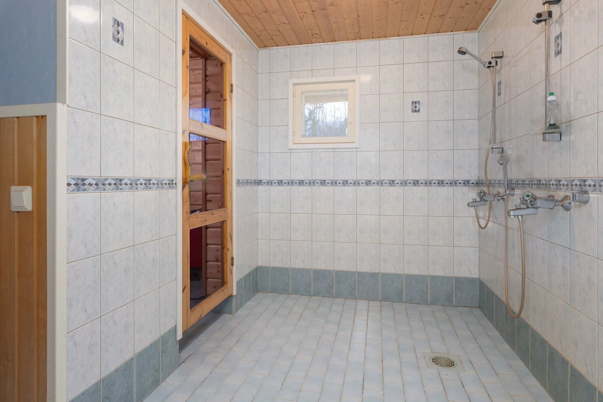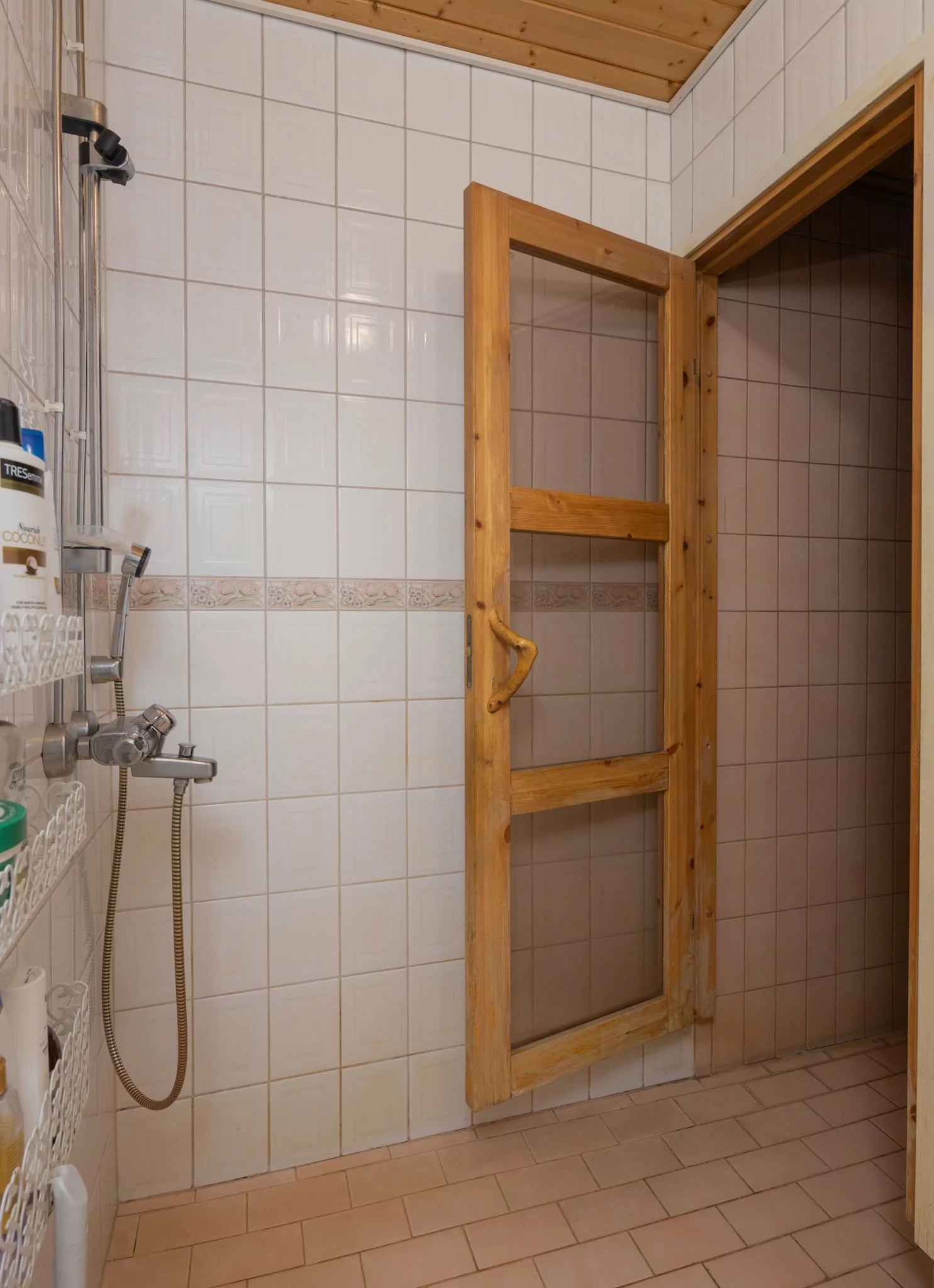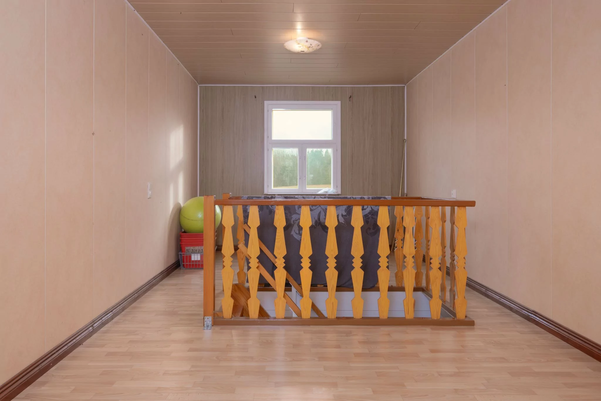 Yläkerrassa sijaitsevat veranta, eteinen, olohuone, kolme makuuhuonetta sekä tilava keittiö, jossa on leivinuuni ja puuhella. Lisäksi yläkerrasta löytyvät puusauna, suihku, kodinhoitohuone, vaatehuone ja erillinen wc.