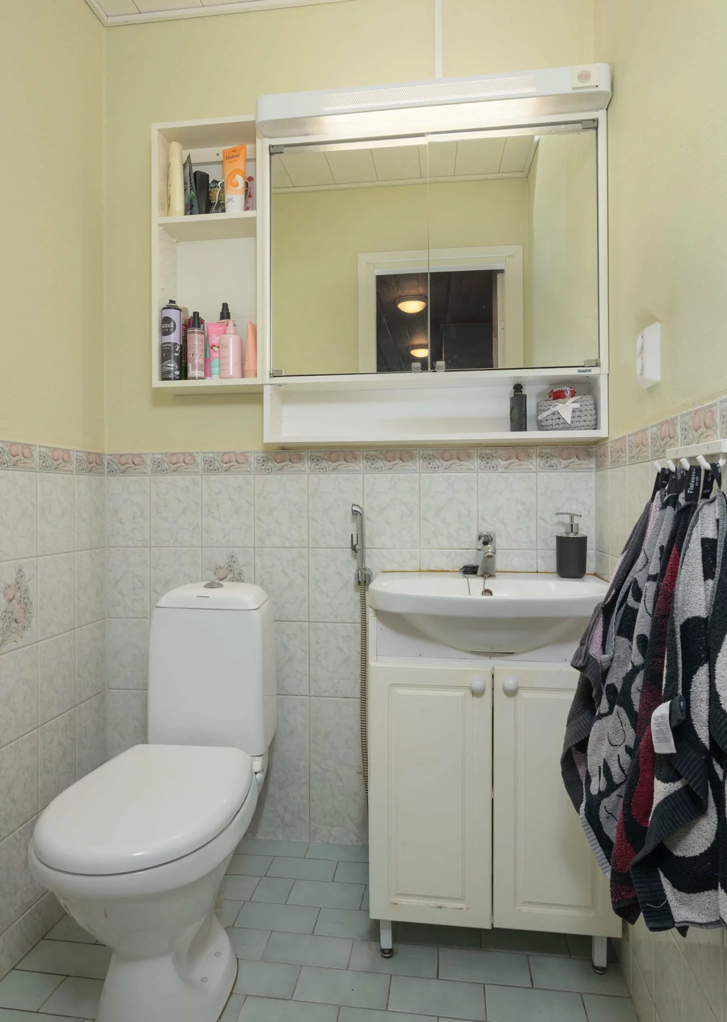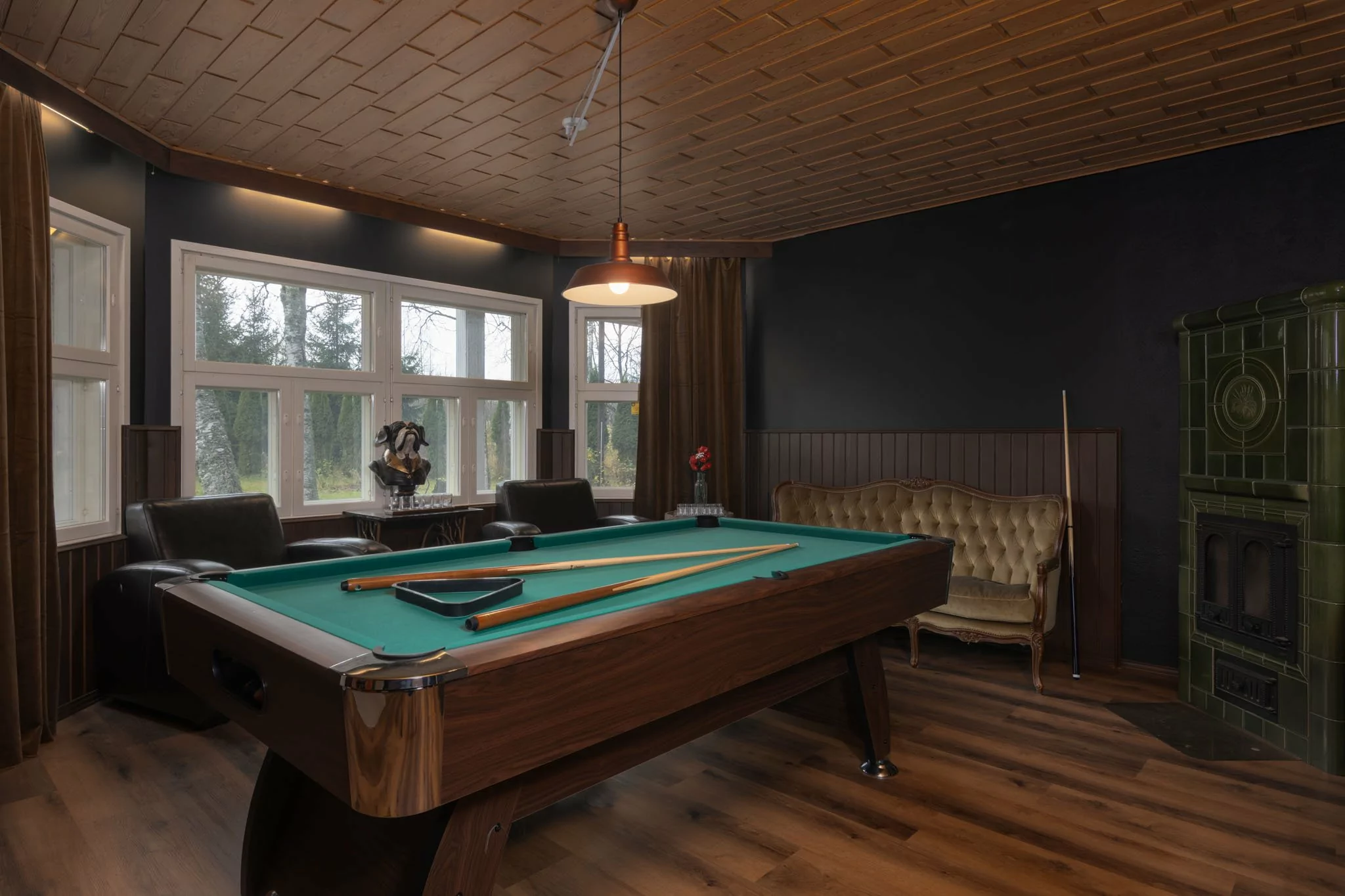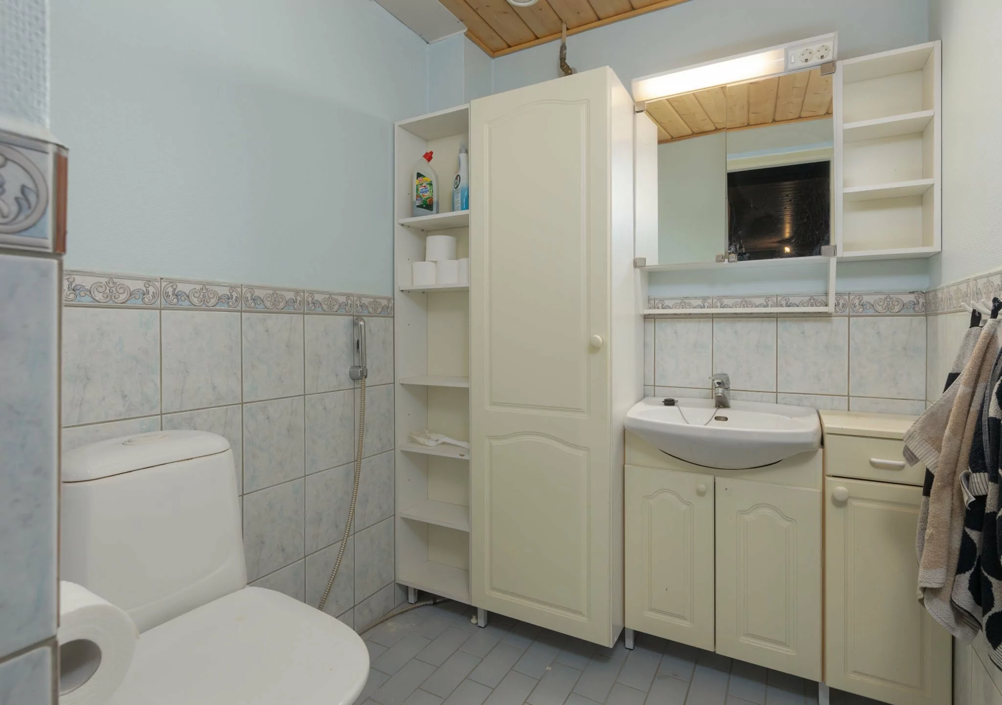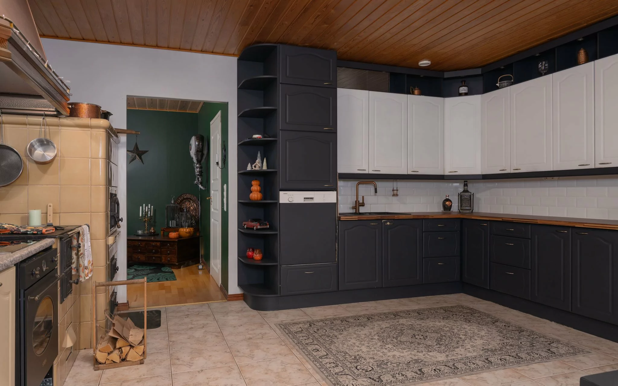 Yläkerrassa sijaitsevat veranta, eteinen, olohuone, kolme makuuhuonetta sekä tilava keittiö, jossa on leivinuuni ja puuhella. Lisäksi yläkerrasta löytyvät puusauna, suihku, kodinhoitohuone, vaatehuone ja erillinen wc.