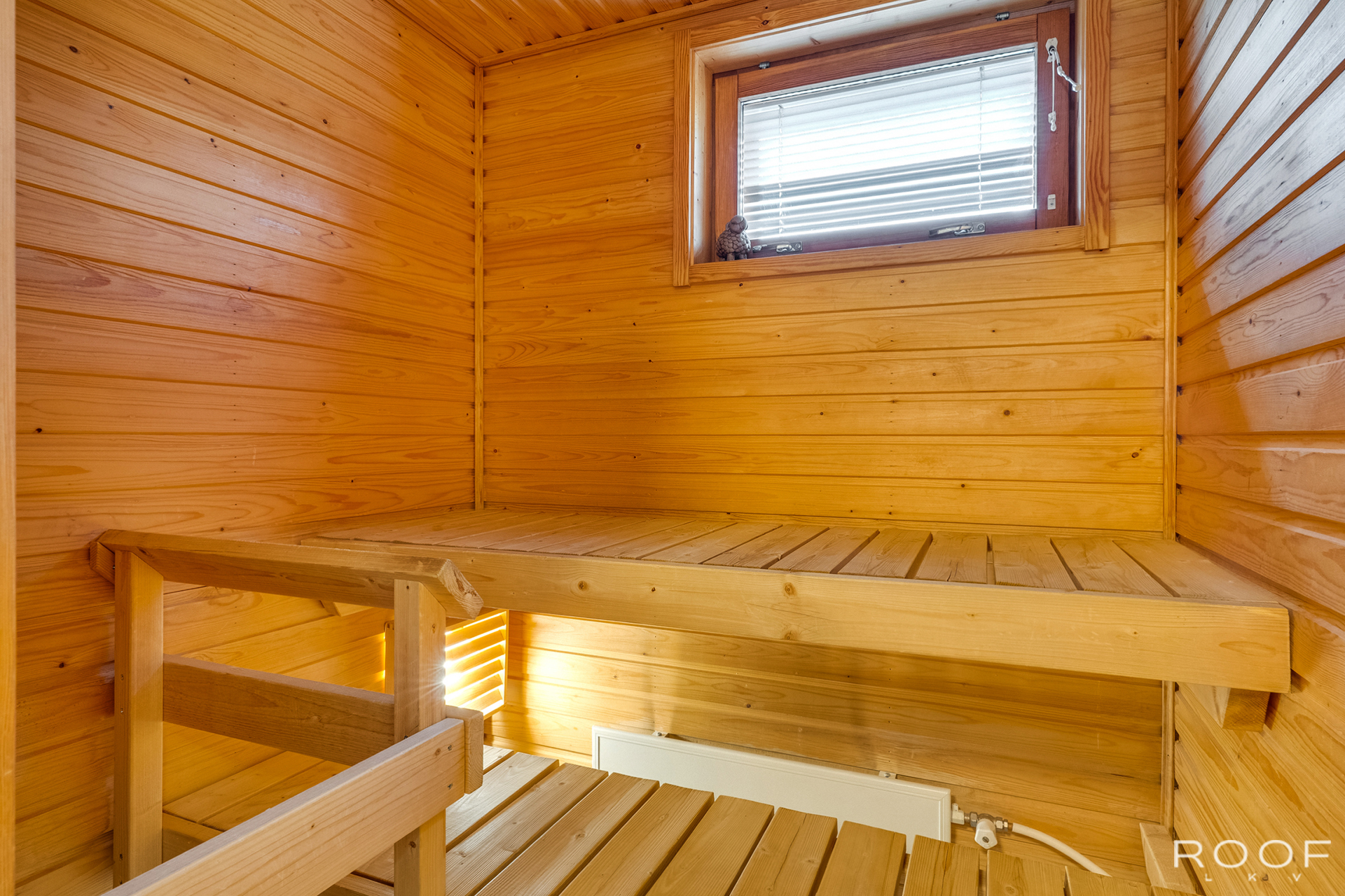 Makuuhuoneet ja pesutilat omalla saunalla sijaitsevat yläkerrassa. Parvekkeella on mukava vilvoitella saunan jälkeen.