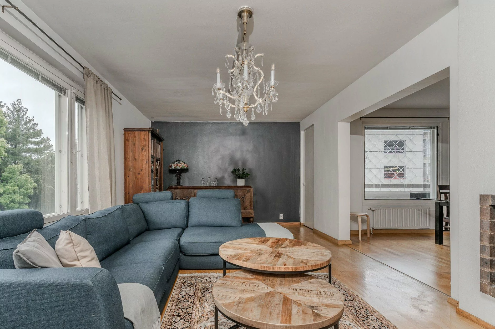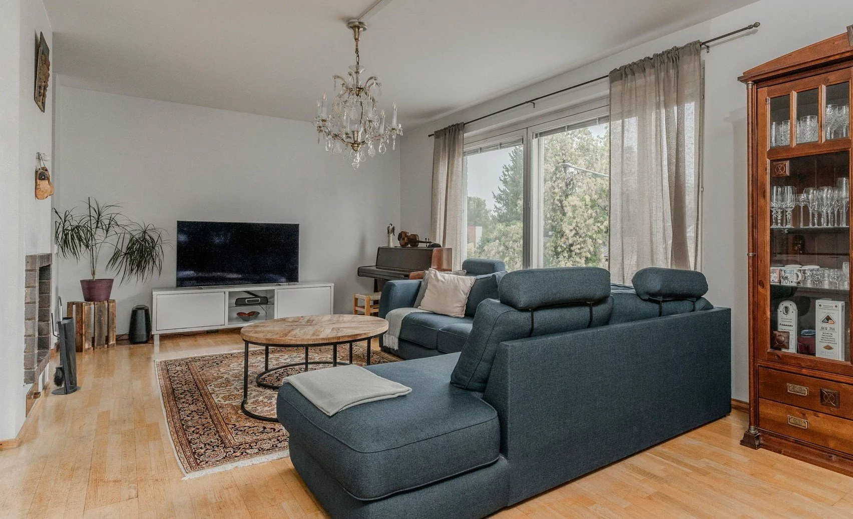 Erikoisuutena olohuoneen tunnelmaa tuova avotakka...
