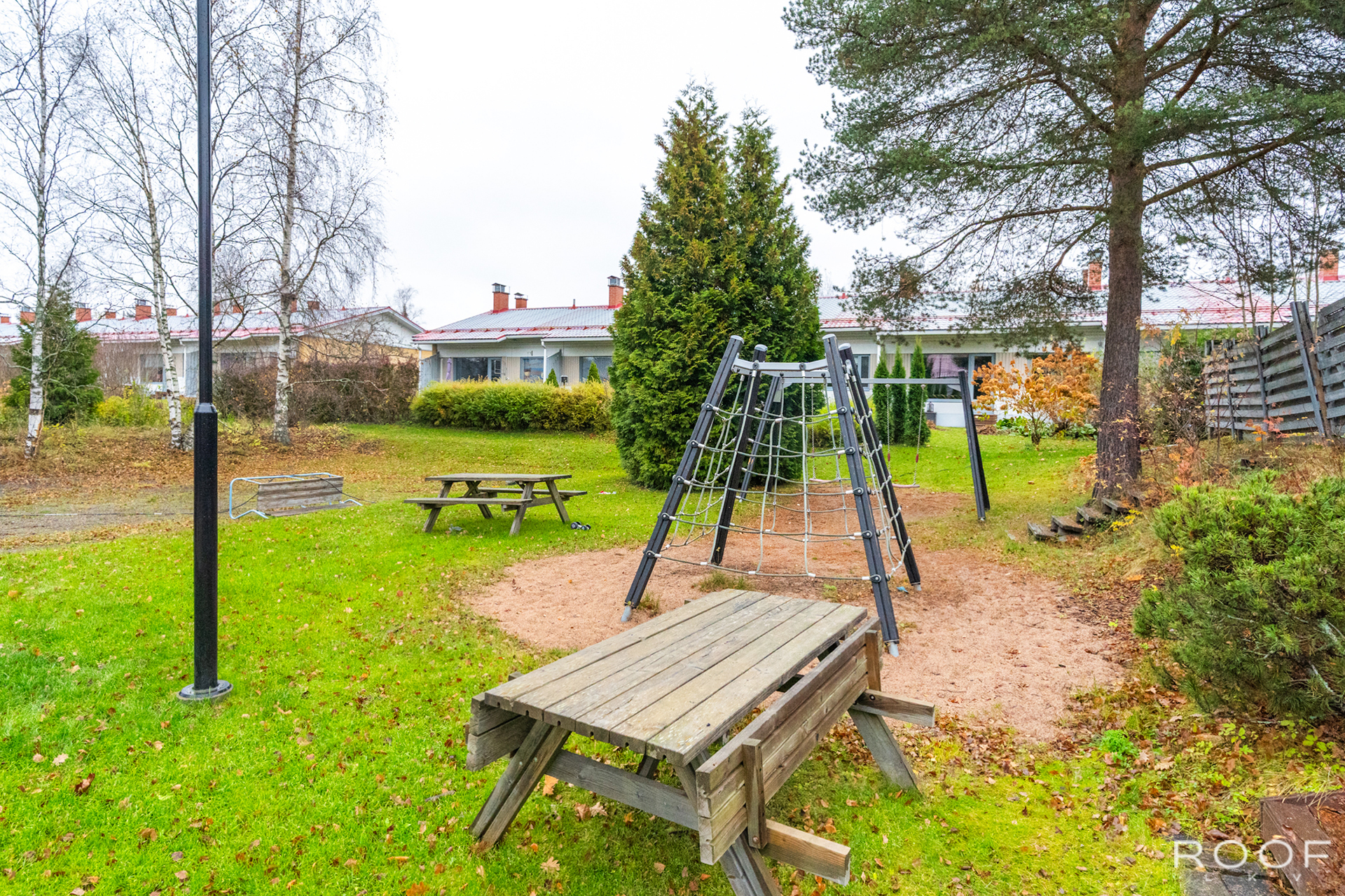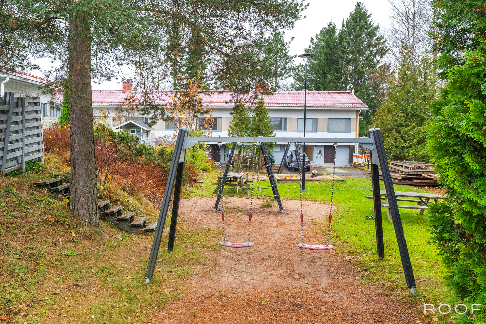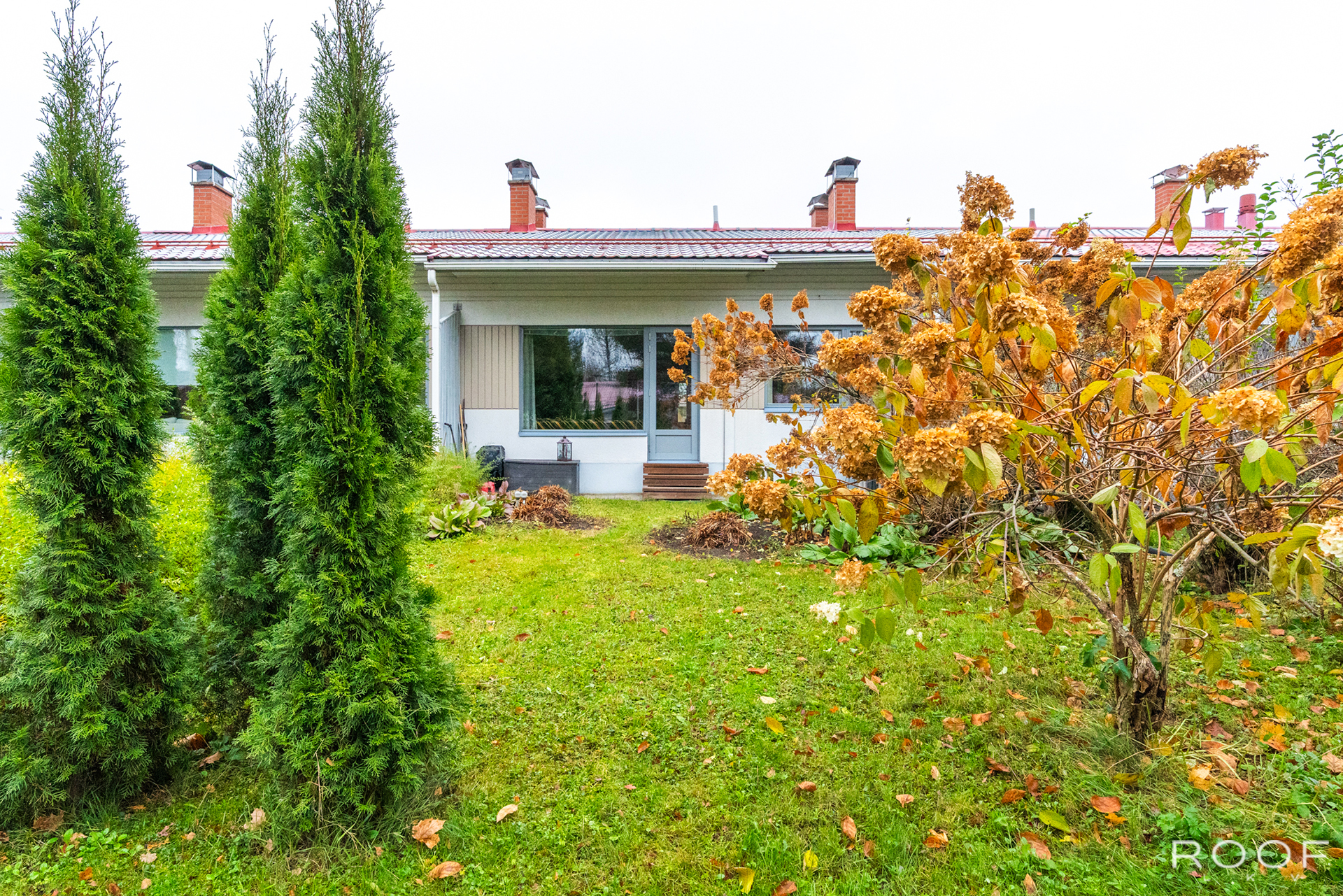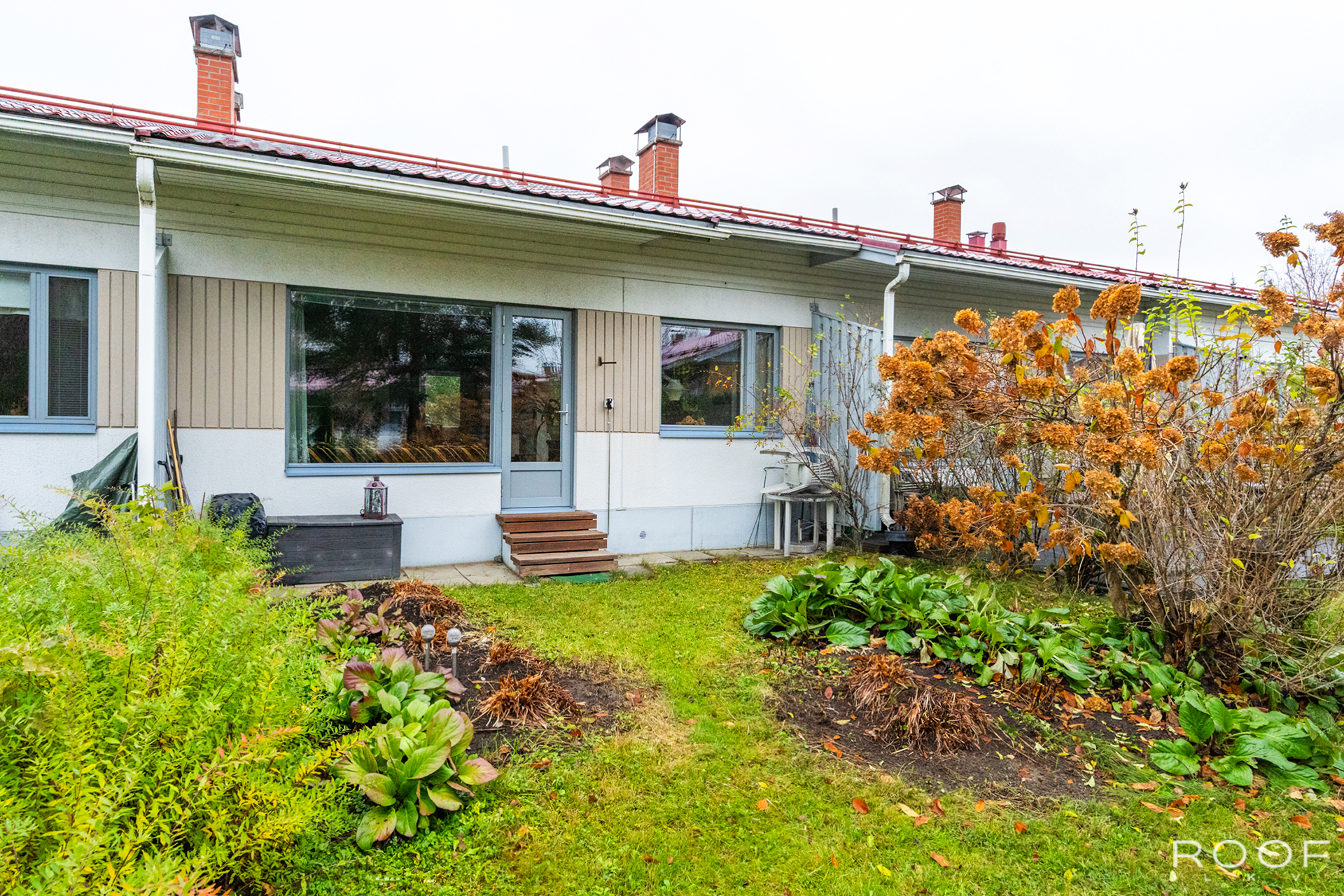 Asunto on käytännöllisesti kahdessa kerroksessa. Makuuhuone, kodinhoitotila ja pesutilat ovat alakerrassa. Molemmissa kerroksissa on erilliset wc:t. Yläkerrassa on avointa suurta tilaa yhdistäen olohuoneen, ruokailutilan ja keittiön. Olohuoneesta on kulku asunnon etelään avautuvalle valoisalle, viihtyisälle ja suojaisalle omalle pihalle, jossa nurmikkoa ja monipuoliset istutukset. Lapset pääsevät omalta pihaltaan suoraan taloyhtiön viihtyisälle leikkipaikalle. Voi sanoa, että tämä on taloyhtiön parhaita pihoja.