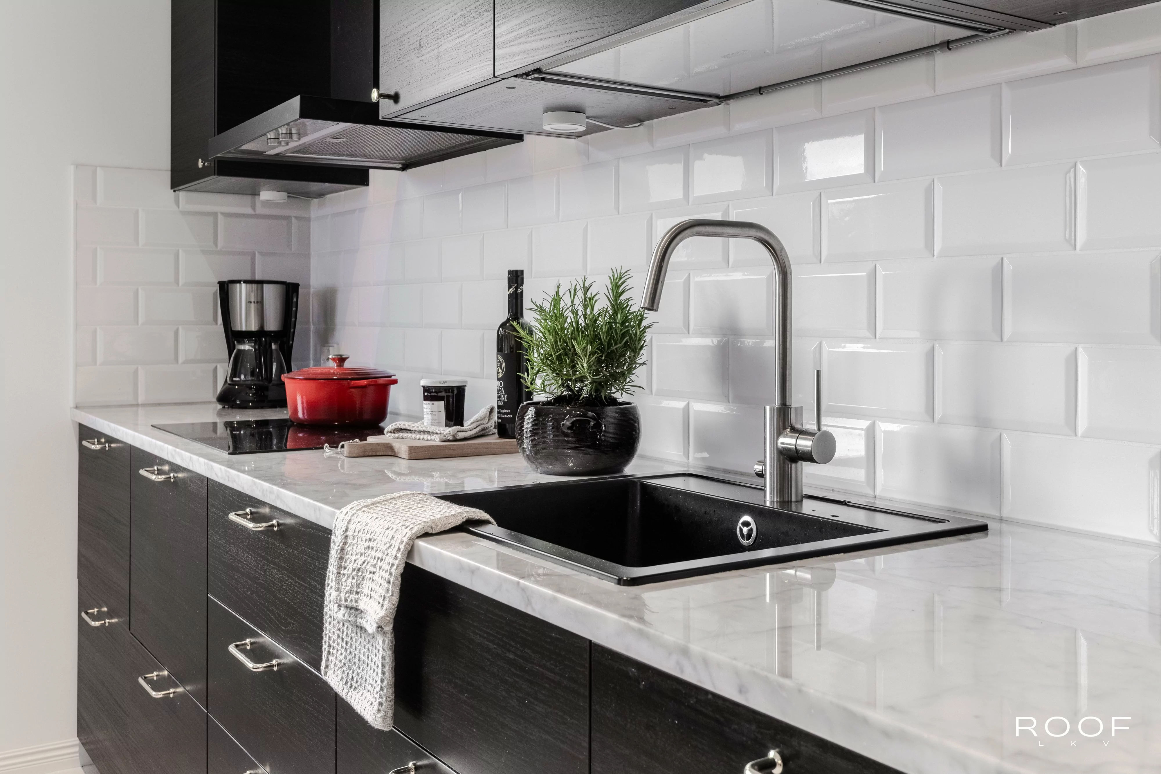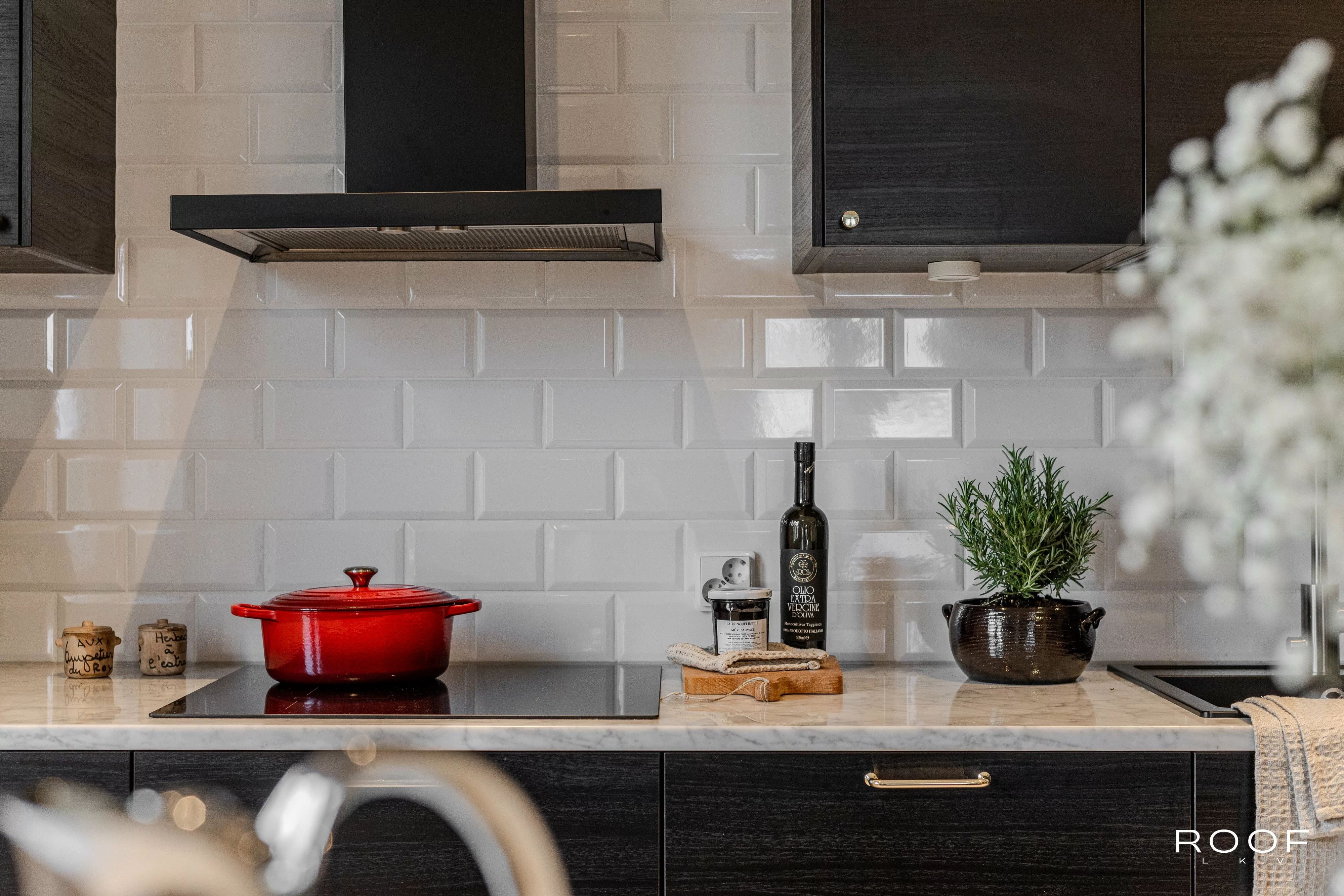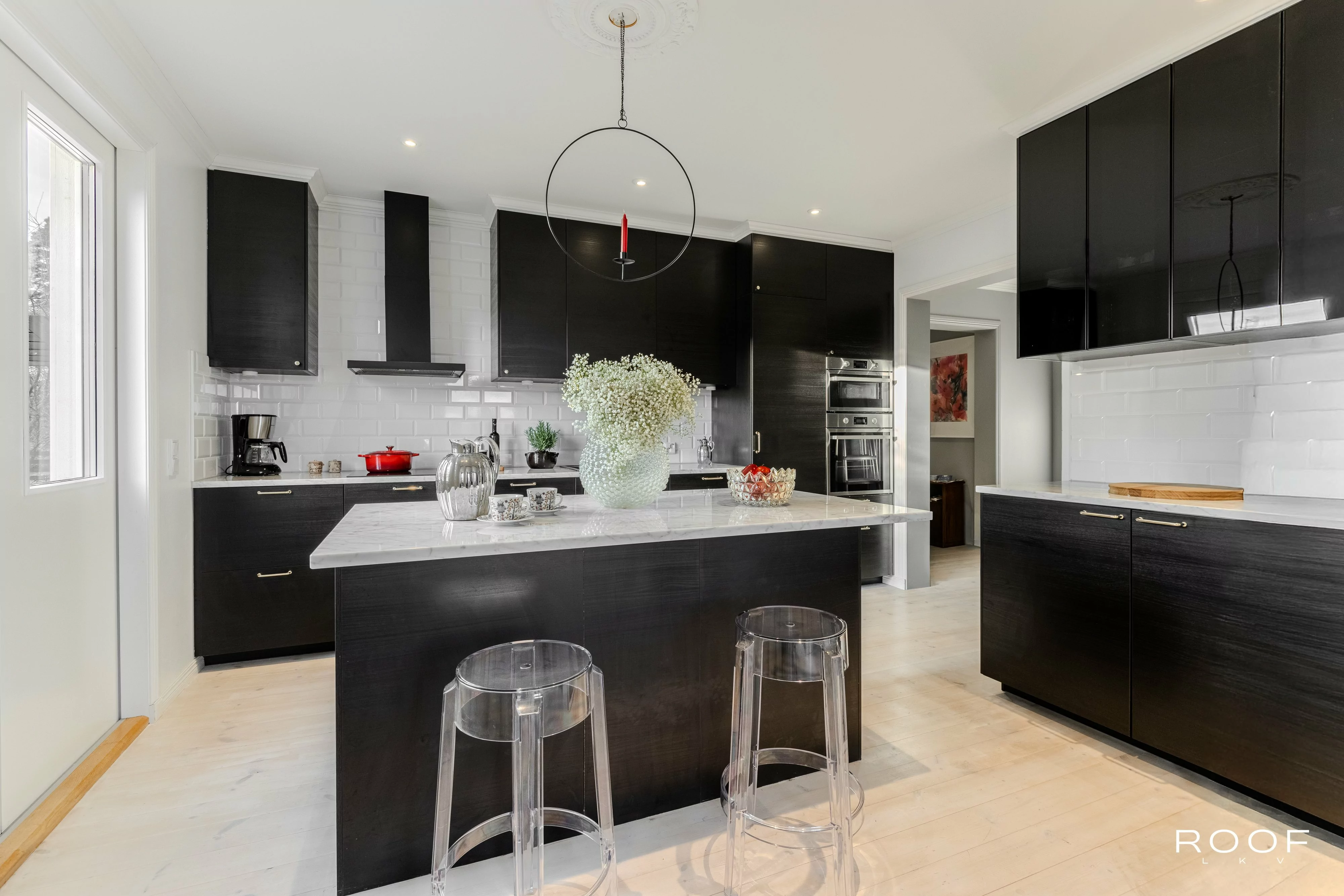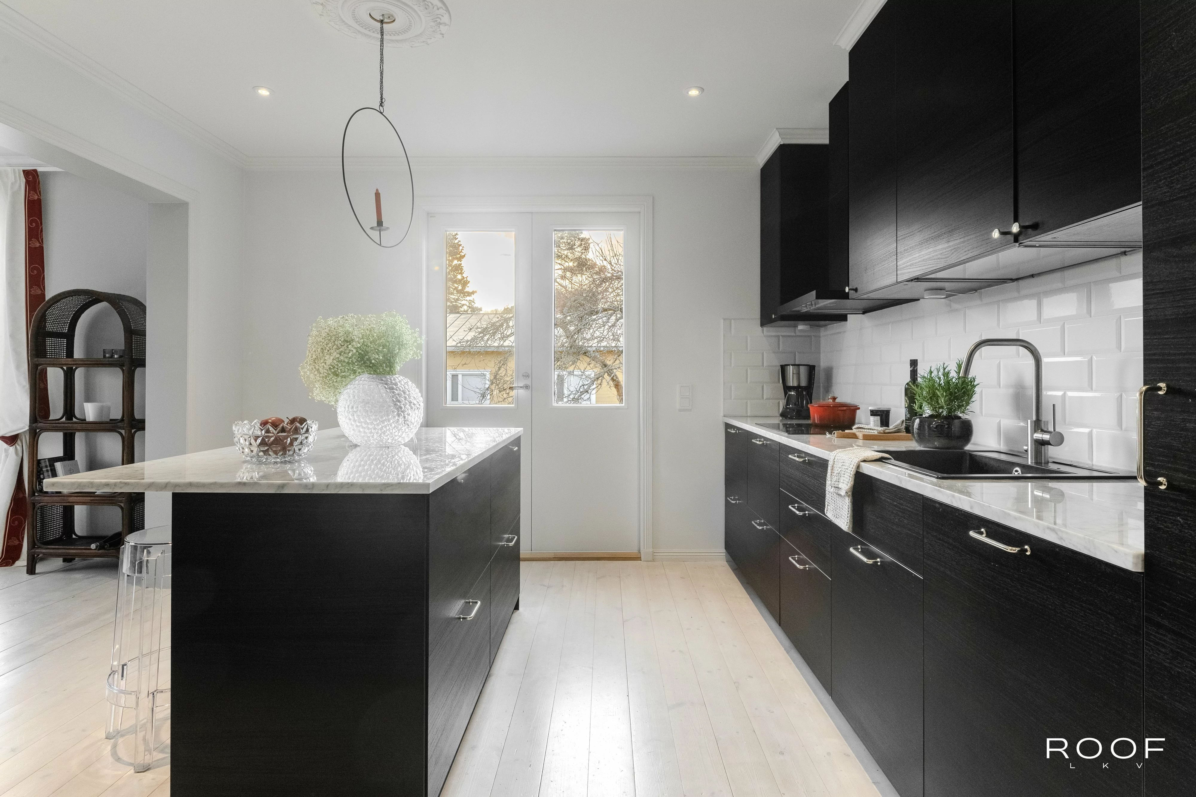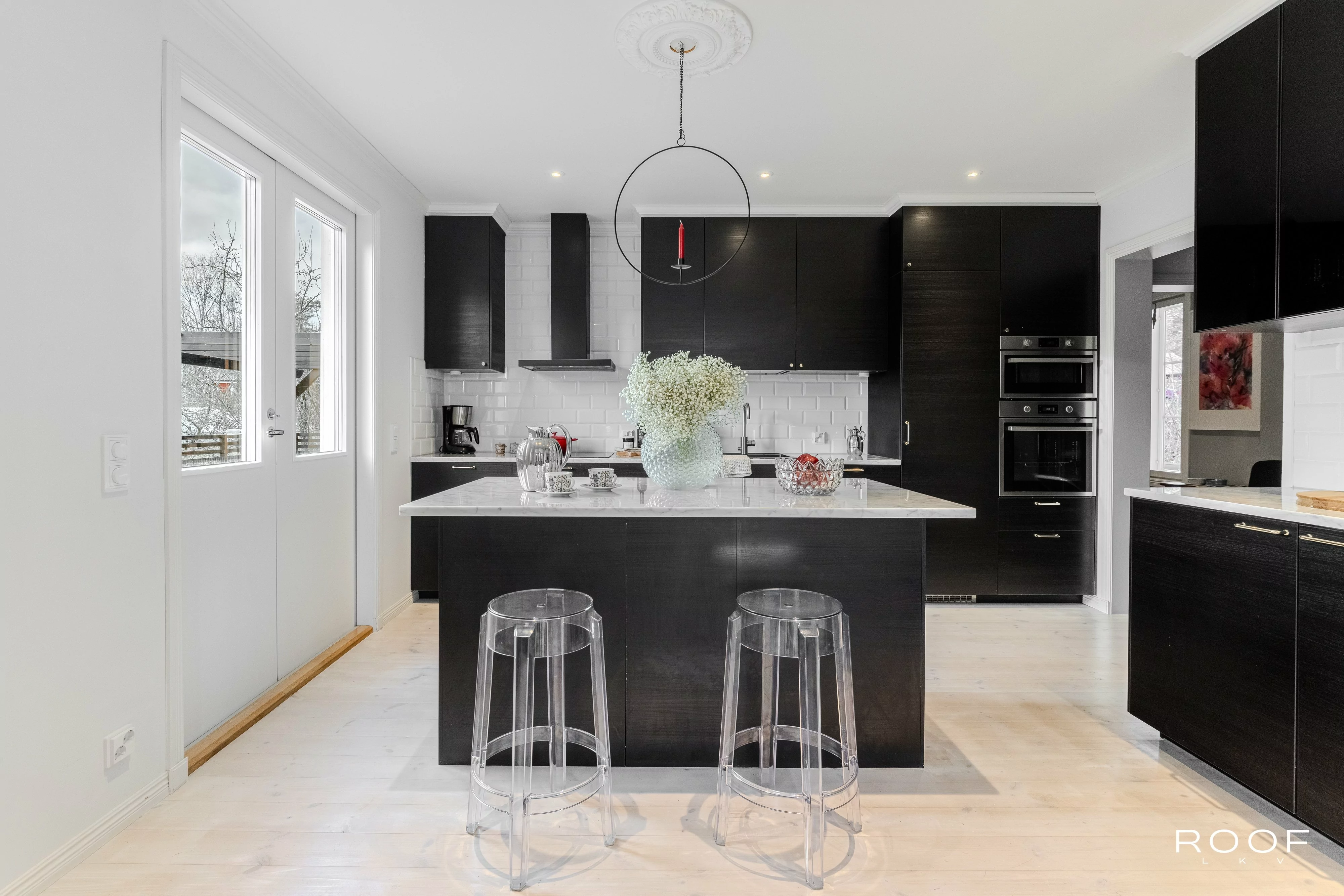 Keittiö on moderni, tyylikäs ja hyvin varusteltu, ja sieltä löytyy saareke marmoritasoineen. Talossa on pääosin puulattiat ja olohuoneessa sekä ruokailutilassa jykevät lankkulattiat.