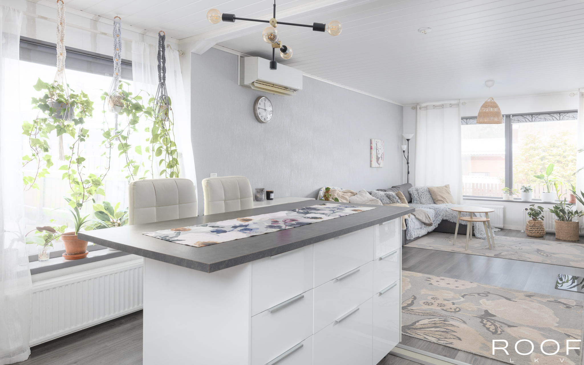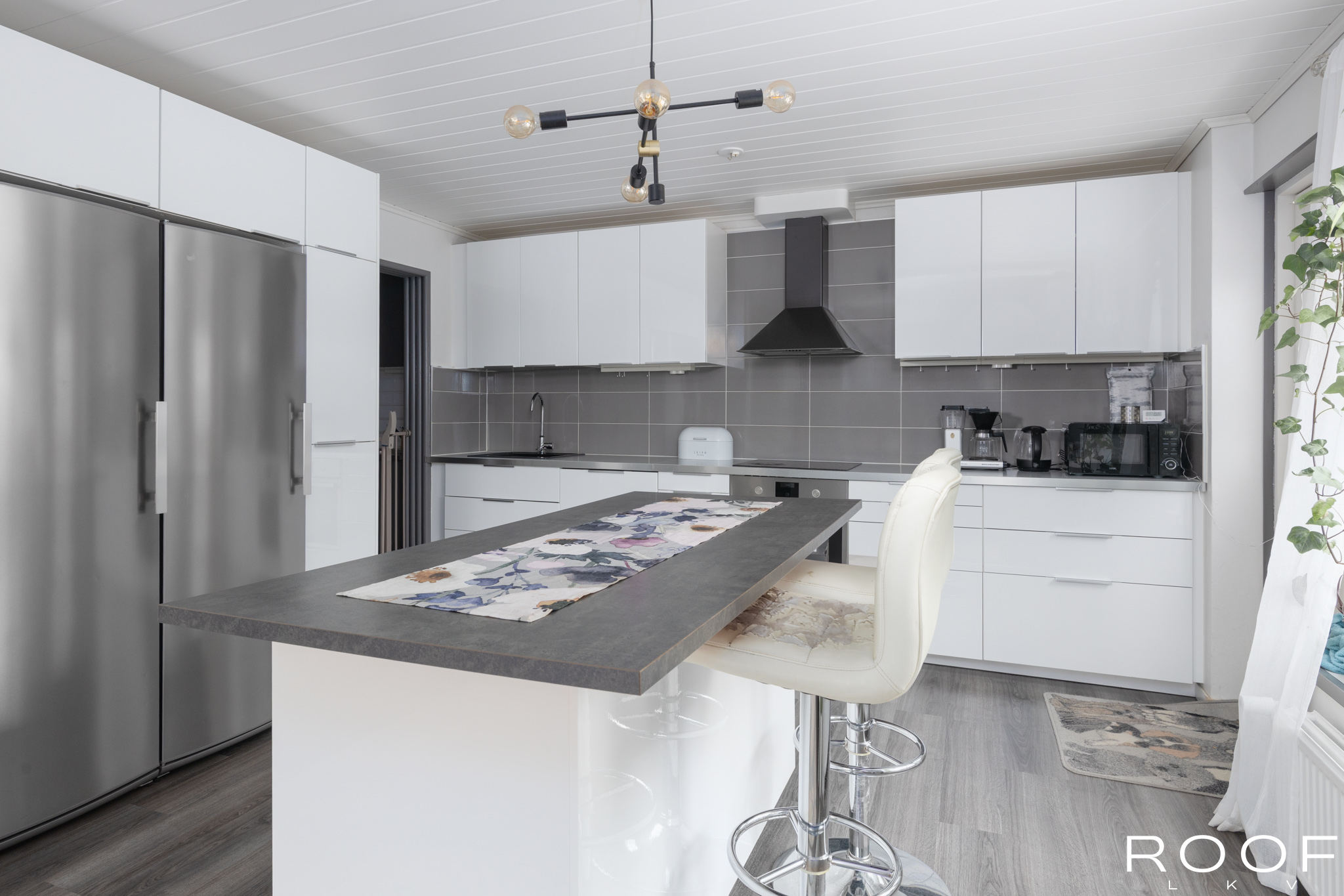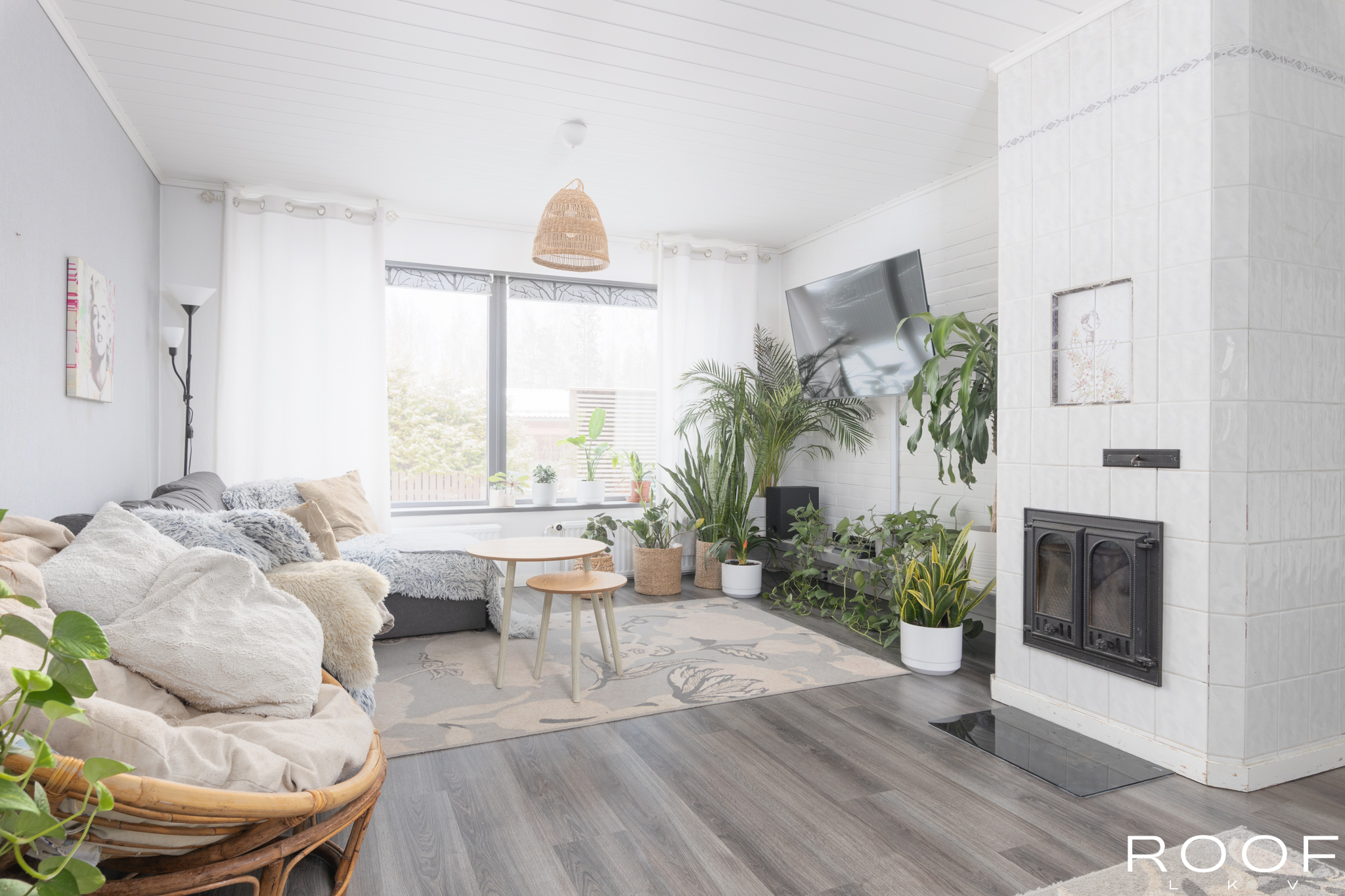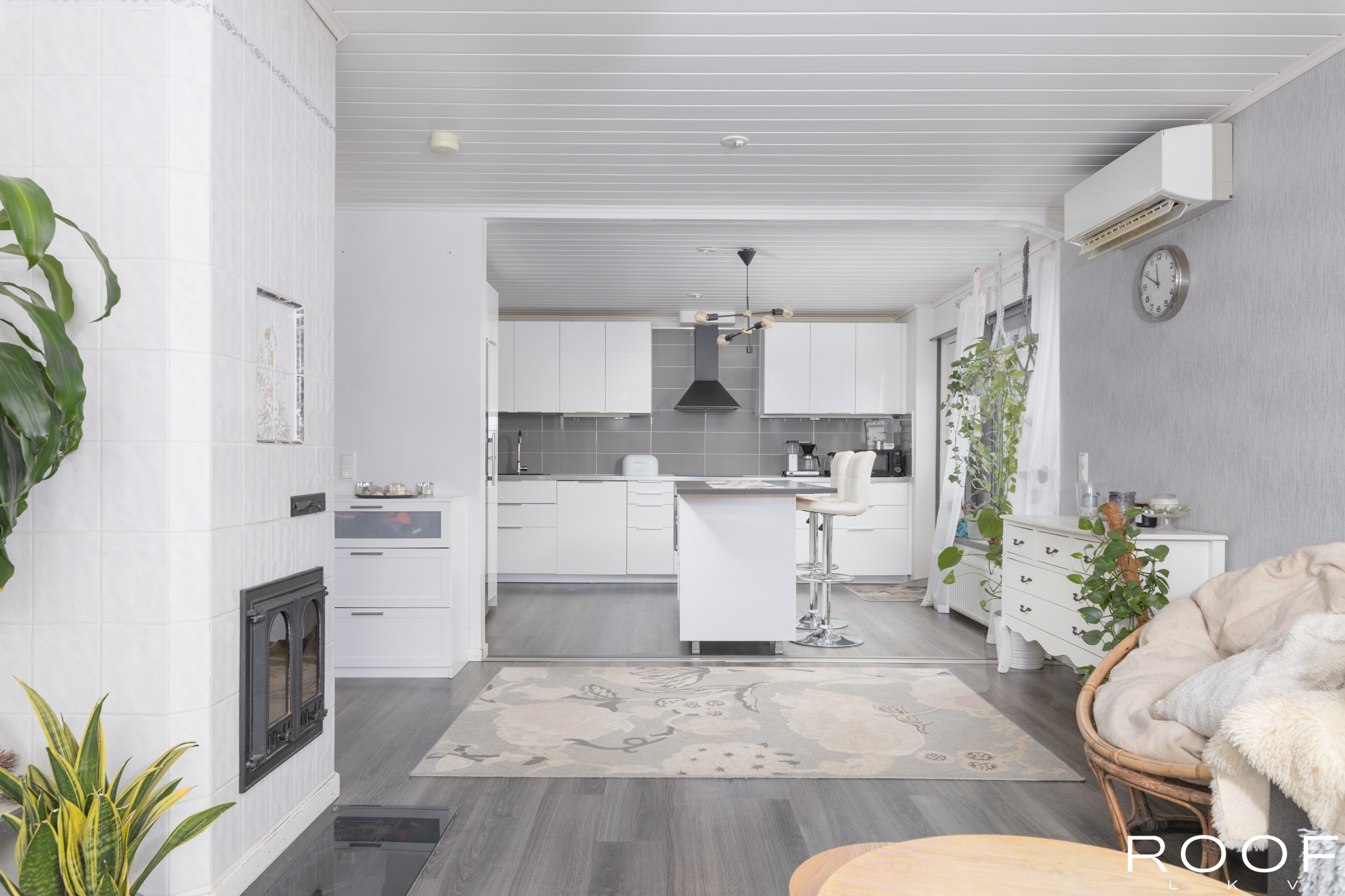 Kodissa on valoisa olohuone, jossa on iso ikkuna ja takka tuomassa tunnelmaa ja lämpöä. Olohuone yhdistyy tilavaan ruokailutilaan, jonka kautta kulku onnistuu katetulle terassille ja suojaisalle pihalle. Moderni vaaleasävyinen keittiö on remontoitu ja siinä on hyvin kaappi- ja laskutilaa sekä käytännöllinen saareke.