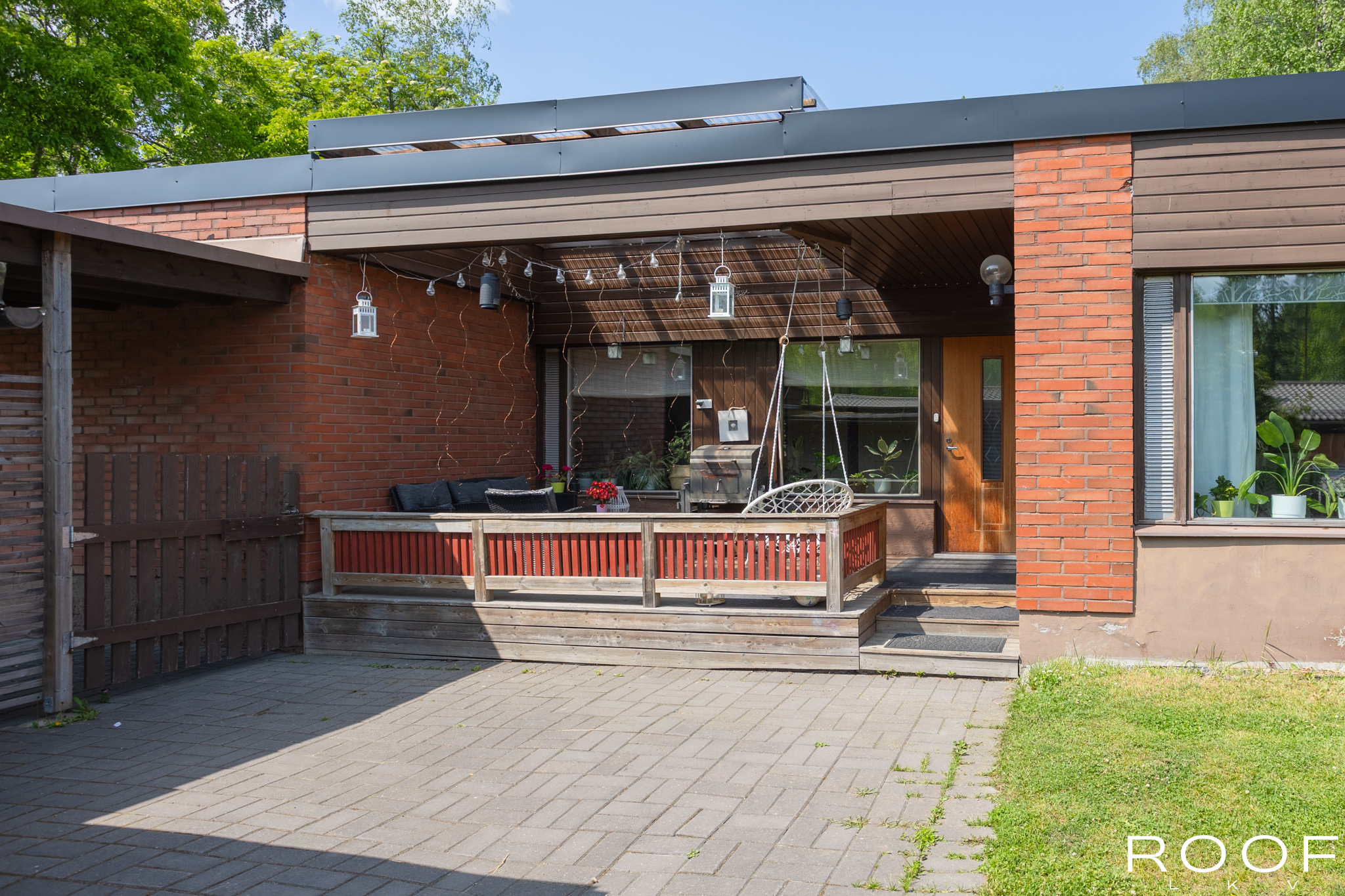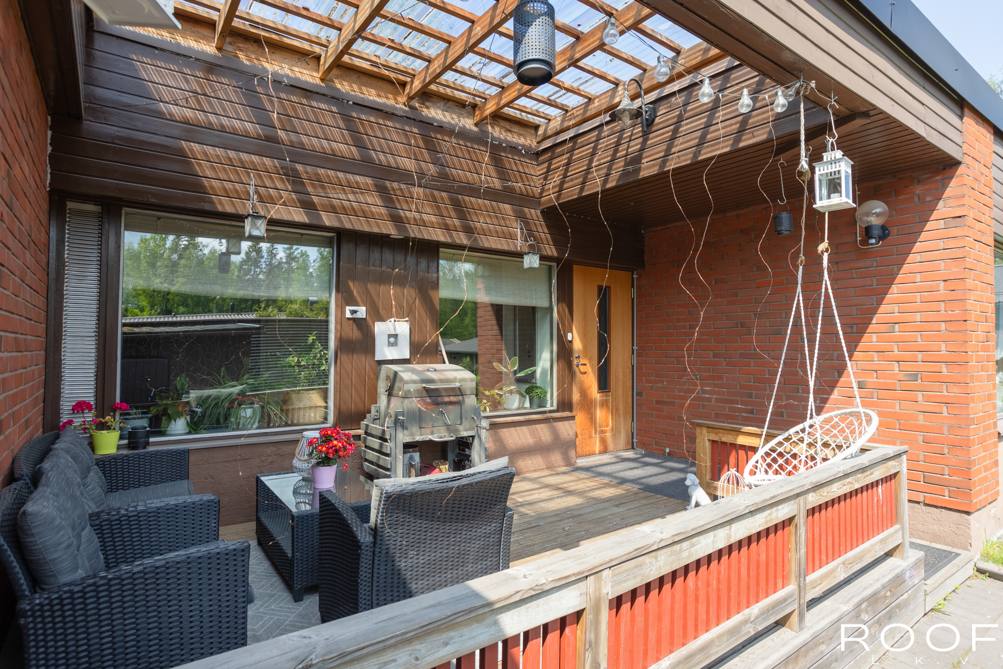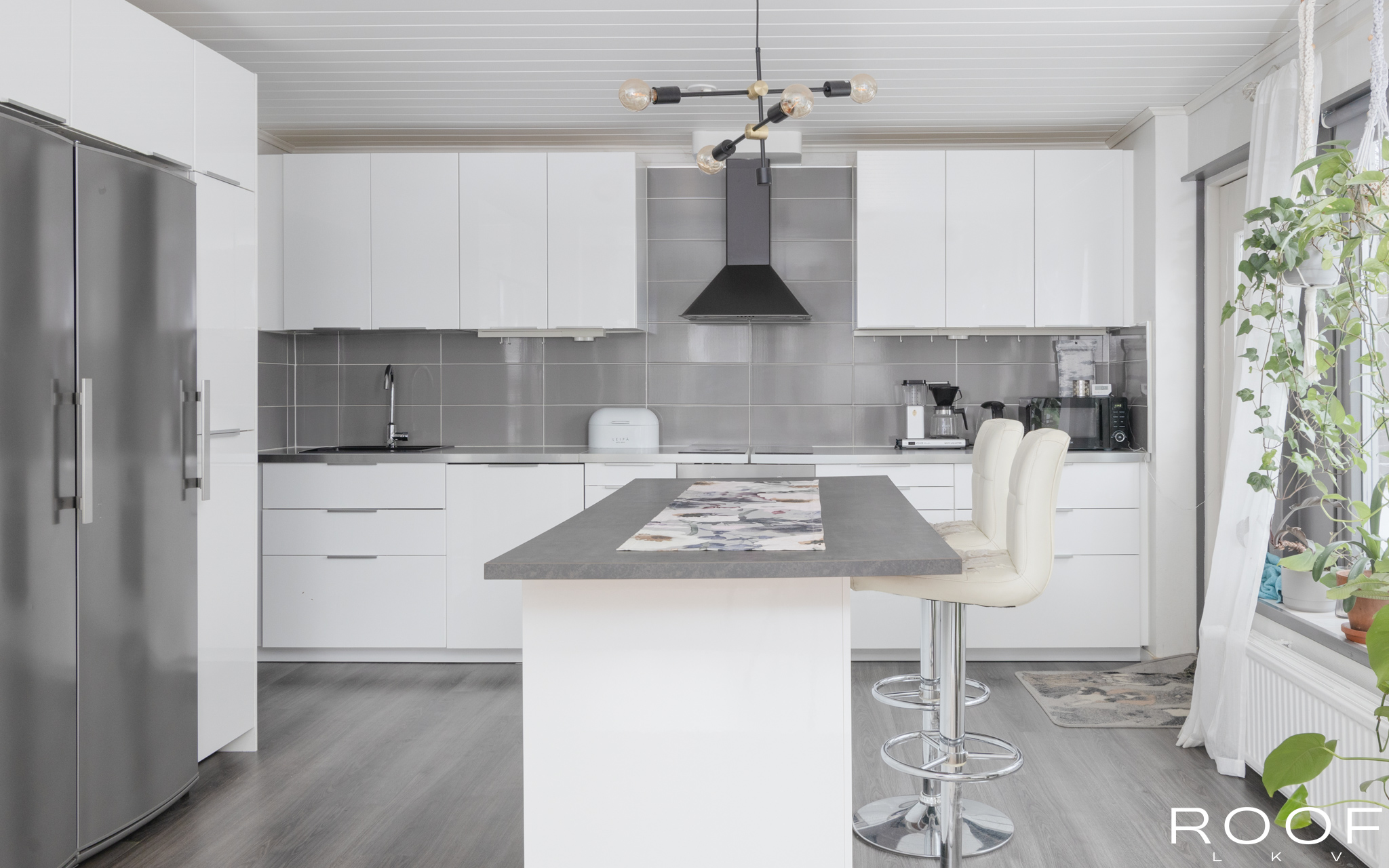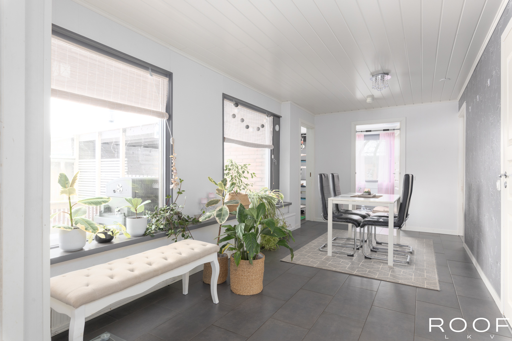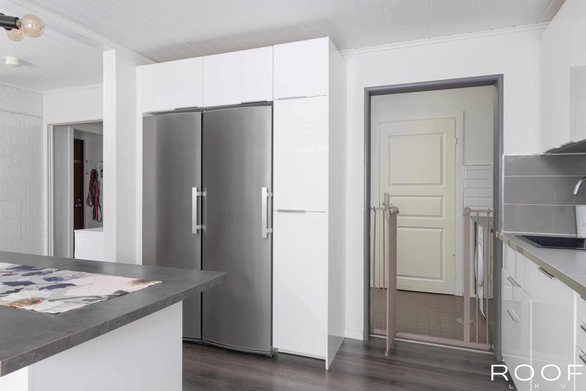 Kodissa on valoisa olohuone, jossa on iso ikkuna ja takka tuomassa tunnelmaa ja lämpöä. Olohuone yhdistyy tilavaan ruokailutilaan, jonka kautta kulku onnistuu katetulle terassille ja suojaisalle pihalle. Moderni vaaleasävyinen keittiö on remontoitu ja siinä on hyvin kaappi- ja laskutilaa sekä käytännöllinen saareke.