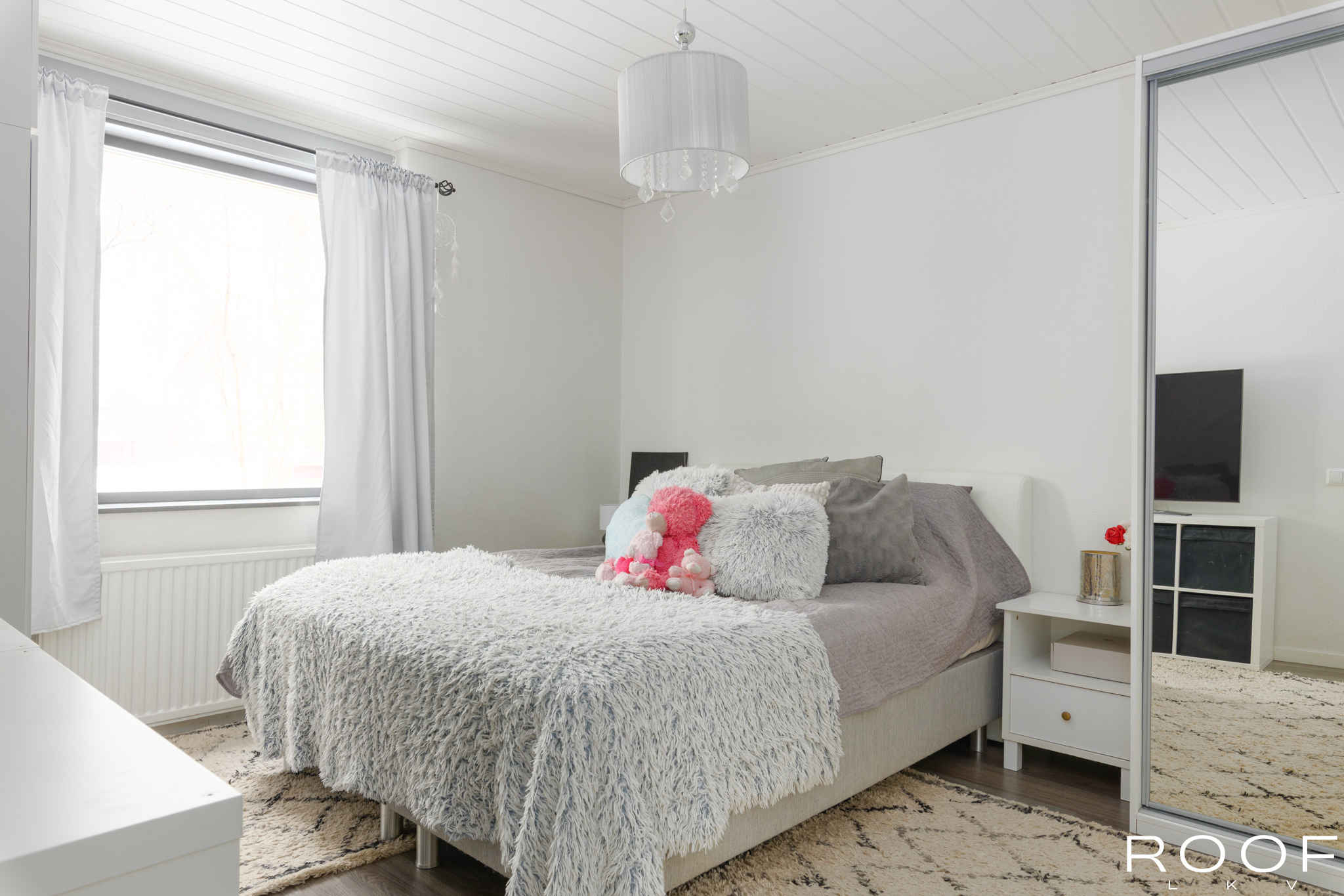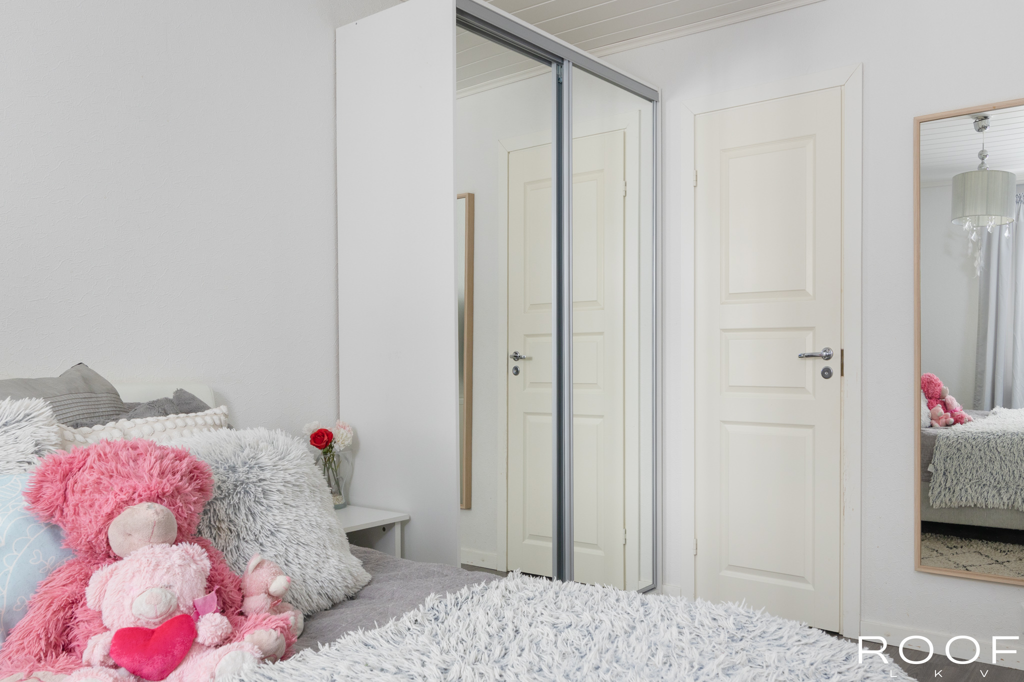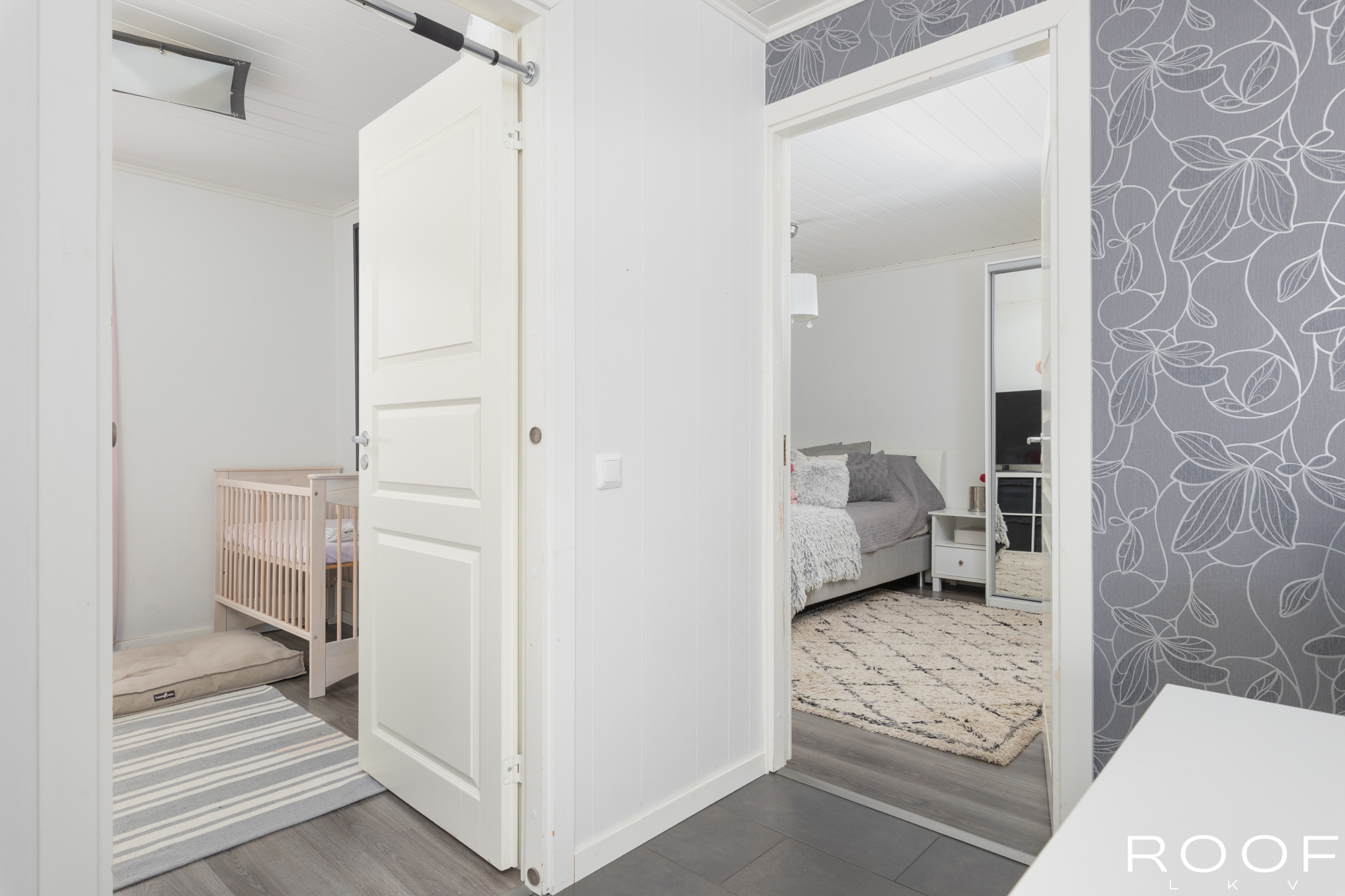 Kolme makuuhuonetta on sijoiteltu rauhallisesti talon toiseen päähän, ja niistä löytyy kaapistot tai vaatehuone säilytystä helpottamaan. Kodinhoitotilassa on hyvin säilytys- ja työskentelytilaa sekä paikka pyykkikoneelle. Saunaosasto on uudistettu tummasävyiseksi ja tunnelmalliseksi – tilasta löytyy myös erillinen WC.