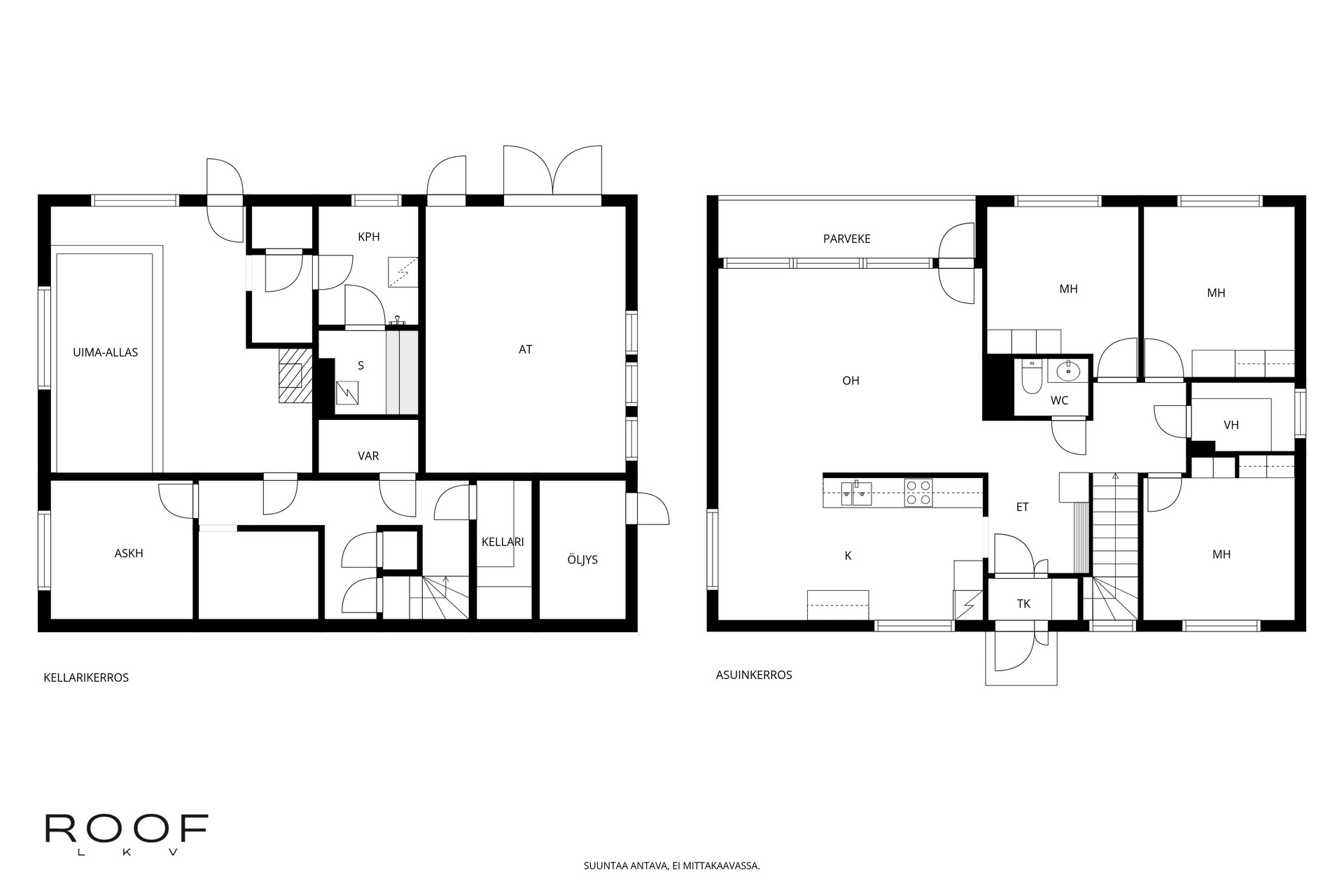 Kellarikerroksessa takka-/allashuone, jonka alkuperäinen uima-allas on katettu oleskelutiloiksi, saunaosasto, varastotiloja ja wc. Tiloista on myös uloskäynti.