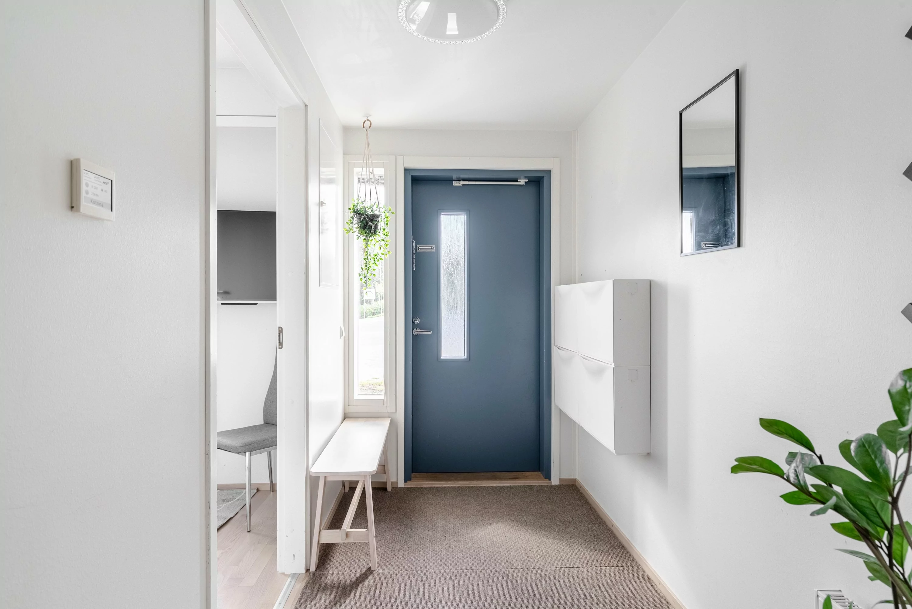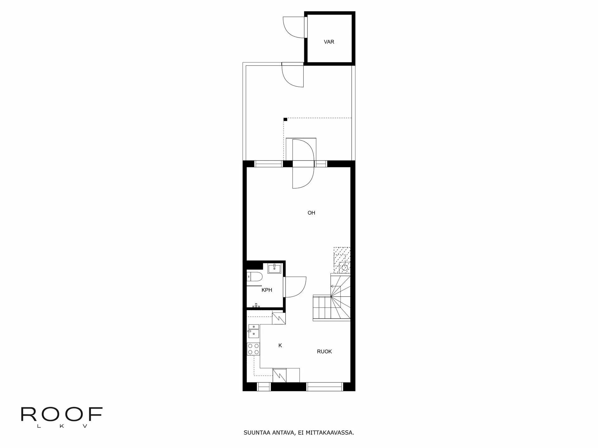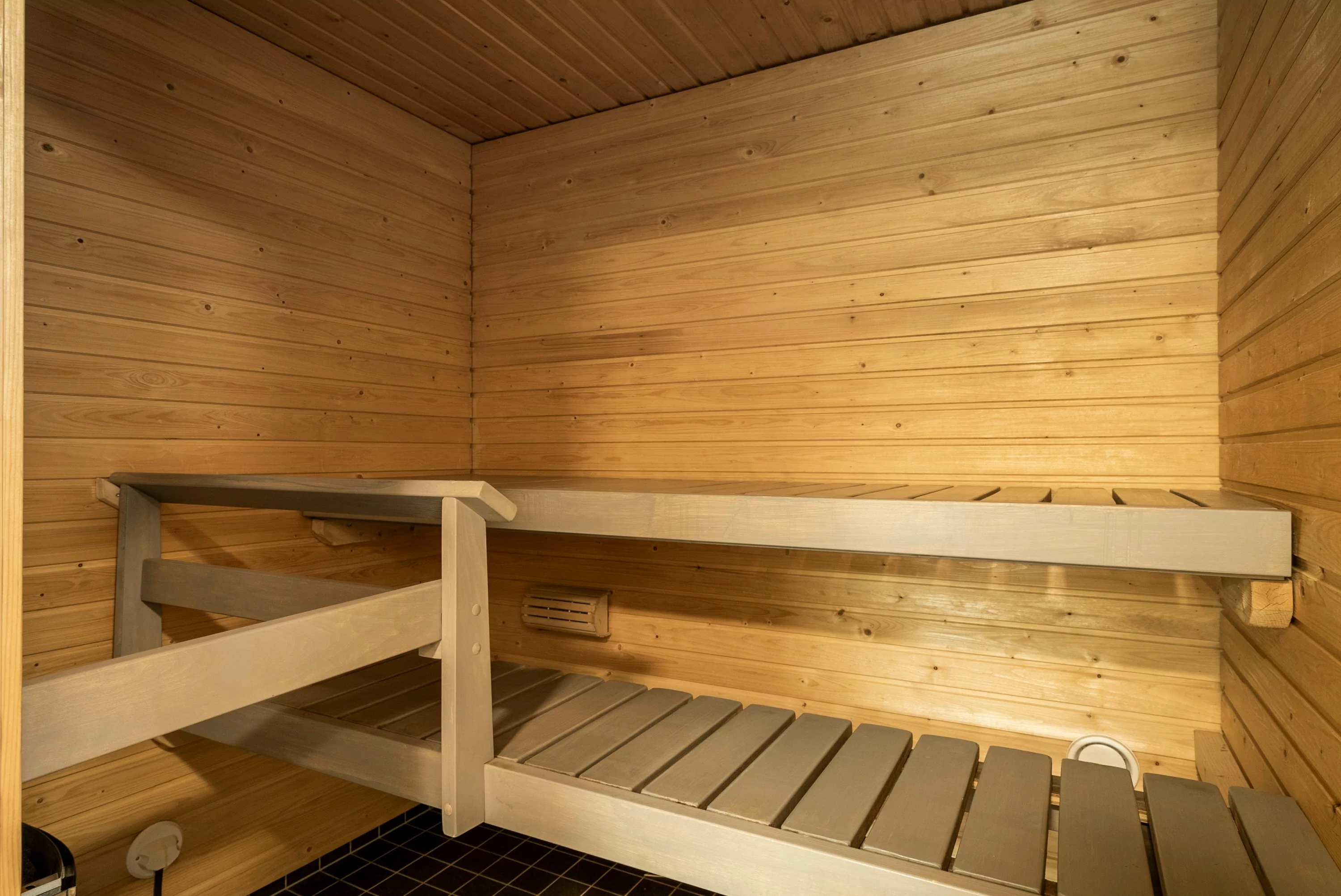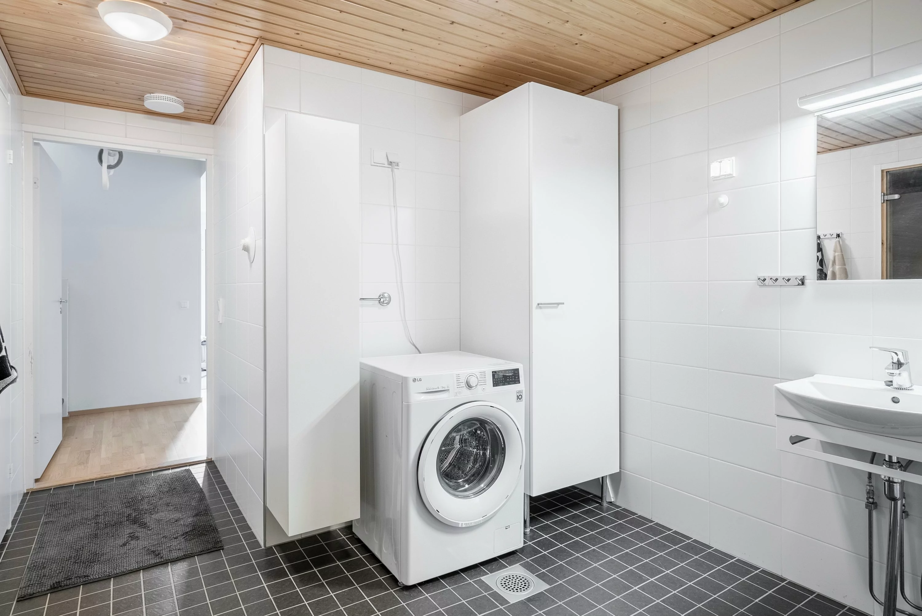 Sisääntulokerroksessa on yhden makuuhuoneen lisäksi erillinen wc-, pesuhuone-/saunatilat sekä vaatehuone. Pesuhuoneessa on myös reilusti tilaa pyykkihuollolle.
