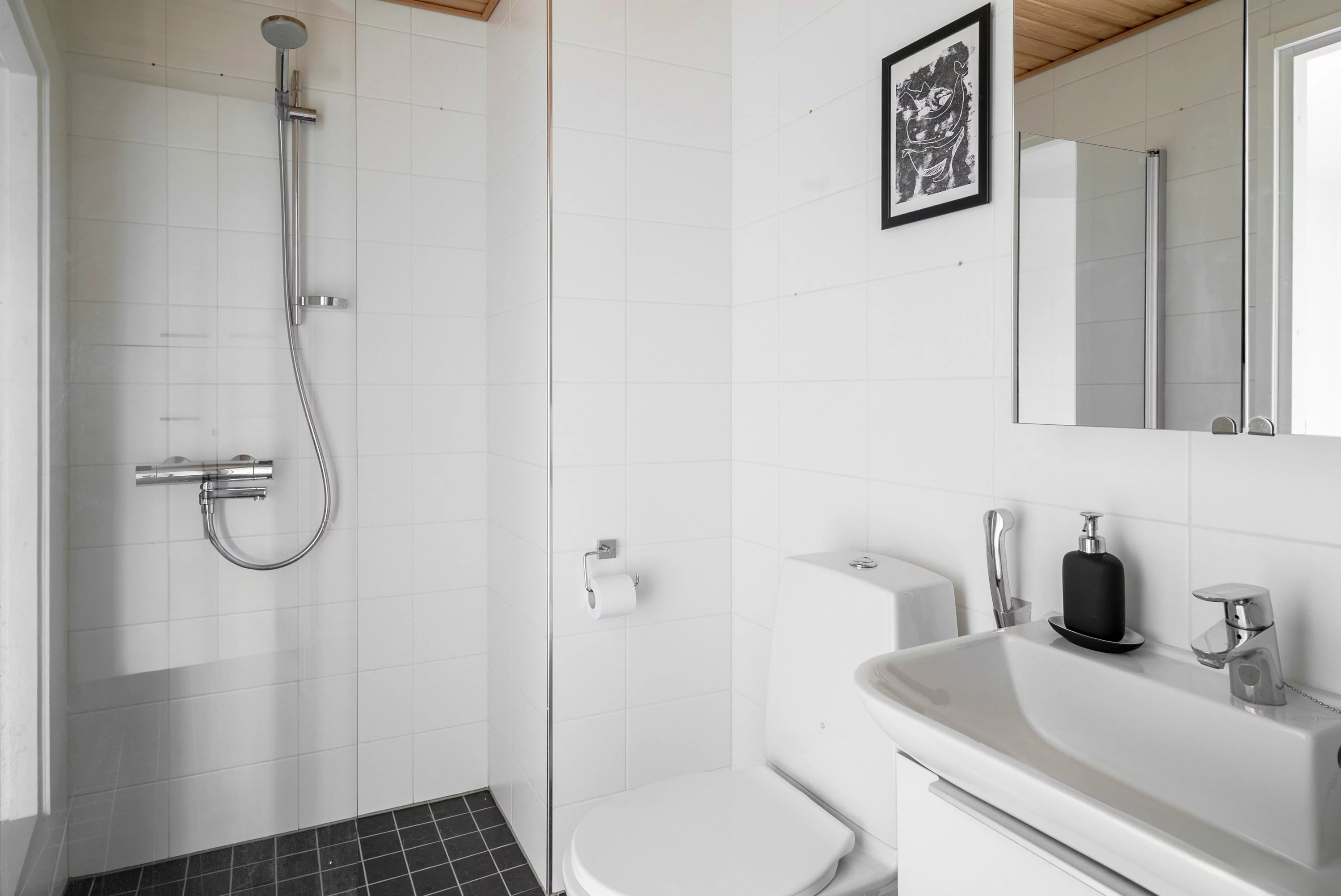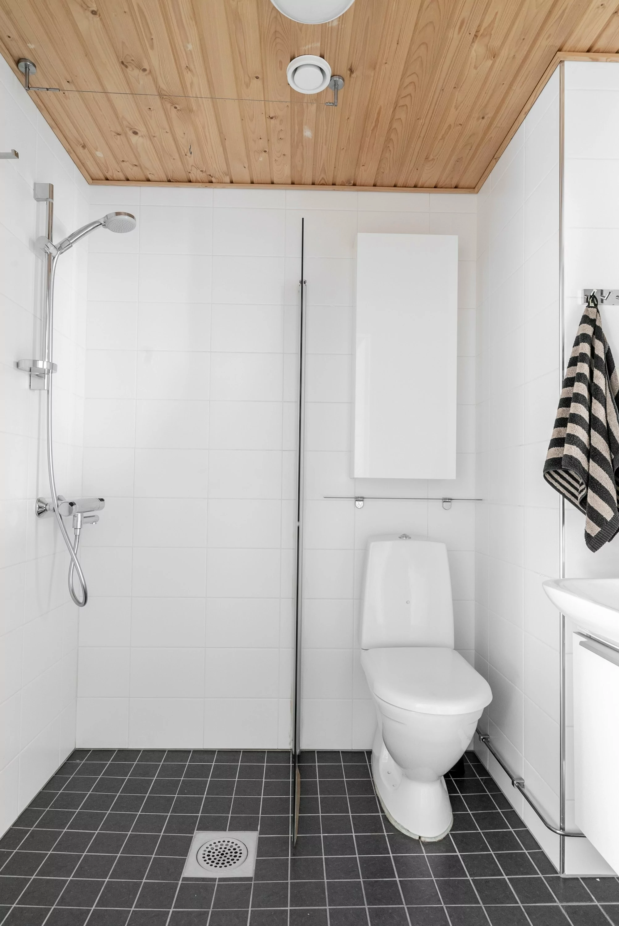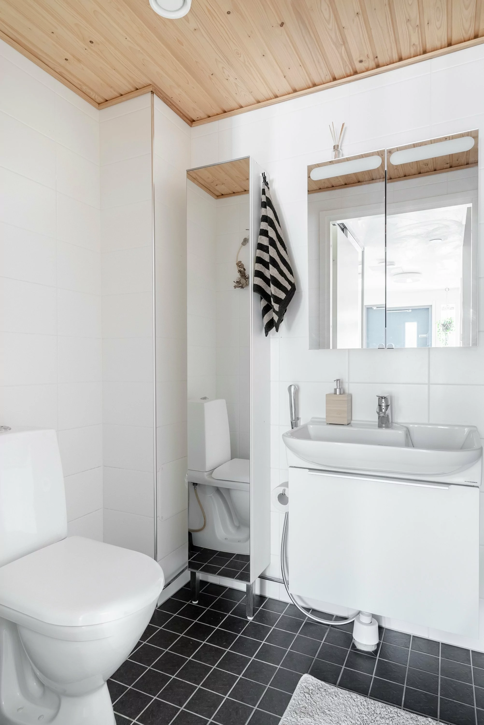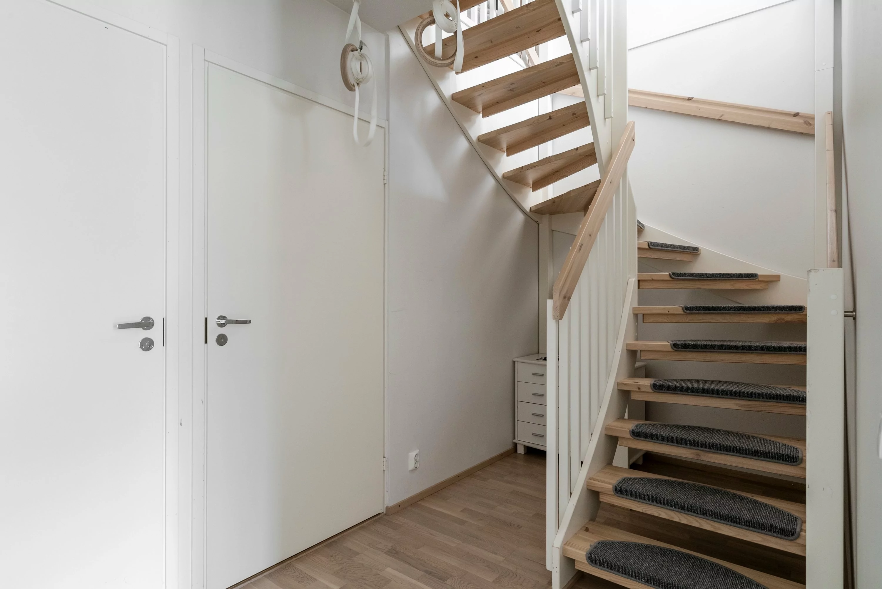 Sisääntulokerroksessa on yhden makuuhuoneen lisäksi erillinen wc-, pesuhuone-/saunatilat sekä vaatehuone. Pesuhuoneessa on myös reilusti tilaa pyykkihuollolle.