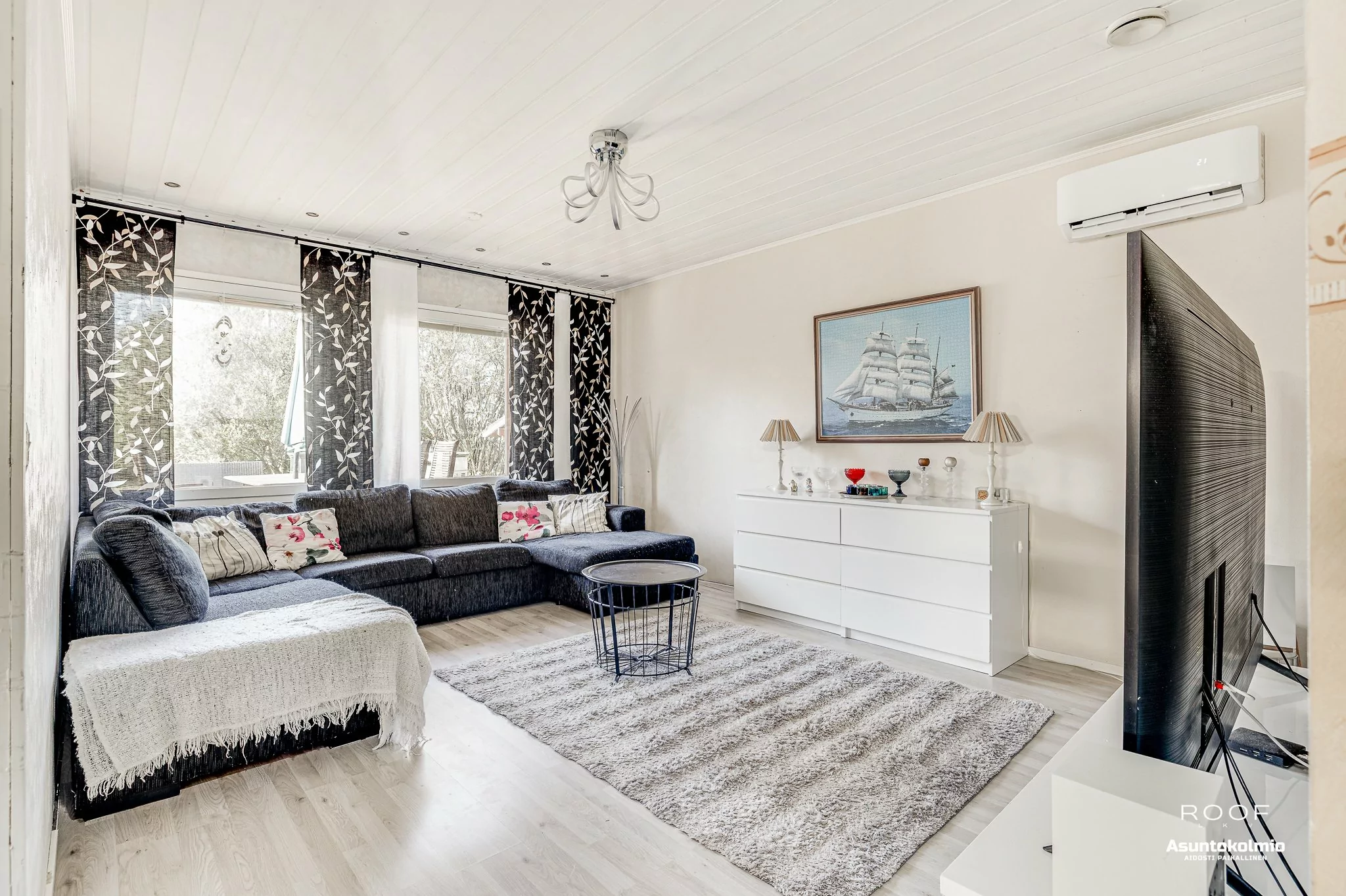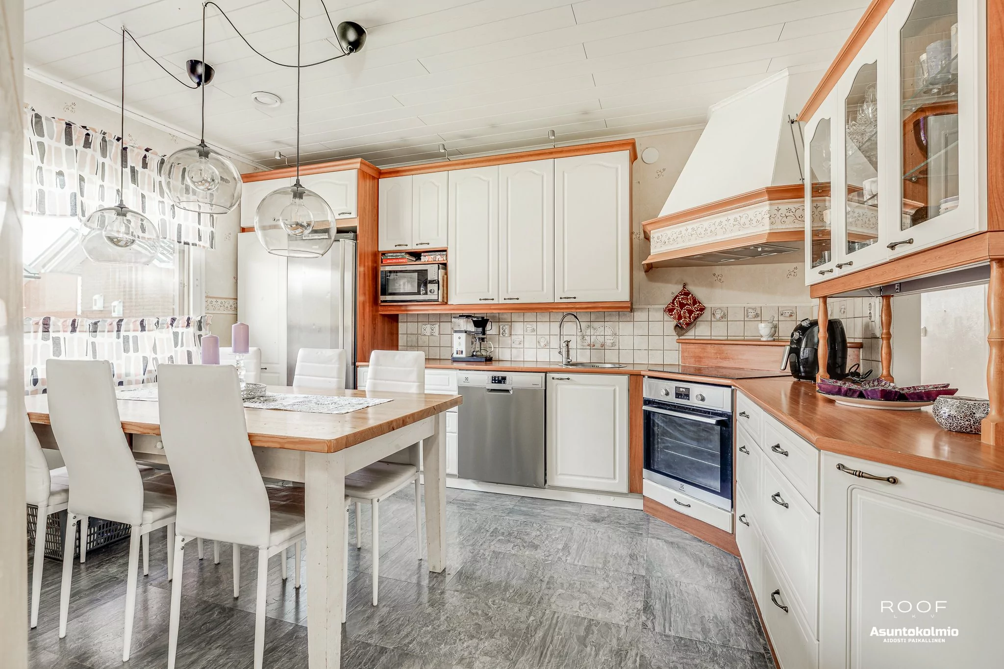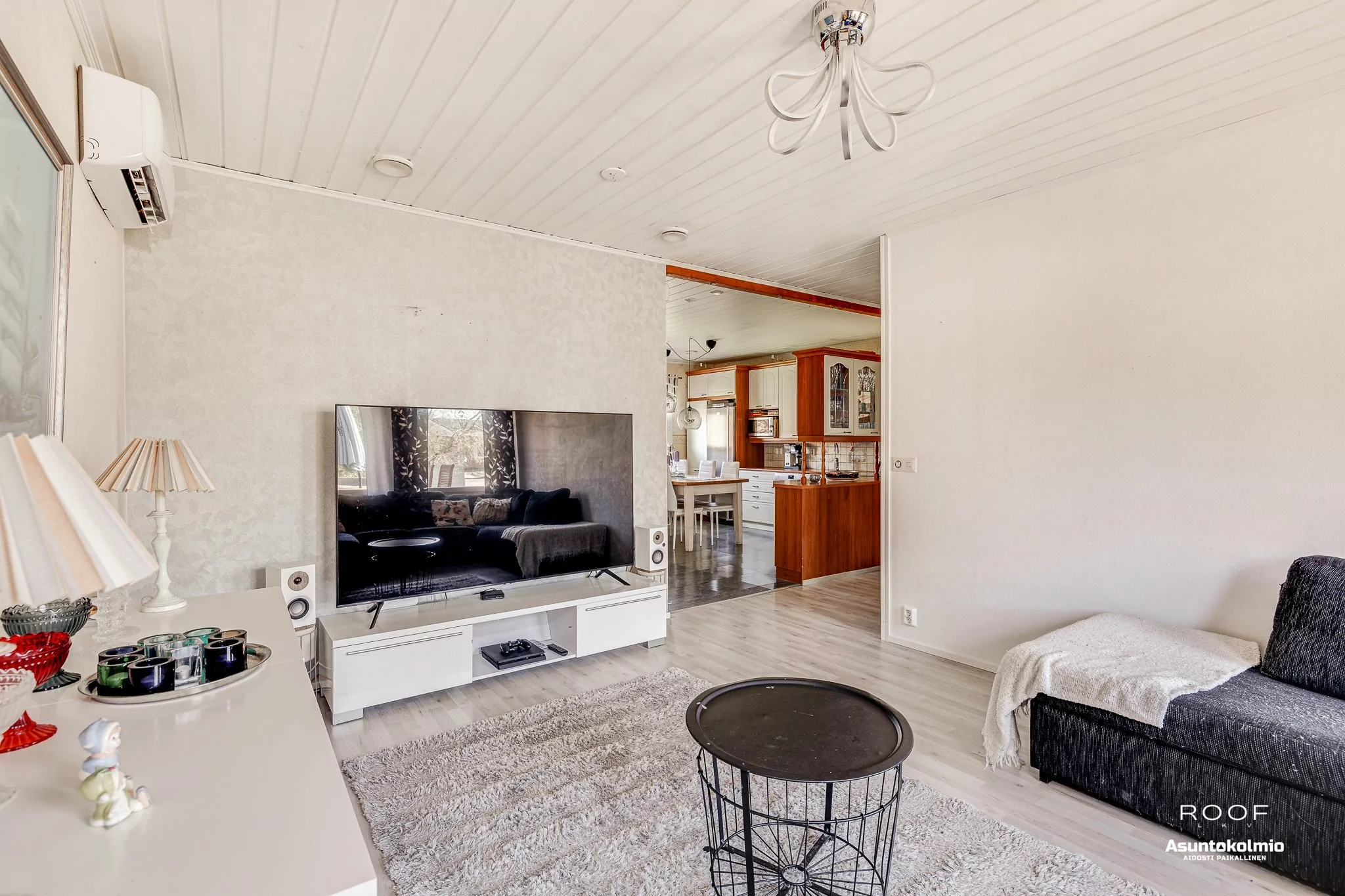 Sisällä lämpöä ja tunnelmaa luo varaava takka, ja sähkö sekä ilmalämpöpumppu huolehtivat talon lämmityksestä. Keittiö on päivitetty vuonna 2023 uusilla kodinkoneilla, ja sen laminaattilattia sekä tapetoidut seinät tuovat modernia ilmettä. Kolme makuuhuonetta tarjoavat tilaa perheelle ...