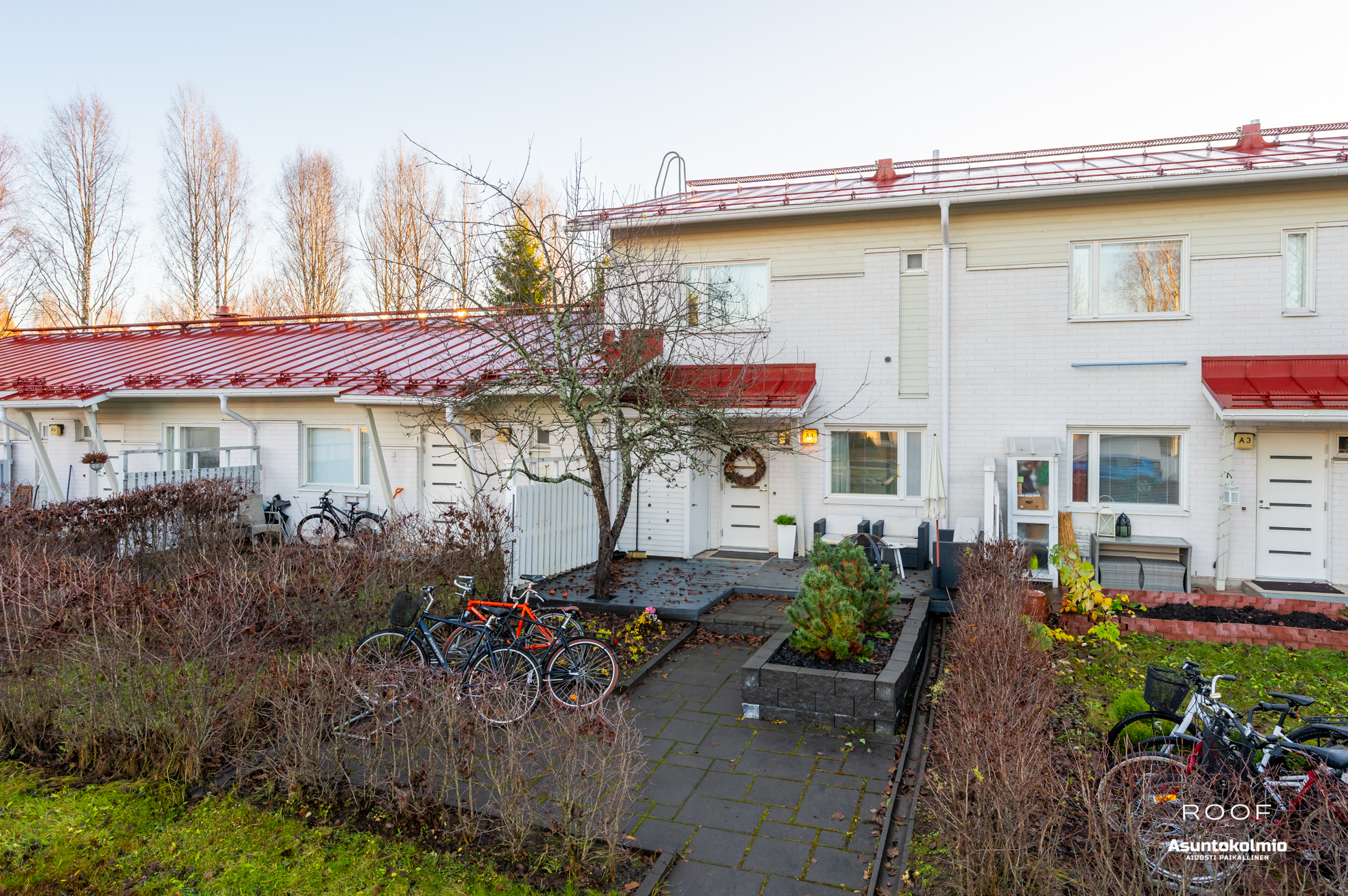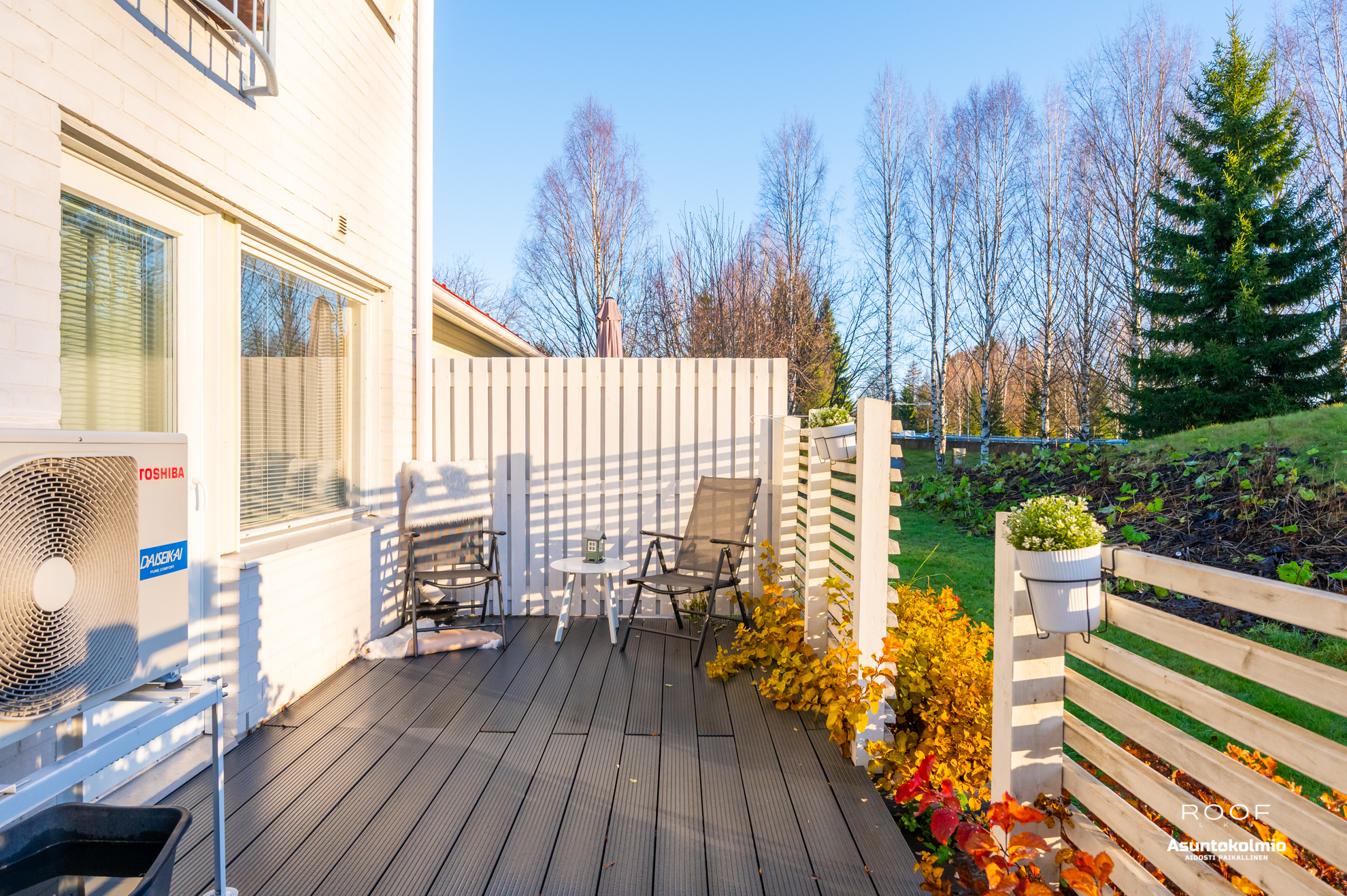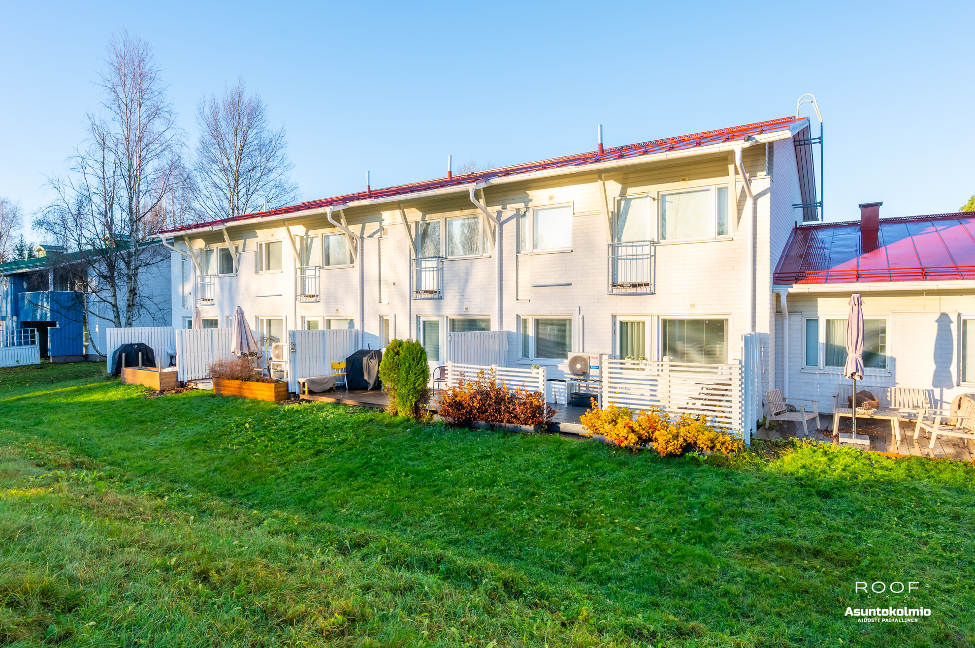 Tämän asunnon näppärät pihamaat on helppo pitää siisteinä, eikä nurmenleikkuutta ym. pihatyötä todella ole liiaksi! Takapihan puolella nautitaan viileydestä vaikkapa saunomisen jälkeen ja etupiha omenapuineen sijoittuu lännen suuntaan.