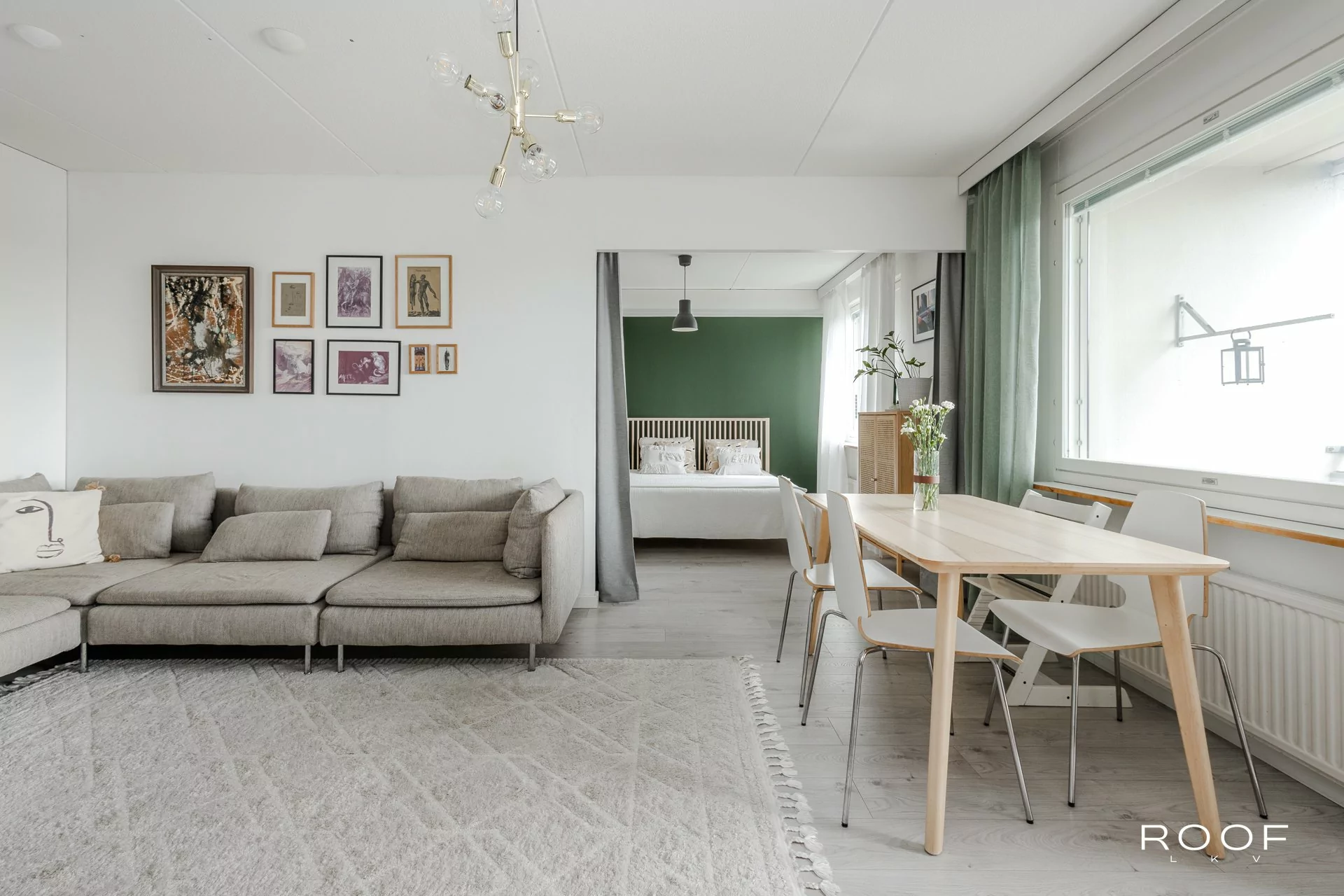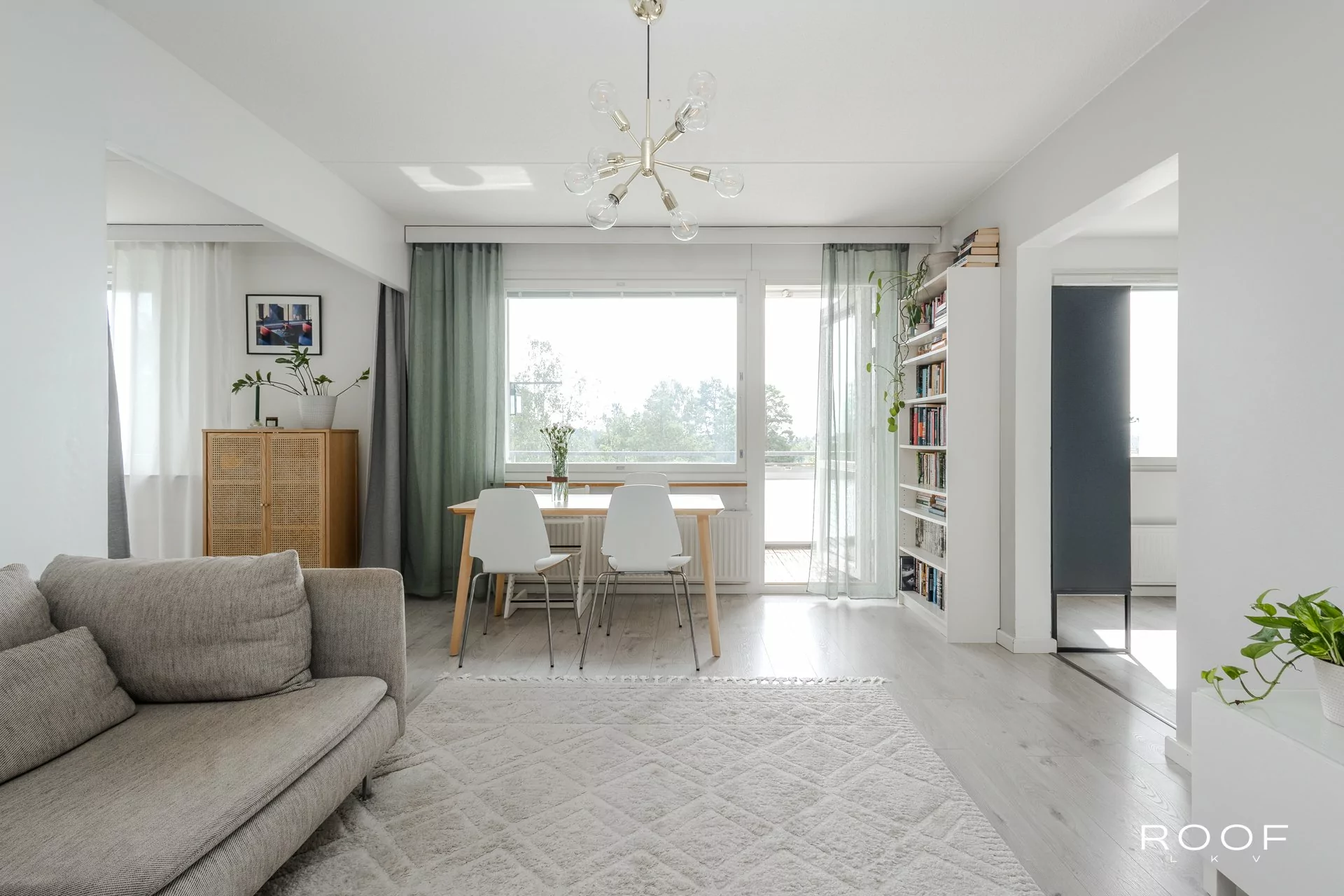 Tervetuloa viihtymään tähän kauniiseen ja hyvin pidettyyn kotiin, jossa valo tulvii sisään suurista ikkunoista. Ylimmän kerroksen rauha ja avaruus tekevät asunnosta erityisen miellyttävän. Pohjaratkaisu on järkevä ja toimiva – arki sujuu helposti. Tilavassa ja nykyaikaisessa keittiössä on runsaasti säilytys- ja työtilaa sekä tilaa ruokapöydälle. Olohuoneesta on suora kulku lasitetulle parvekkeelle, josta avautuu vehreä näkymä. Oma sauna ja kylpyhuone, johon mahtuu pesukone, erillinen wc sekä säilytystilat kruunaavat asumismukavuuden.