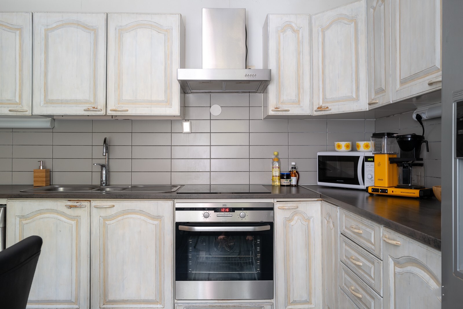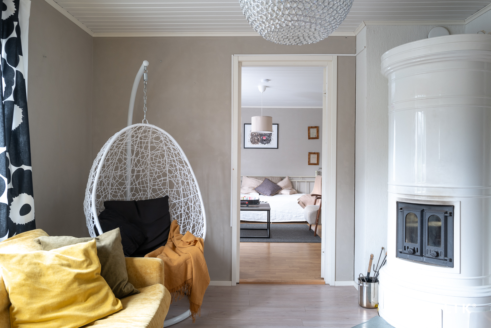 Olohuoneeseen lämpöä ja tunnelmaa tuo perinteinen pönttöuuni, joka täydentää talon sähkölämmitystä. Lisänä on vielä ilmalämpöpumppu.