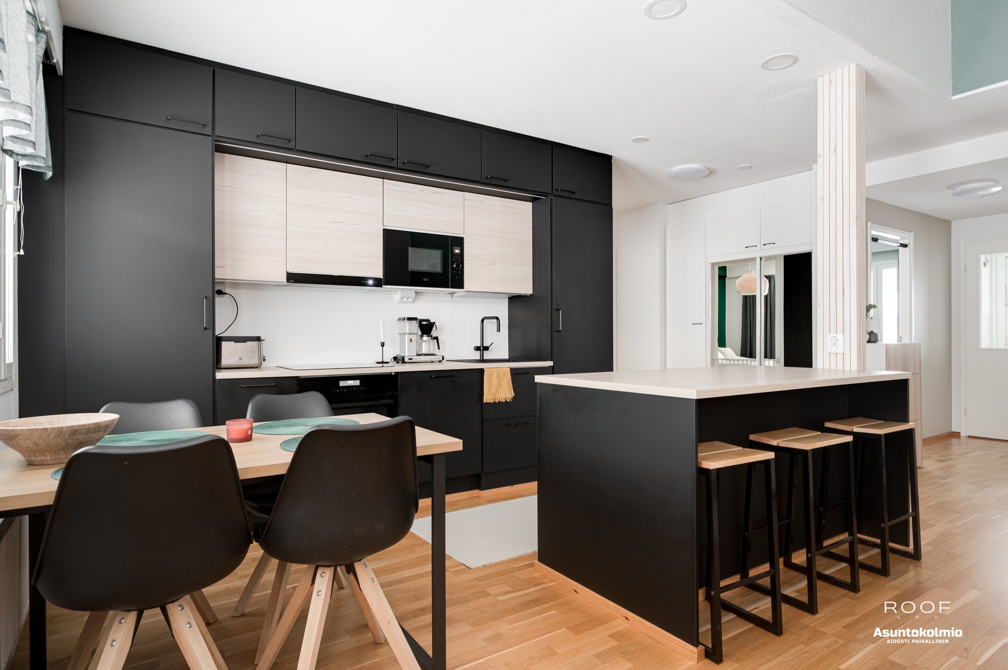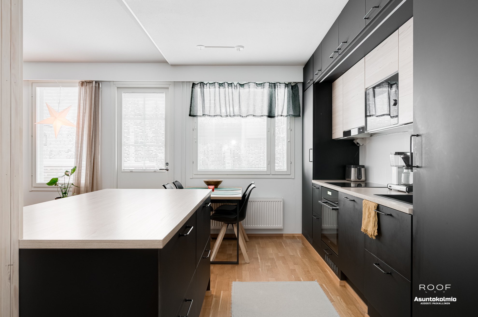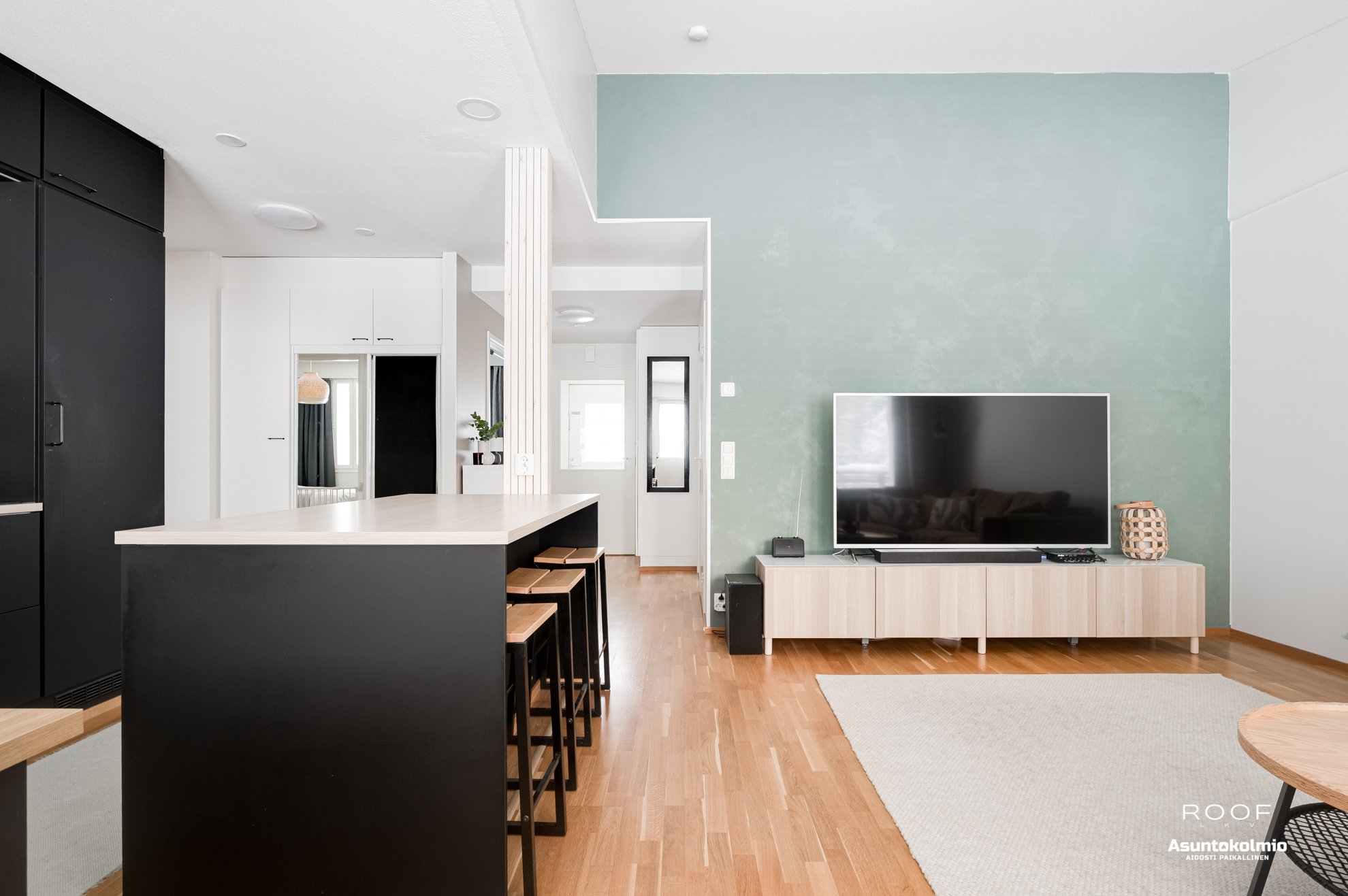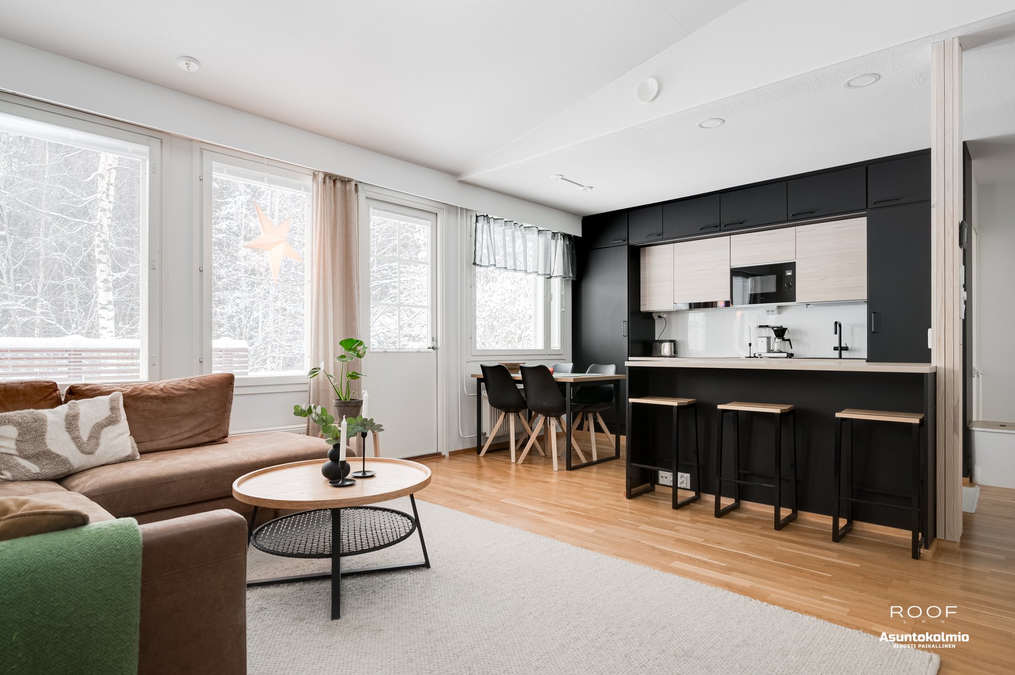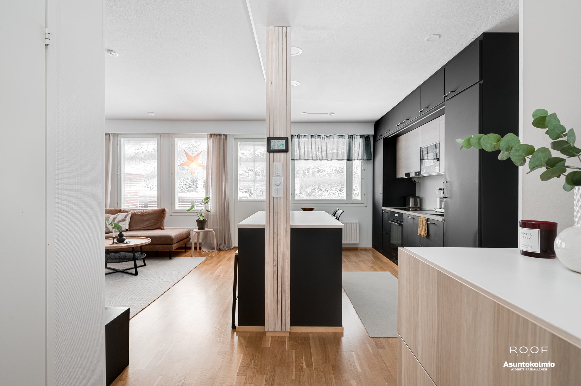 Tähän muuttovalmiiseen kotiin on helppo ihastua, sillä päivityksiä on tehty jo mukavasti; modernin musta keittiö on uusittu kaapistoineen ja koneineen vuonna 2021. Remontin yhteydessä on purettu olohuoneen ja keittiön välinen seinä, ja tilalle on ilmestynyt komeasti rimoitettu tolppa – kerrassaan tyylikäs...