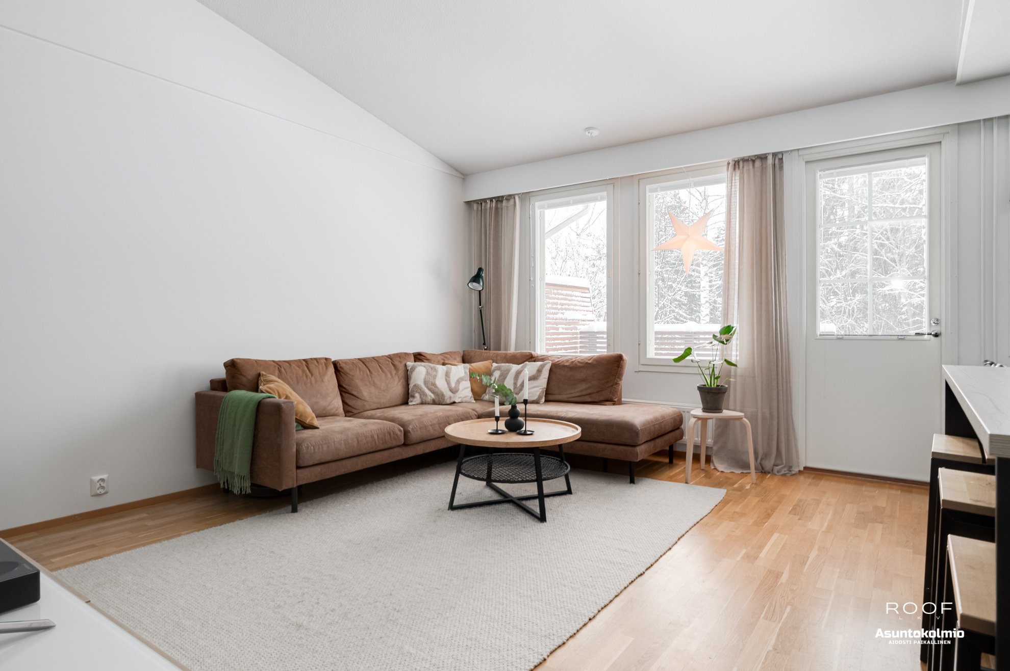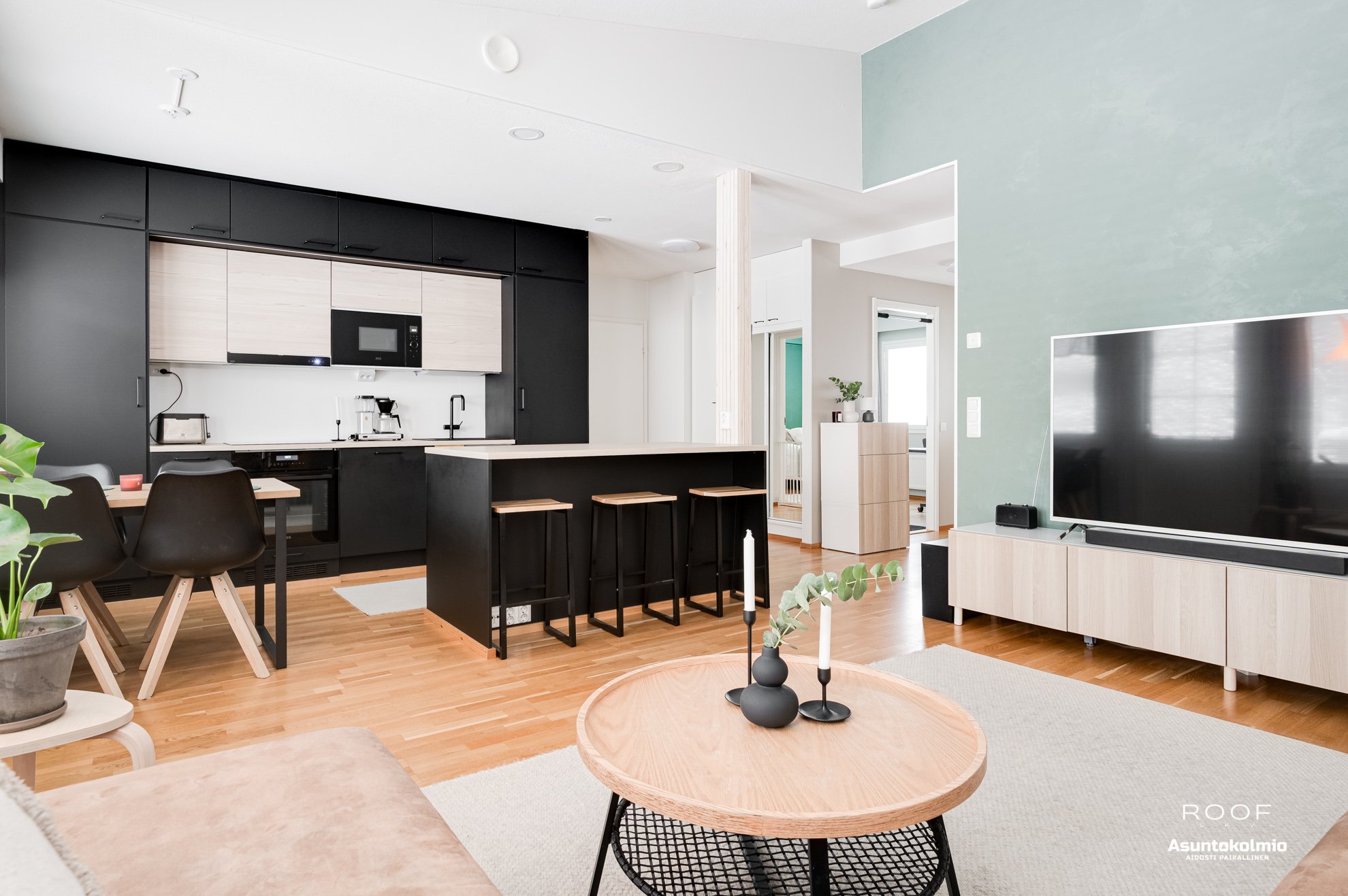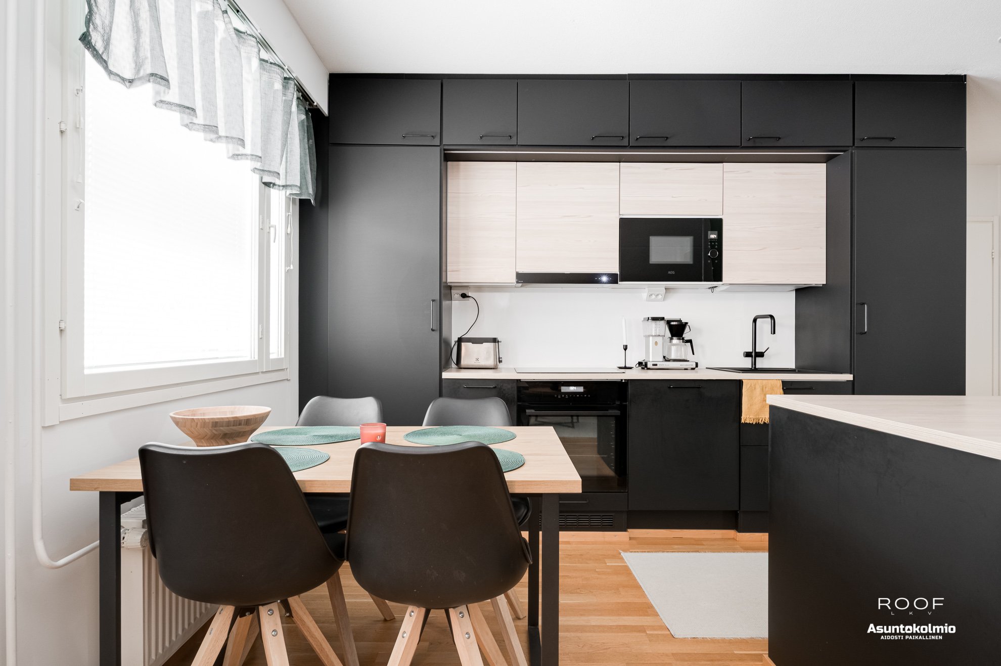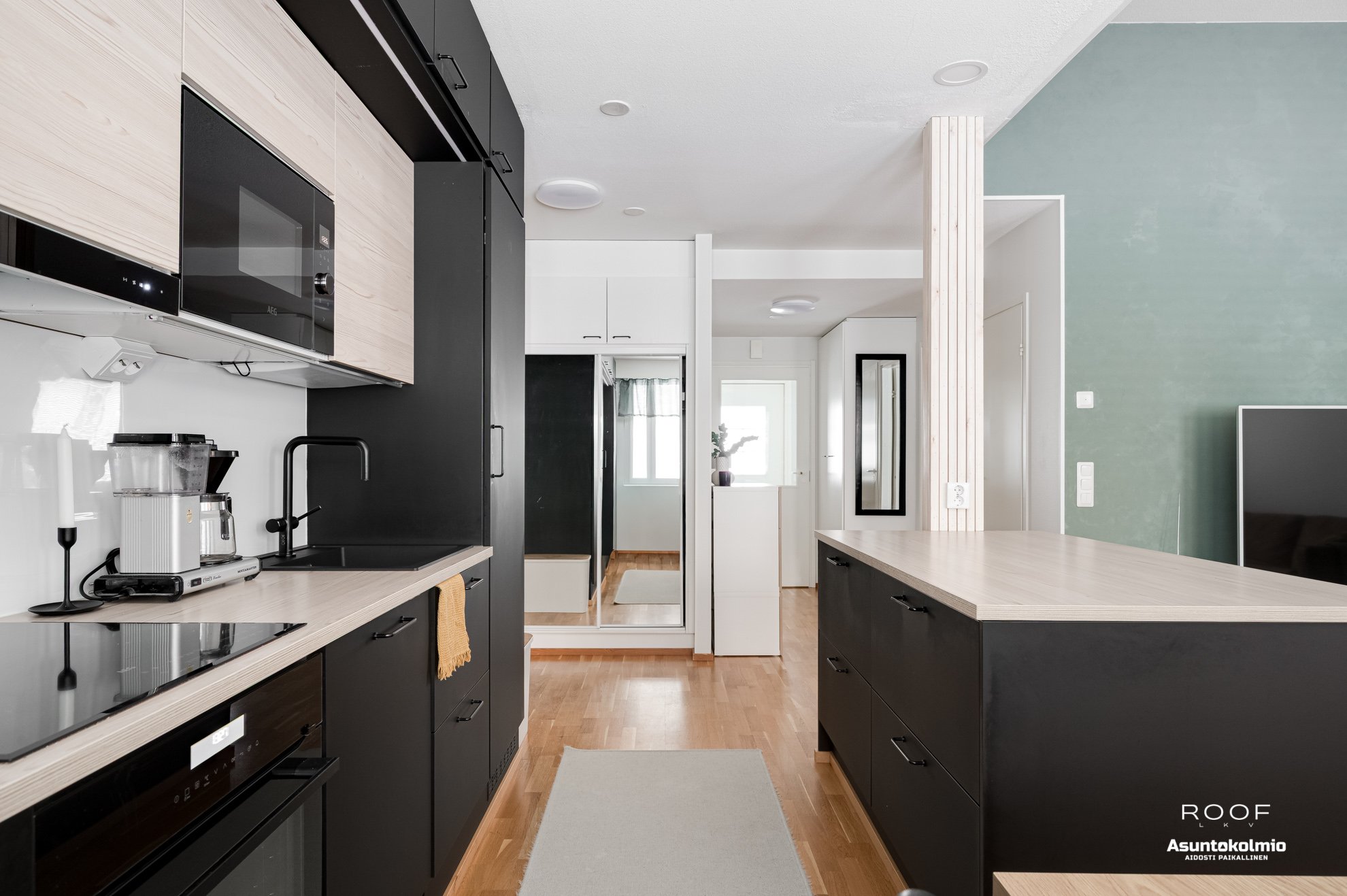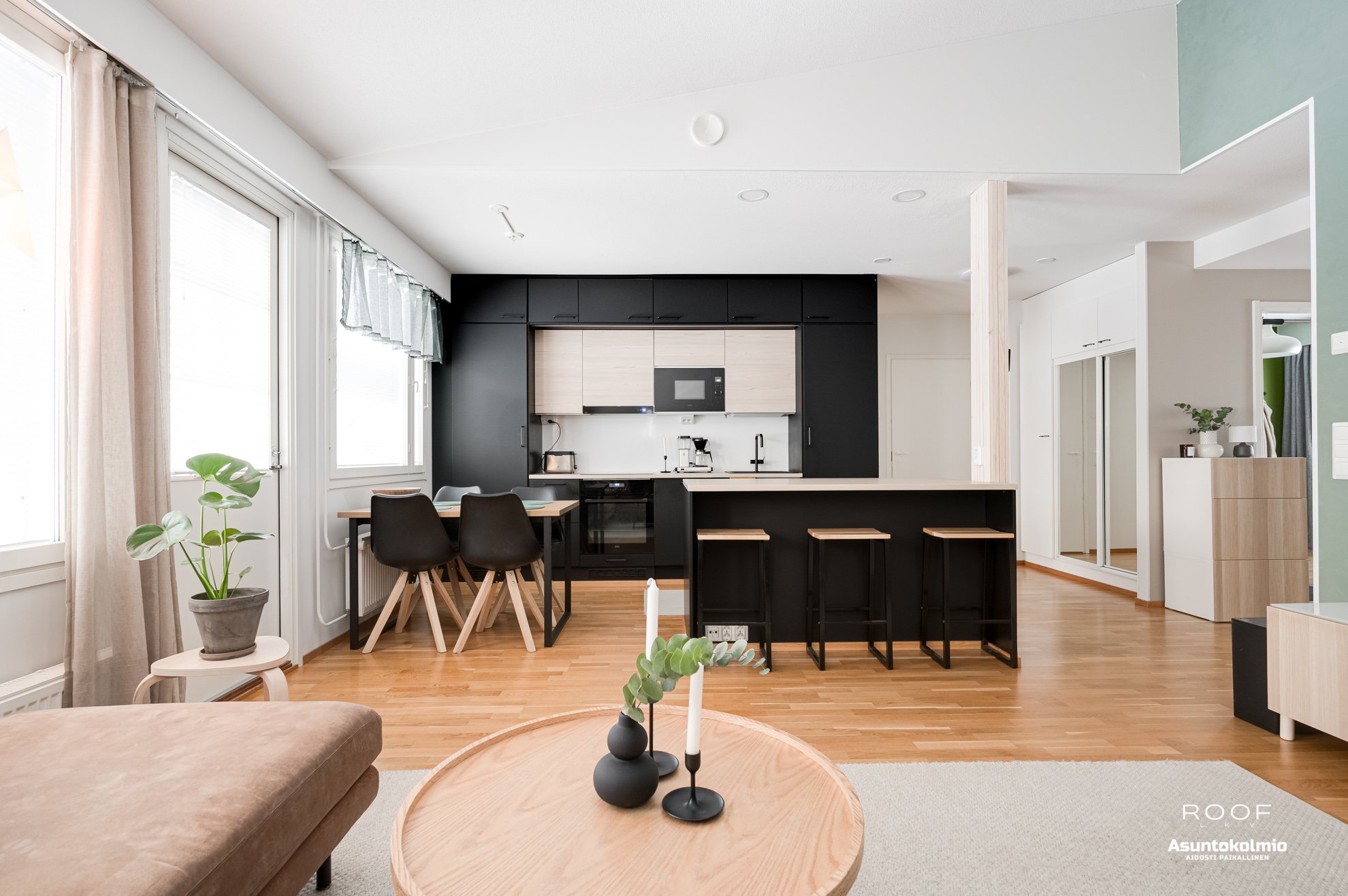 Tähän muuttovalmiiseen kotiin on helppo ihastua, sillä päivityksiä on tehty jo mukavasti; modernin musta keittiö on uusittu kaapistoineen ja koneineen vuonna 2021. Remontin yhteydessä on purettu olohuoneen ja keittiön välinen seinä, ja tilalle on ilmestynyt komeasti rimoitettu tolppa – kerrassaan tyylikäs...