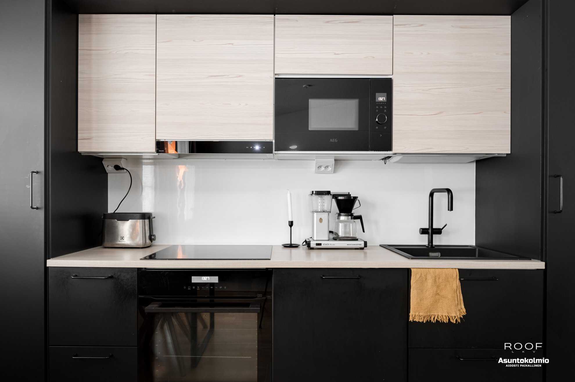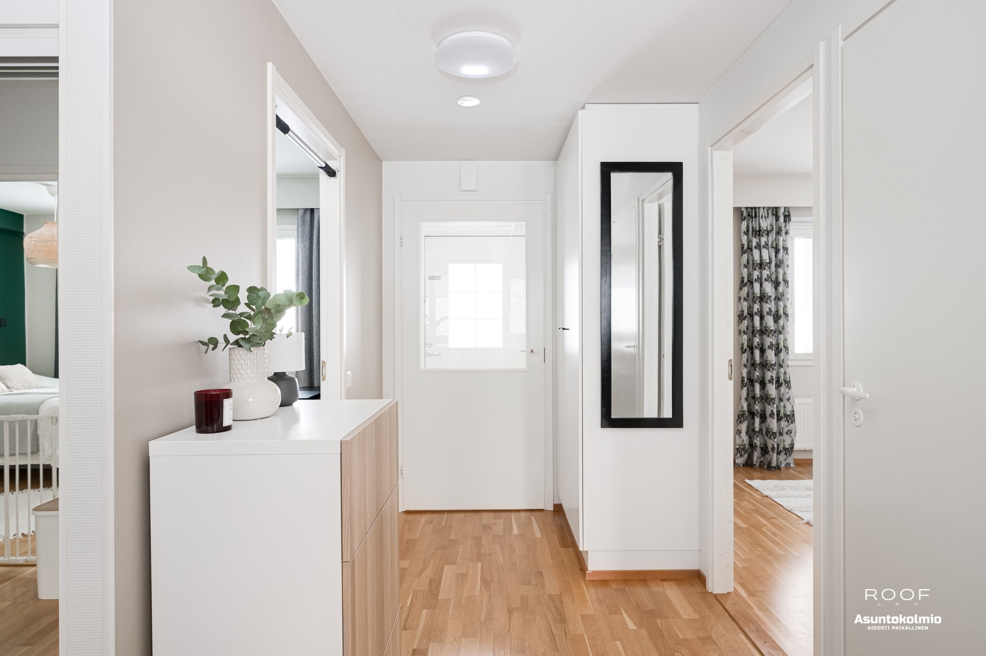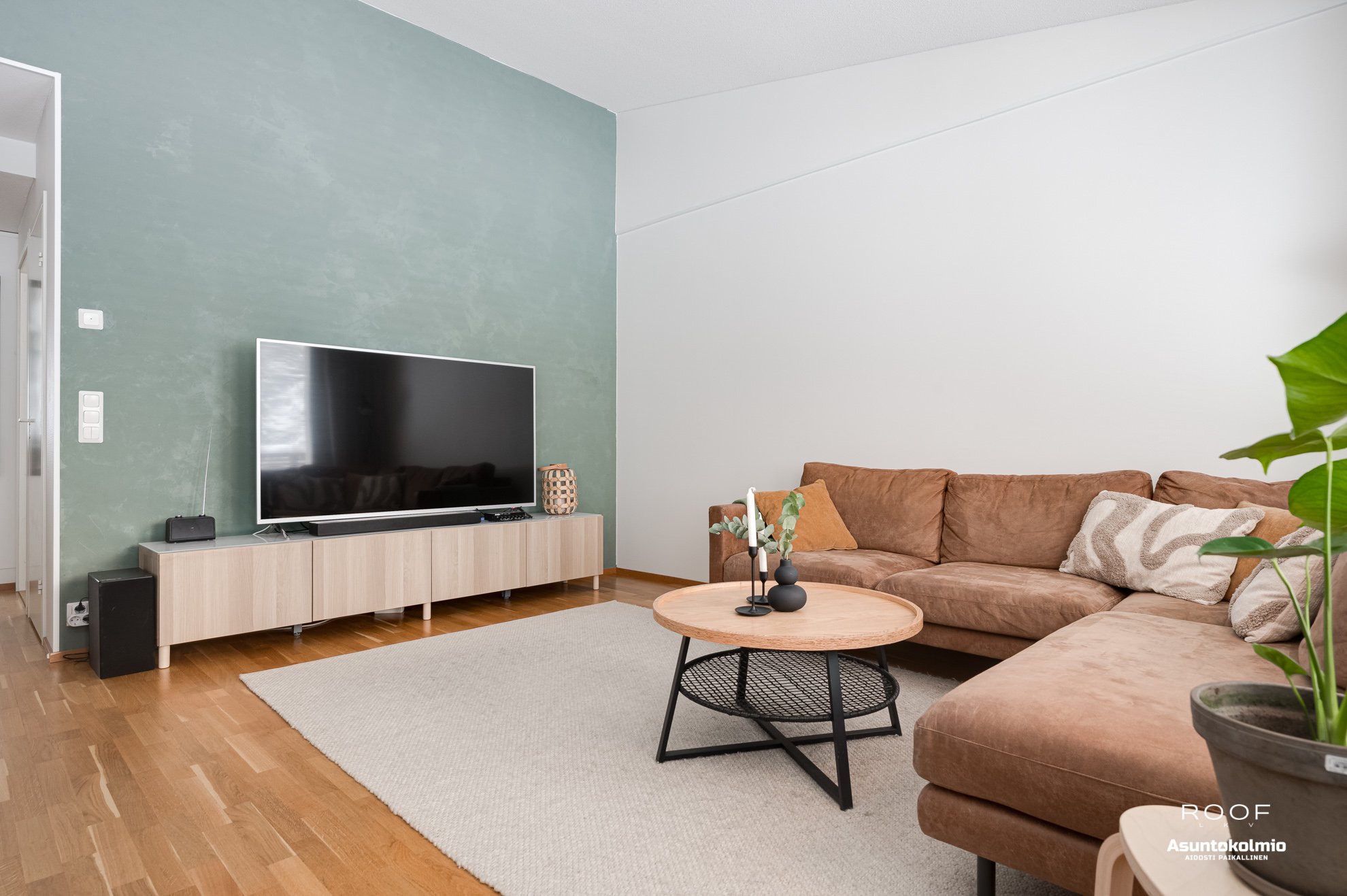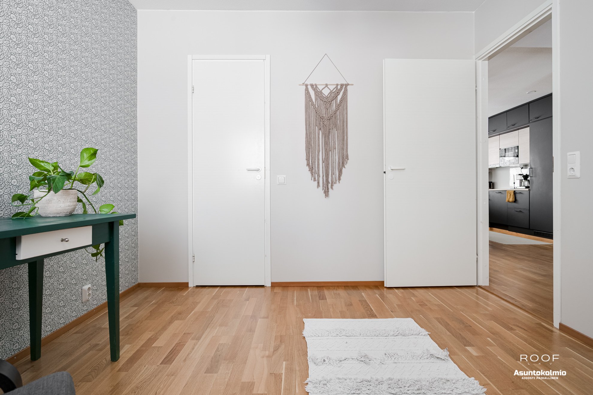 Tähän muuttovalmiiseen kotiin on helppo ihastua, sillä päivityksiä on tehty jo mukavasti; modernin musta keittiö on uusittu kaapistoineen ja koneineen vuonna 2021. Remontin yhteydessä on purettu olohuoneen ja keittiön välinen seinä, ja tilalle on ilmestynyt komeasti rimoitettu tolppa – kerrassaan tyylikäs...