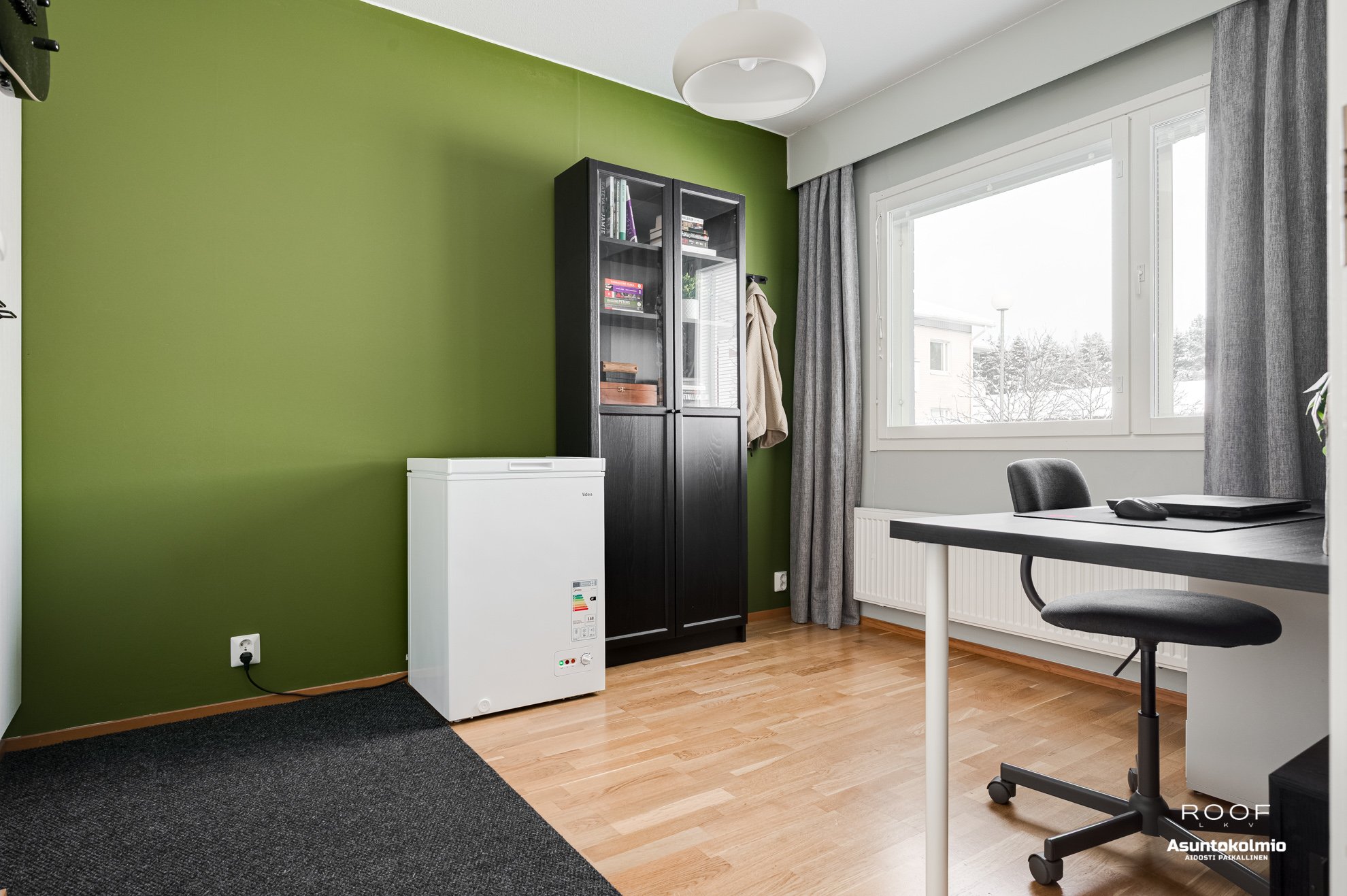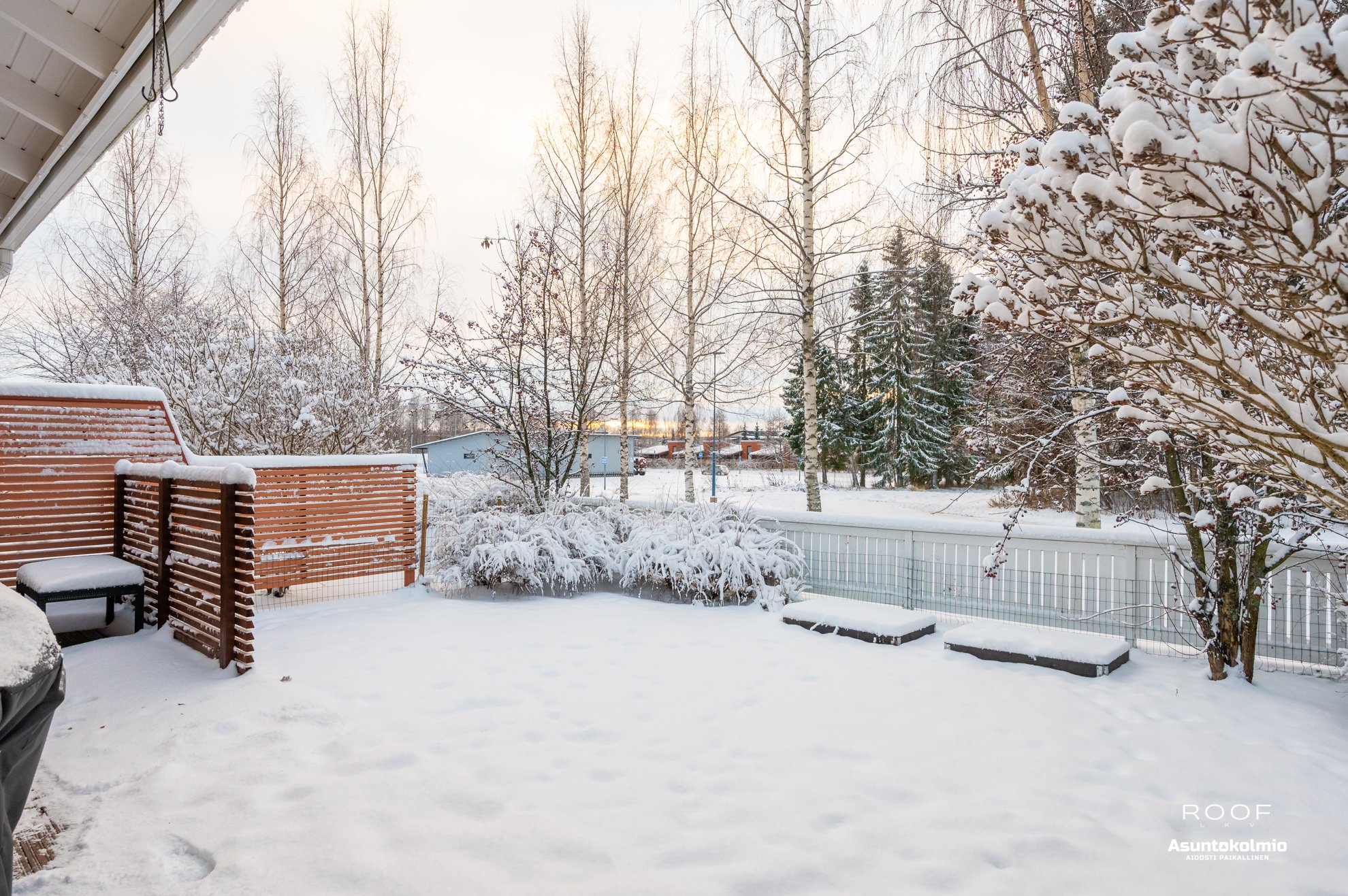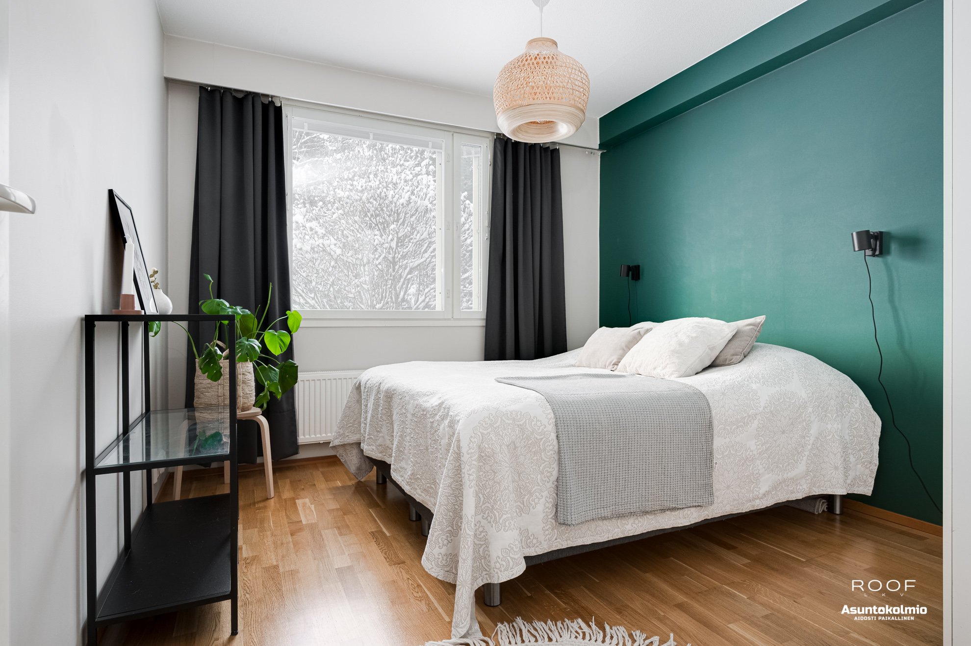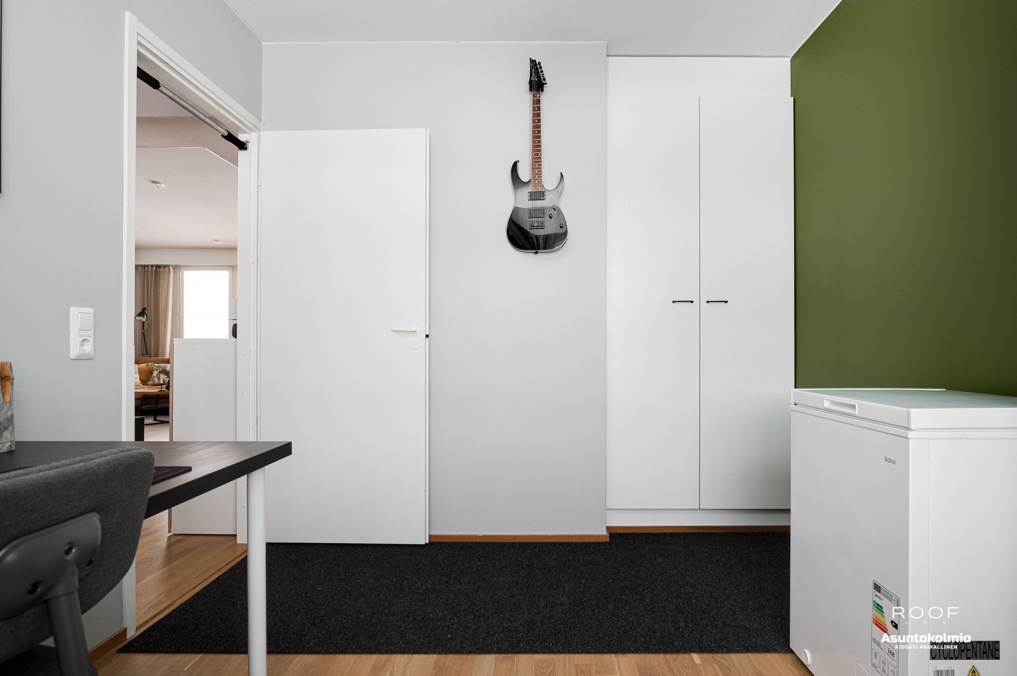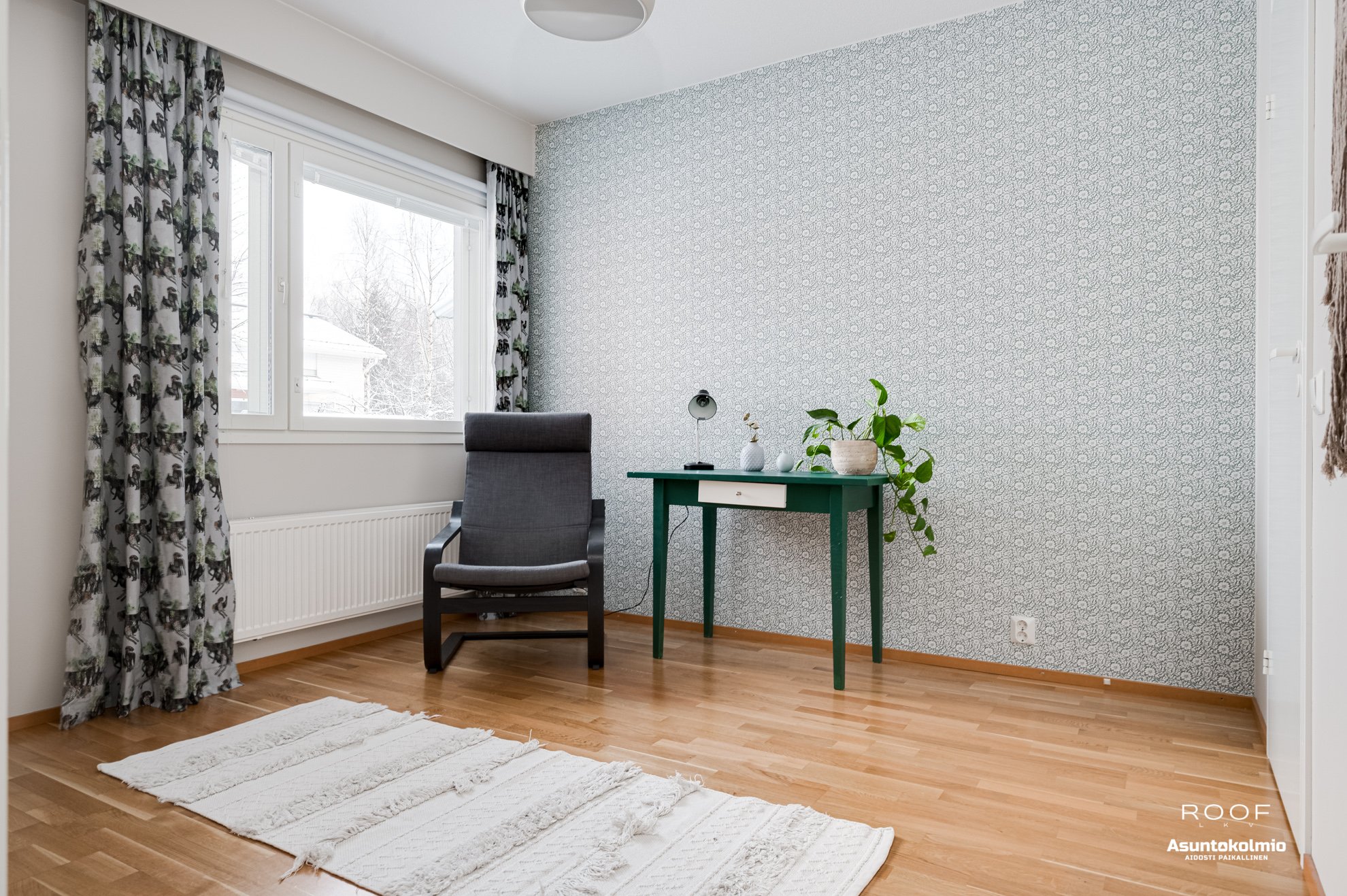Tähän muuttovalmiiseen kotiin on helppo ihastua, sillä päivityksiä on tehty jo mukavasti; modernin musta keittiö on uusittu kaapistoineen ja koneineen vuonna 2021. Remontin yhteydessä on purettu olohuoneen ja keittiön välinen seinä, ja tilalle on ilmestynyt komeasti rimoitettu tolppa – kerrassaan tyylikäs...