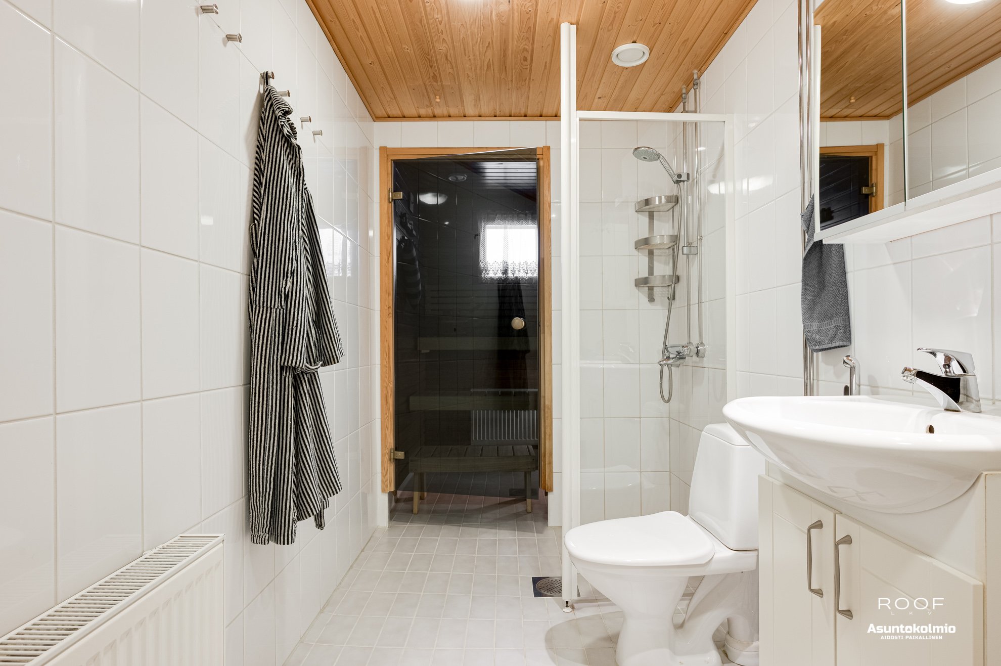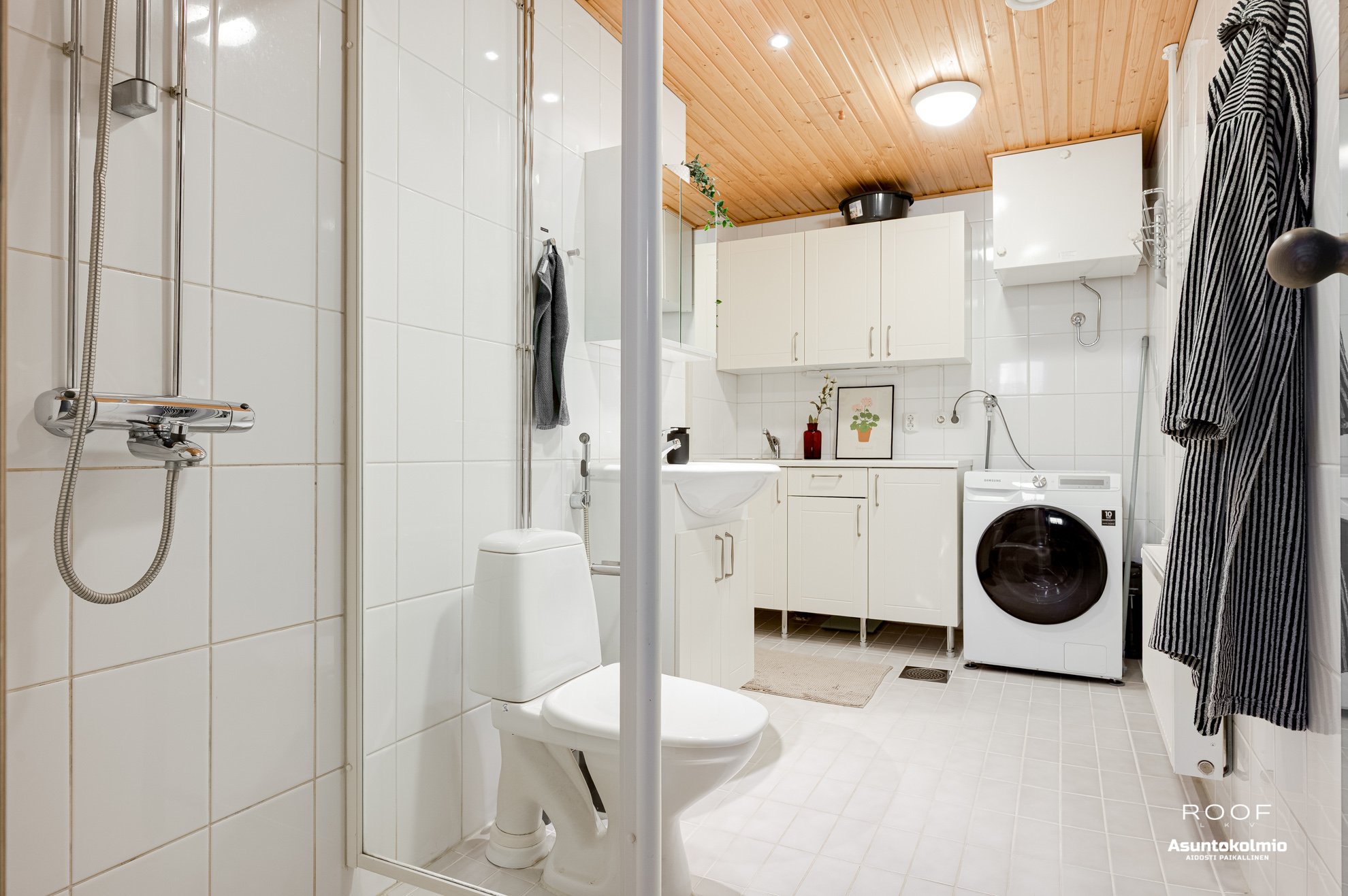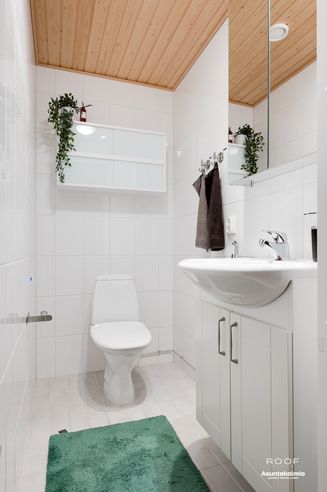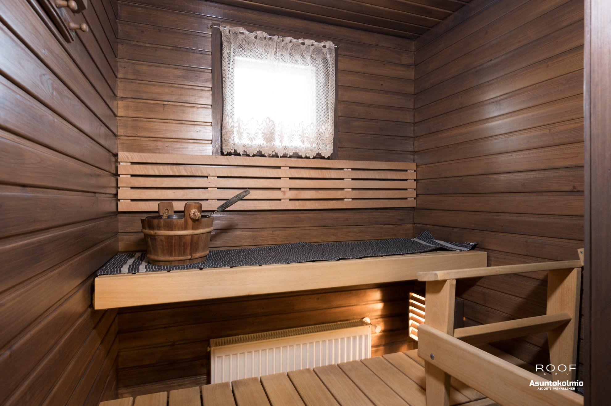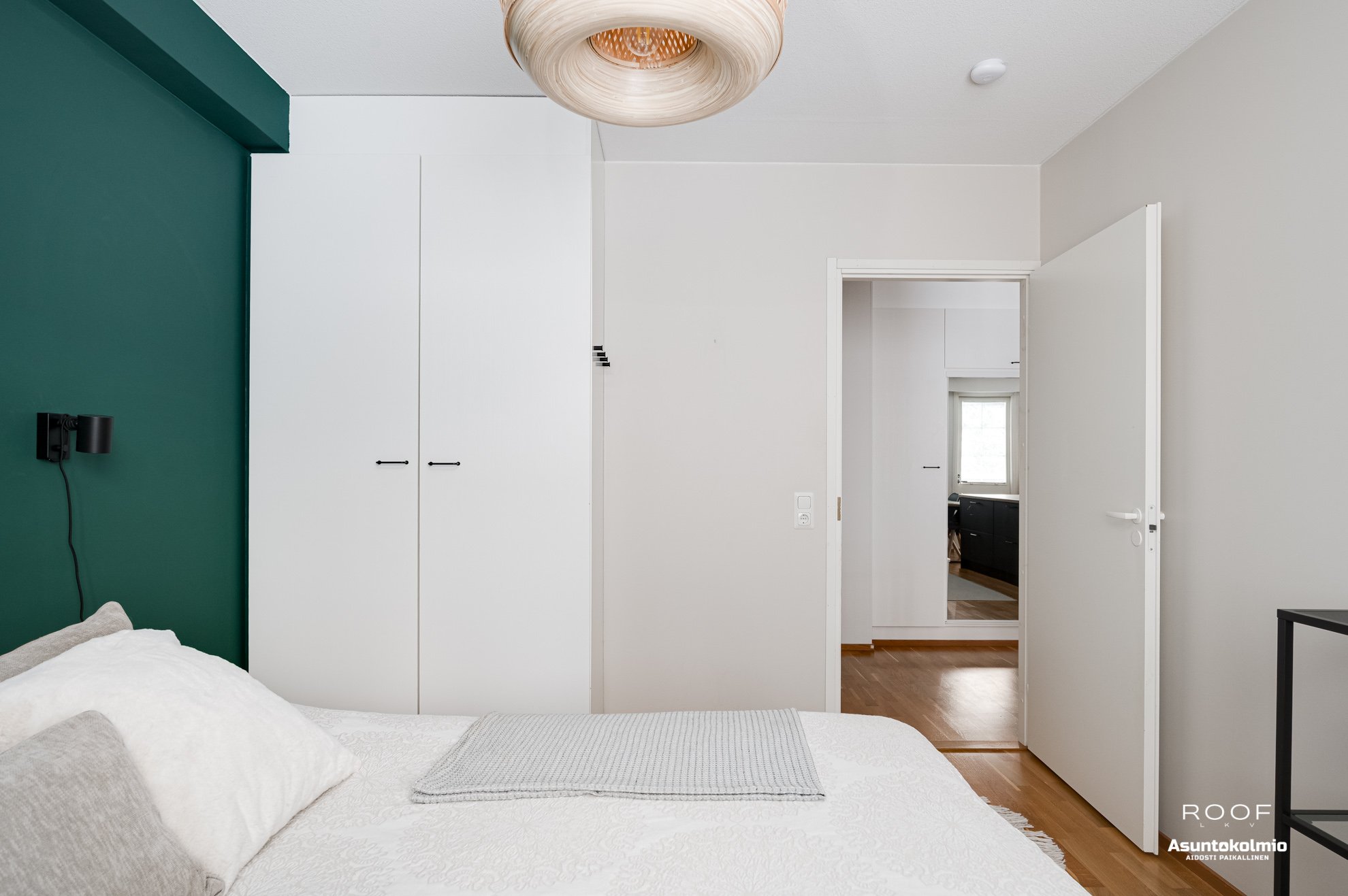 Tähän muuttovalmiiseen kotiin on helppo ihastua, sillä päivityksiä on tehty jo mukavasti; modernin musta keittiö on uusittu kaapistoineen ja koneineen vuonna 2021. Remontin yhteydessä on purettu olohuoneen ja keittiön välinen seinä, ja tilalle on ilmestynyt komeasti rimoitettu tolppa – kerrassaan tyylikäs...