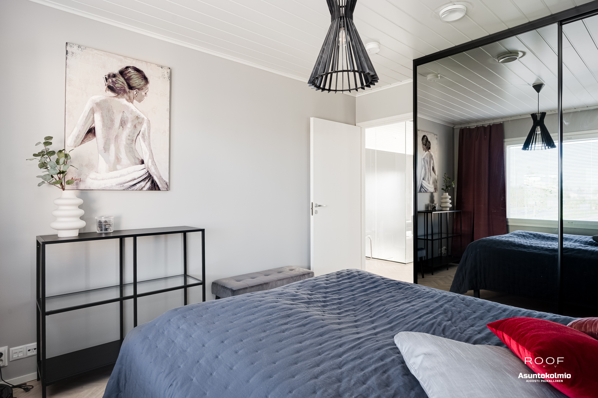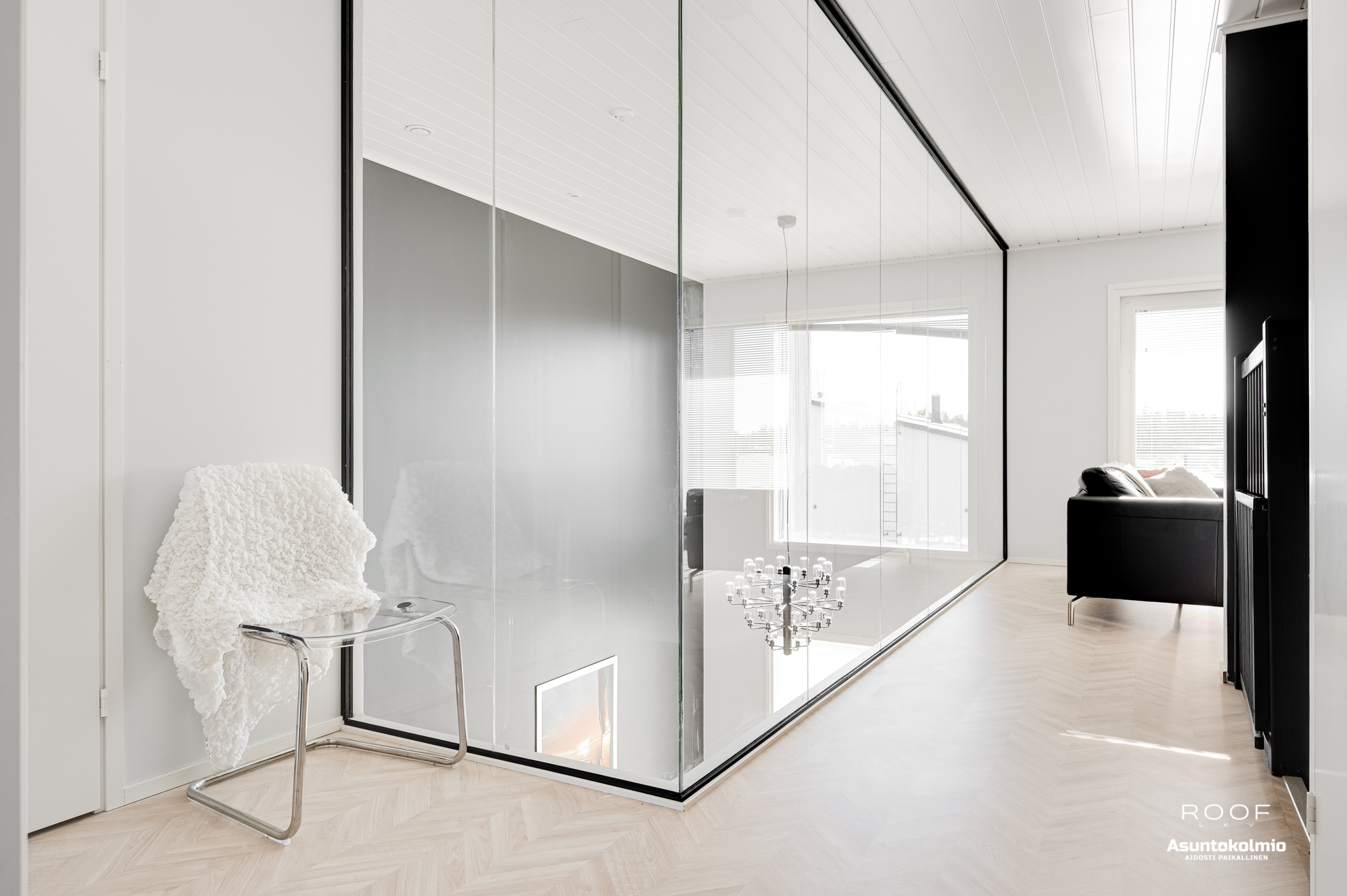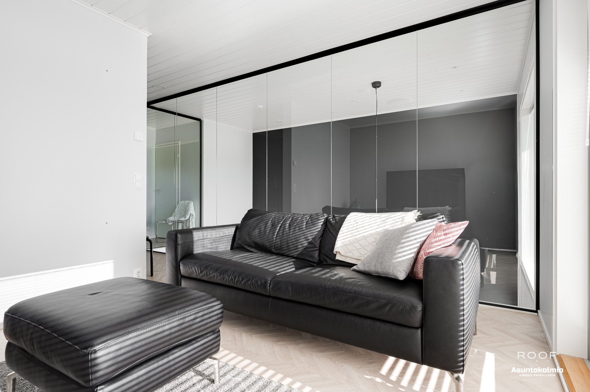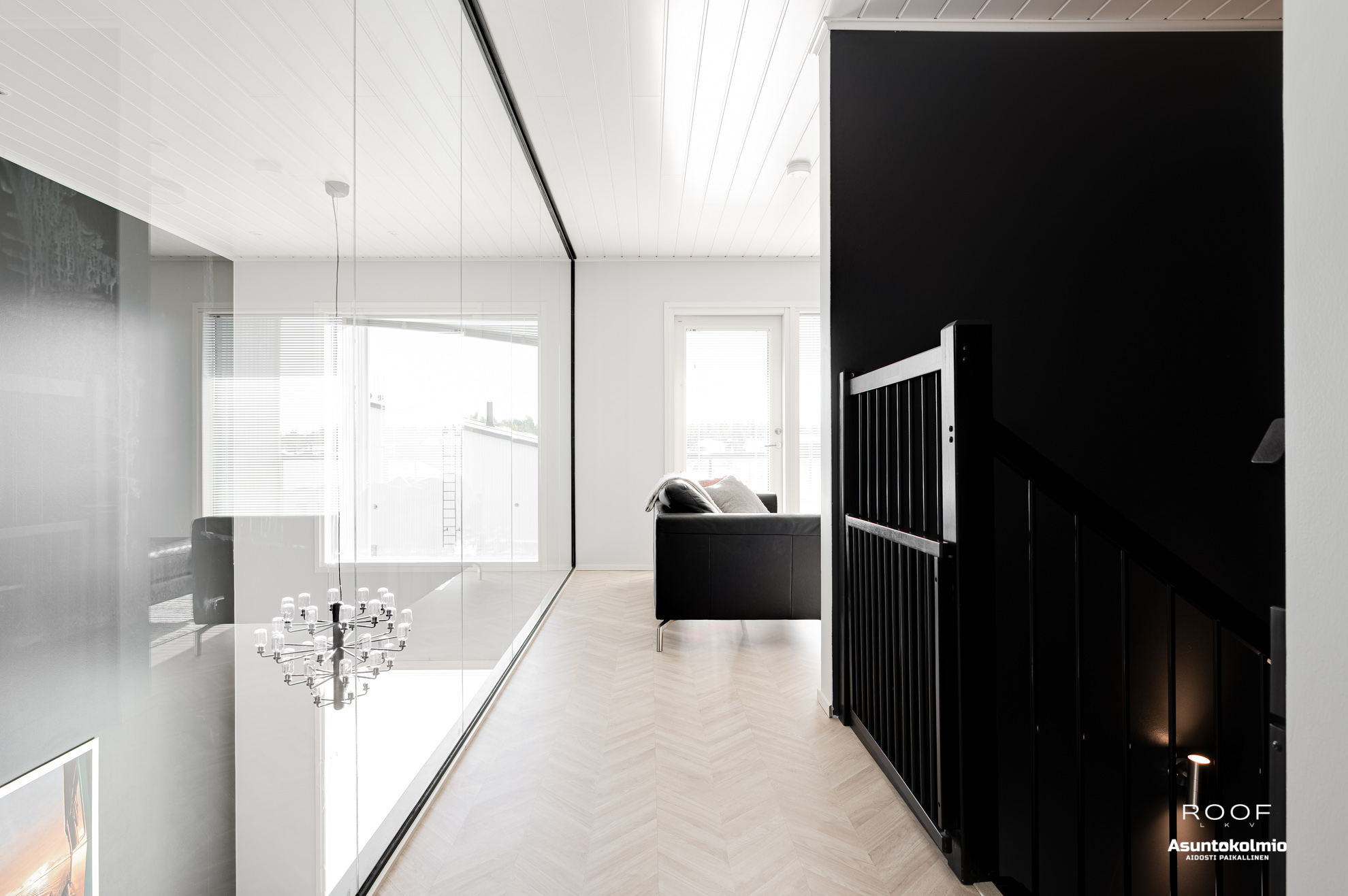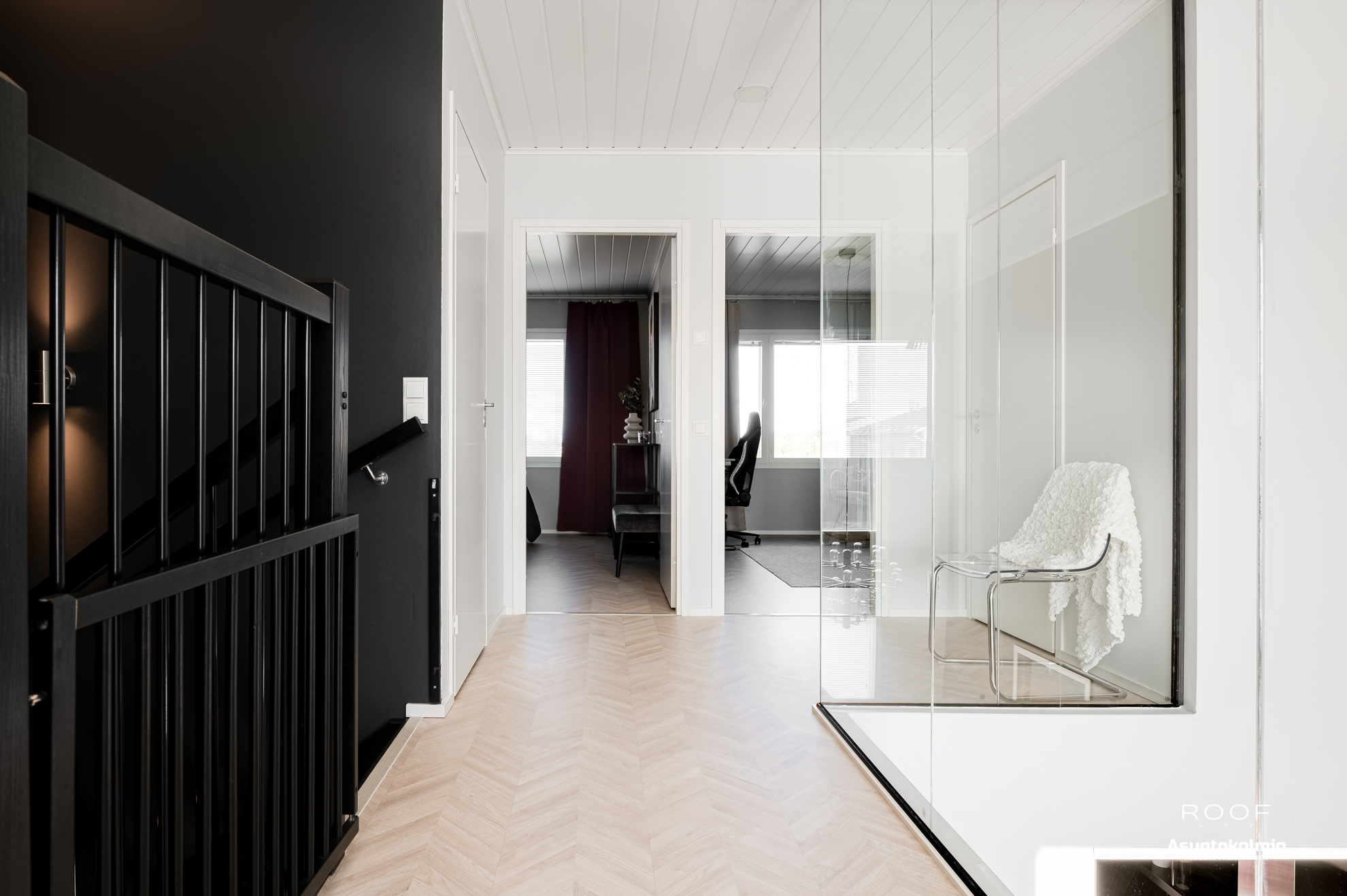 Kaikki kolme yli 11m2 makuuhuonetta sijaitsee yläkerrassa, joista yksi on tällä hetkellä oleskelutilana. Tila on näppärä muuttaa takaisin varsinaiseksi makuuhuoneeksi, mikäli tarvetta. Yläaulaa kiertää kattoon saakka ylettyvä upea lasiseinä, joten kerrosten välinen akustiikka toimii mainiosti, ja yläaulan päästä löytyy käytännöllinen vaatehuone.