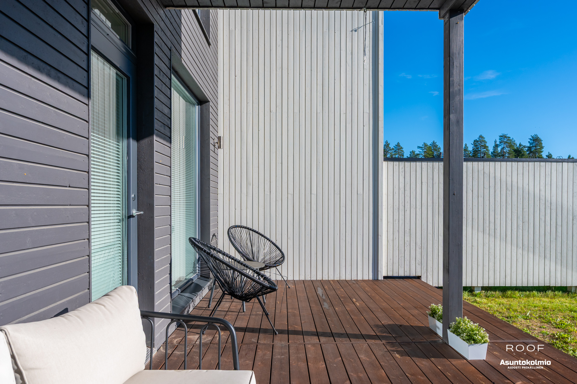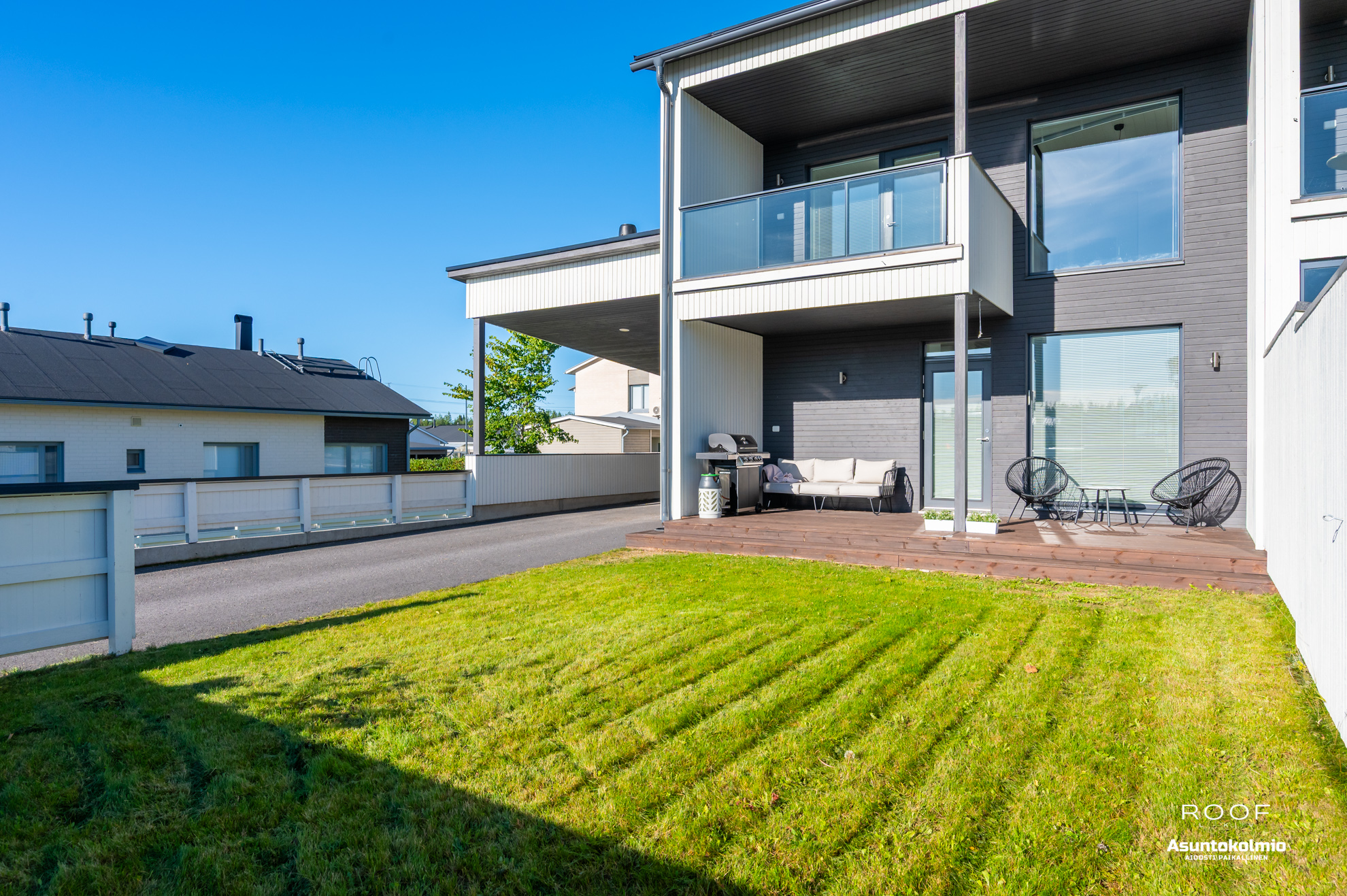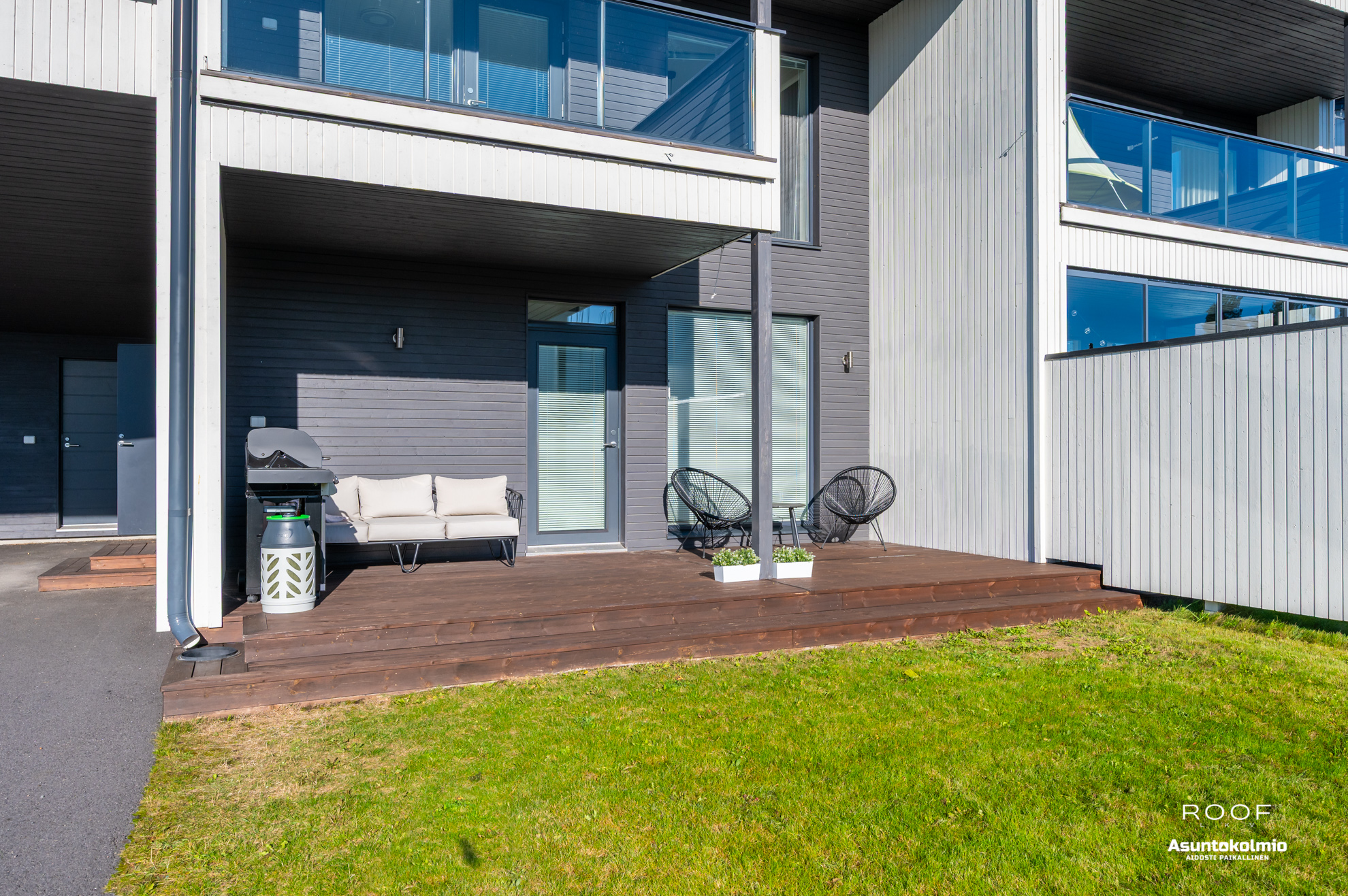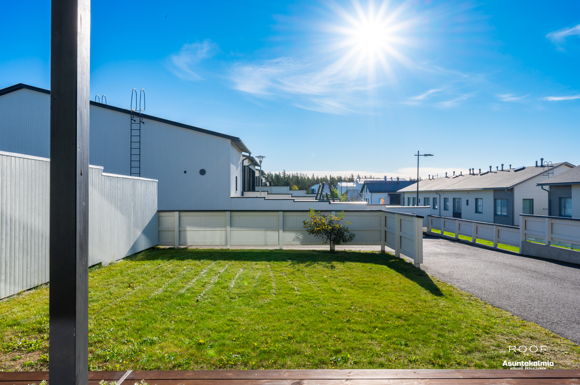 Huoneiston aurinkoinen piha on selkeästi aidattu, ja ennen kaikkea mukavan kokoinen. Osittain katettu terassi on mahdollista halutessaan myös lasittaa, joten terassilta löytyy tilaa nauttia kesäpäivistä. Lämmitysmuotona on kaukolämpö vesikiertoisella lattialämmityksellä, ilmanvaihto hoituu koneellisesti ja mikäli tarvetta, olohuoneesta löytyy varaus myös tulisijalle. Huoneiston edustalta löytyy autokatos, ja pihalle sopii tarvittaessa useampikin auto. Autokatoksessa sijaitsee lämmin lähes 8m2 varasto ja väestönsuojassa on lisää huoneistolle varattua säilytystilaa.