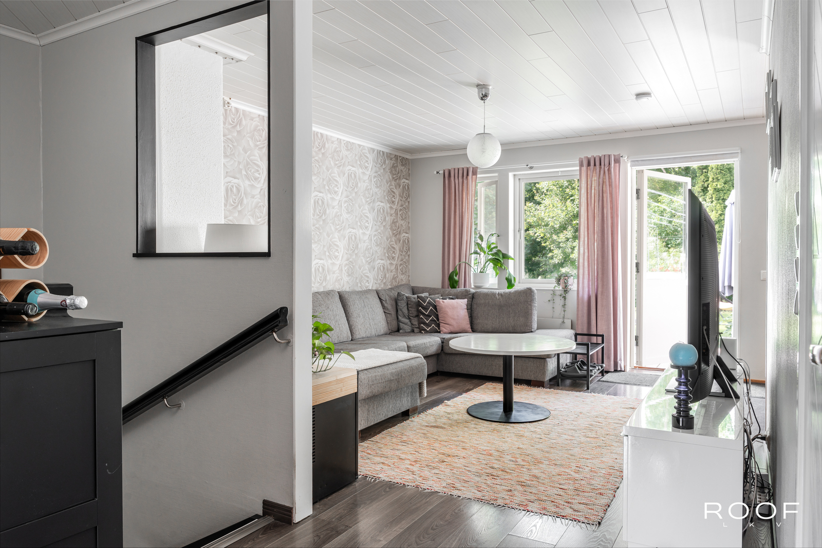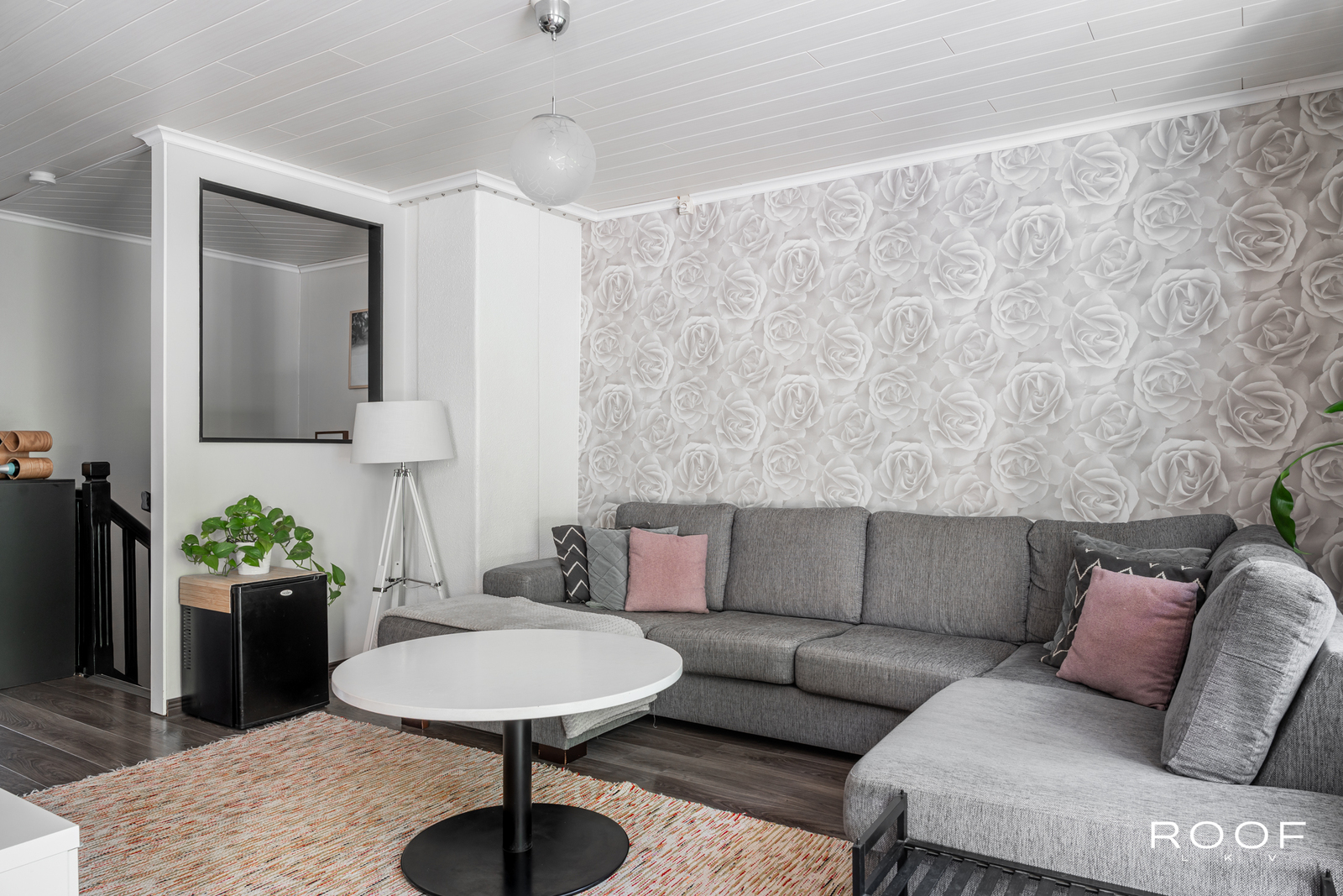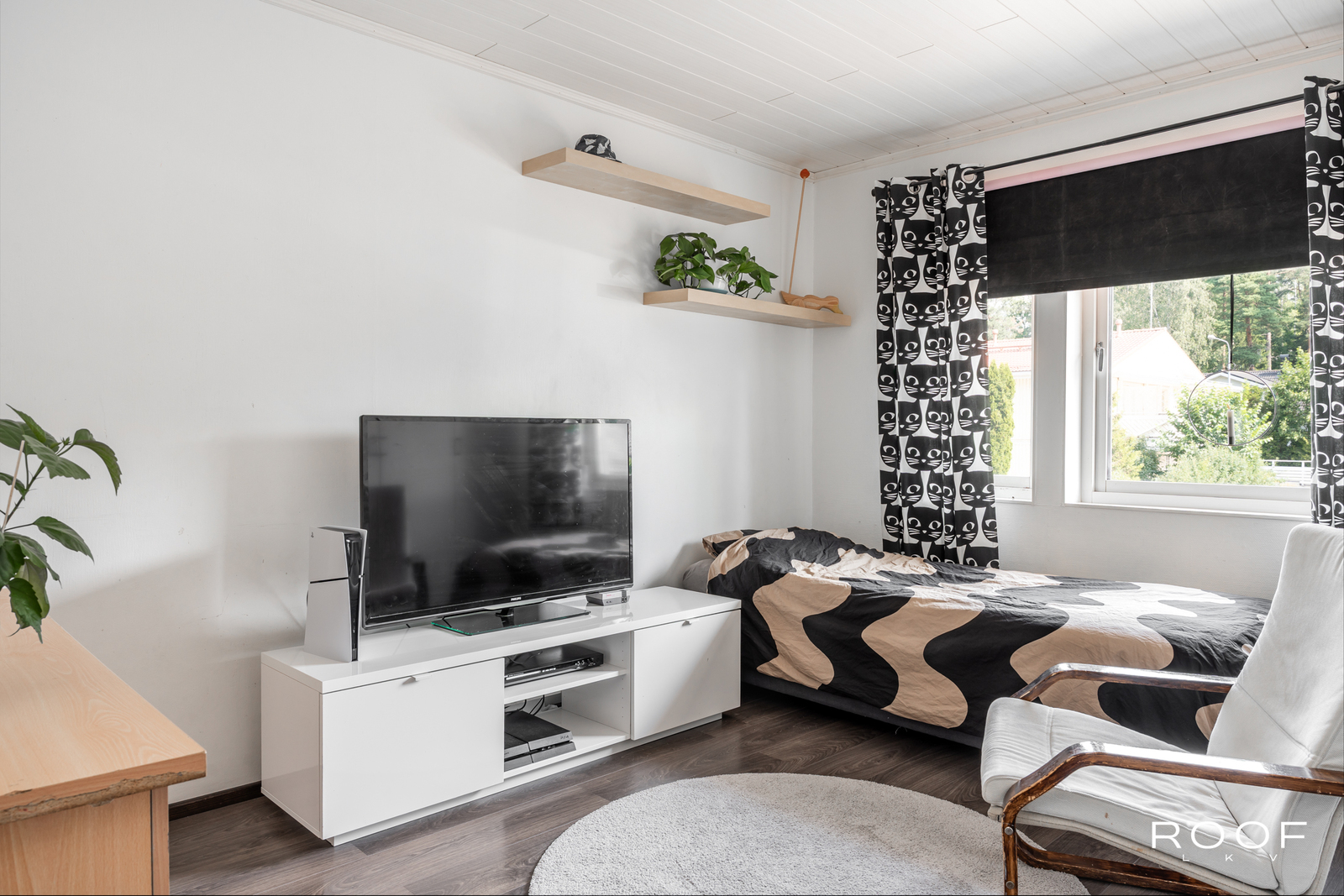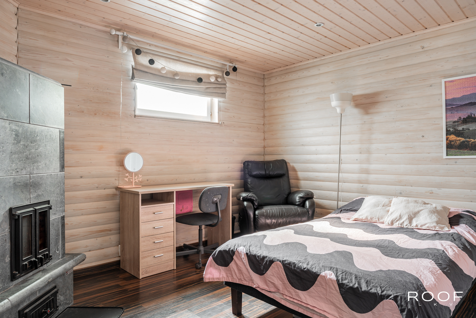 Alakerrassa on iso takkahuone, joka tarjoaa monia käyttömahdollisuuksia esimerkiksi työ-, harrastus- tai vierashuoneena. Alakerrassa sijaitsevat myös kodinhoitohuone, sauna, pesuhuone, erillinen varasto sekä tilava eteinen. Käynti sisään tapahtuu katetun kuistin kautta, ja autopaikka löytyy aivan sisäänkäynnin edestä.
