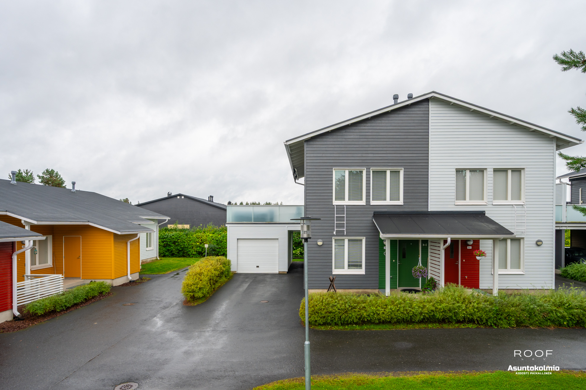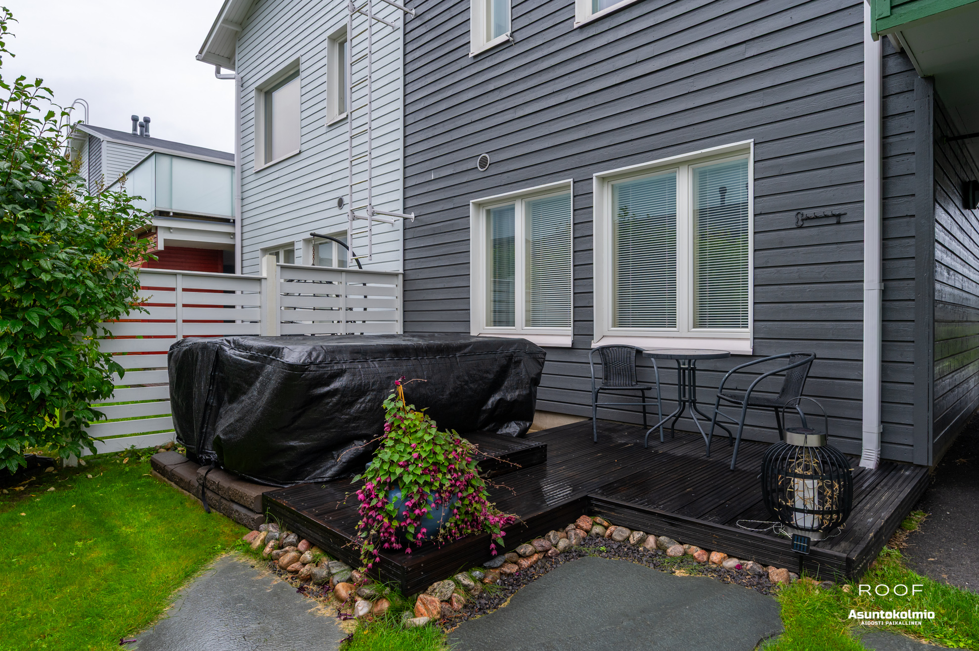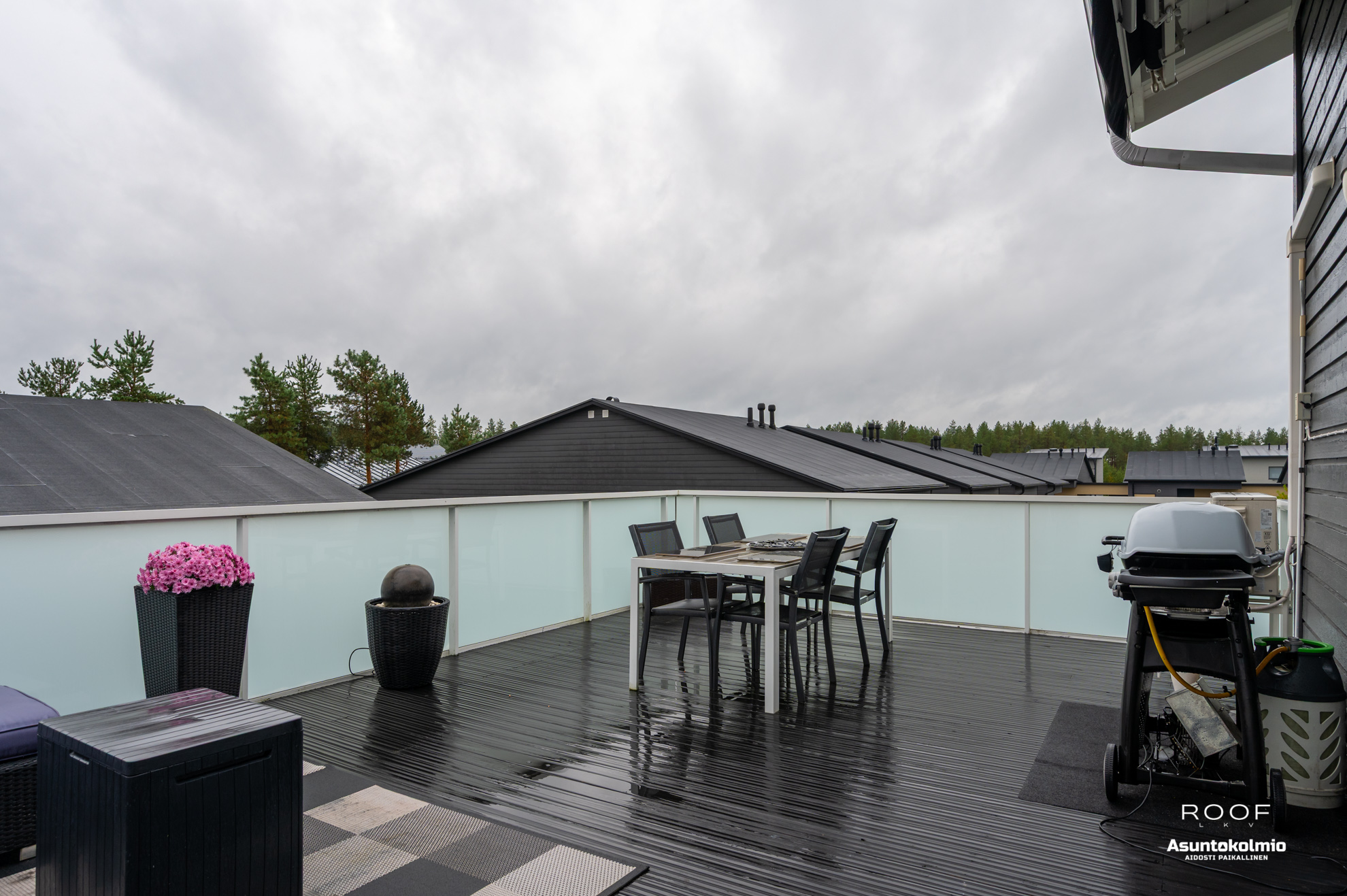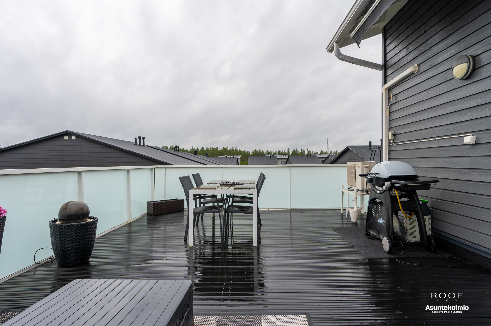 Tervetuloa As Oy Oulun Birdieen, tähän upeaan 105 m² paritalokotiin, joka sijaitsee yhtiön parhaalla paikalla! Tämä upea koti pitää sisällään poikkeuksellisen suuren kattoterassin sekä talotyypille erittäin harvinaisen eristetyn autotallin sähköisellä nosto-ovella. Lisäksi erittäin suojaiselta takapihalta löytyy toinen terassi porealtaineen, jonne on kätevä kulkea suoraan saunasta kodinhoitohuoneen ulko-oven kautta. Sekä kattoterassi että takapiha ovat aurinkoiseen etelä-lounaaseen suuntautuvia, joten voit nauttia auringosta käytännössä koko päivän, eikä niihin ole suoraa näköyhteyttä käytännössä mistään.