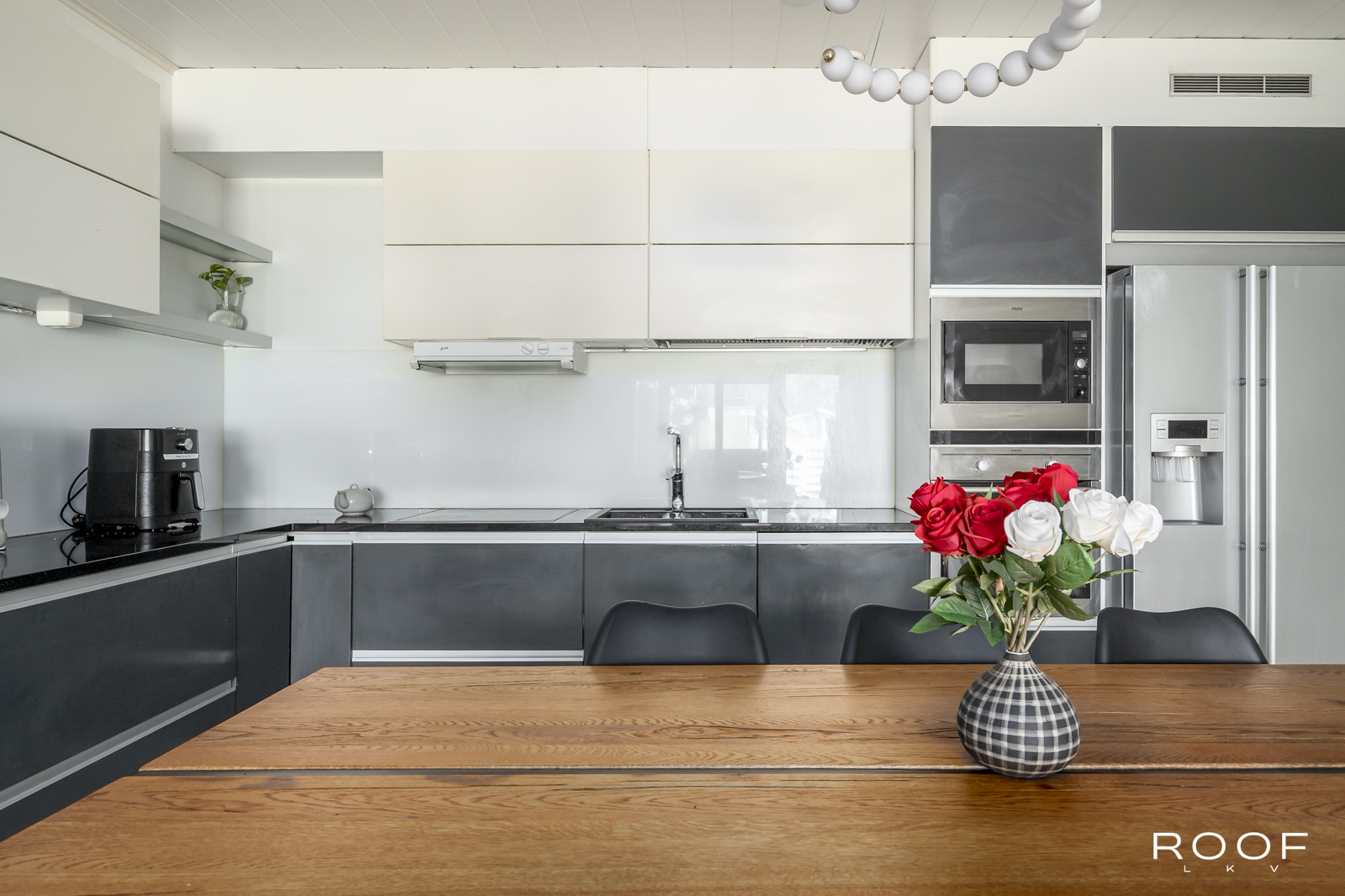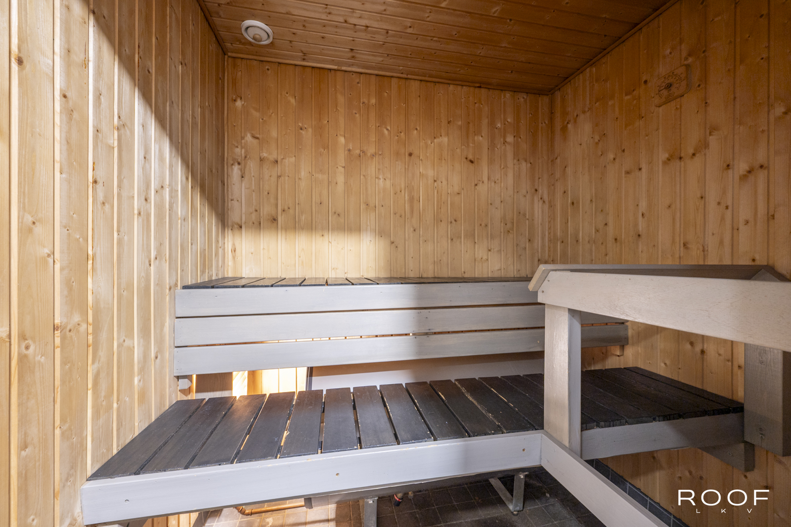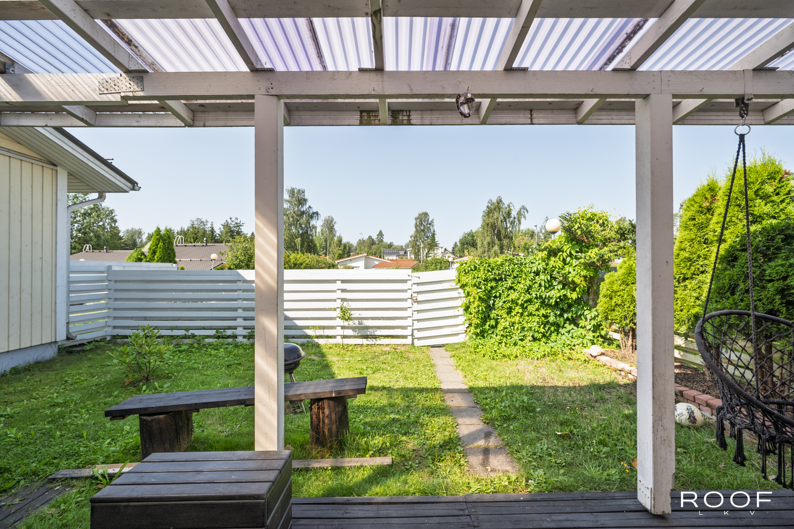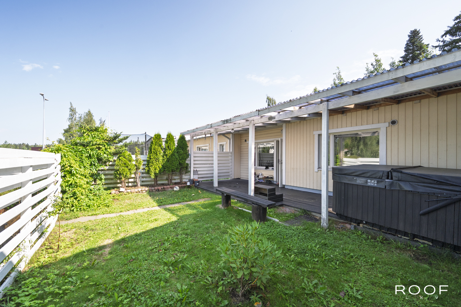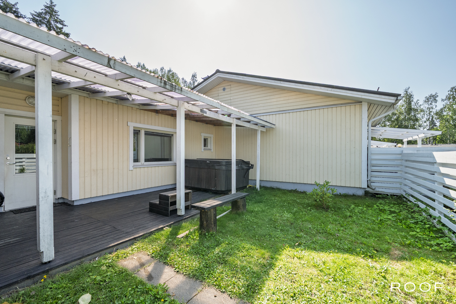 Länteen avautuva terassi tarjoaa kauniit näkymät ilta-auringon suuntaan ja tämän lisäksi takapihalla käytössäsi on oma poreallas arkiviikon jälkeiseen rentoutumiseen.