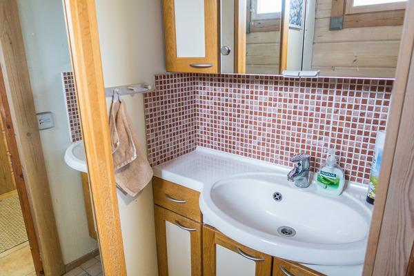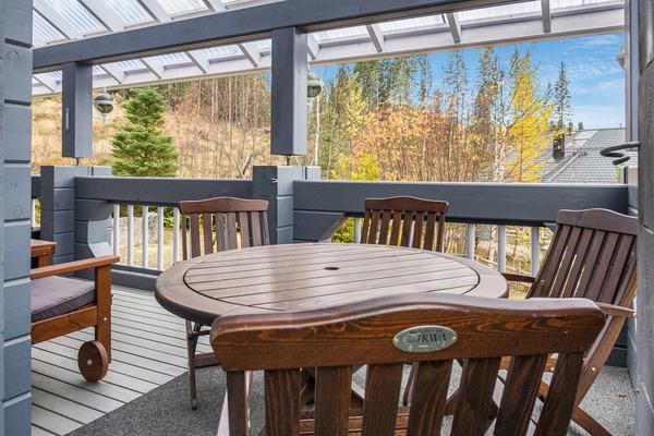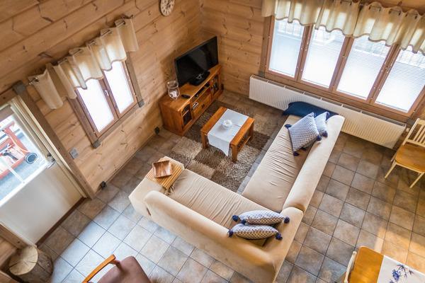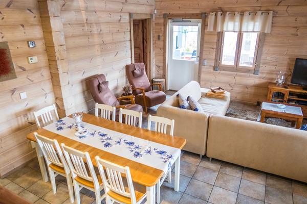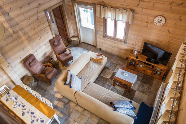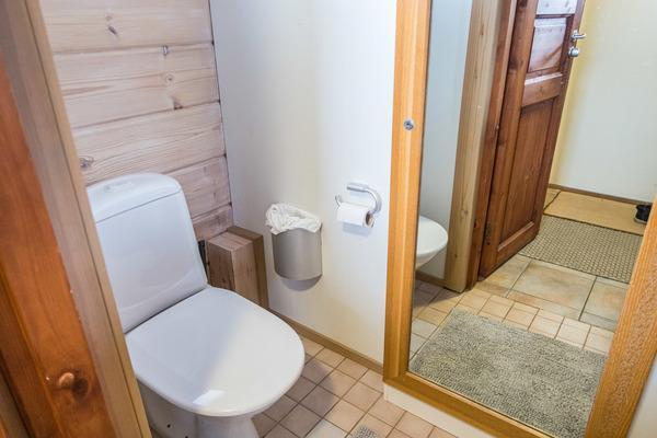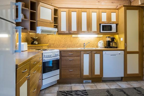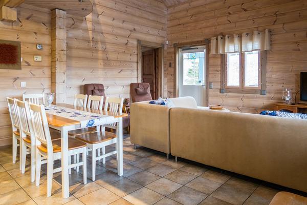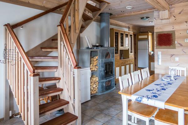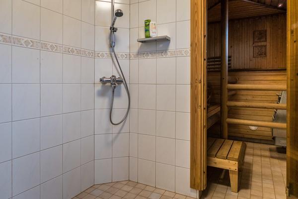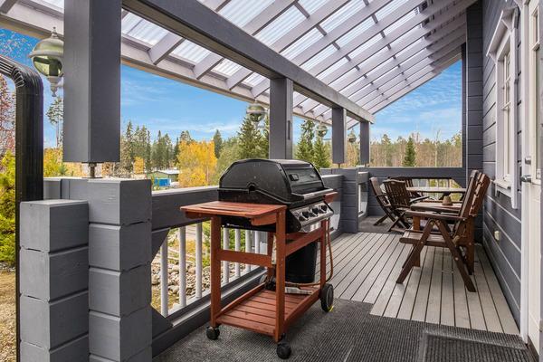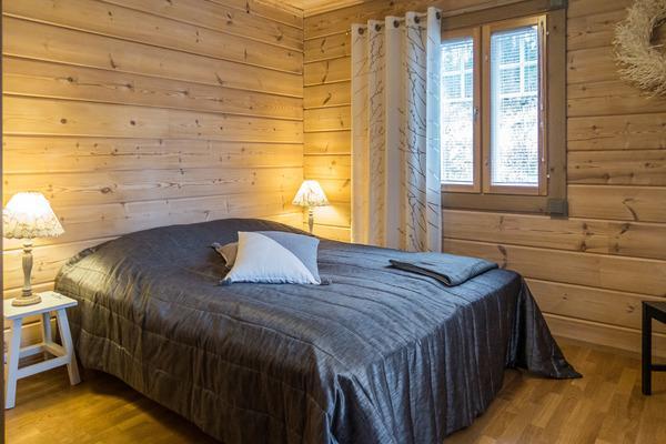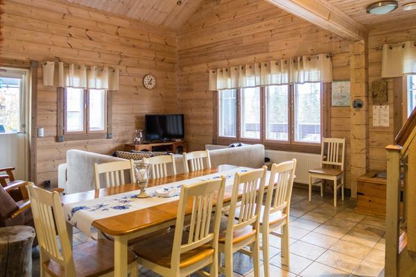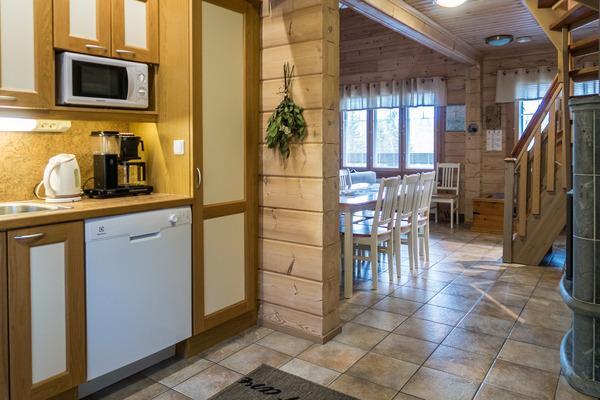 Tämä kahteen kerrokseen rakennettu huvila omalla tontilla tarjoaa käytännöllistä ja viihtyisää tilankäyttöä niin omaan lomailuun kuin vuokrauskäyttöön. Alakerrassa sijaitsee avoin ja valoisa tupakeittiö, jossa on hyvin tilaa ruokailuryhmälle ja oleskeluun. Olohuoneesta on käynti katetulle terassille, josta avautuu suora näkymä lastenrinteeseen. Keittiö on käytännöllisesti sijoitettu osaksi yhteistä tilaa. Alakerrasta löytyvät myös makuuhuone, kodinhoitohuone, pesuhuone, sauna ja erillinen wc.