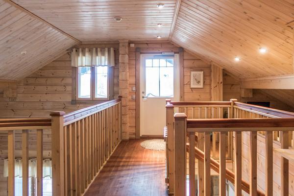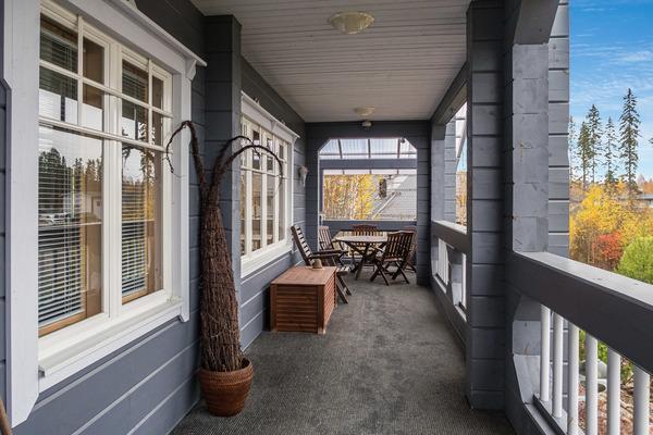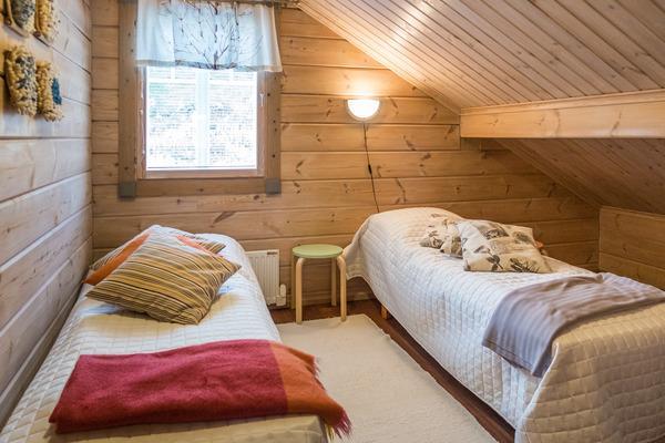 Yläkerrassa on kaksi tilavaa makuuhuonetta, molemmissa omat vaatekaapit. Aulan yhteydessä on lisäsäilytystilaa sekä kulku suurelle, osittain katetulle parvekkeelle. Olohuoneessa avaruutta tuo porrastilan kohdalle avautuva korotettu katto.