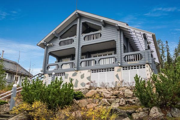 Rinteessä sijaitseva kahden kerroksen Mammuttihirren hirsihuvila kellarilla Vuokatissa.