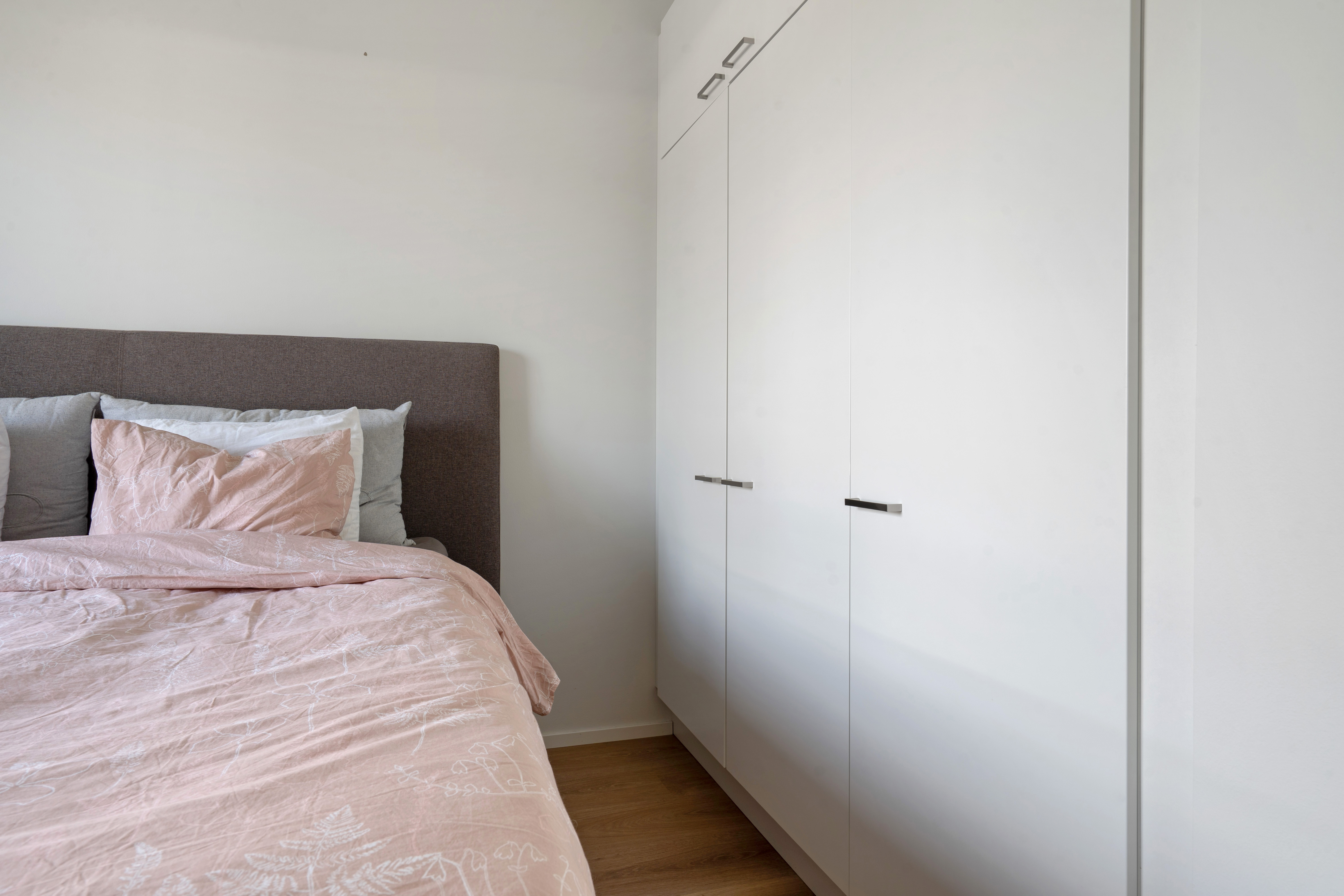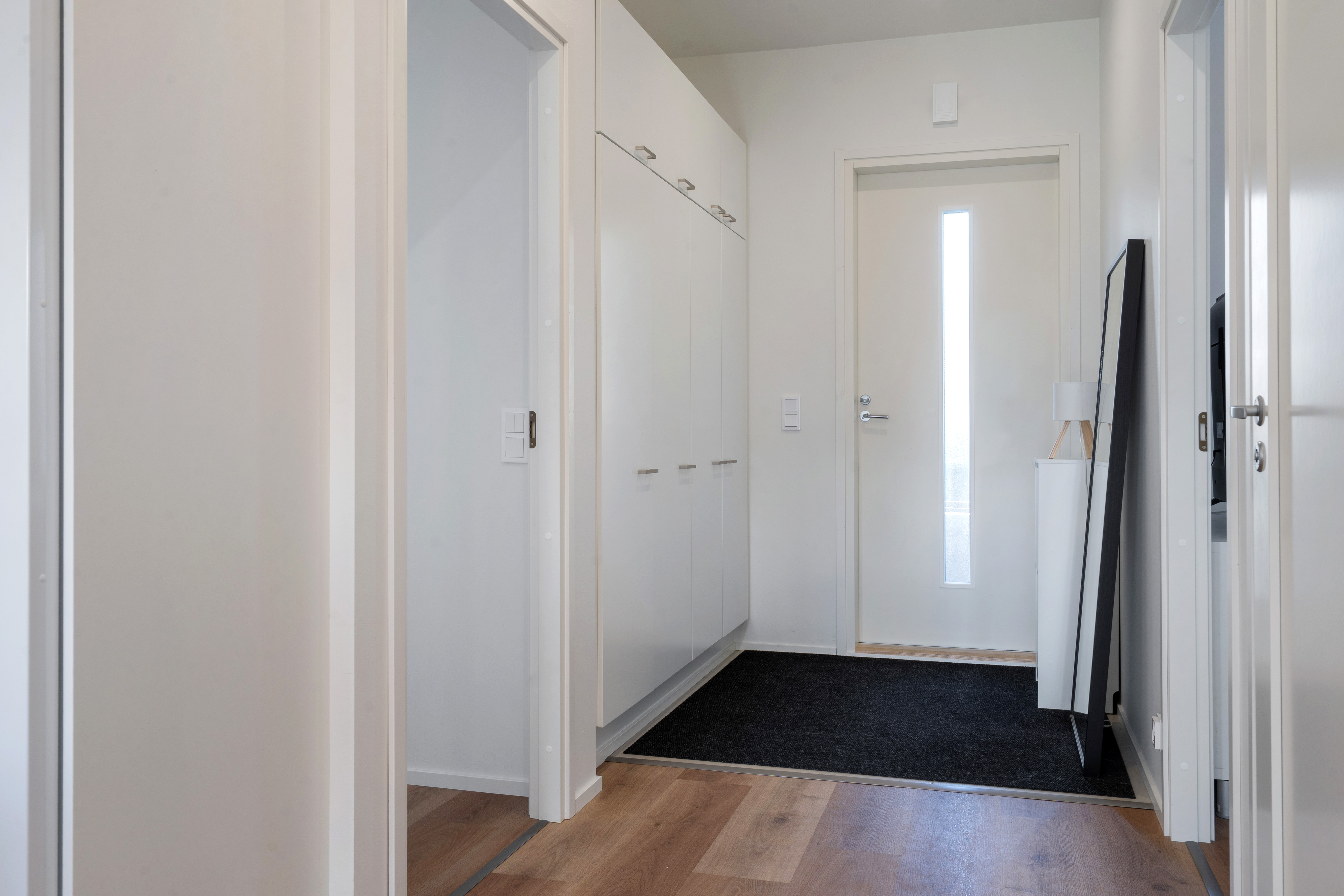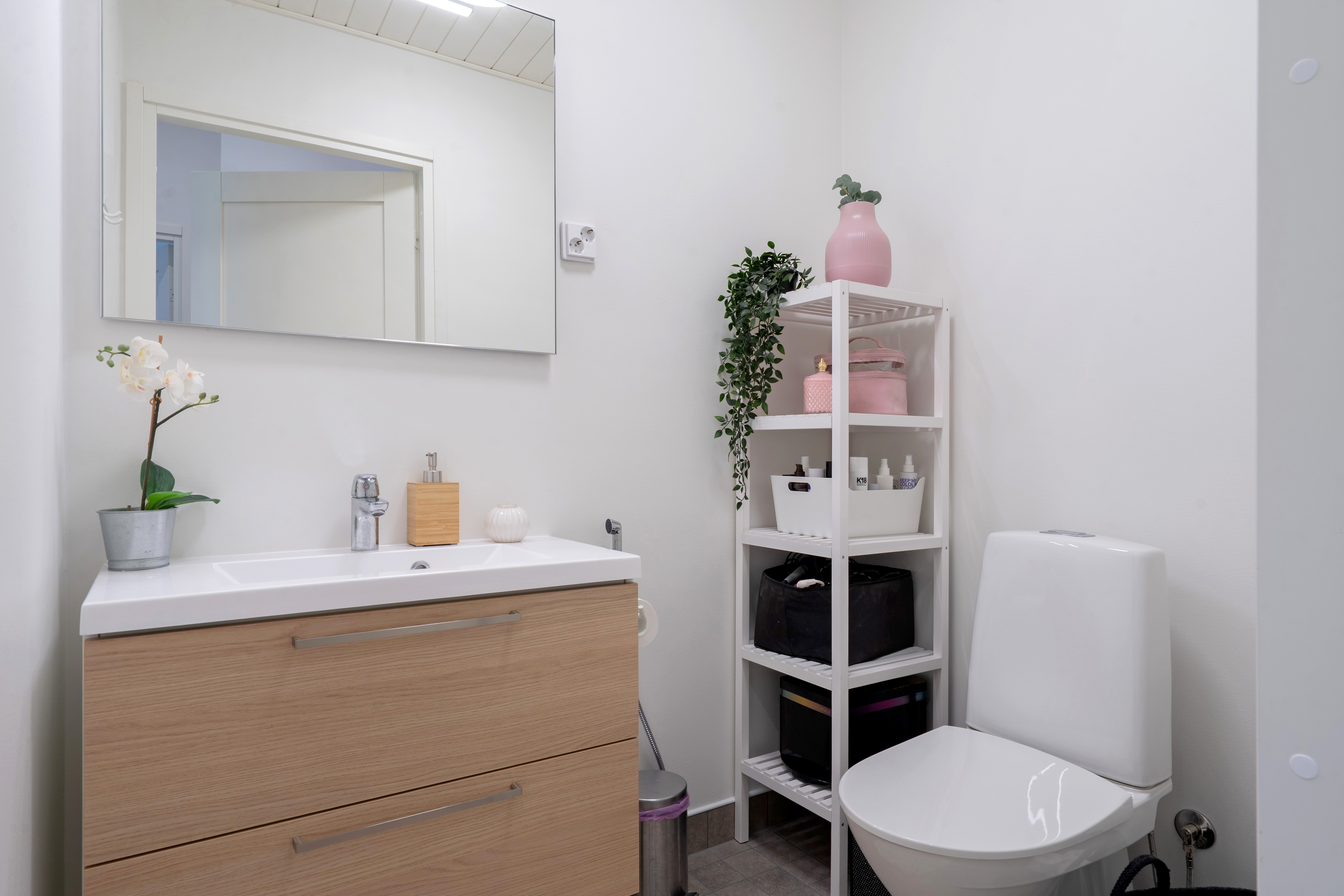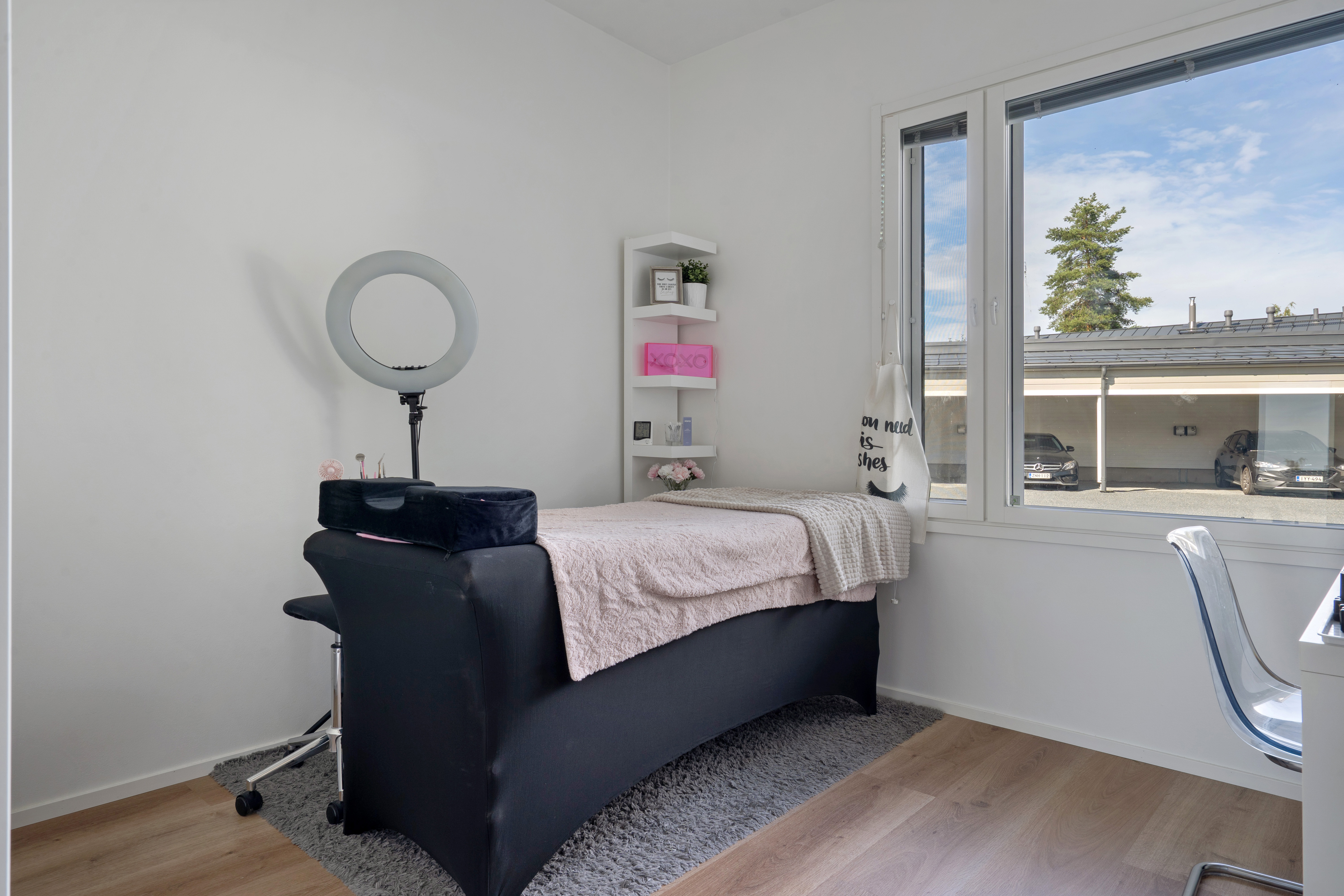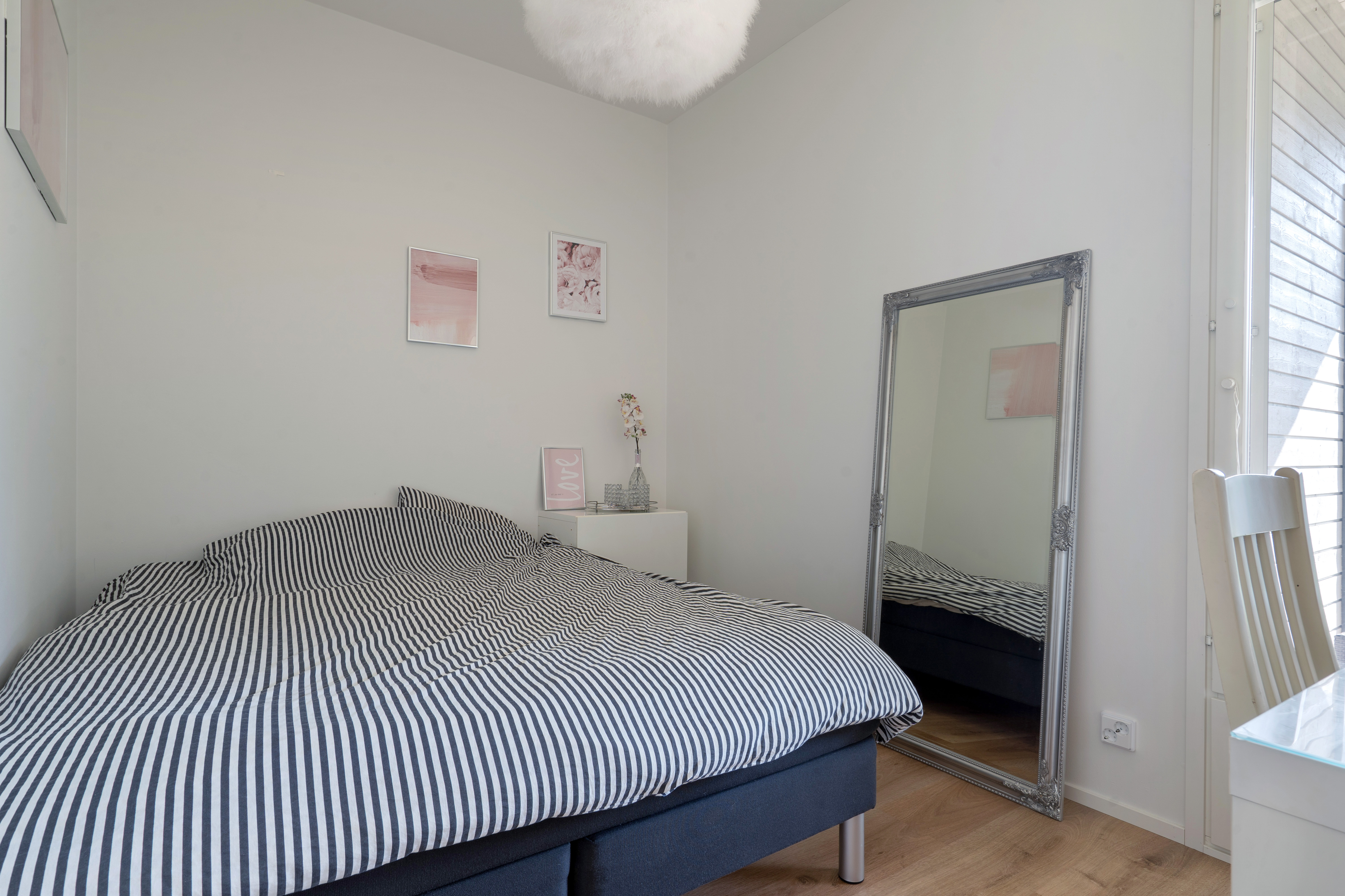 Säilytystilaa on runsaasti: eteisessä ja makuuhuoneessa on kiintokomeroita, ja oma varasto/tekninen tila sijaitsee kätevästi terassin yhteydessä.