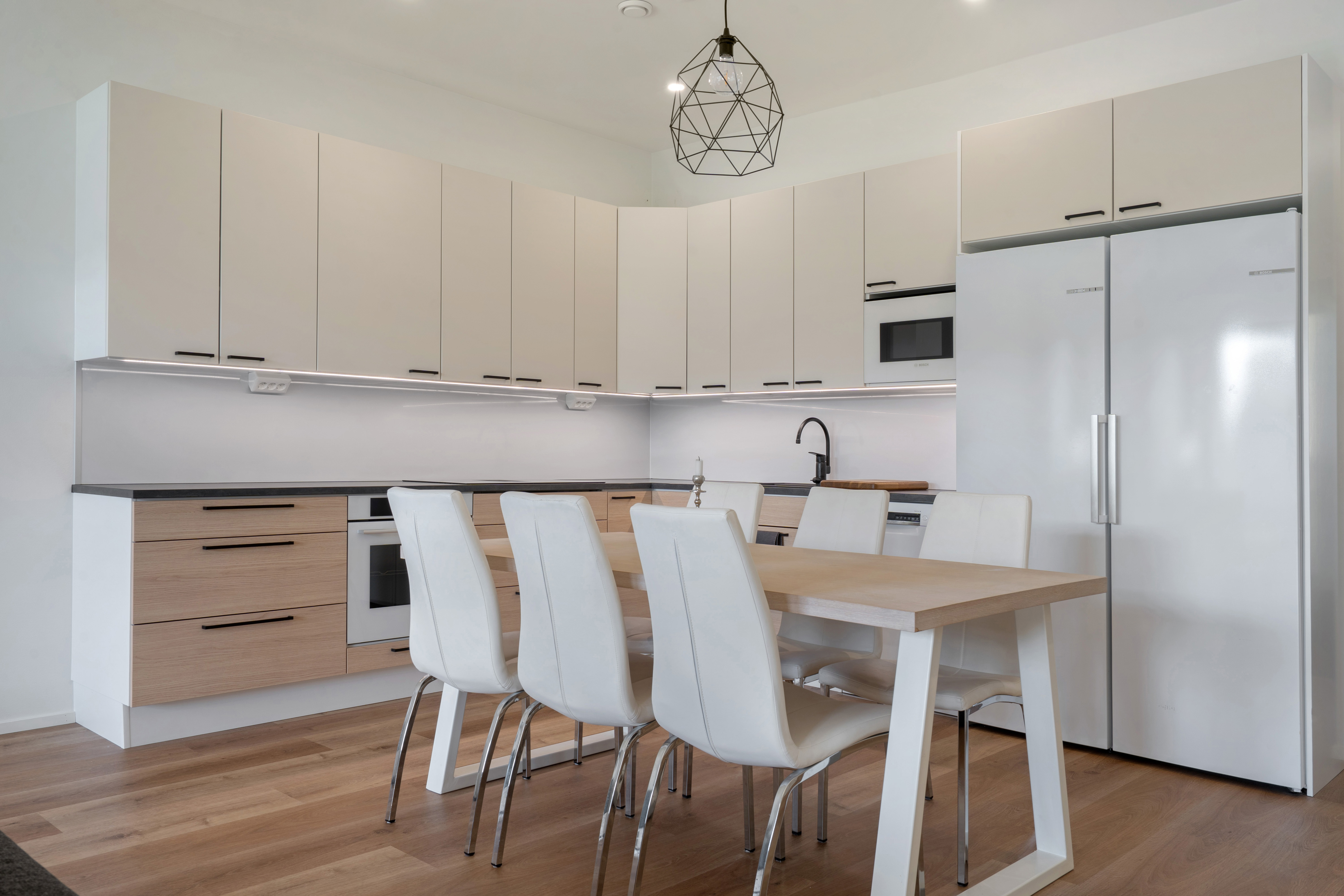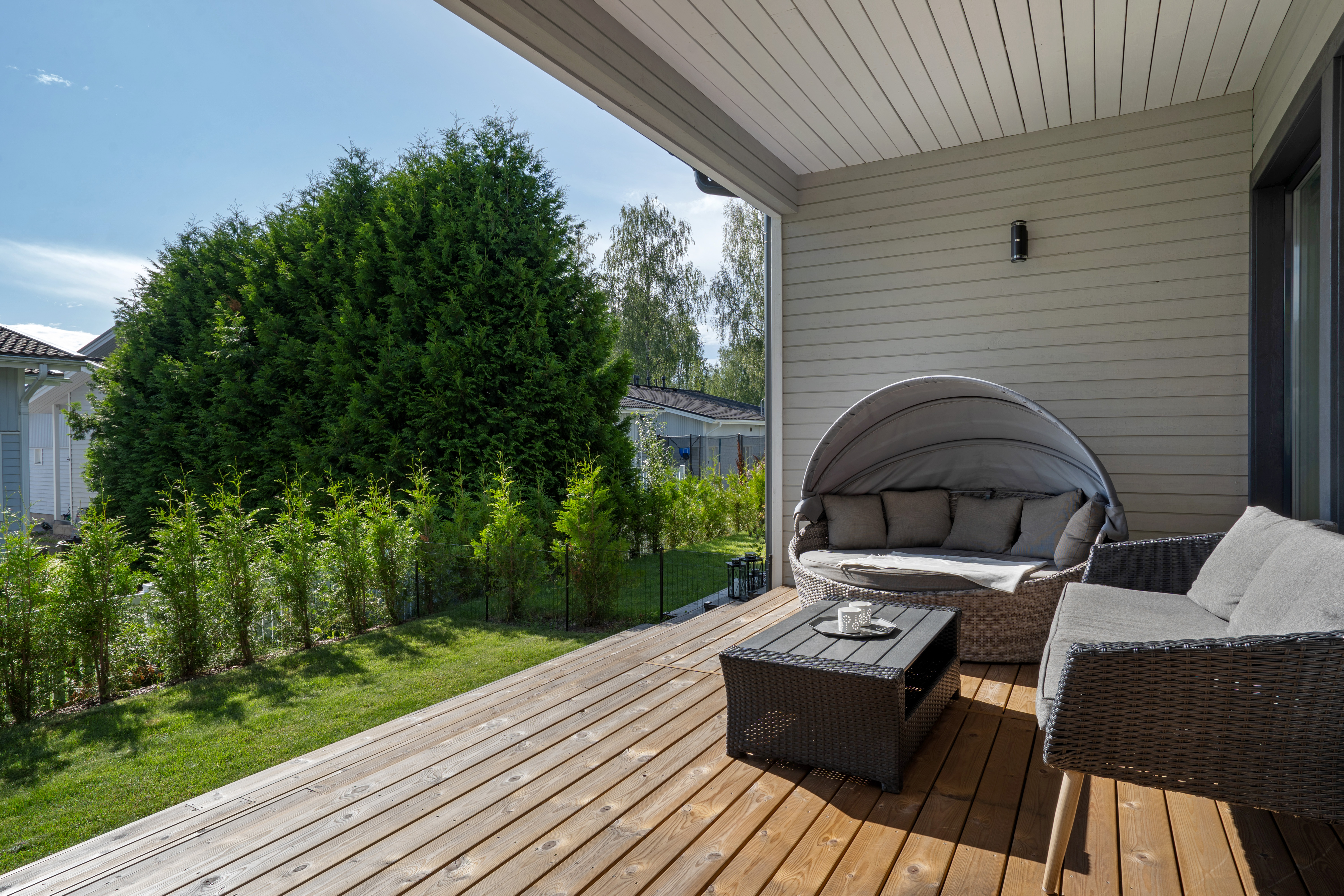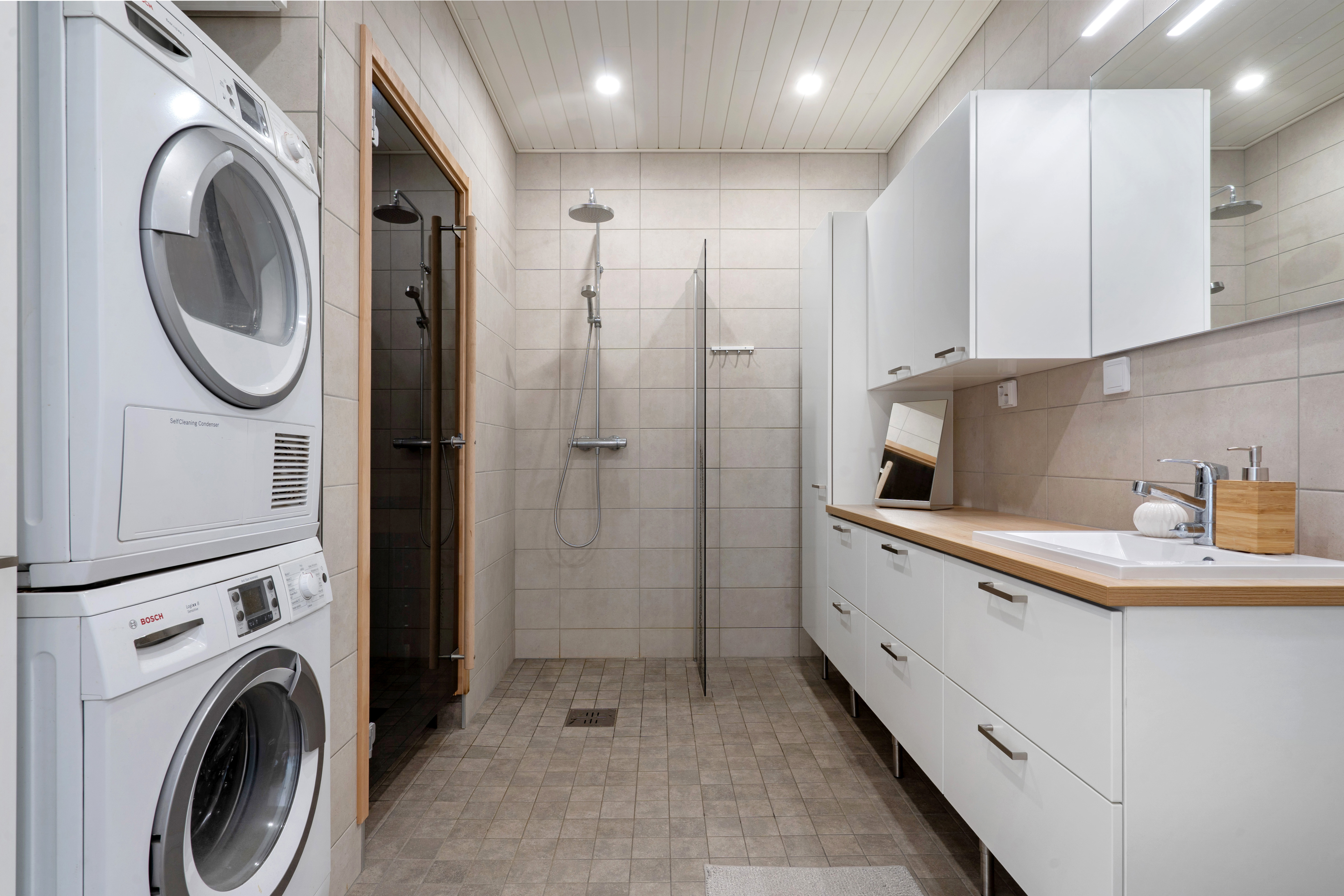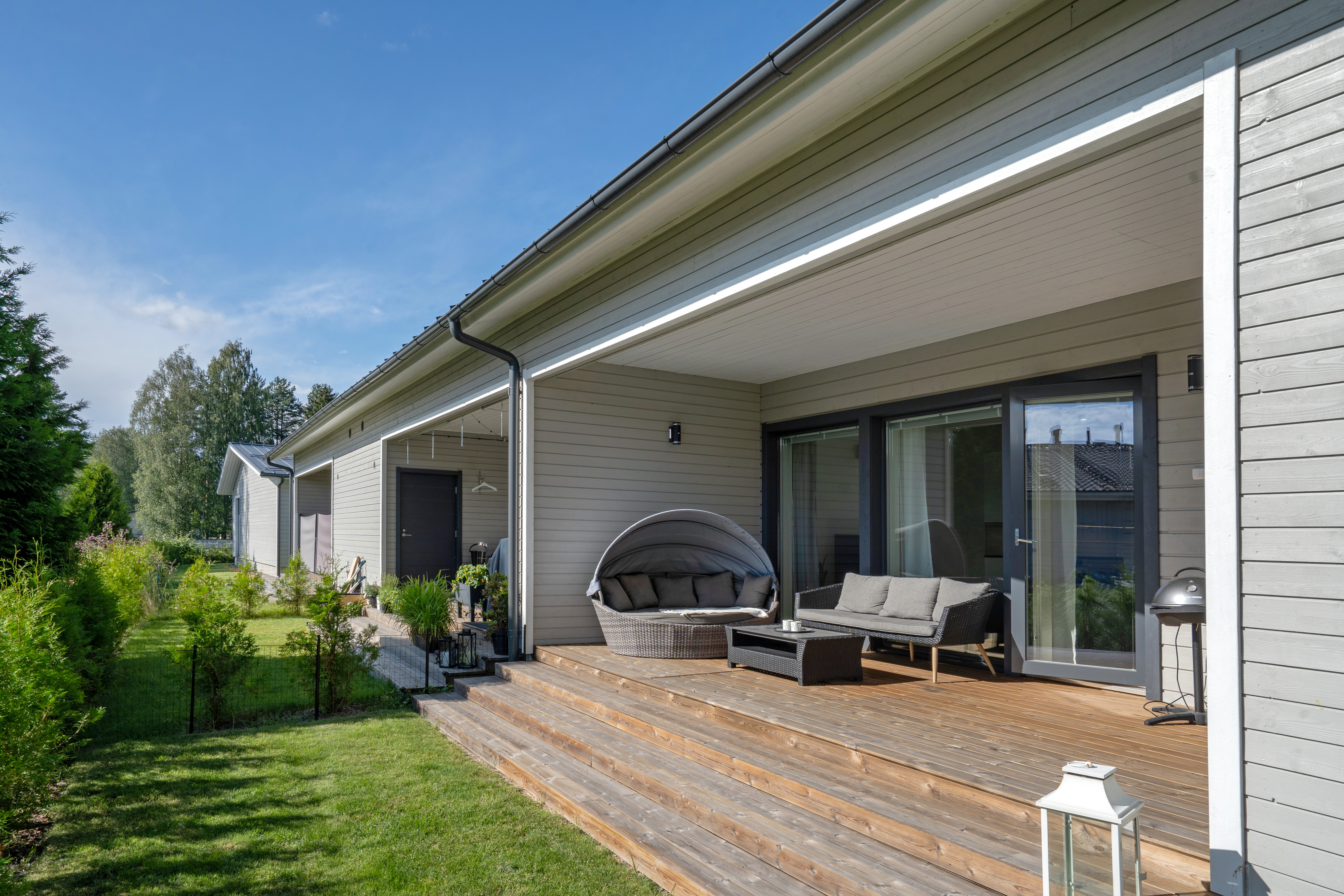 Kodin sydämenä toimii avoin olohuone-keittiö, jossa BOSCH-kodinkoneet ja ZACUS Oy:n laadukkaat kiintokalusteet tekevät arjesta sujuvaa. Keittiöstä on suora kulku katetulle terassille, joka tarjoaa ihanteellisen paikan rentoutumiseen ja ruokailuhetkiin läpi vuodenaikojen.
