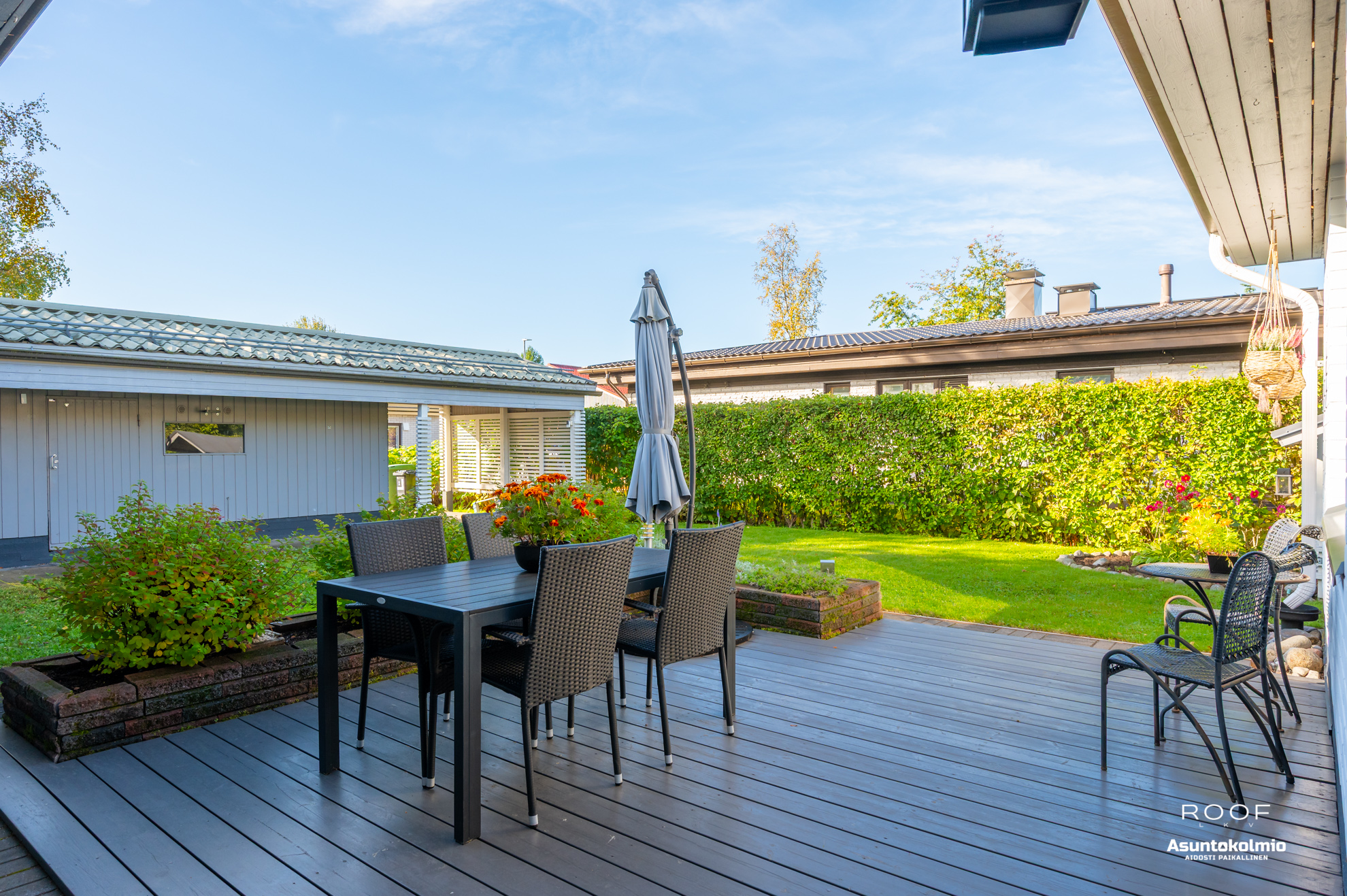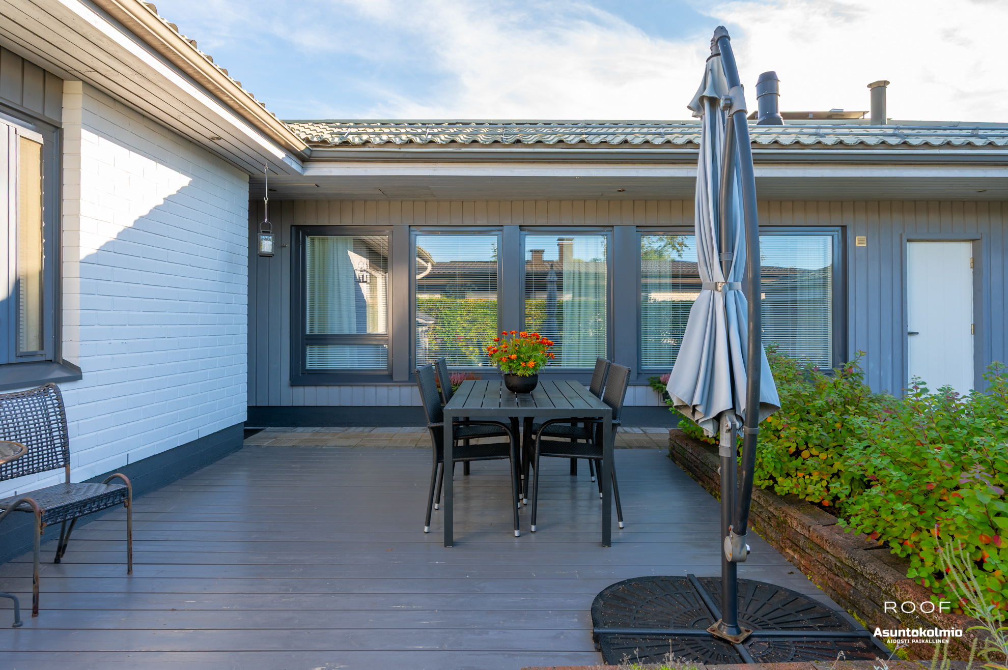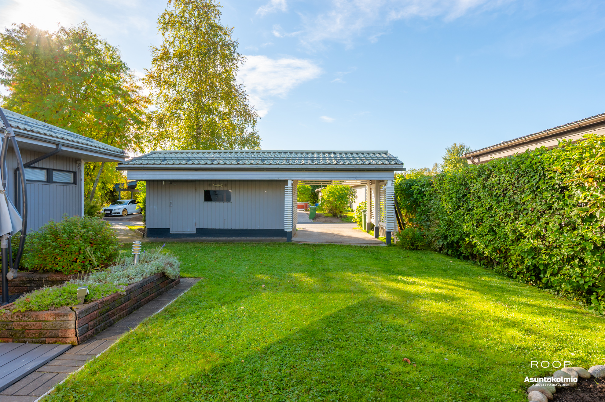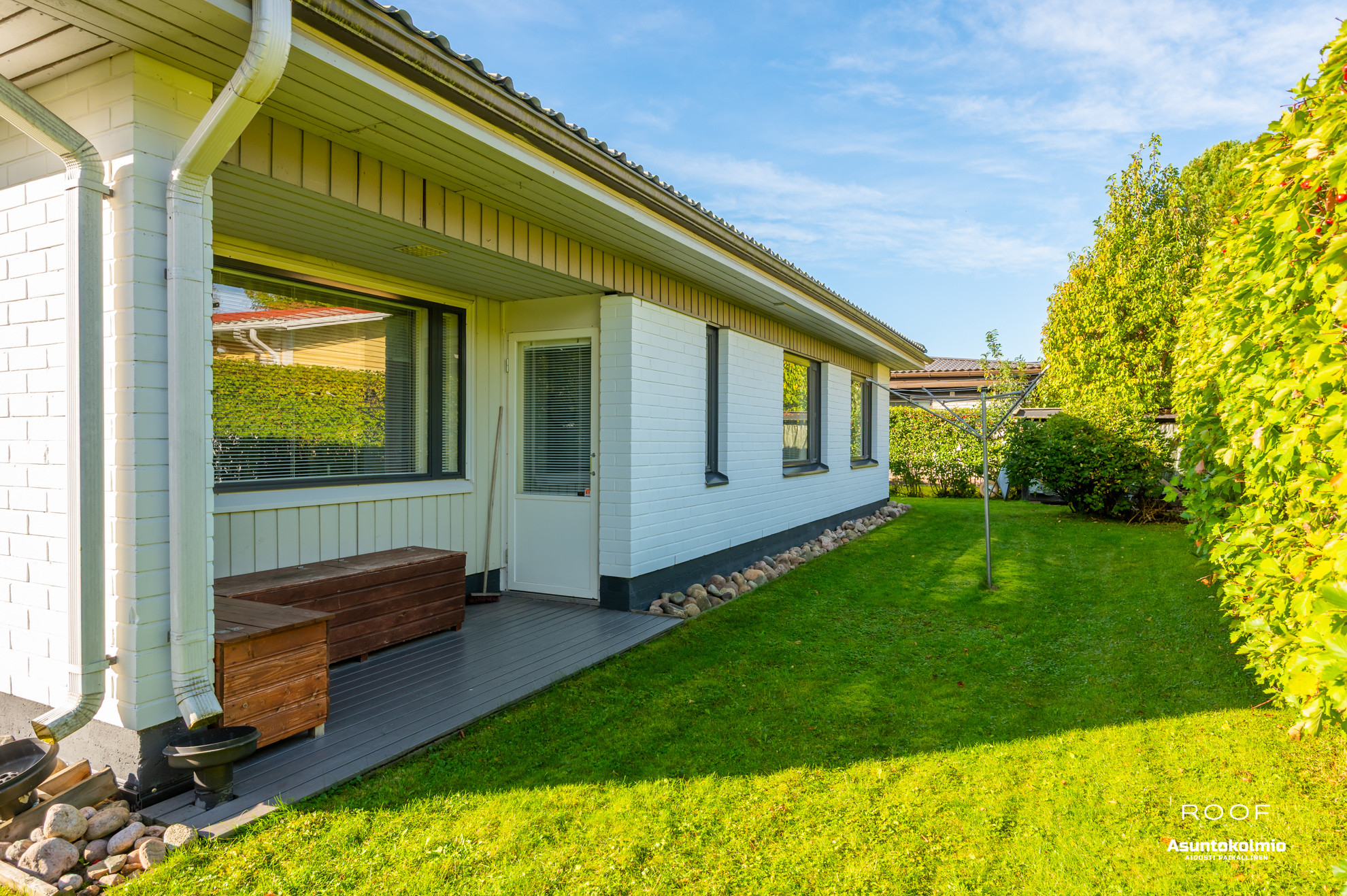Suojaisassa pihapiirissä on tilava terassi, jossa voi nauttia kesäpäivistä, sekä autokatos ja iso kylmä varasto. Lisäksi pihalla on leikkimökki ja hiekkalaatikko, jotka ilahduttavat perheen pienimpiä. Tontti tarjoaa mukavasti tilaa ulkoiluun ja rentoutumiseen.