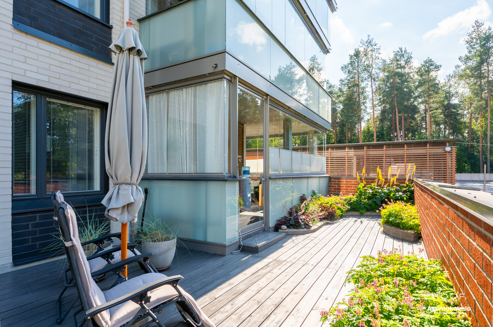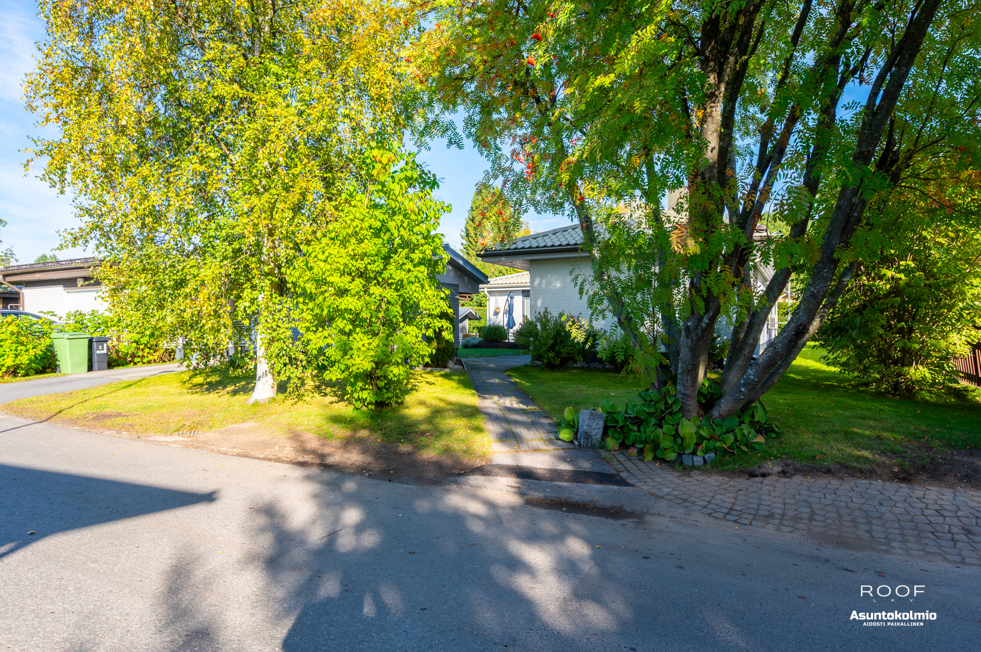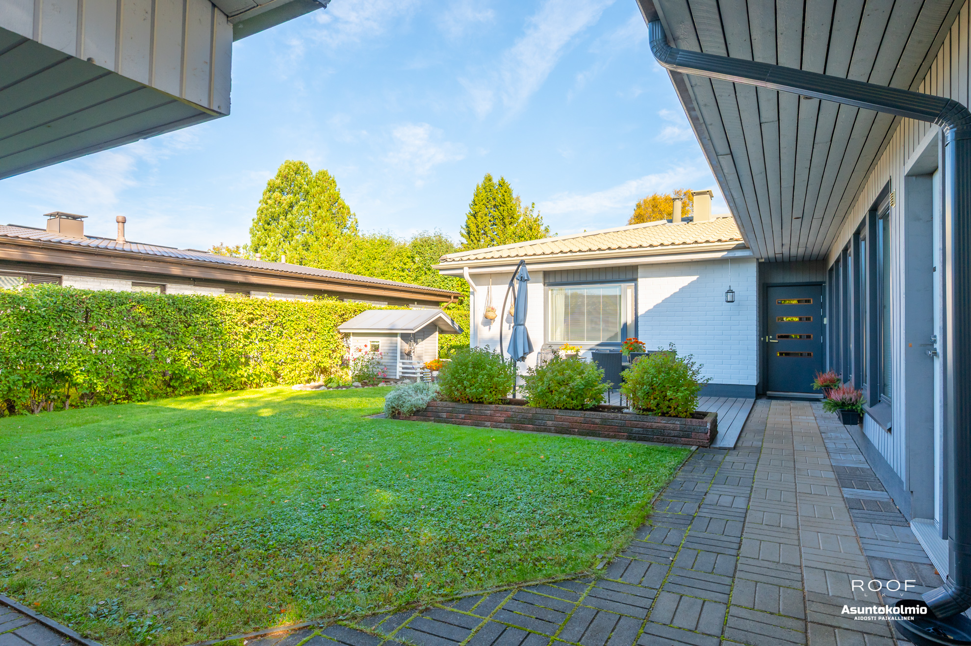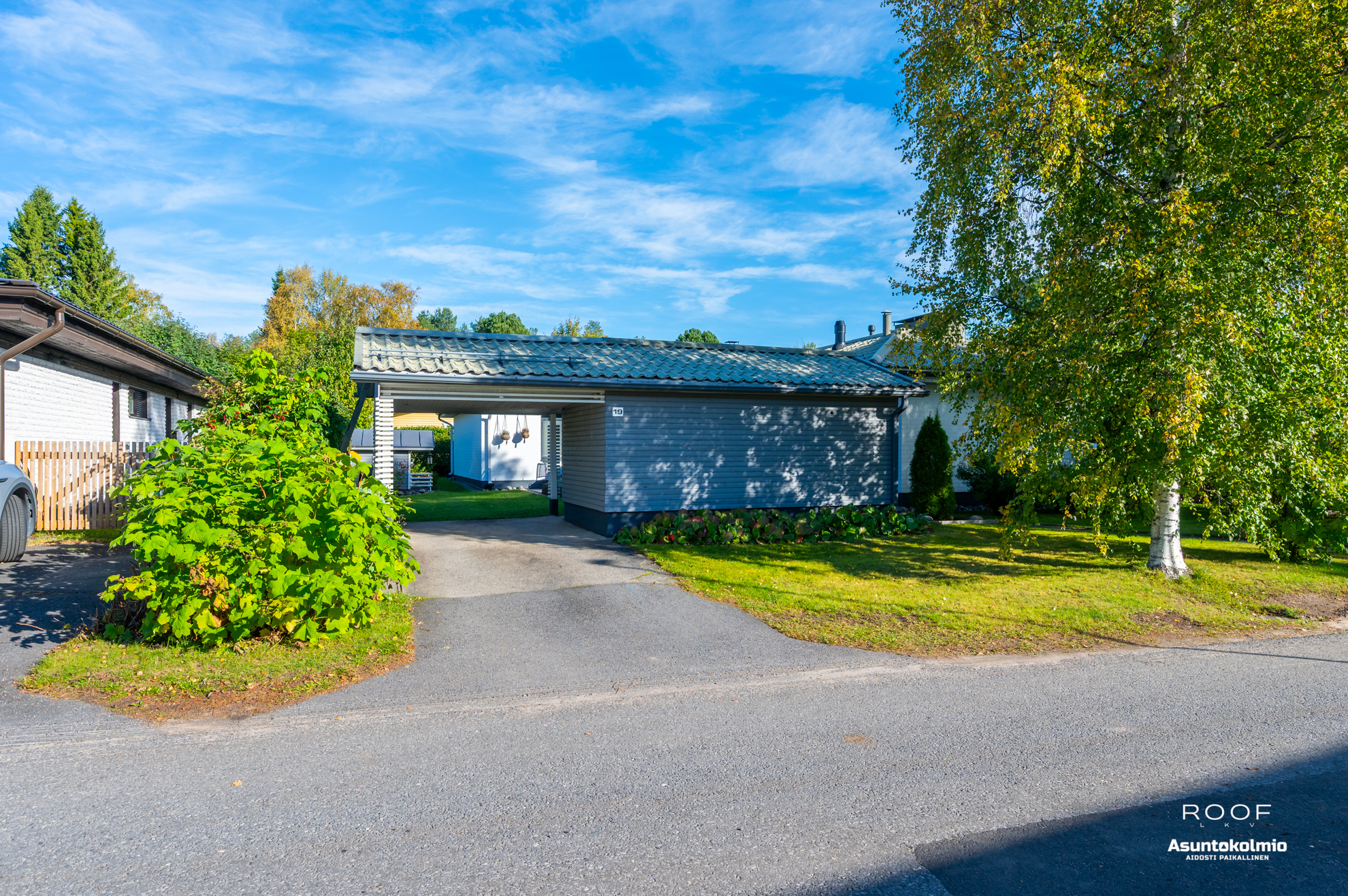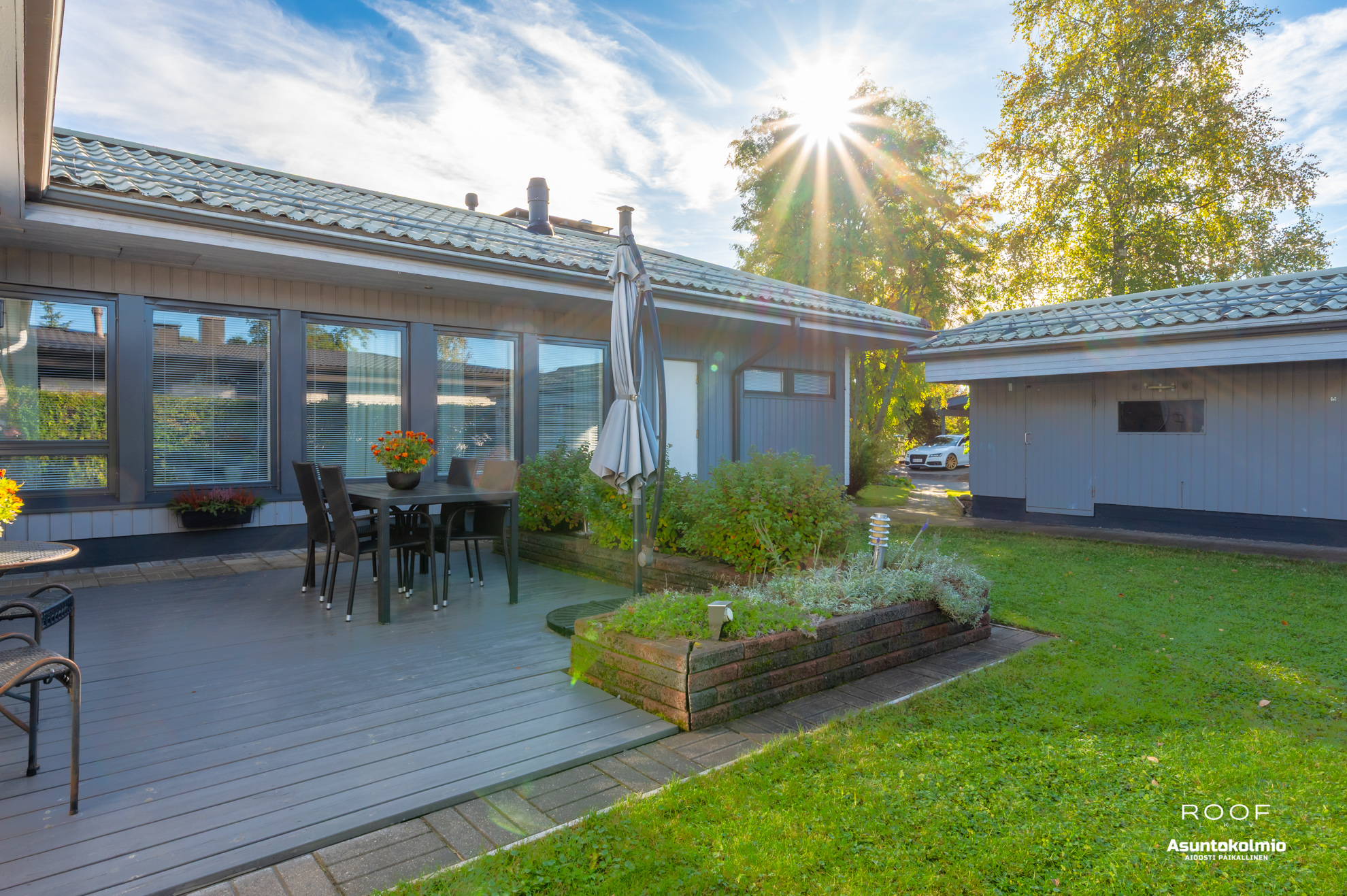 Suojaisassa pihapiirissä on tilava terassi, jossa voi nauttia kesäpäivistä, sekä autokatos ja iso kylmä varasto. Lisäksi pihalla on leikkimökki ja hiekkalaatikko, jotka ilahduttavat perheen pienimpiä. Tontti tarjoaa mukavasti tilaa ulkoiluun ja rentoutumiseen.