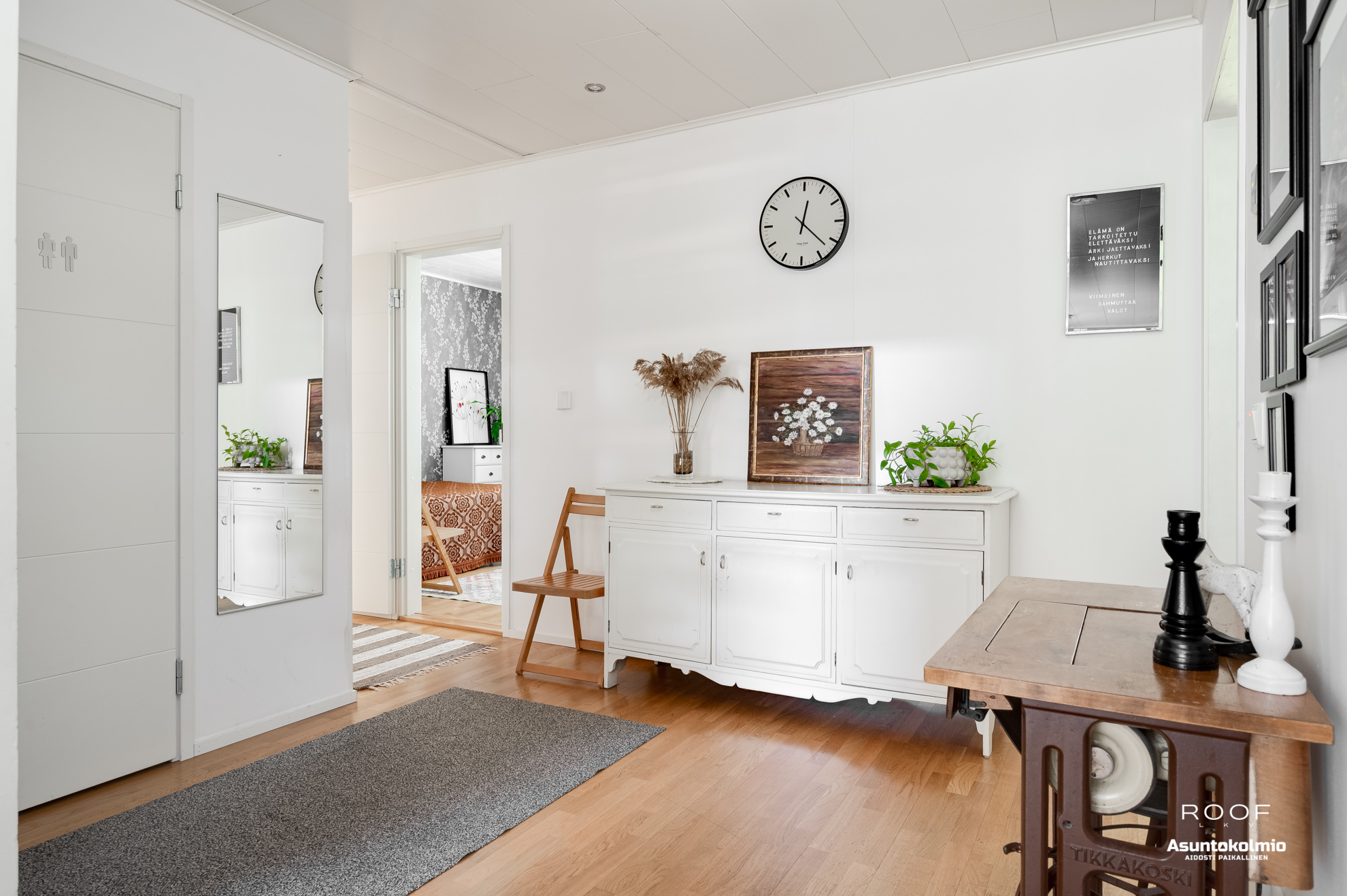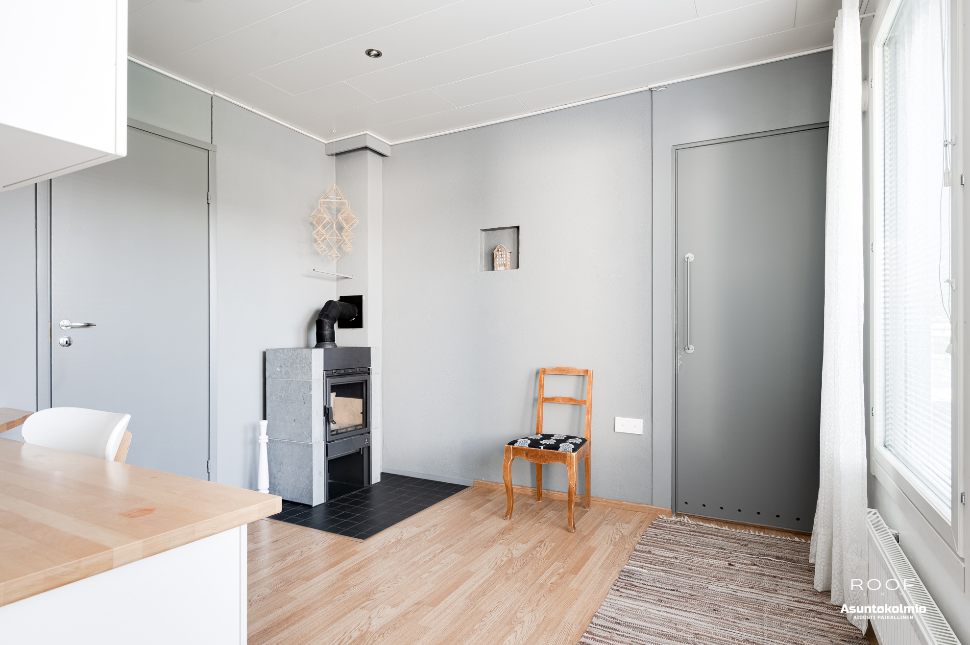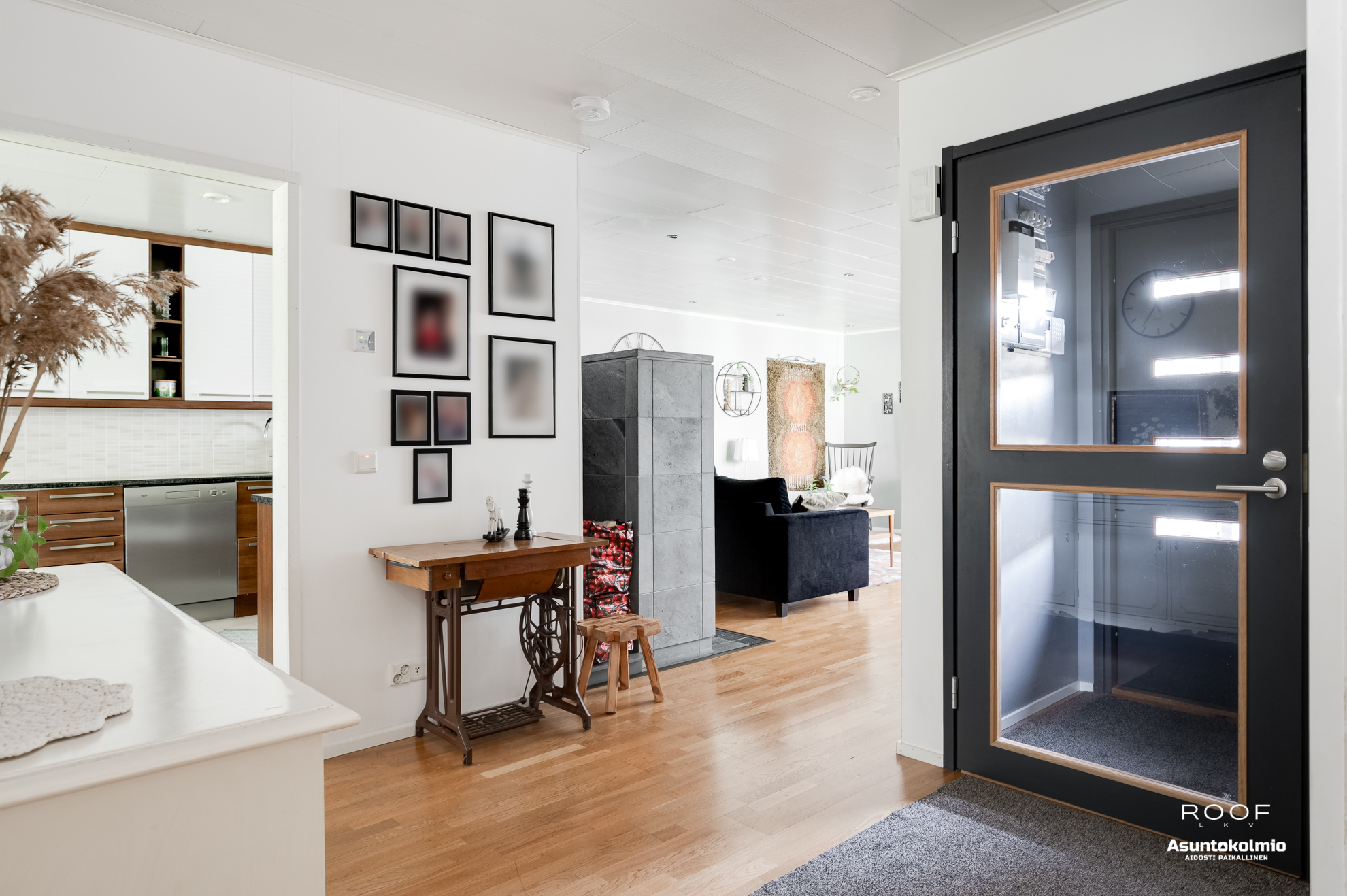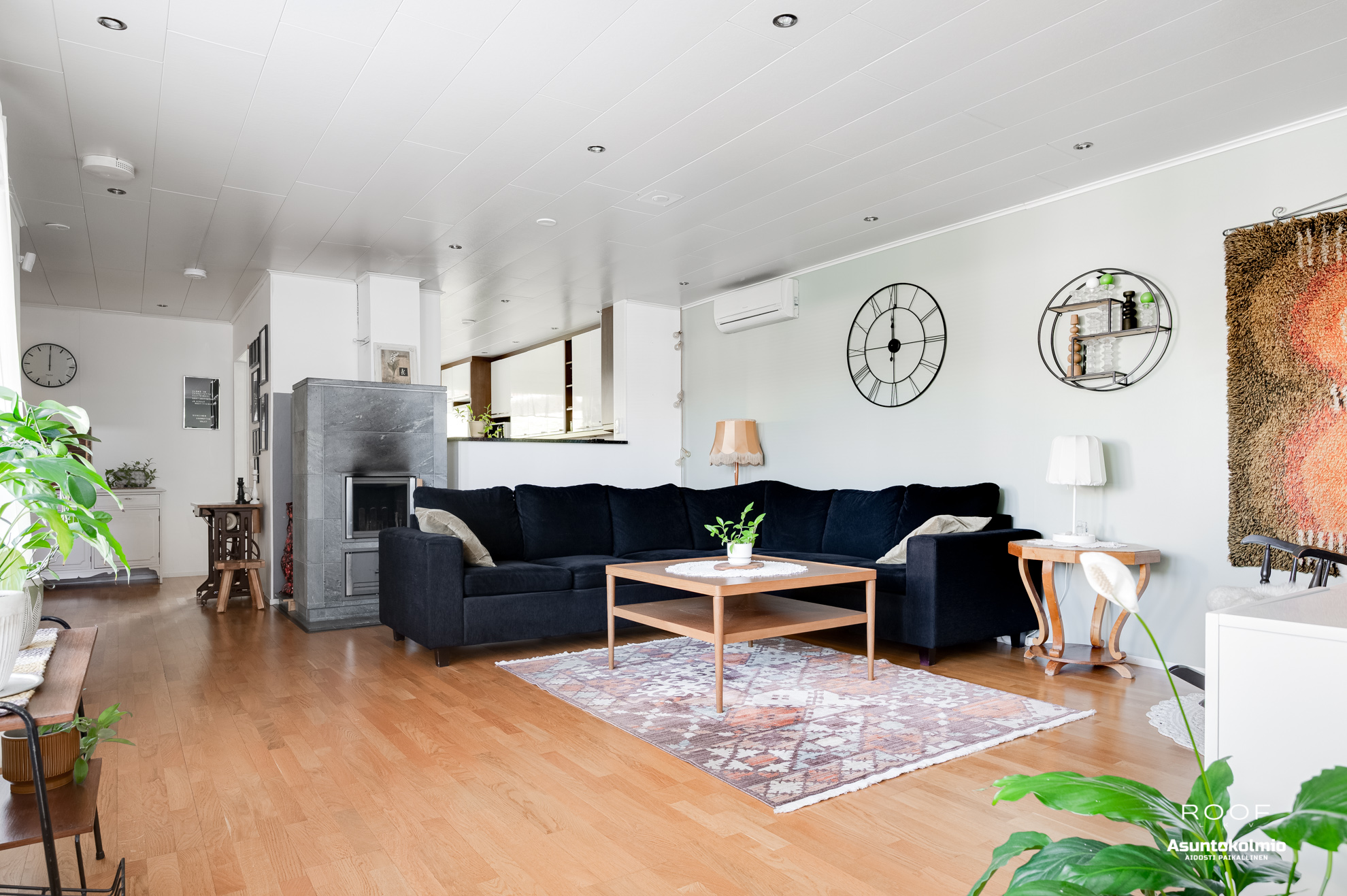 Asuintilat ovat yhdessä tasossa, ja talossa on kolme makuuhuonetta, jotka tarjoavat mukavasti tilaa perheelle. Olohuoneessa on lämpöä varaava takka, joka luo tunnelmaa ja tuo lisälämpöä kylminä talvi-iltoina. Keittiössä on lattialämmitys, joka lisää mukavuutta, ja modernit kodinkoneet helpottavat arkea.