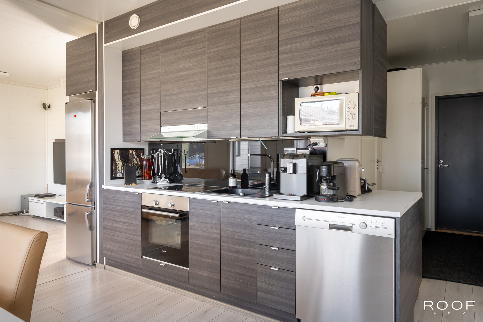 Keittiö ja olohuone muodostavat yhtenäisen, avaran kokonaisuuden, jossa on runsaasti luonnonvaloa suurten ikkunoiden kautta. Keittiössä on runsaasti kaappi- ja laskutilaa sekä nykyaikaiset kodinkoneet, kuten astianpesukone, jääkaappipakastin ja integroitu uuni sekä liesitaso. Ruokailuryhmälle on oma paikkansa ikkunan ääressä, ja olohuoneessa on tilaa suuremmallekin sohvaryhmälle.