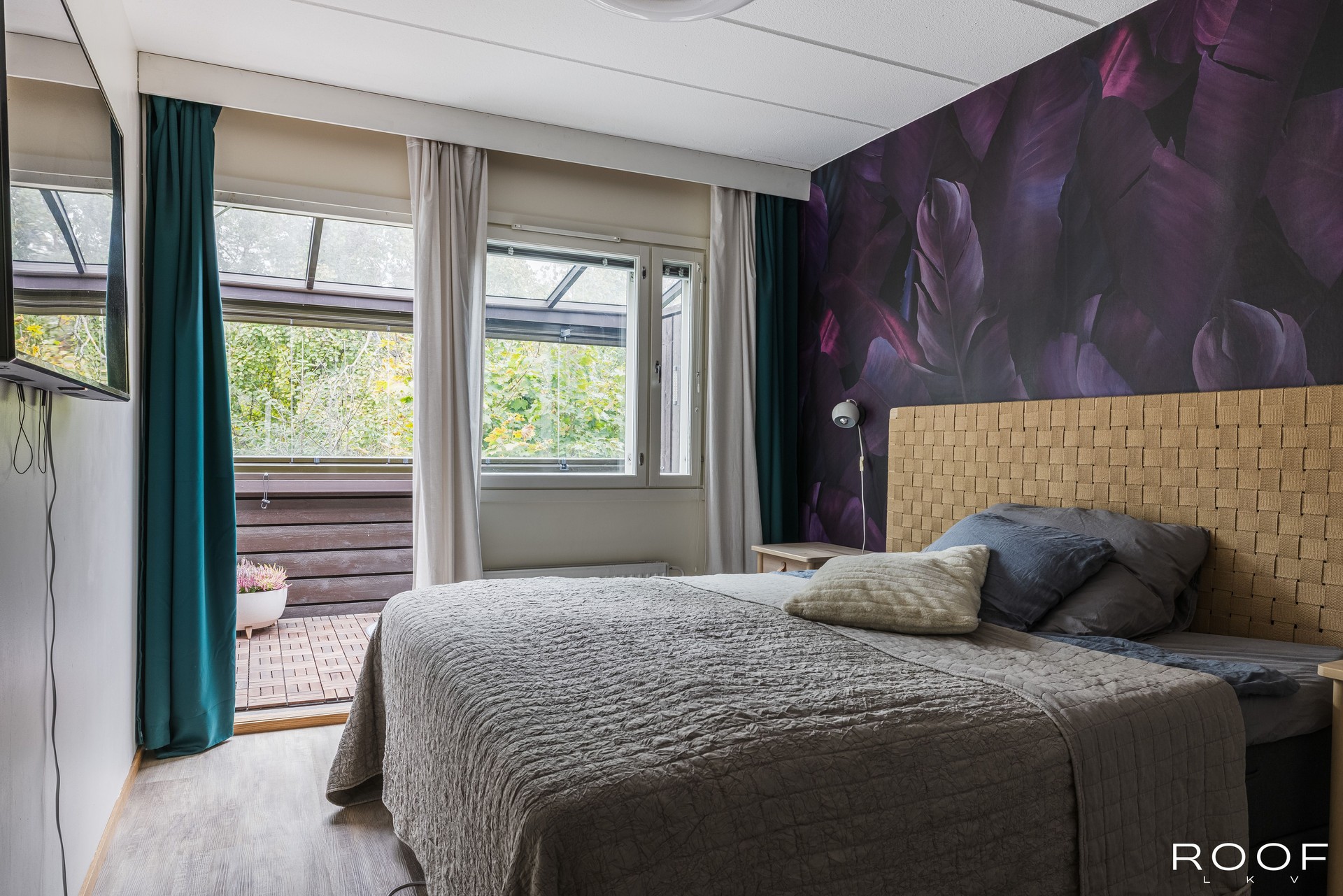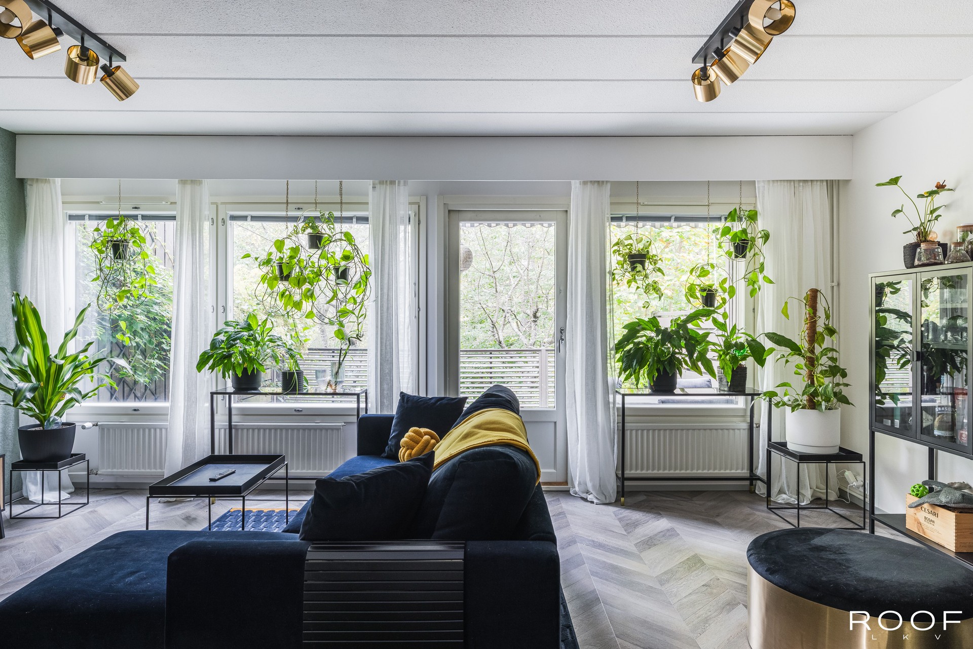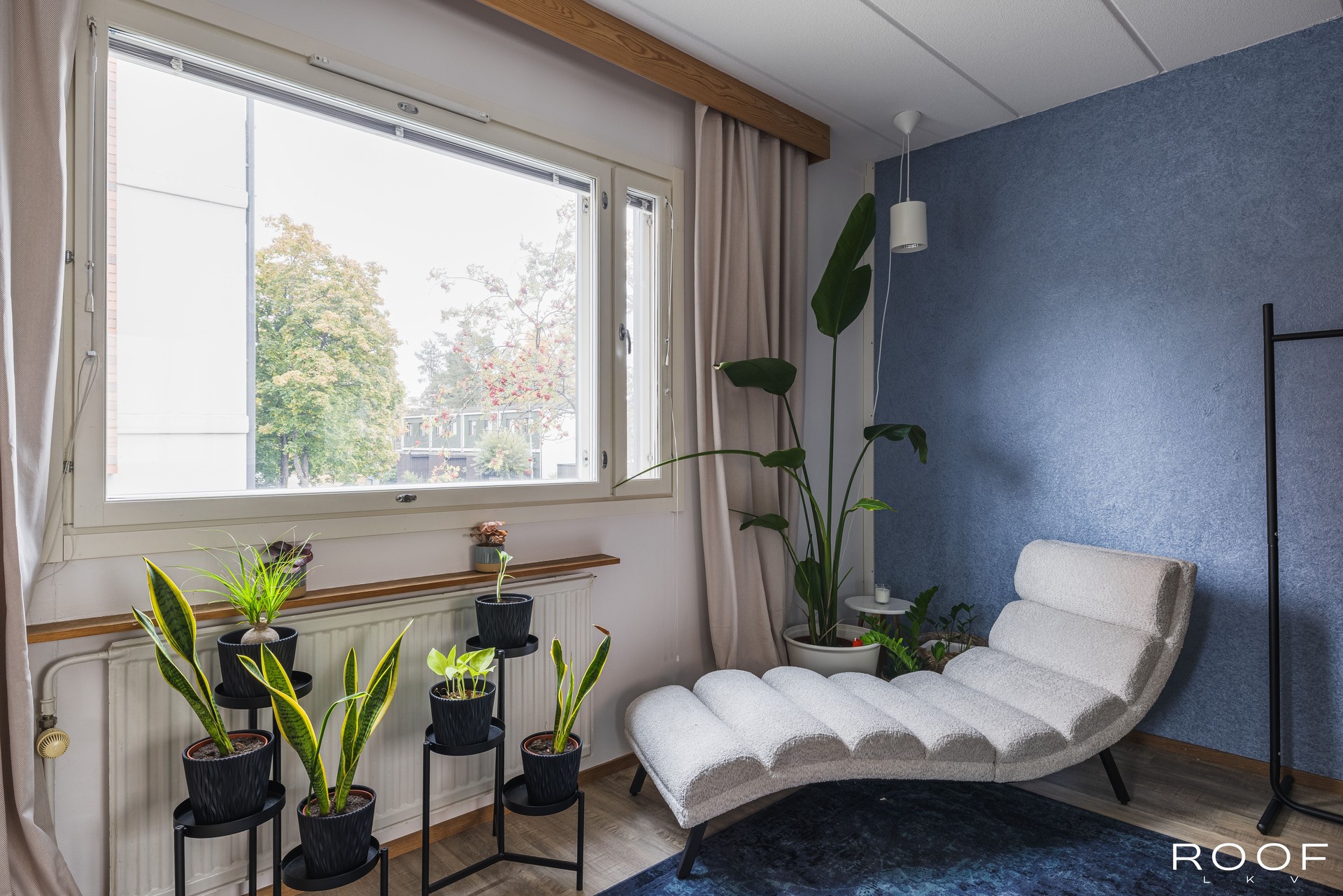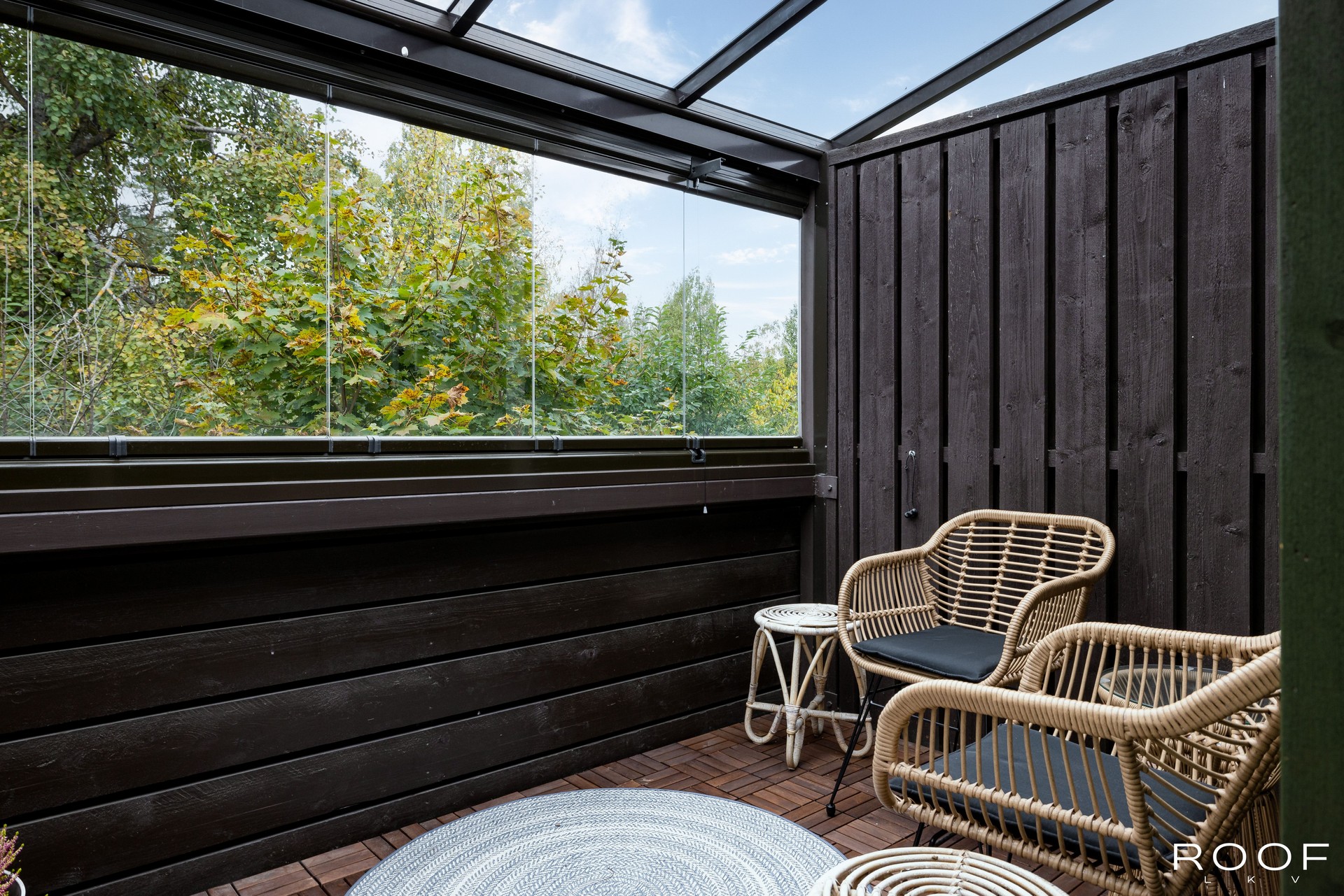 Asunnon oma sauna ja kylpyhuone tarjoavat arjen mukavuutta, ja lasitettu parveke sekä terassi laajentavat oleskelutiloja ulos. Parveke avautuu lounaaseen, mikä tuo mukavasti iltapäivän aurinkoa. Asunnon pinnat ovat hyvässä kunnossa, ja luonnonvalo tulvii sisään isoista ikkunoista.