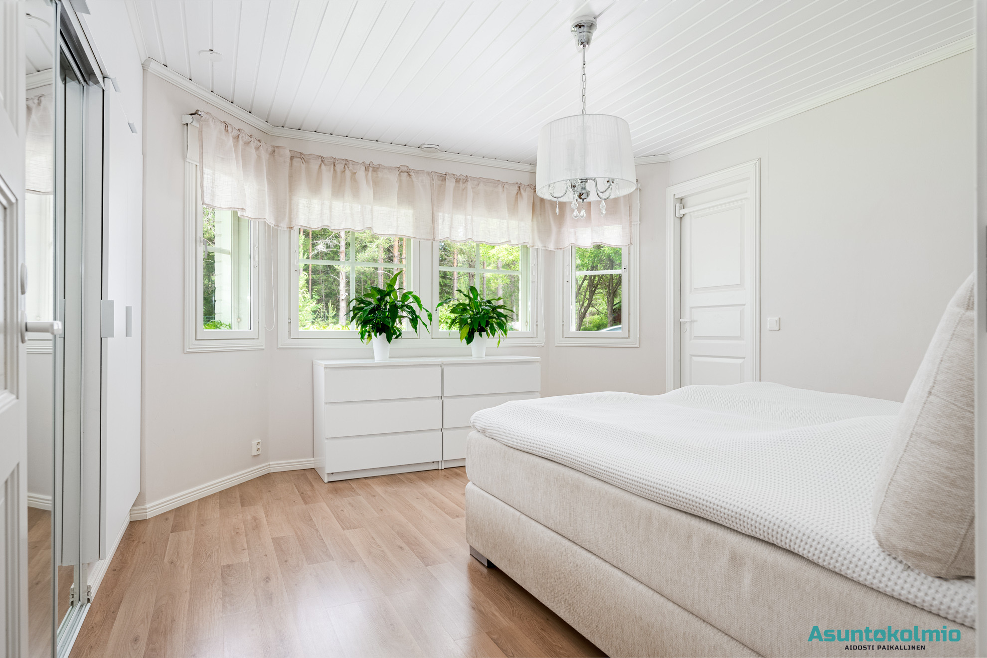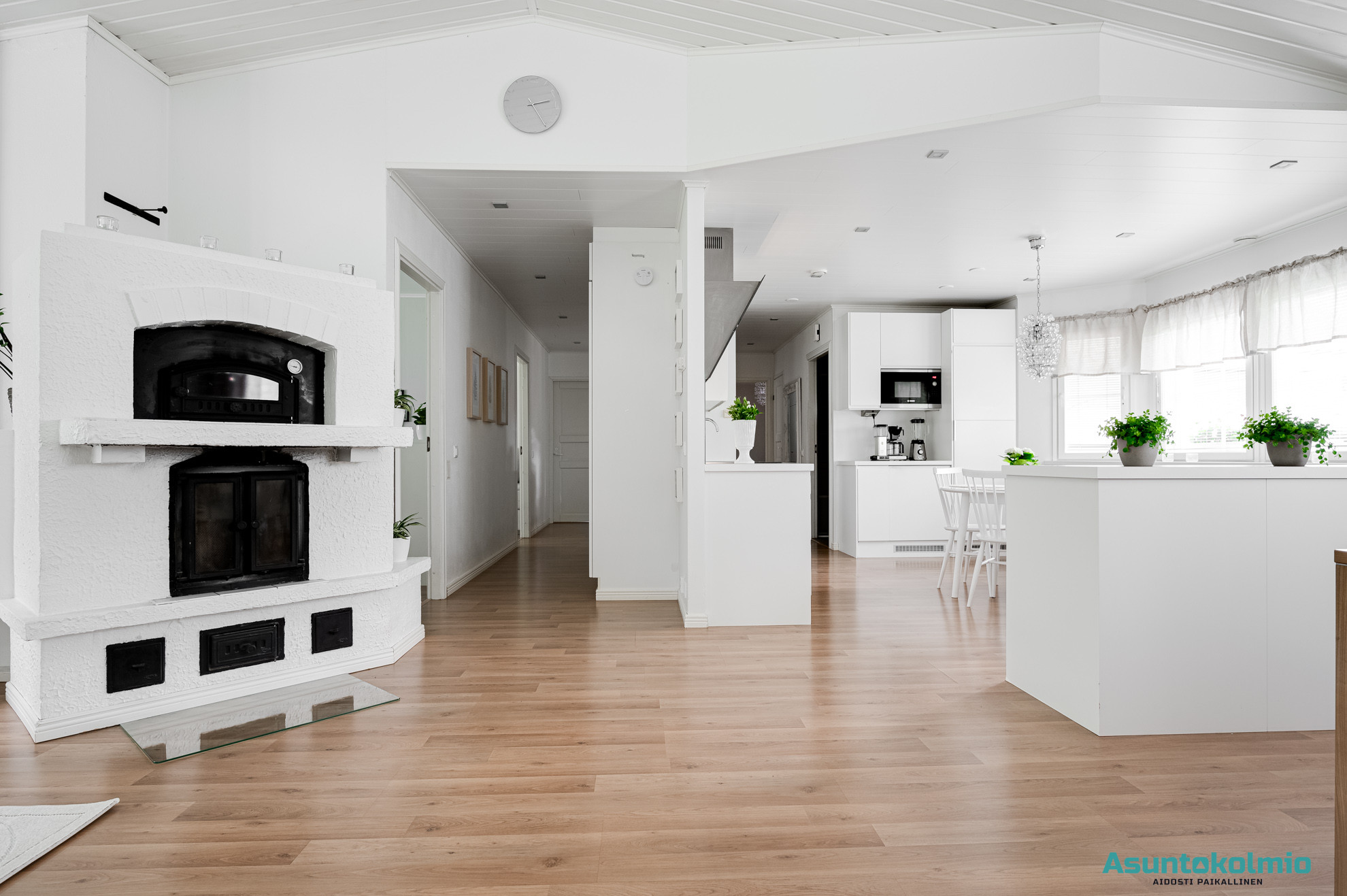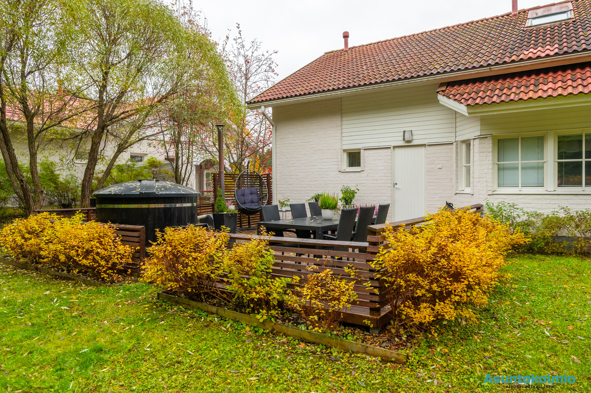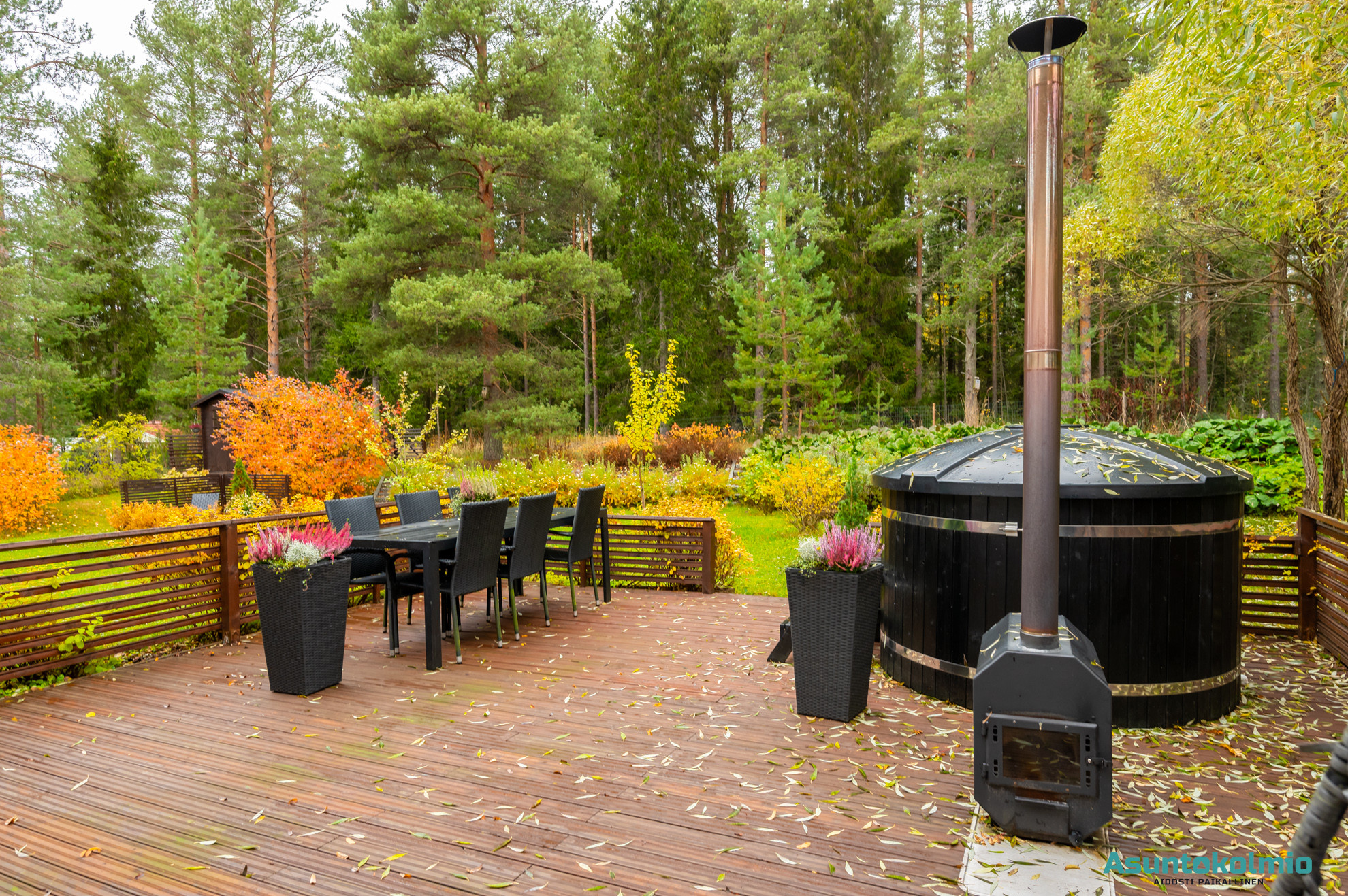 Kerrassaan upea omakotitalo ja 2005 laajennettu yläkerta sisältää yhteensä 4 tilavaa makuuhuonetta, jonka lisäksi on esim. vierashuoneeksi soveltuva iso yläkerran aula sekä varastohuone. Alakerrassa olevat yhteiset tilat ovat käytännölliset ja kodin pinnat on lähes kauttaaltaan remontoitu vuosien 2015-2024 aikana. Olohuoneessa korotettu sisäkatto antaa tilalle ilmettä ja puistomaisia näkymiä kelpaa ihailla. Keittiö on nykyaikaisen vaalea ja kauniin tyylikäs ja sen yhteydessä oleva ruokailutila yhdistää olohuone-keittiön mukavan yhtenäiseksi. Vastikään remontoitu kodinhoitohuone on monen unelma, ja se sisältää runsaasti kaappitilaa, oman sisäänkäynnin, kurapisteen, arkieteisen sekä erillisen vaatehuoneen. Lämmin autotalli, sähköauton latauspisteellä varustettu autokatos, lämpimät varastotilat ja isolla takaterassilla oleva palju viimeistelevät tämän ihastuttavan kokonaisuuden ja kaunis piha-alue on erityisen viehättävä jokaisena vuodenaikana. Näyttävästä sisääntulosta löytyy komeat muurit, jotka ovat kiinteästi valaistut.