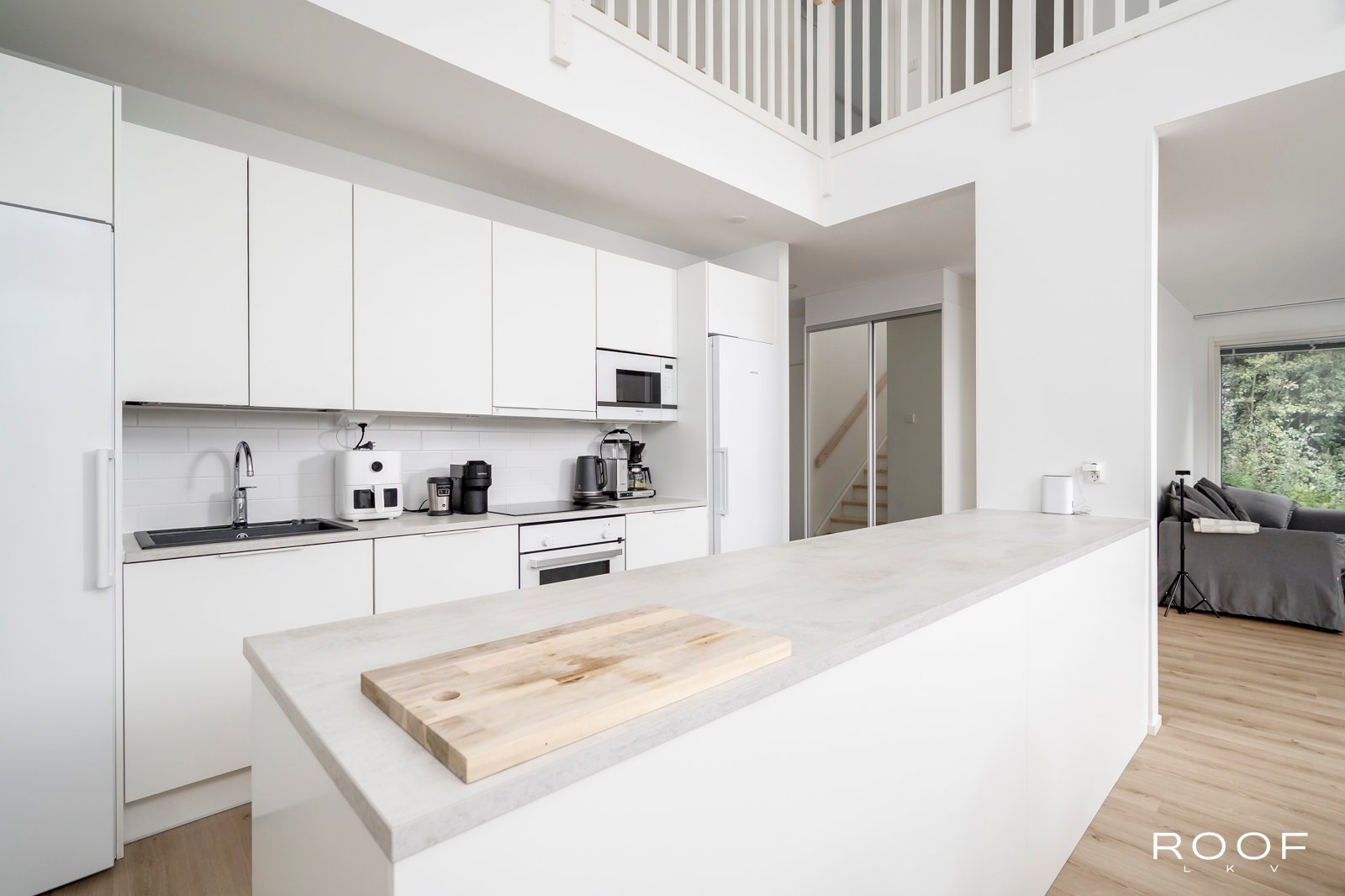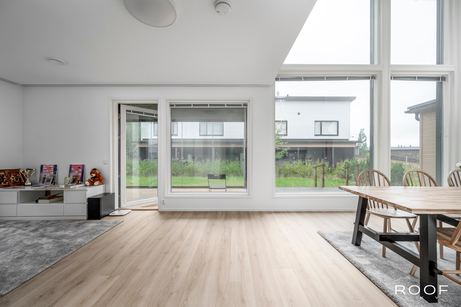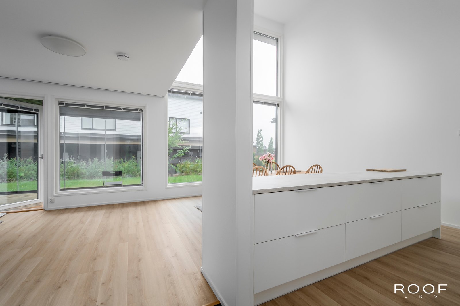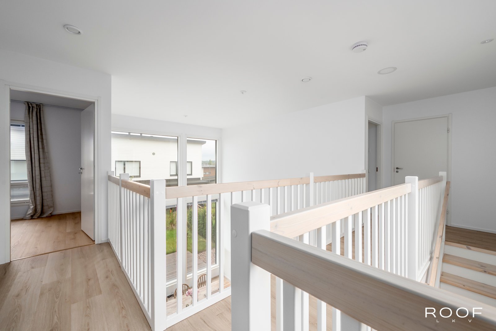 Tervetuloa tutustumaan tähän valoisaan ja avaraan paritaloasuntoon, joka tarjoaa toimivat tilat isommankin perheen arkeen. Asunnon pohjaratkaisu on suunniteltu käytännölliseksi ja viihtyisäksi: yläkerrasta löytyvät makuuhuoneet takaavat rauhalliset yöunet, kun taas alakerrassa kodin sydän, olohuone ja keittiö, yhdistyvät saumattomasti toisiinsa. Suuret ikkunat tuovat runsaasti luonnonvaloa, ja ruokailutilan kohdalla oleva hulppea aukko ylös asti lisää avaruuden tuntua. Käytännöllisyyttä arkeen tuo kaksi wc:tä, yksi kummassakin kerroksessa.