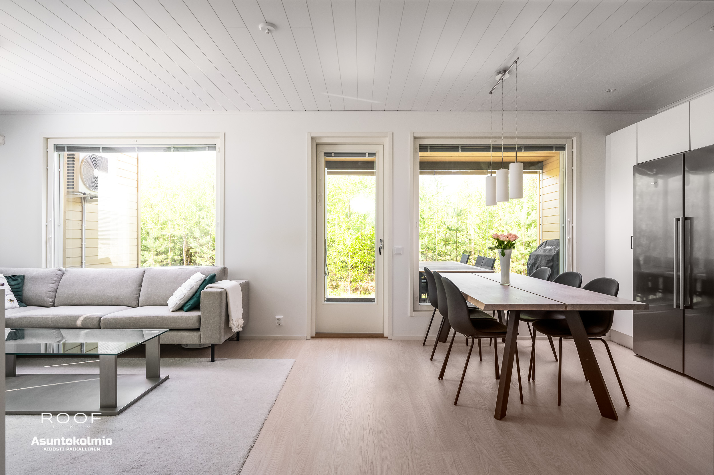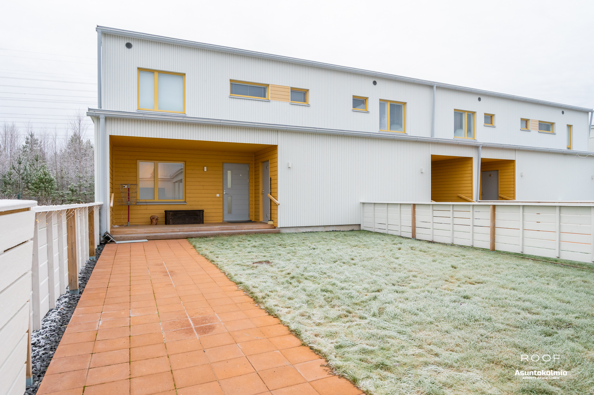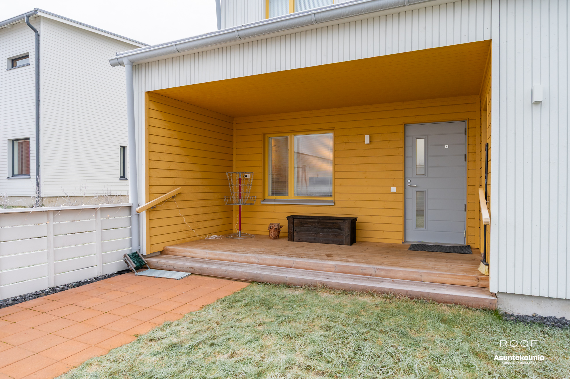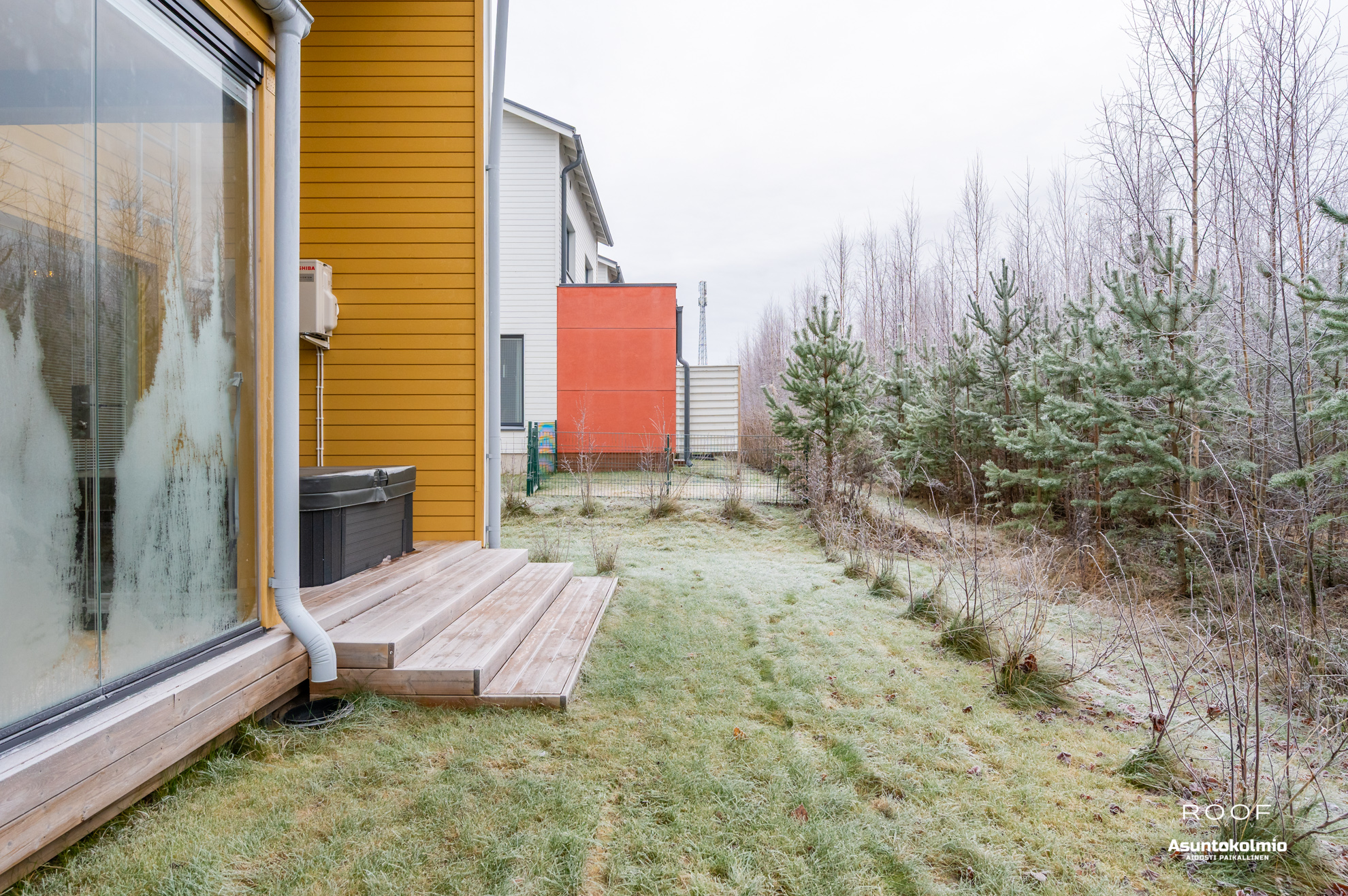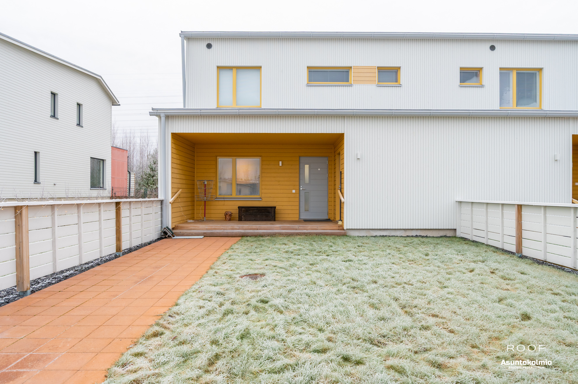 Vuonna 2022 valmistunut neljän makuuhuoneen suuri 119,5m2 rivitalon päätykoti metsään rajoittuvalla takapihalla.