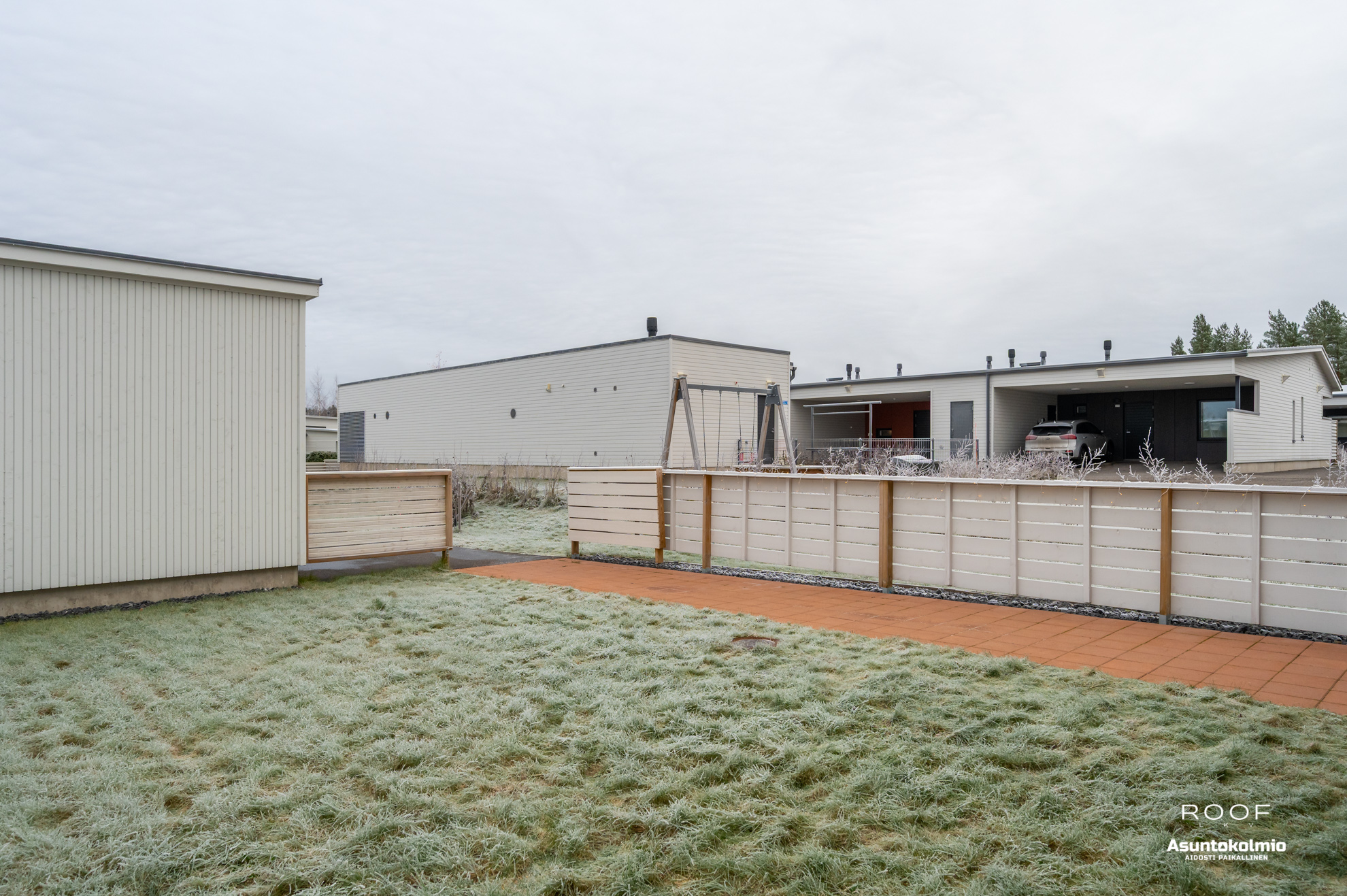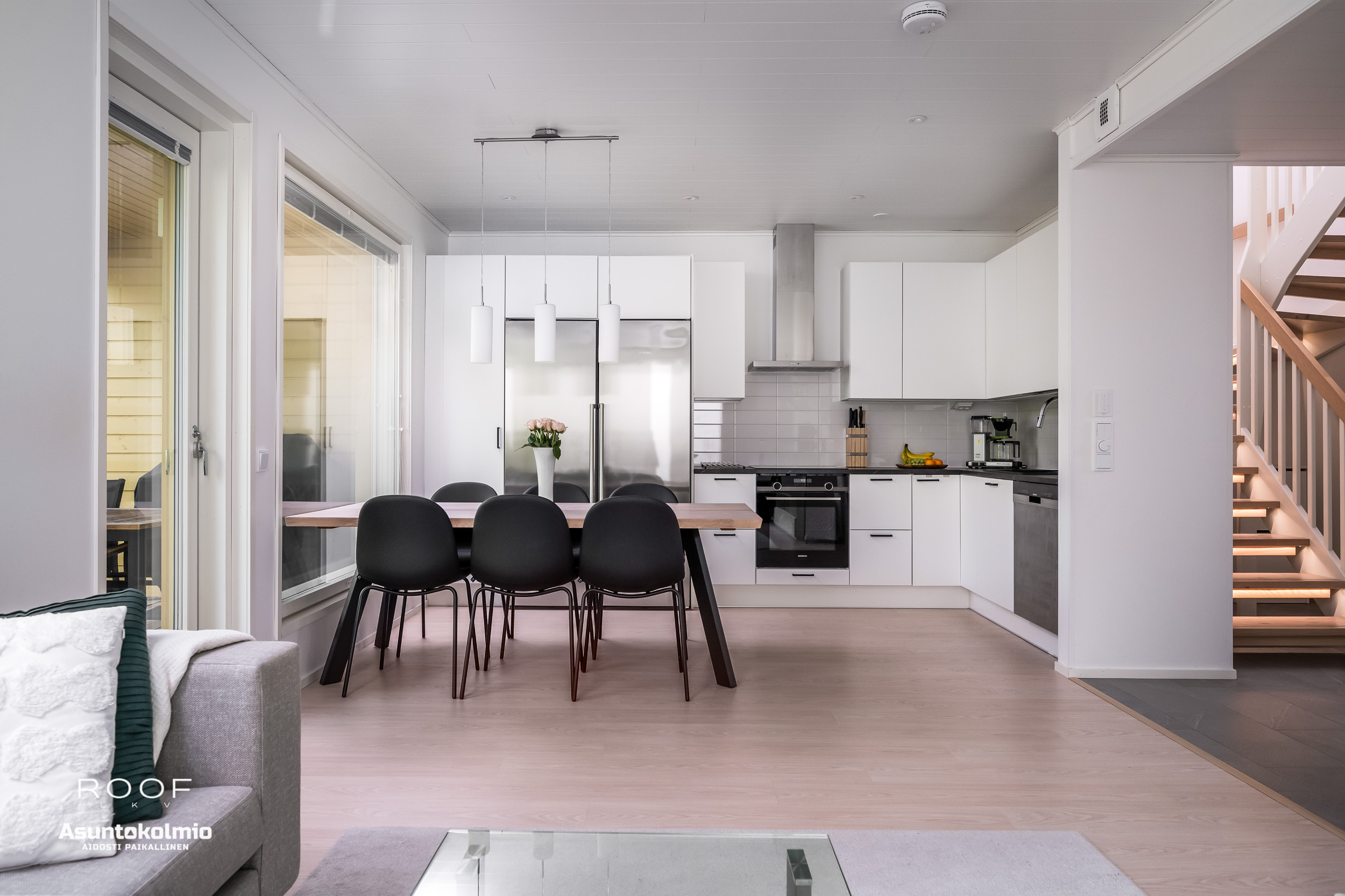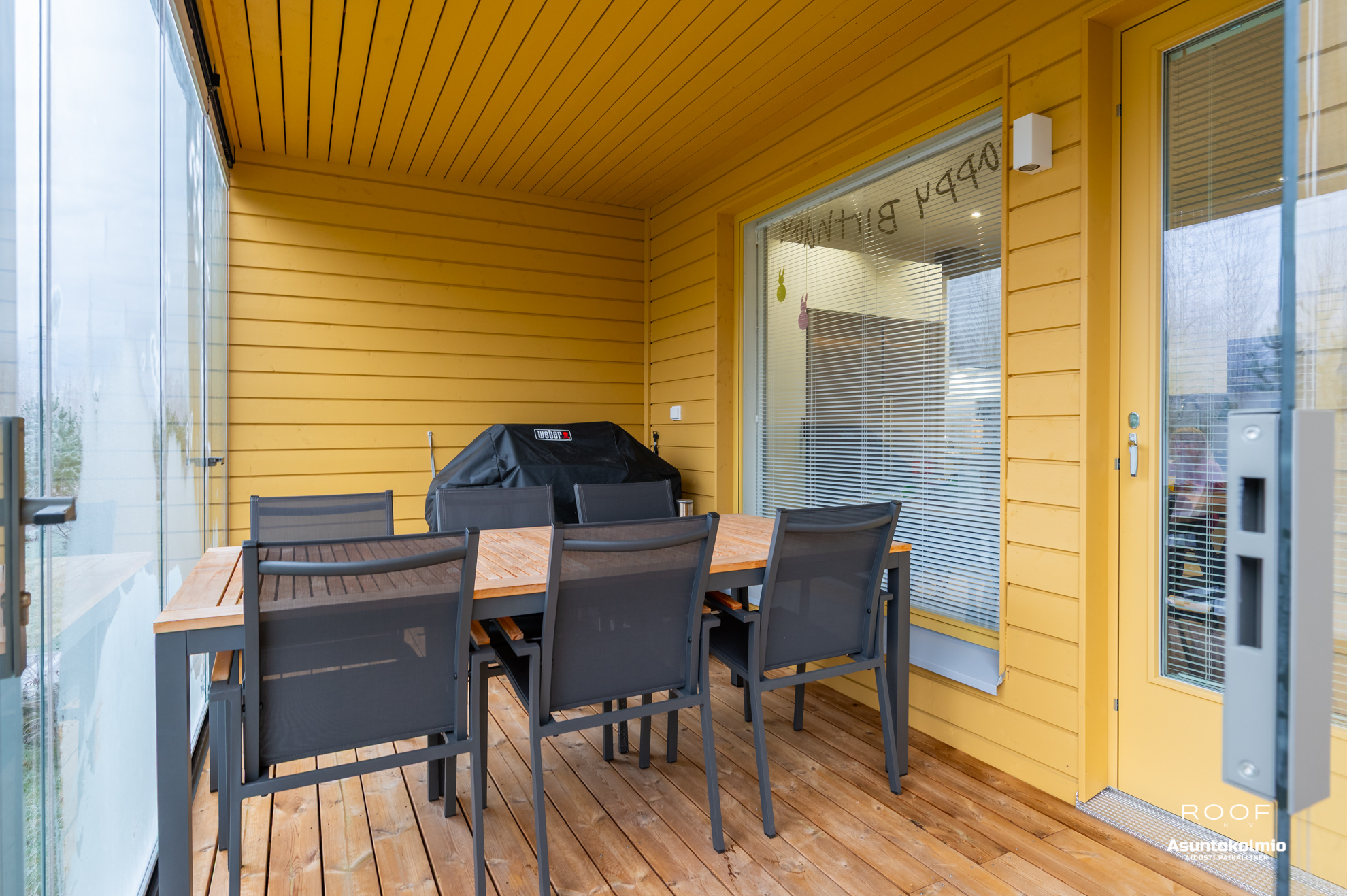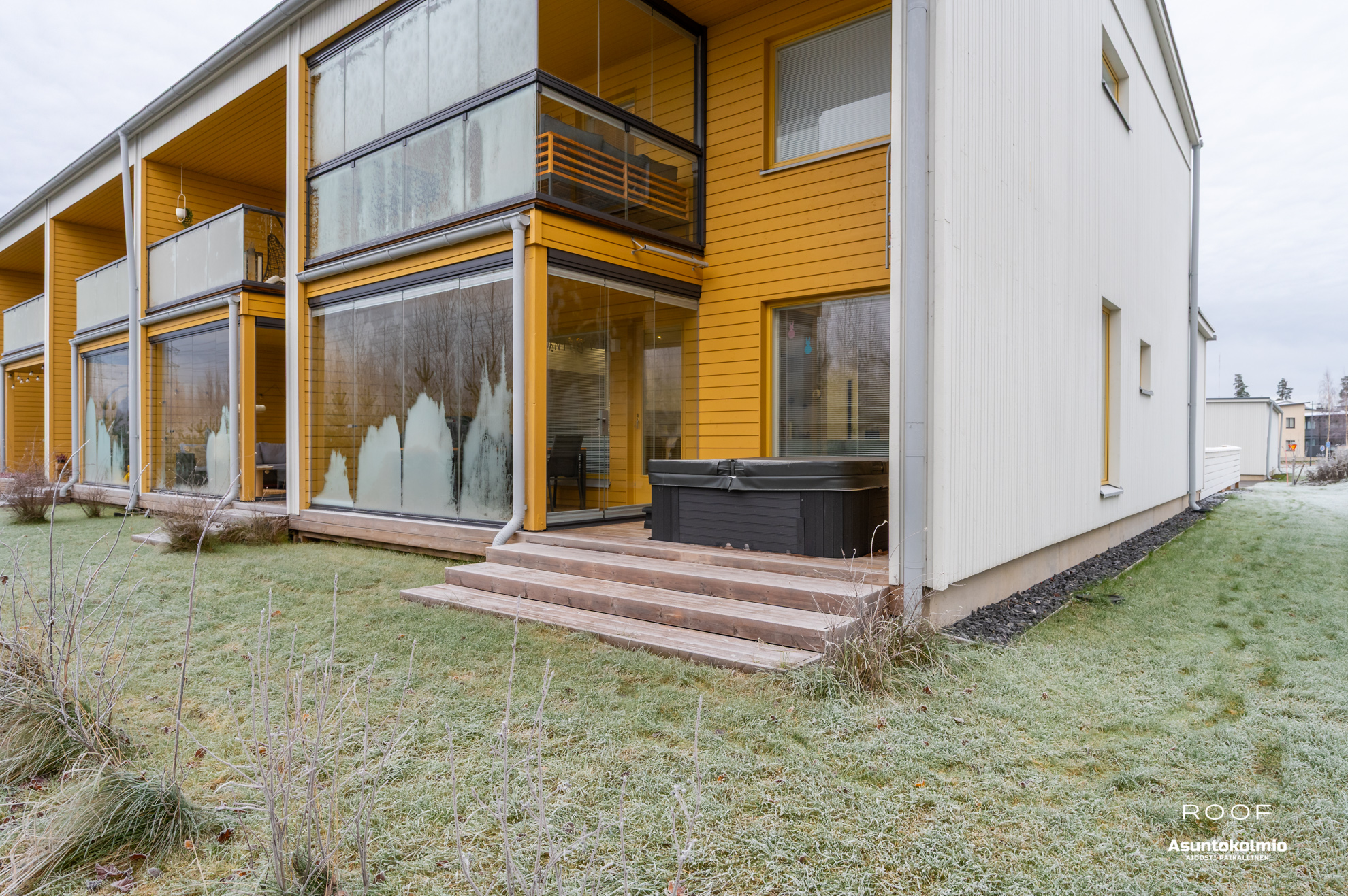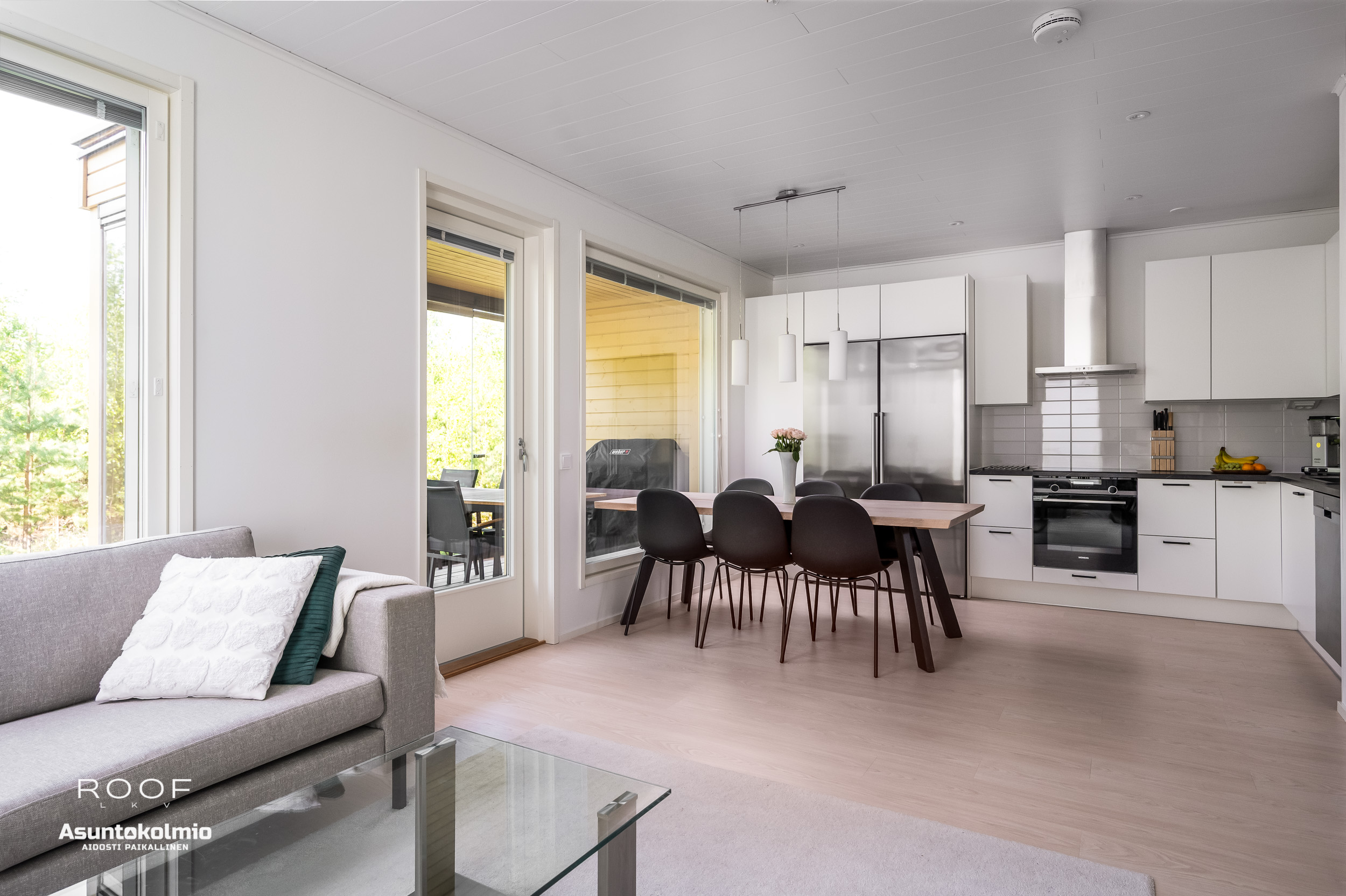Vuonna 2022 valmistunut neljän makuuhuoneen suuri 119,5m2 rivitalon päätykoti metsään rajoittuvalla takapihalla.