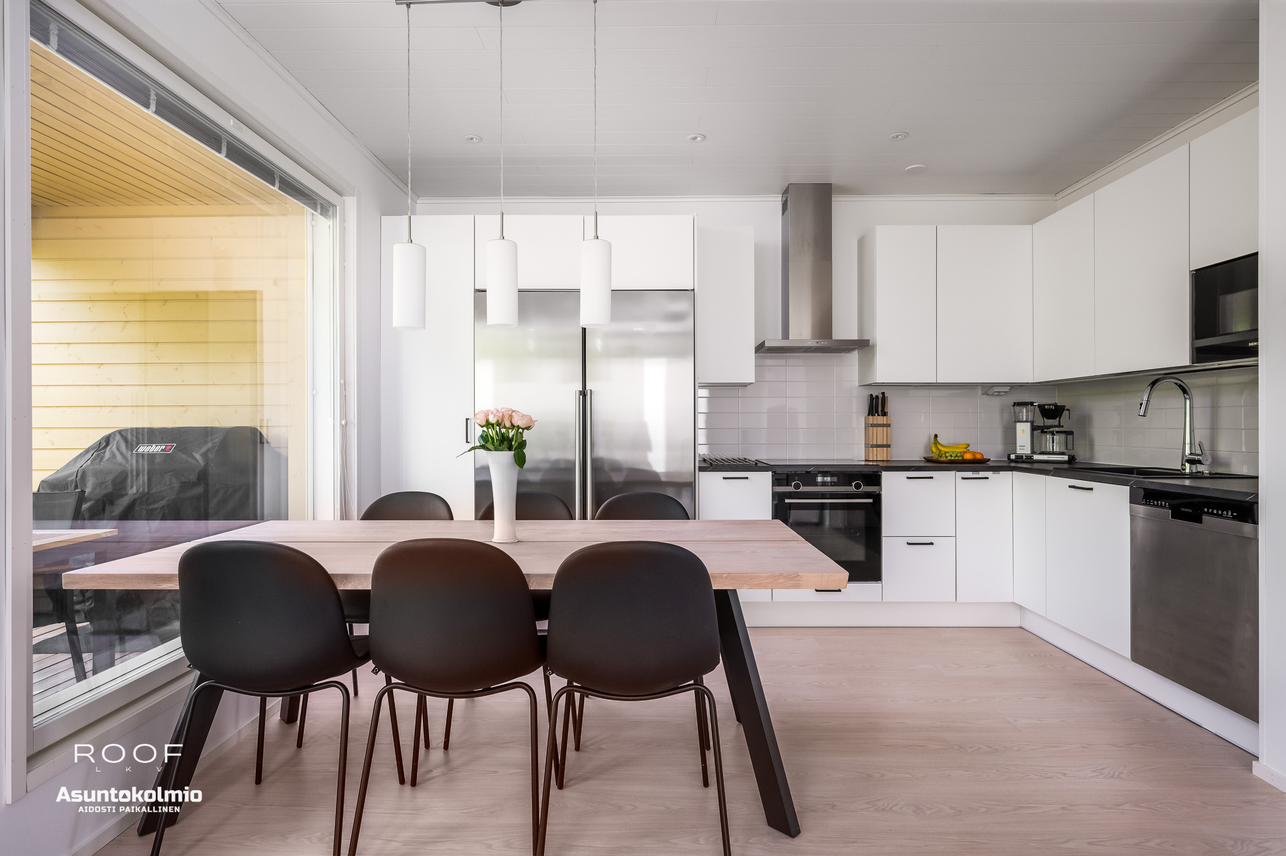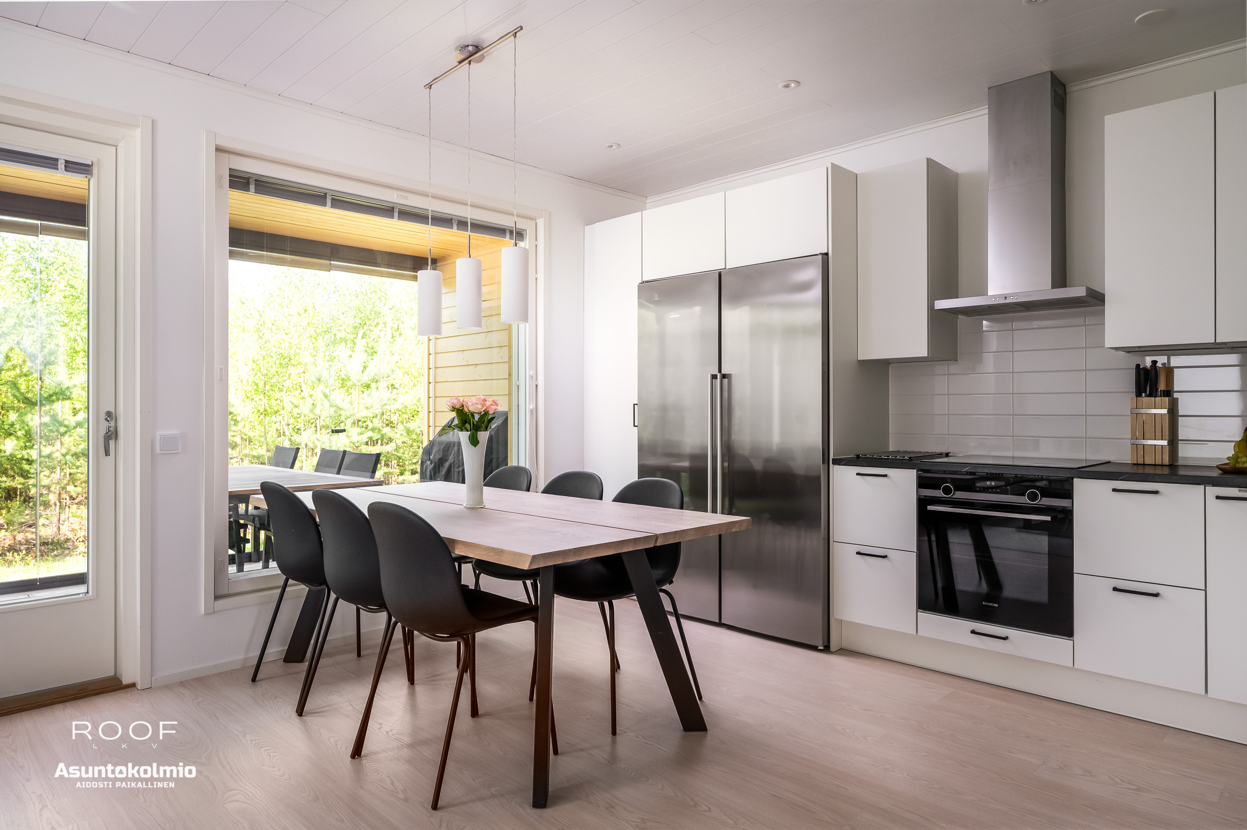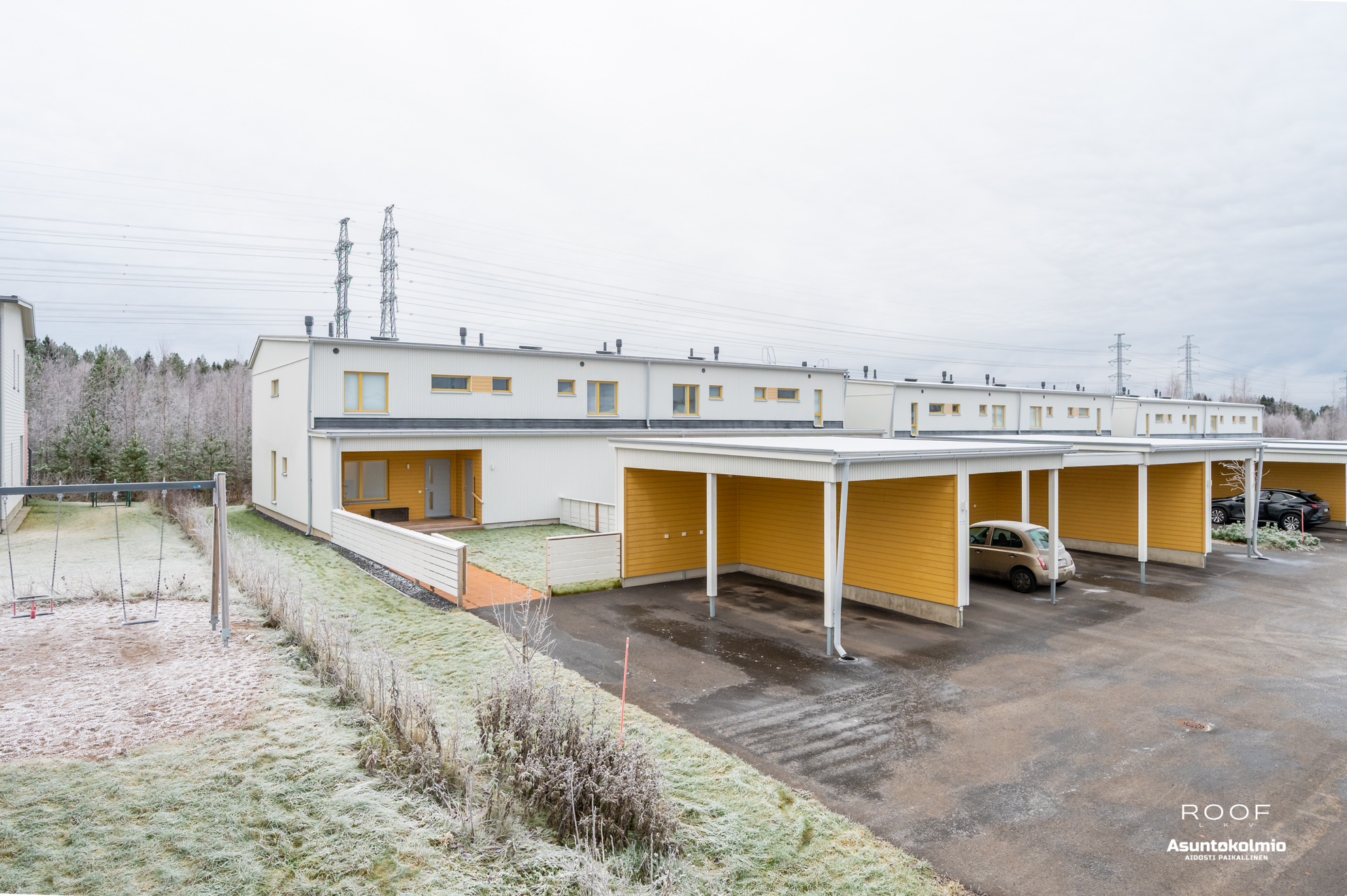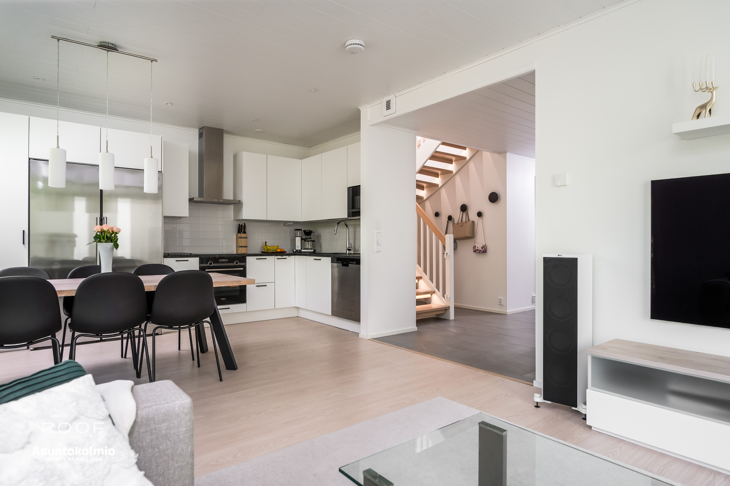 Vuonna 2022 valmistunut neljän makuuhuoneen suuri 119,5m2 rivitalon päätykoti metsään rajoittuvalla takapihalla.