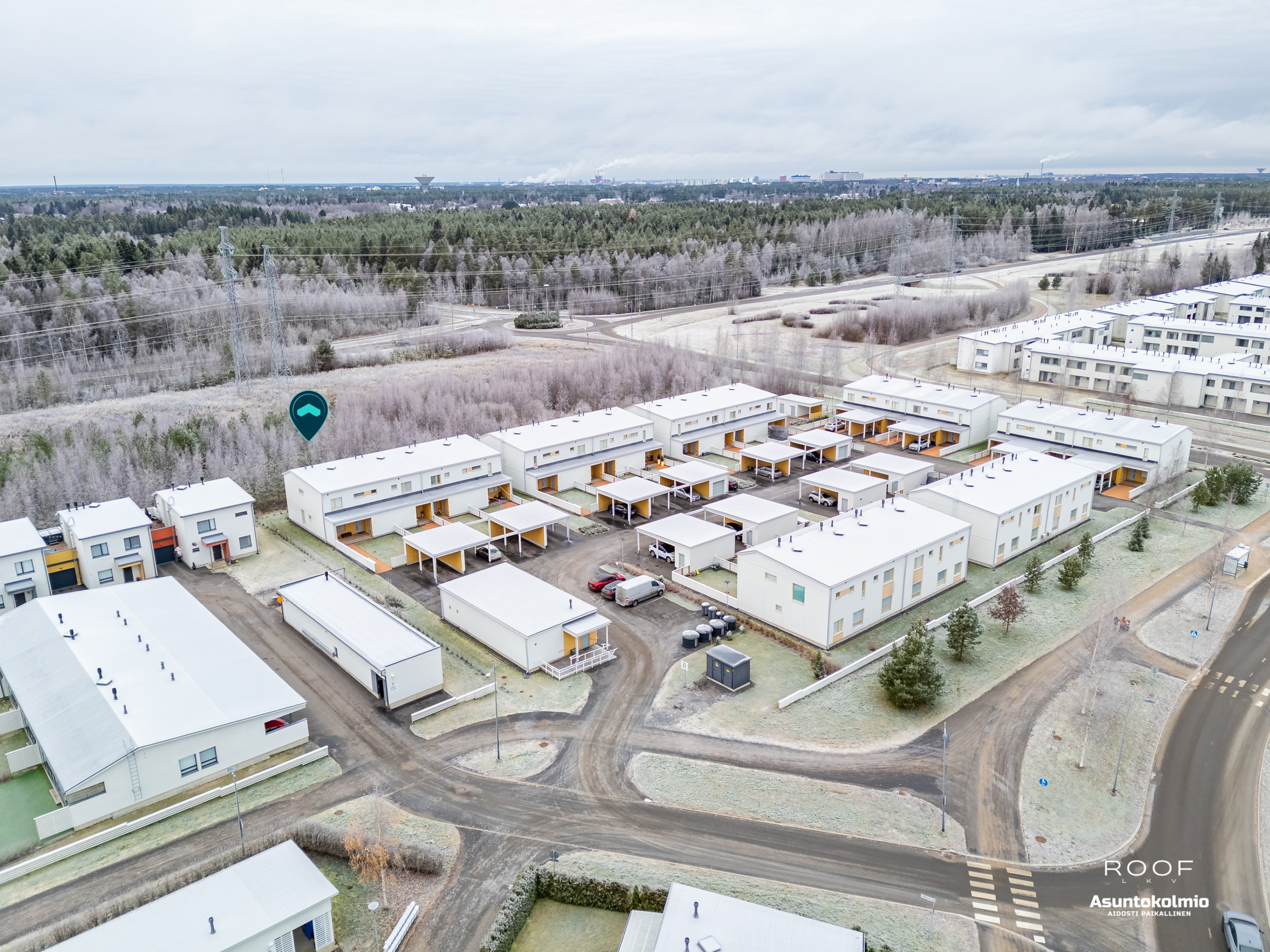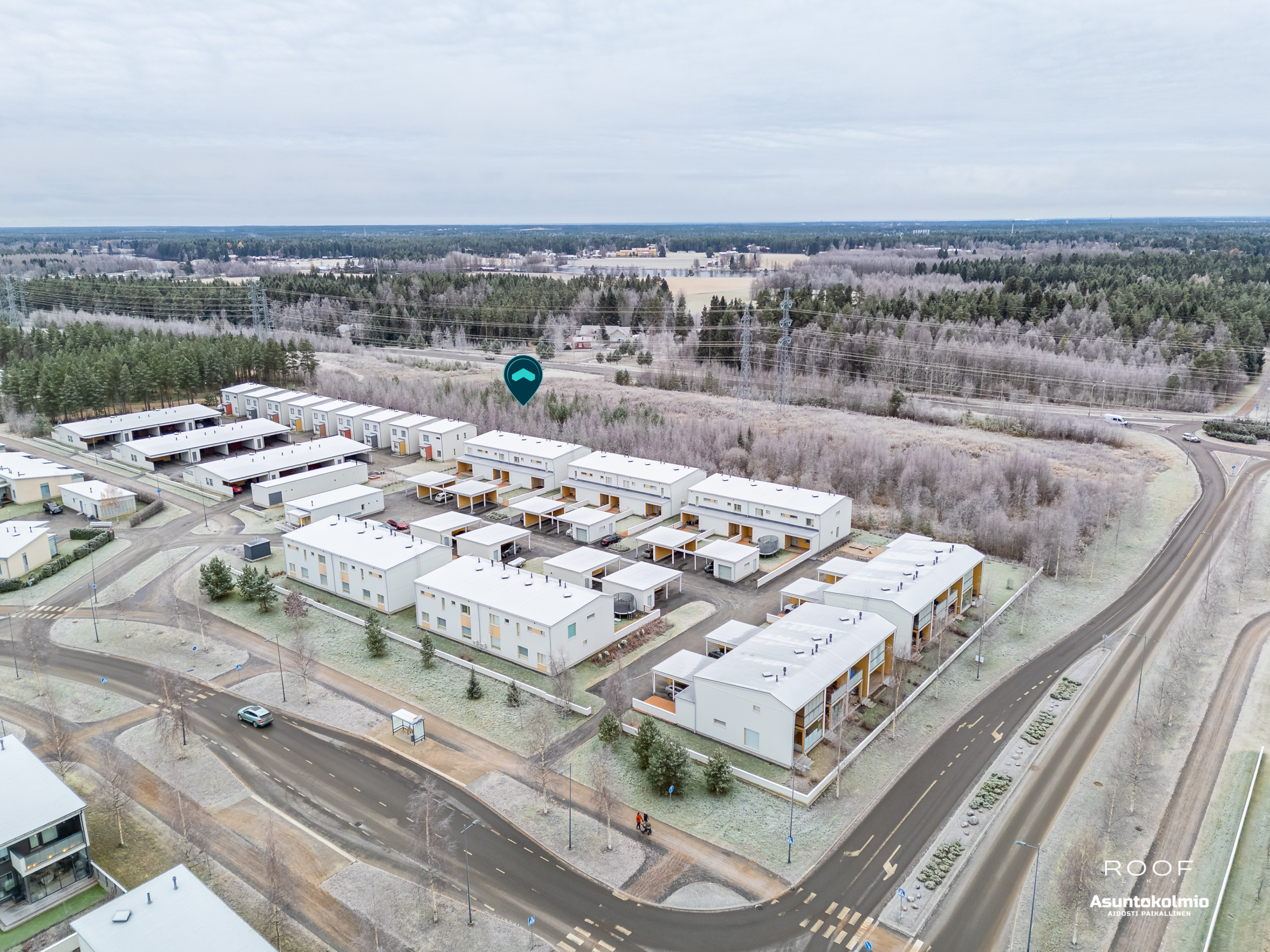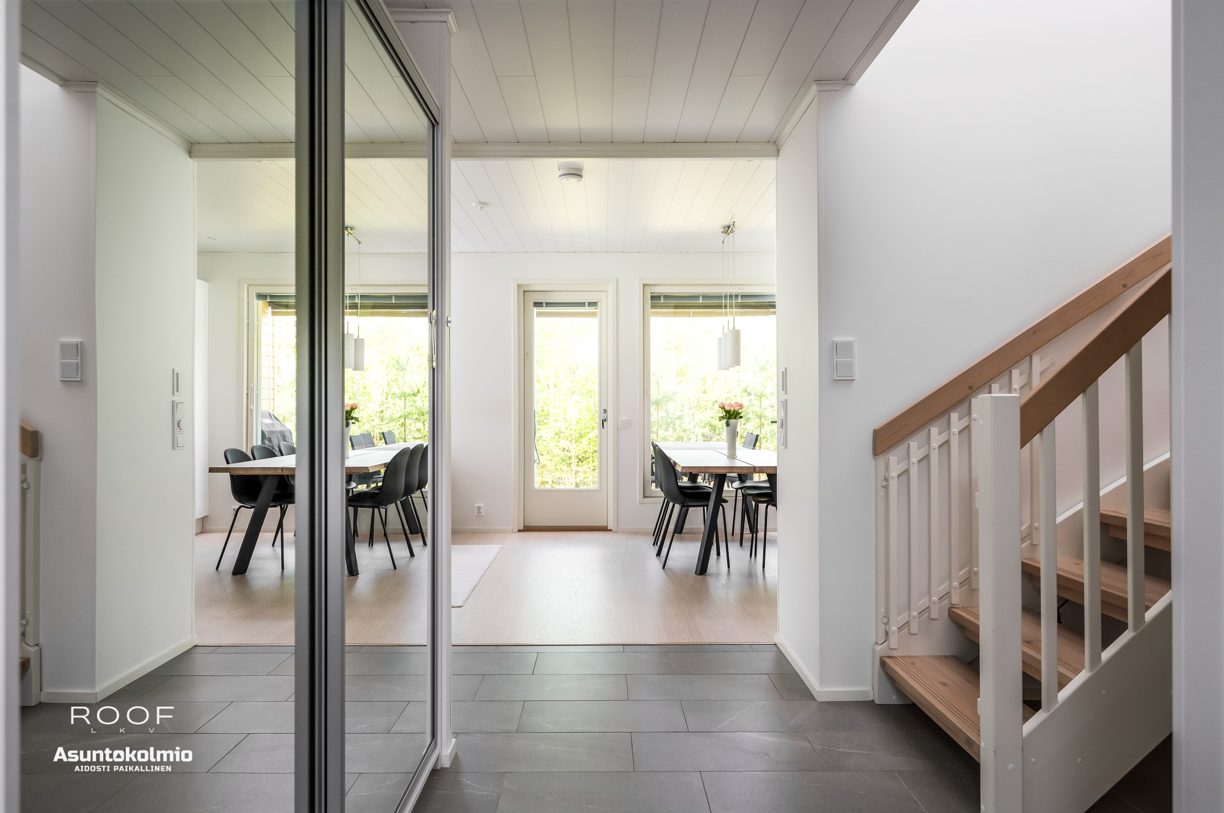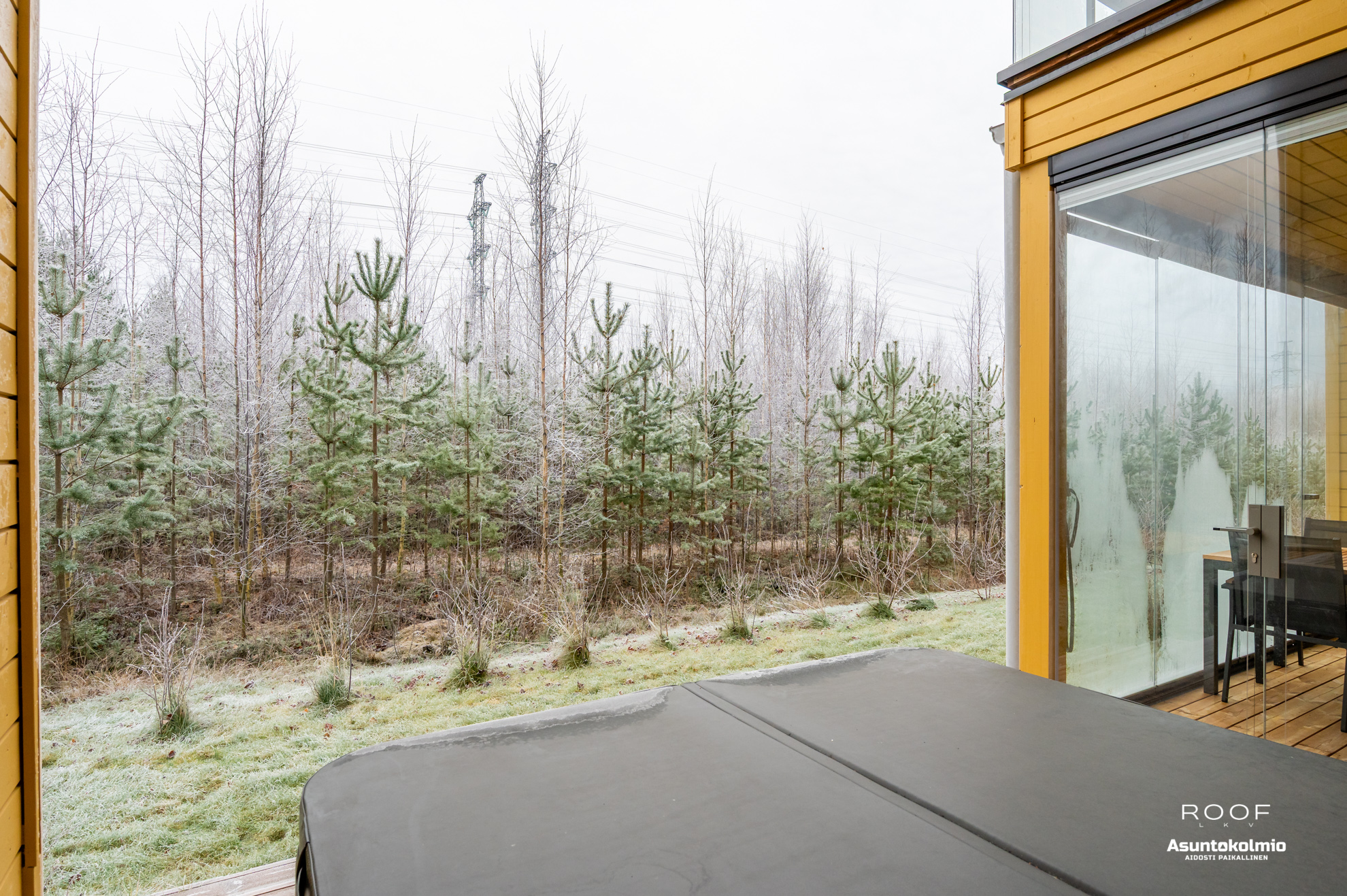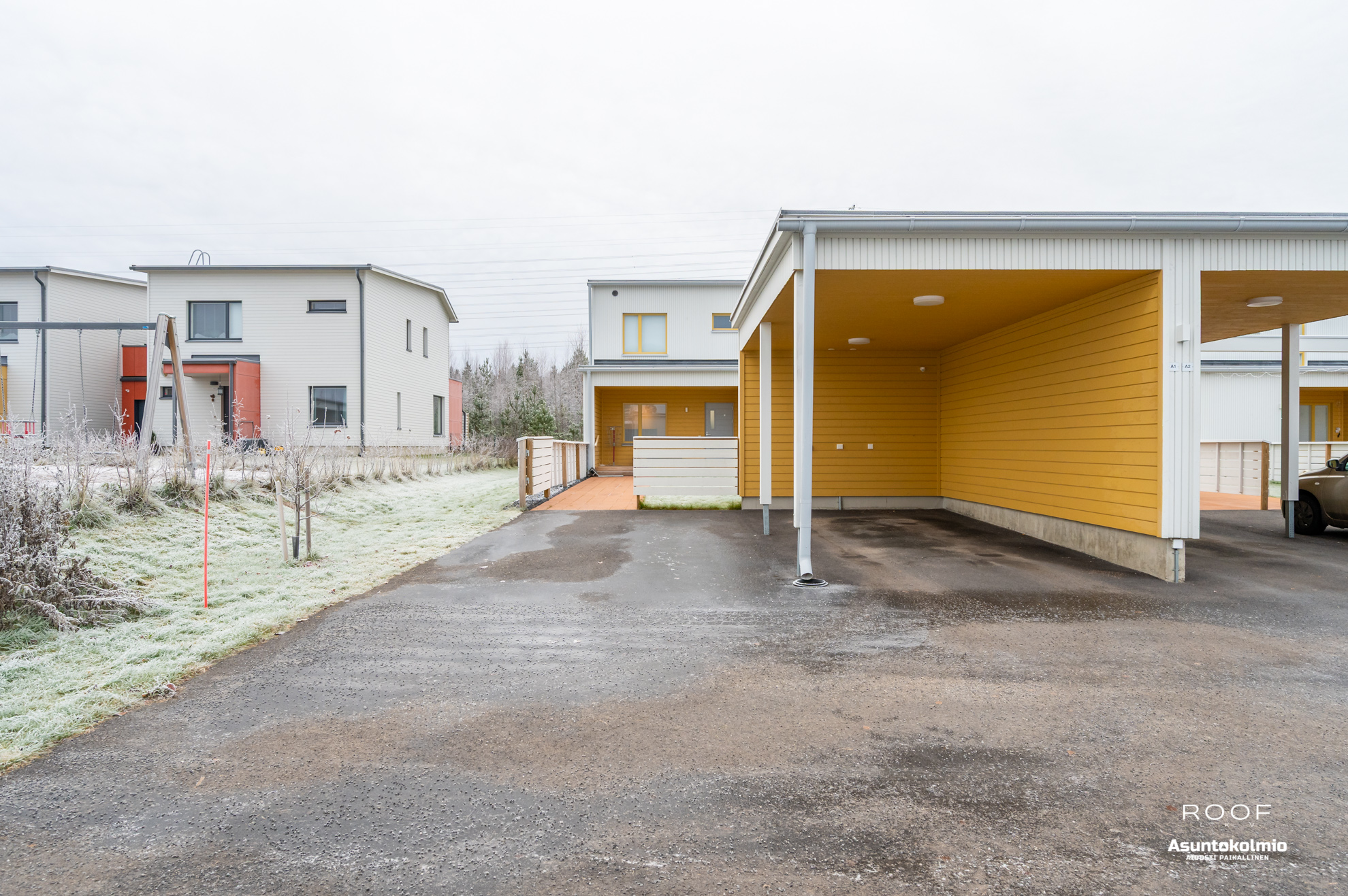 Vuonna 2022 valmistunut neljän makuuhuoneen suuri 119,5m2 rivitalon päätykoti metsään rajoittuvalla takapihalla.