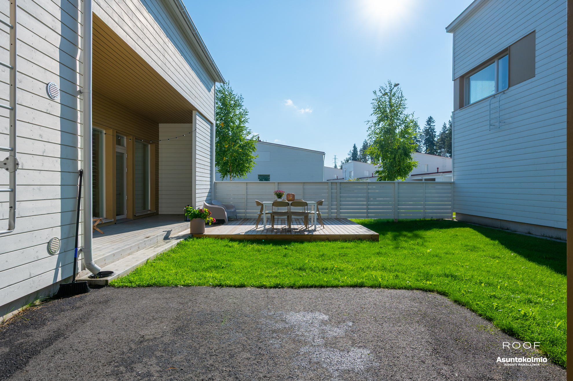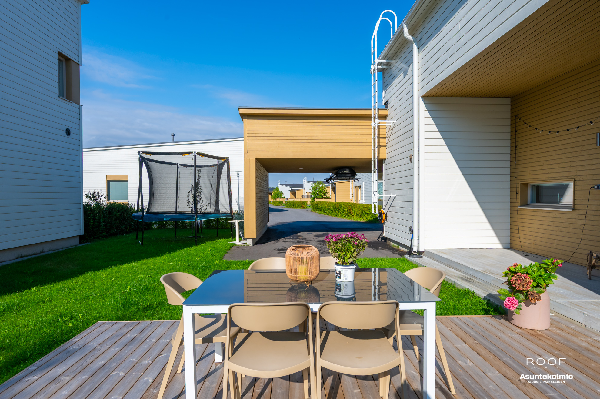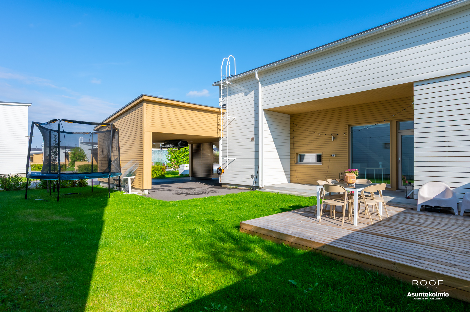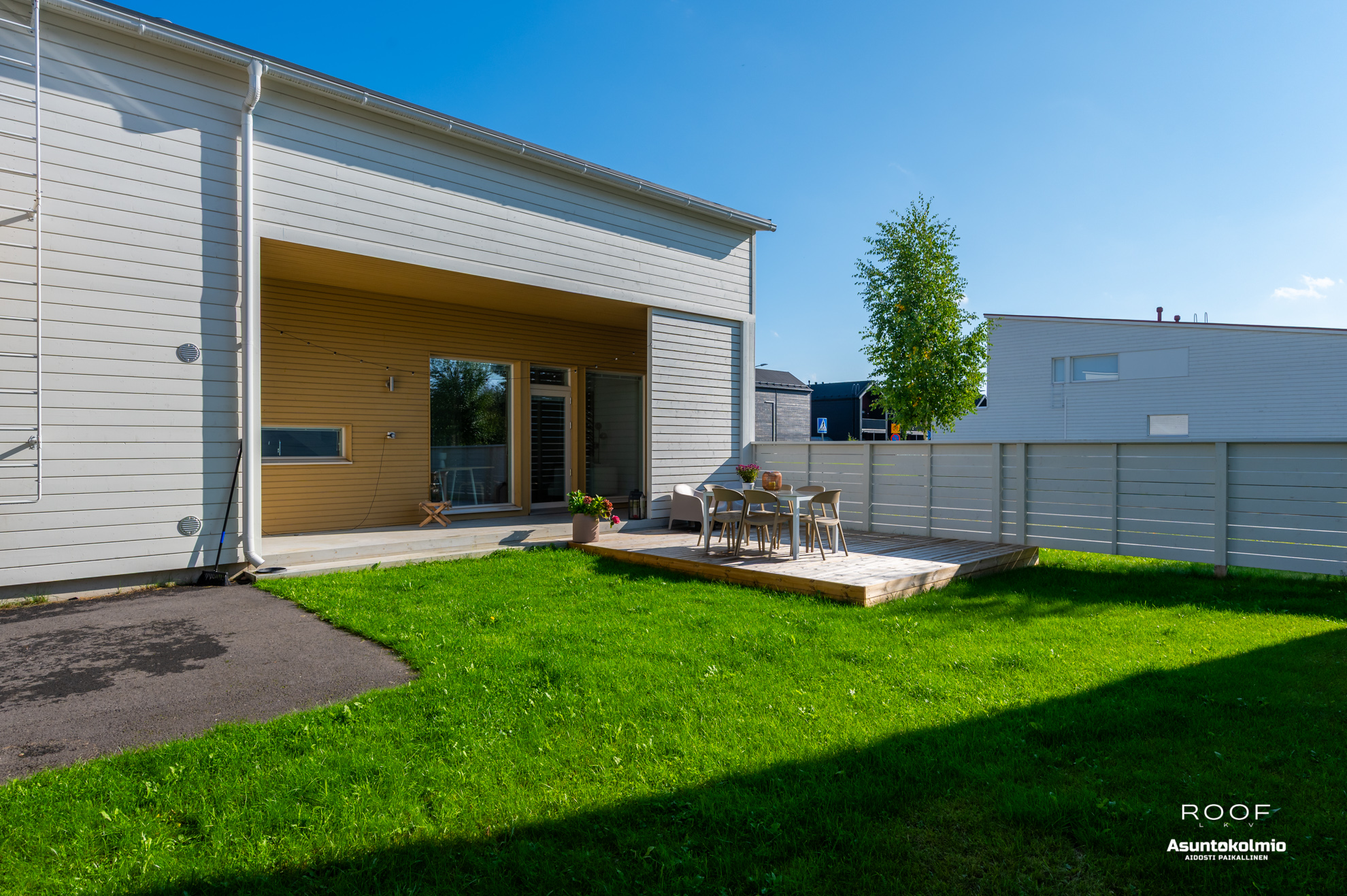 Huoneiston edestä löytyy kahden auton katos sekä lämmin varasto, ja lämpimästä väestönsuojasta löytyy lisää säilytystilaa. Olohuoneesta on käynti aurinkoiselle lounaaseen suuntautuvalle terassille, ja pihalle sopii varmasti kaikki, mitä lapsiperhe kaipaa. Tekniikaltaan asunto on luonnollisesti täydellisen moderni. Lämmitysmuotona on kaukolämpö vesikiertoisella lattialämmityksellä ja ilmanvaihto hoituu koneellisesti. Lisäksi löytyy viilentävä ilmalämpöpumppu kesähelteille ja varaava takka tuomaan tunnelmaa talvipakkasille.