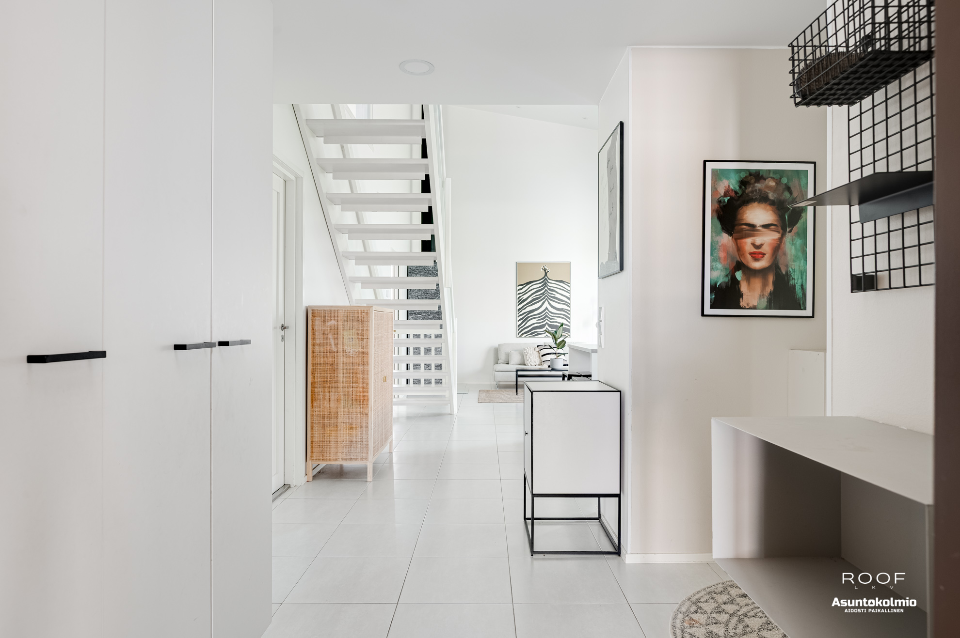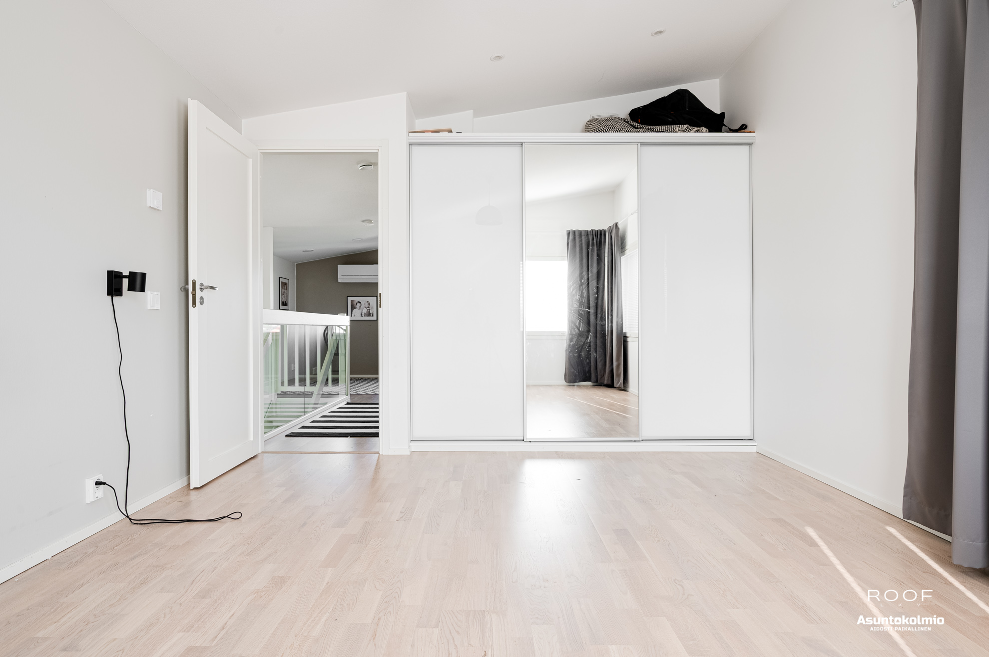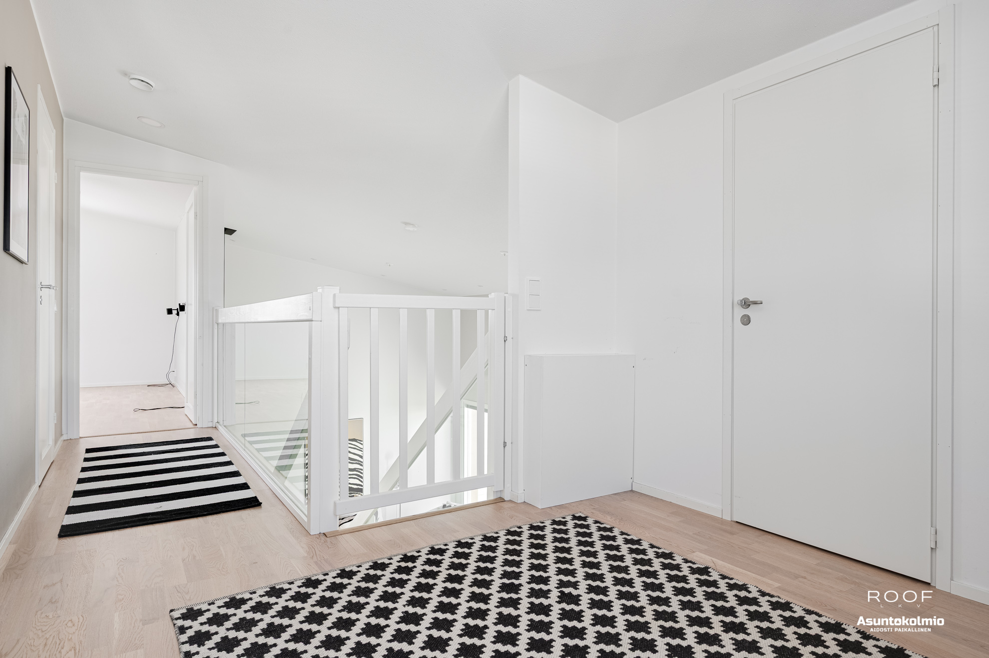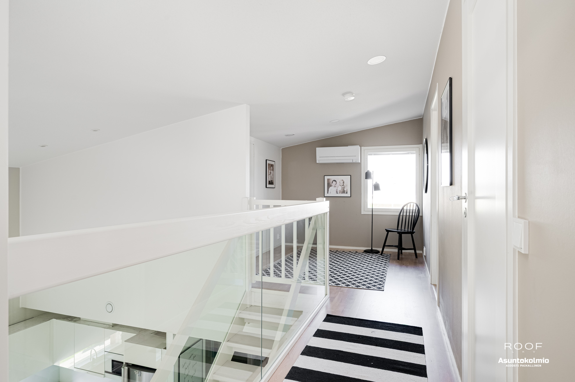 Tästä kodista ei puutu oikein mitään. Löytyy neljä riittävän suurta makuuhuonetta, todella suuri vaatehuone, jota voi tarvittaessa hyödyntää myös makuuhuoneena, suuri eteistila, Puustellin toimiva keittiö, josta ei lasku- tai kaappitila lopu kesken, erillinen kodinhoitohuone, kaksi kylpyhuonetta ym. Asuntoon on tehty runsaasti muutostöitä jo rakennusvaiheessa, ja ne näkyvät niin materiaaleissa kuin kalusteissakin. Yläkerran aulan jatkoksi on toteutettu osittain matalampaa tilaa oleva todella suuri vaatehuone, jonka ansiosta huoneiston neliöt ovat vieläpä hieman virallista suuremmat.